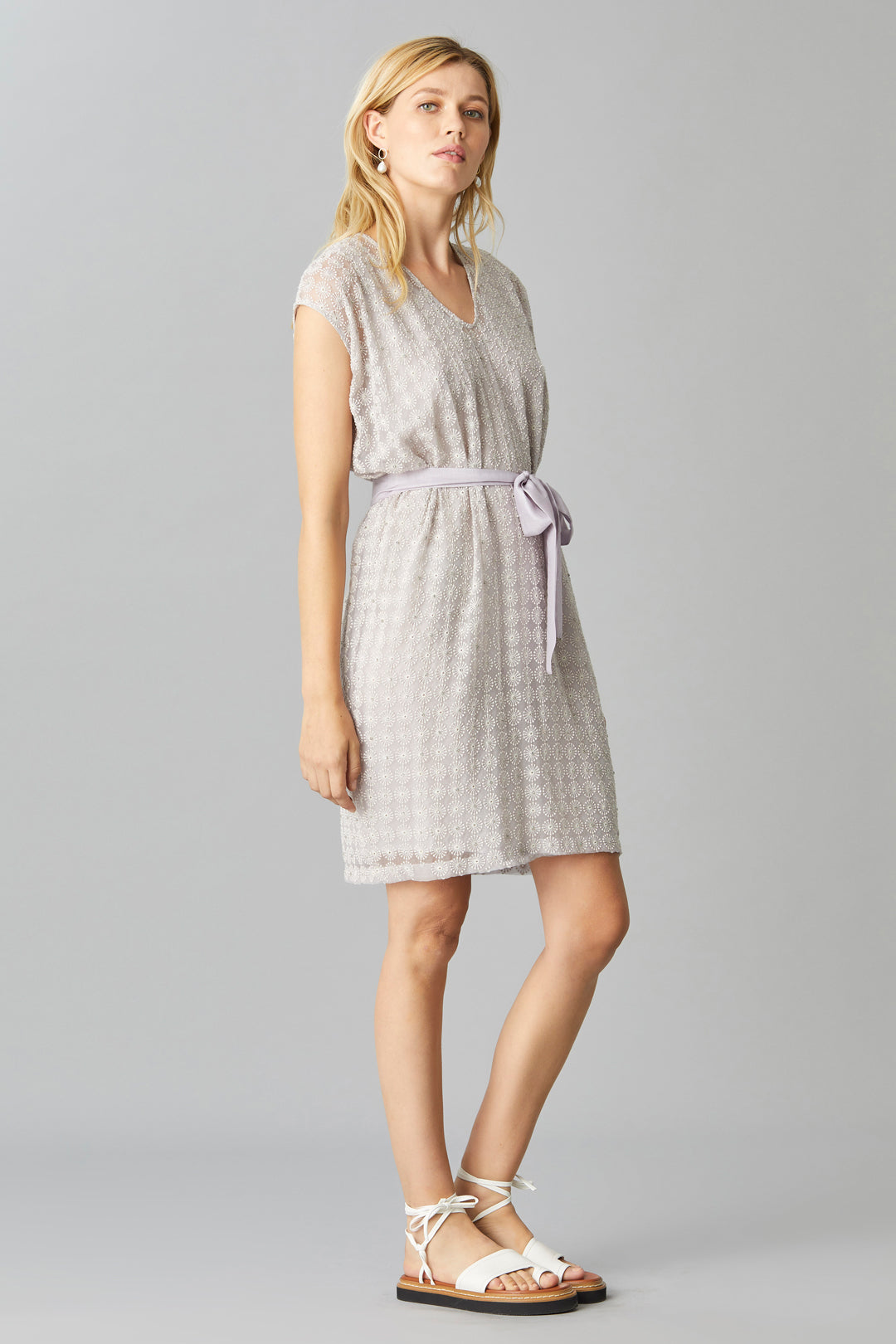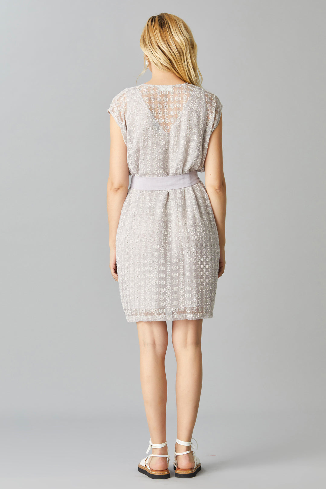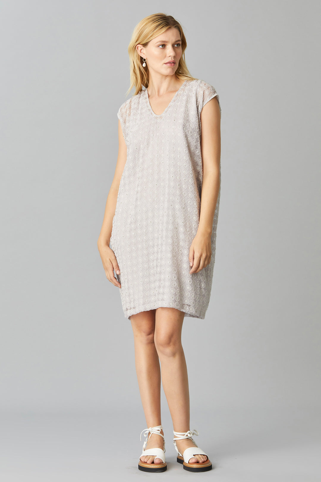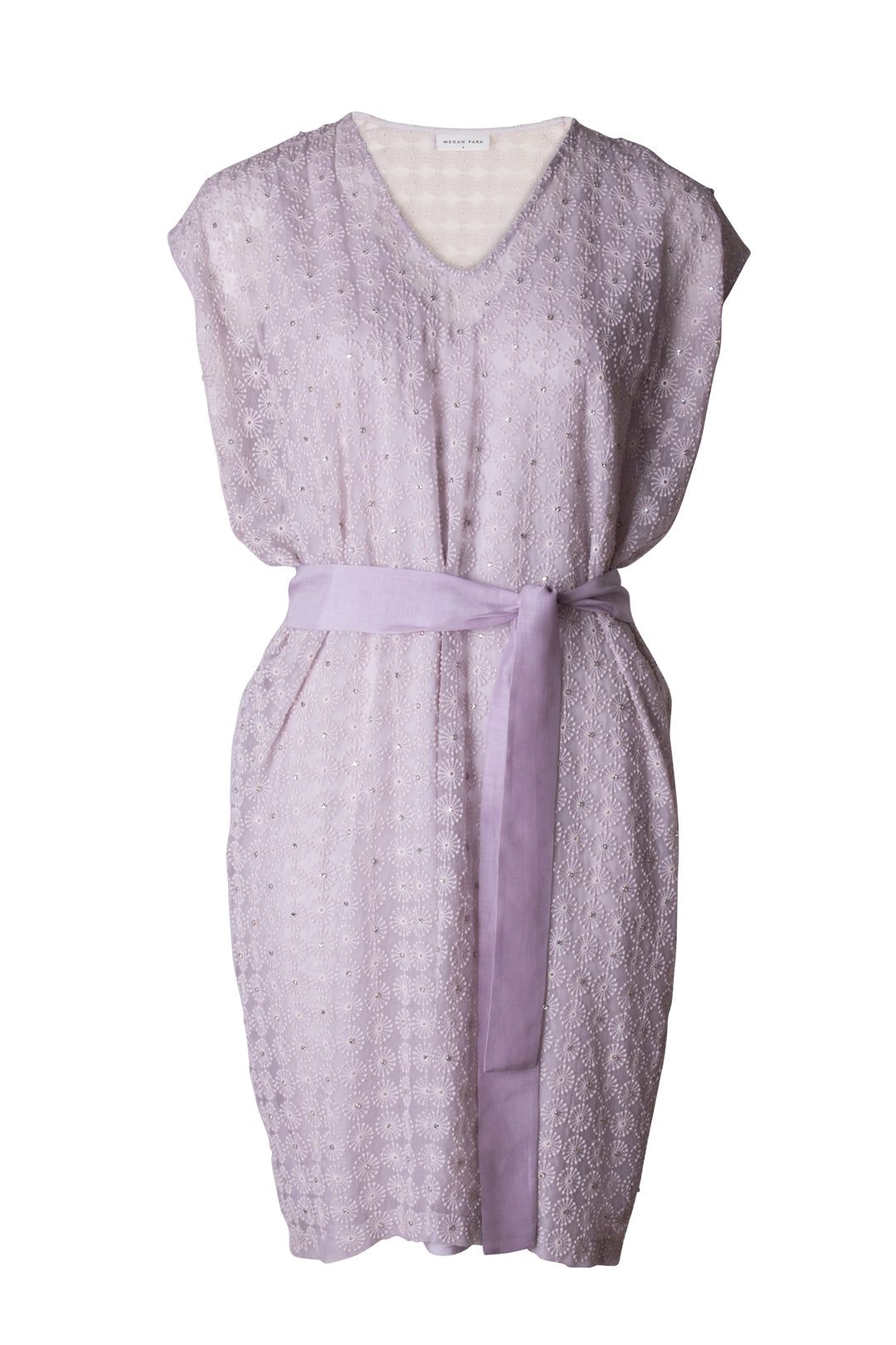An elegant, yet relaxed evening story, the Thea collection showcases feather light crinkle chiffon, firstly embroidered with intricate, geometric, circular thread work motifs then hand embroidered with glistening crystals. A classic Megan Park cacoon shape with a relaxed body, flattering, subtle, capped sleeves and optional self fabric tie to cinch the waist. This semi opaque design comes with a matching slip. This stunning piece will be worn and treasured for years to come