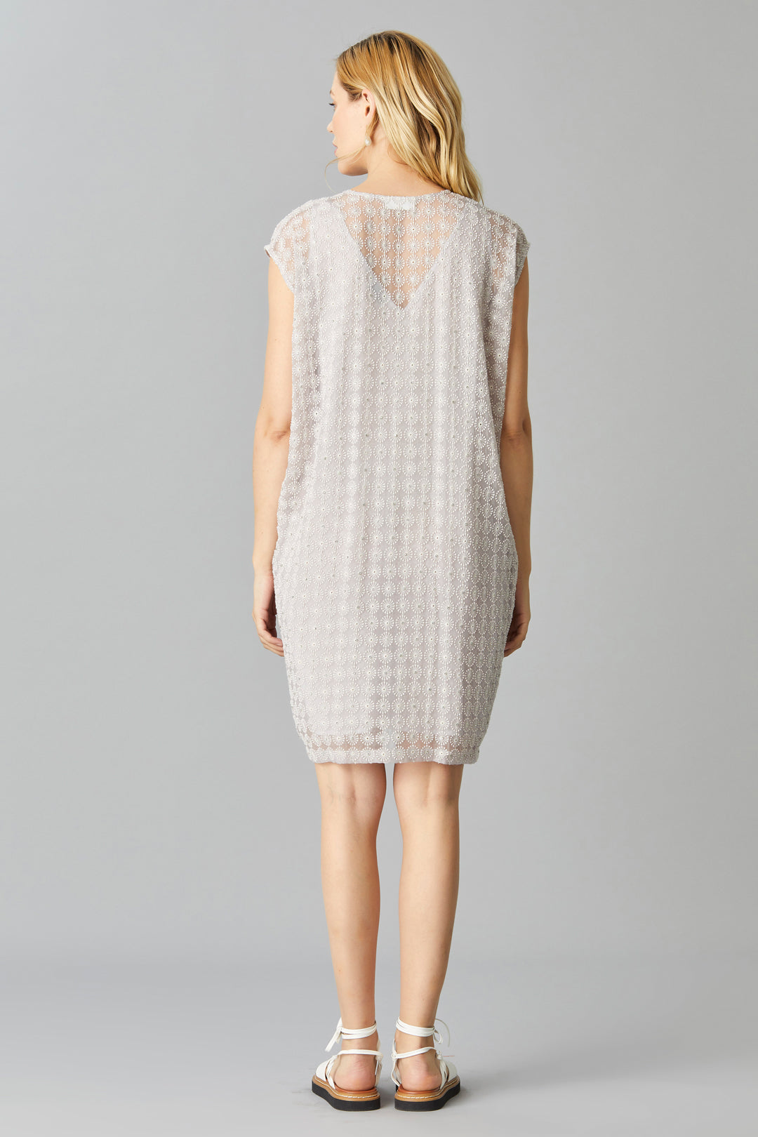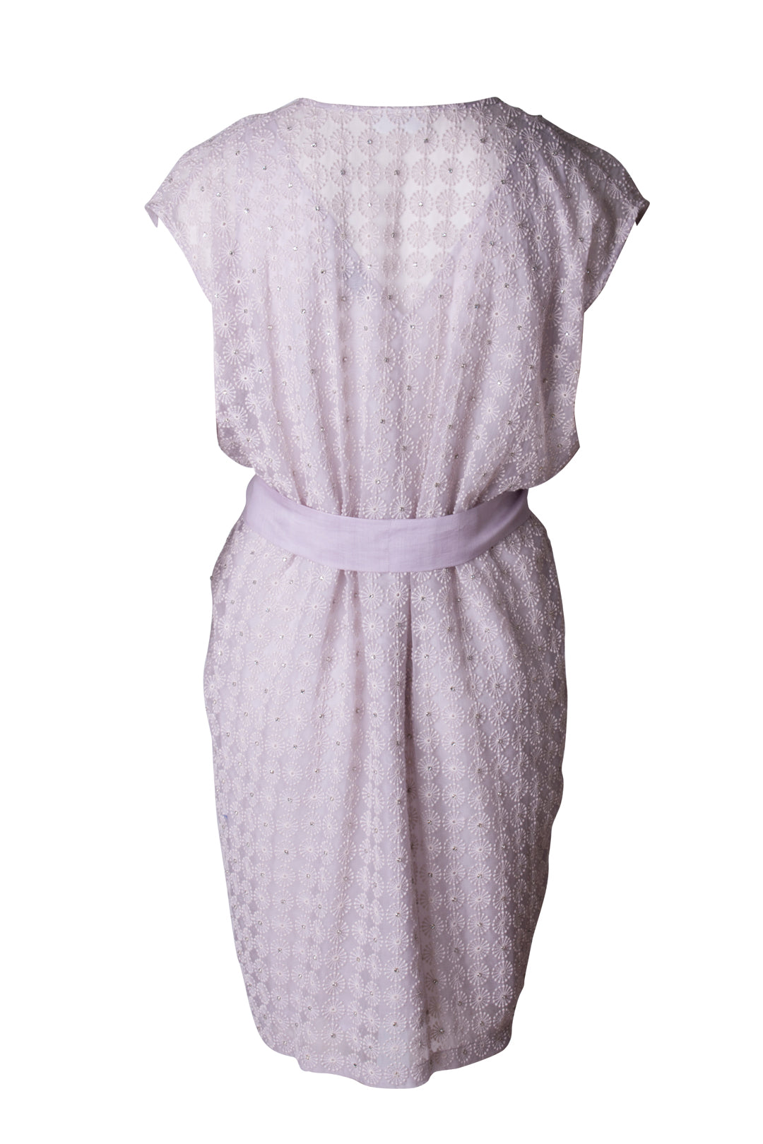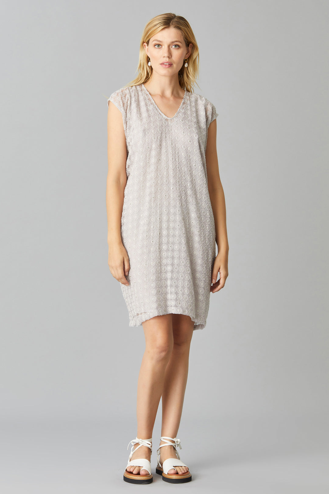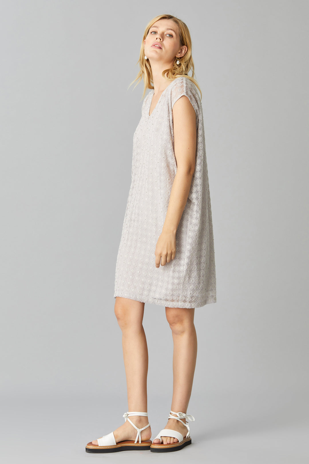 An elegant, yet relaxed evening story, the Thea collection showcases feather light crinkle chiffon, firstly embroidered with intricate, geometric, circular thread work motifs then hand embroidered with glistening crystals. A classic Megan Park cacoon shape with a relaxed body, flattering, subtle, capped sleeves and optional self fabric tie to cinch the waist. This semi opaque design comes with a matching slip. This stunning piece will be worn and treasured for years to come