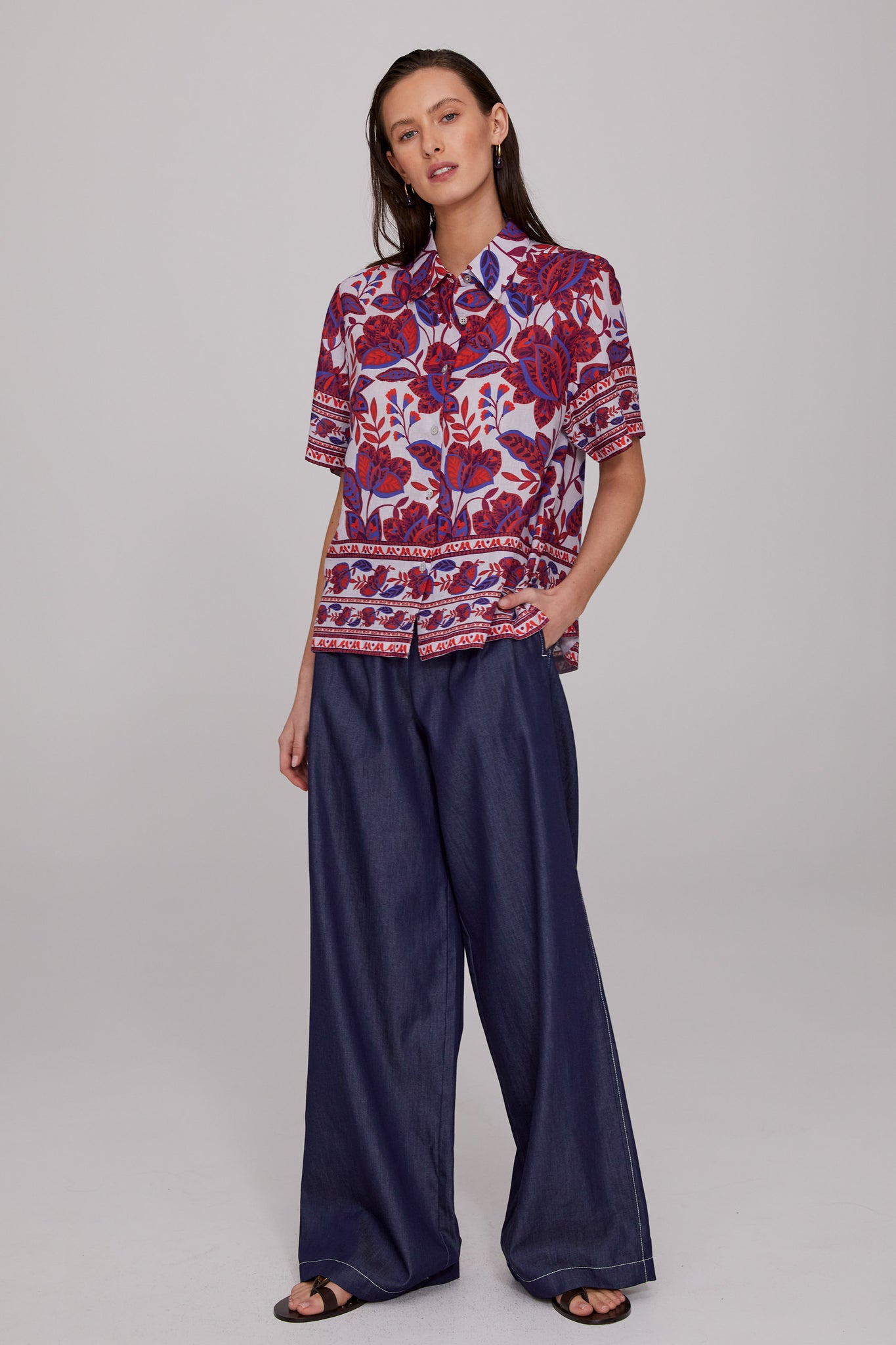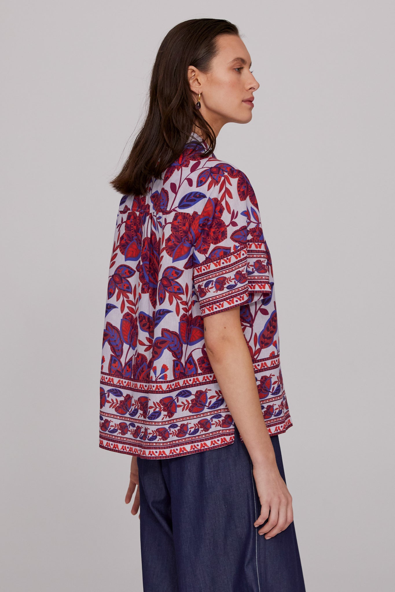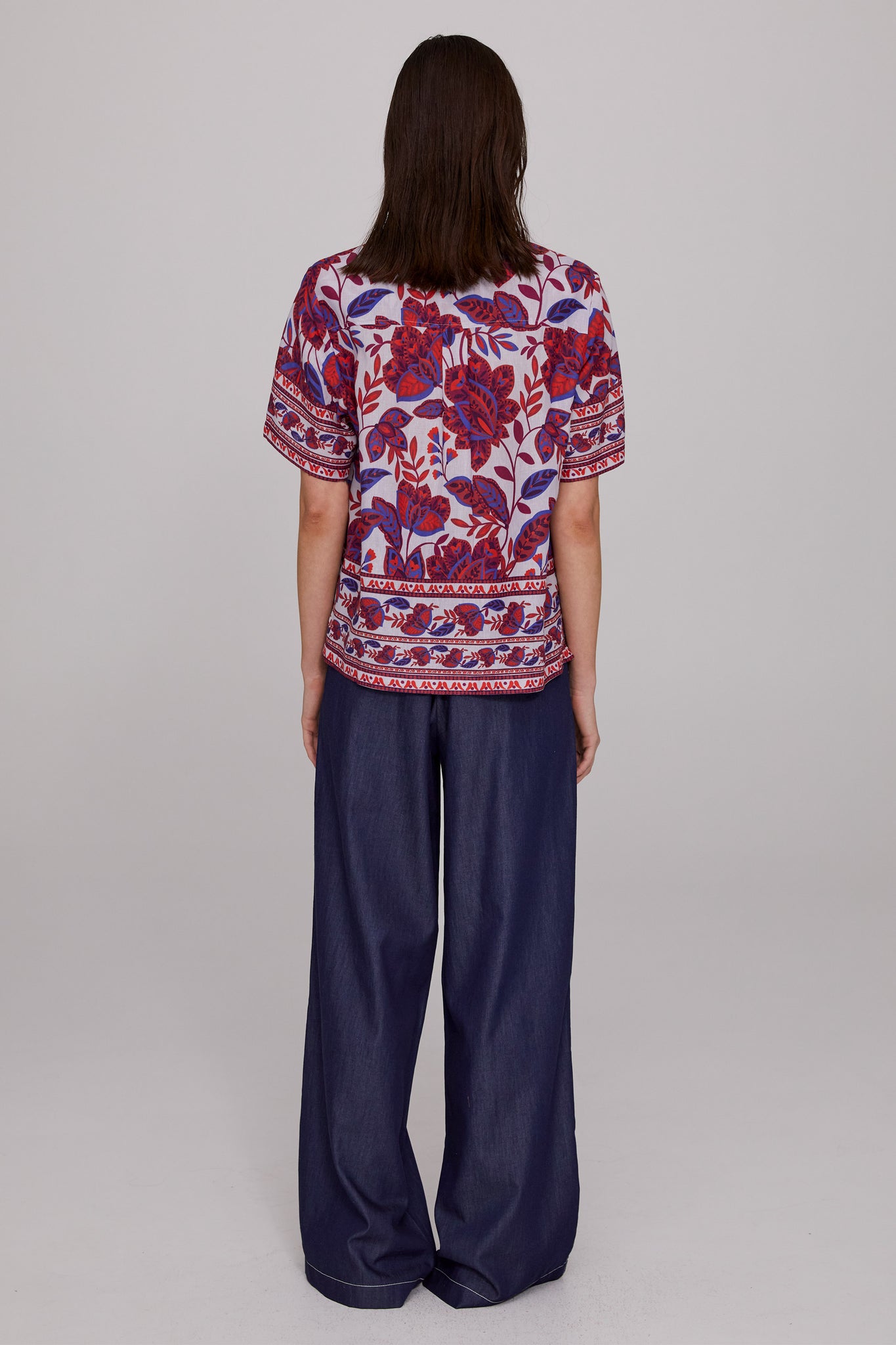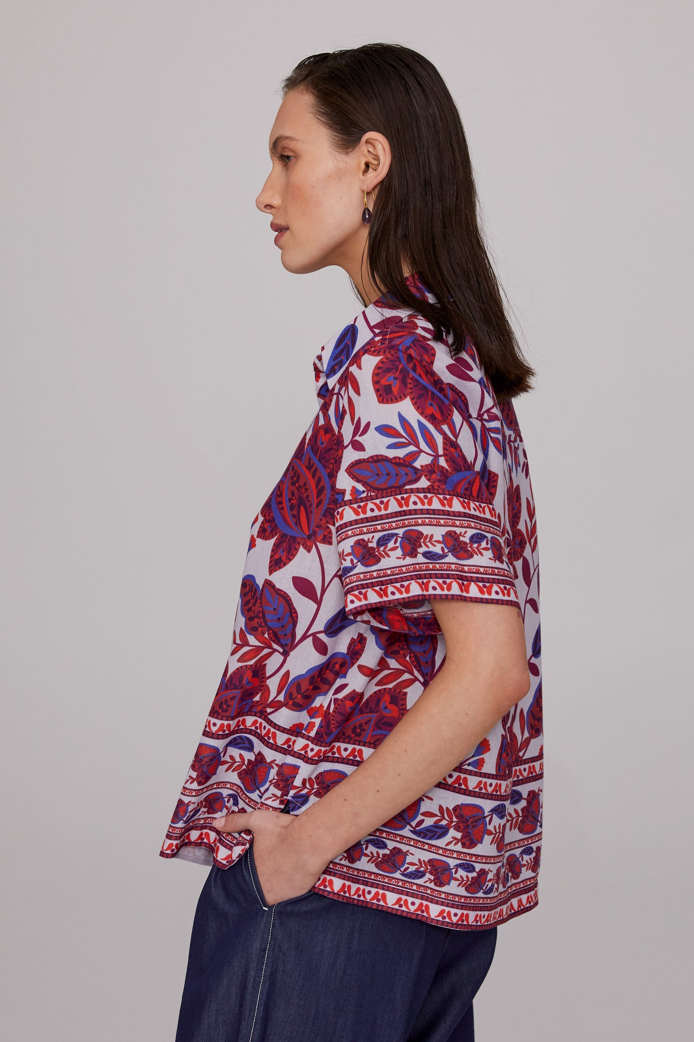 The Ariana Cotton Linen Shirt showcases a signature MEGAN PARK print, designed in-house, featuring folkloric motifs of blues and reds set against the palest / almost white. lilac base. Crafted from a natural cotton-linen blend with a subtle textured weave, it balances softness with structure. The boxy silhouette is softly tailored with side seam hem splits for ease. A striking yet versatile piece, it pairs beautifully with the Soft Washed Denim Pant as seen here or with most of the MEGAN PARK skirts this season for effortless styling.