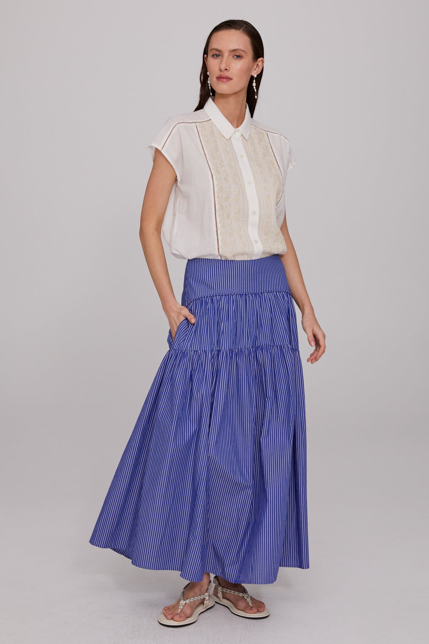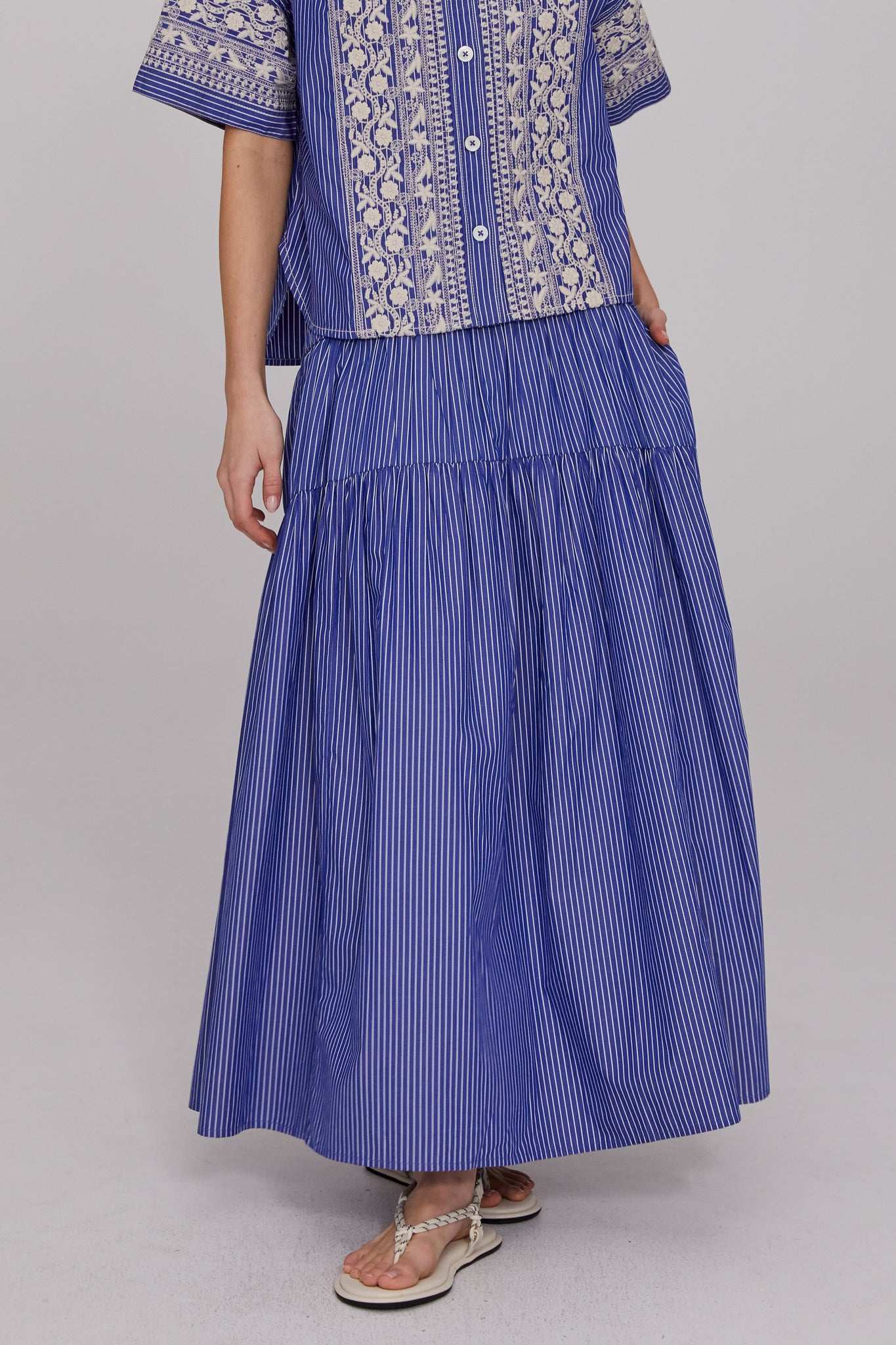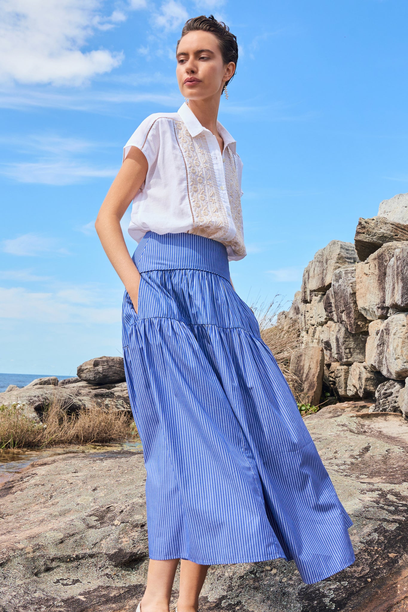 The Cobalt Stripe Poplin Tiered Skirt is crafted with a fitted basque that flatters the waist, its tiered silhouette falls into voluminous gathers that create a graceful sway with every step. In classic blue and white stripes, it feels fresh and light — the perfect palette for summer. Versatile and easy to style, it pairs effortlessly with so many MEGAN PARK tops this summer and worn here with the Riley Cotton Linen Top.