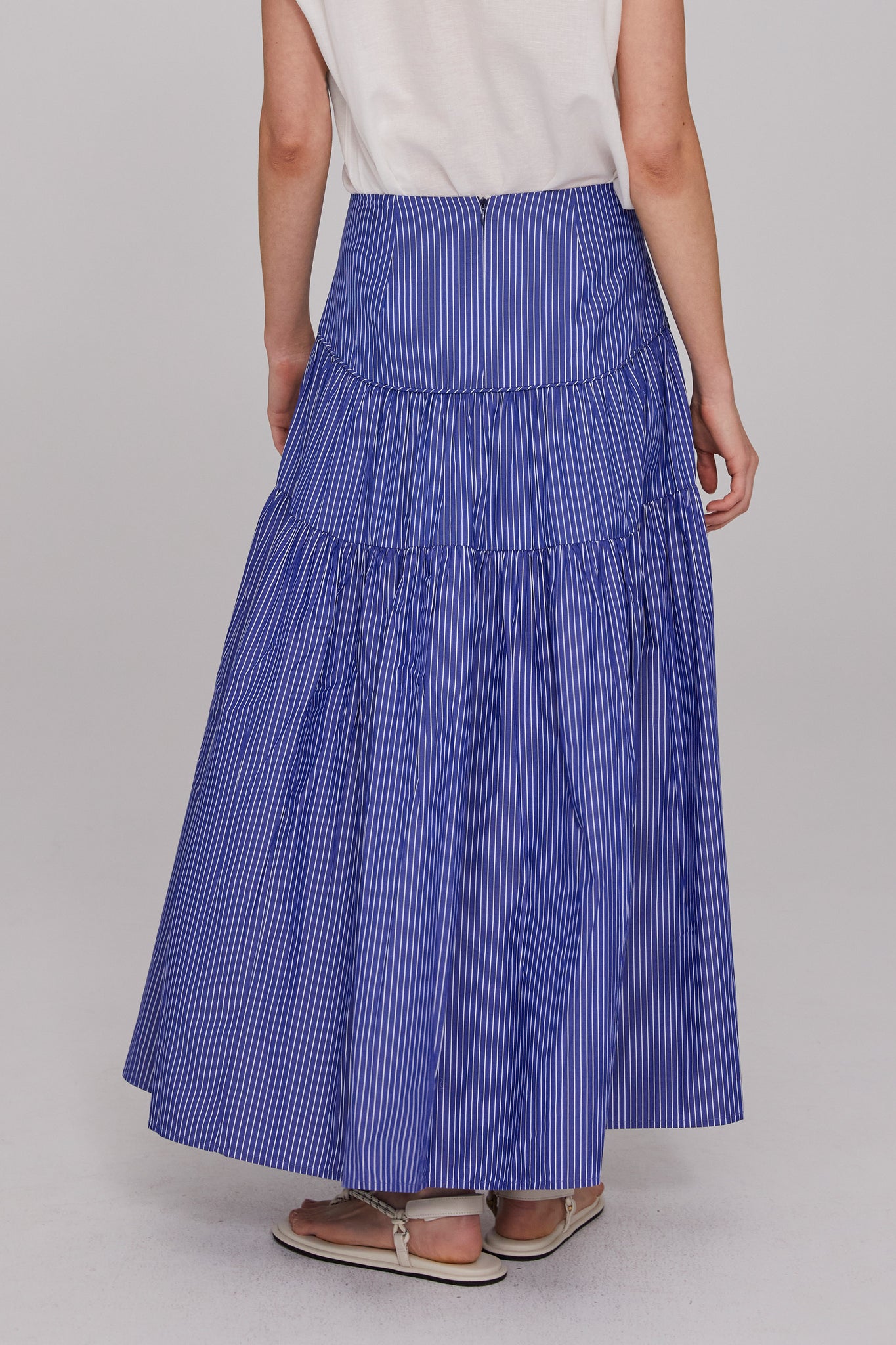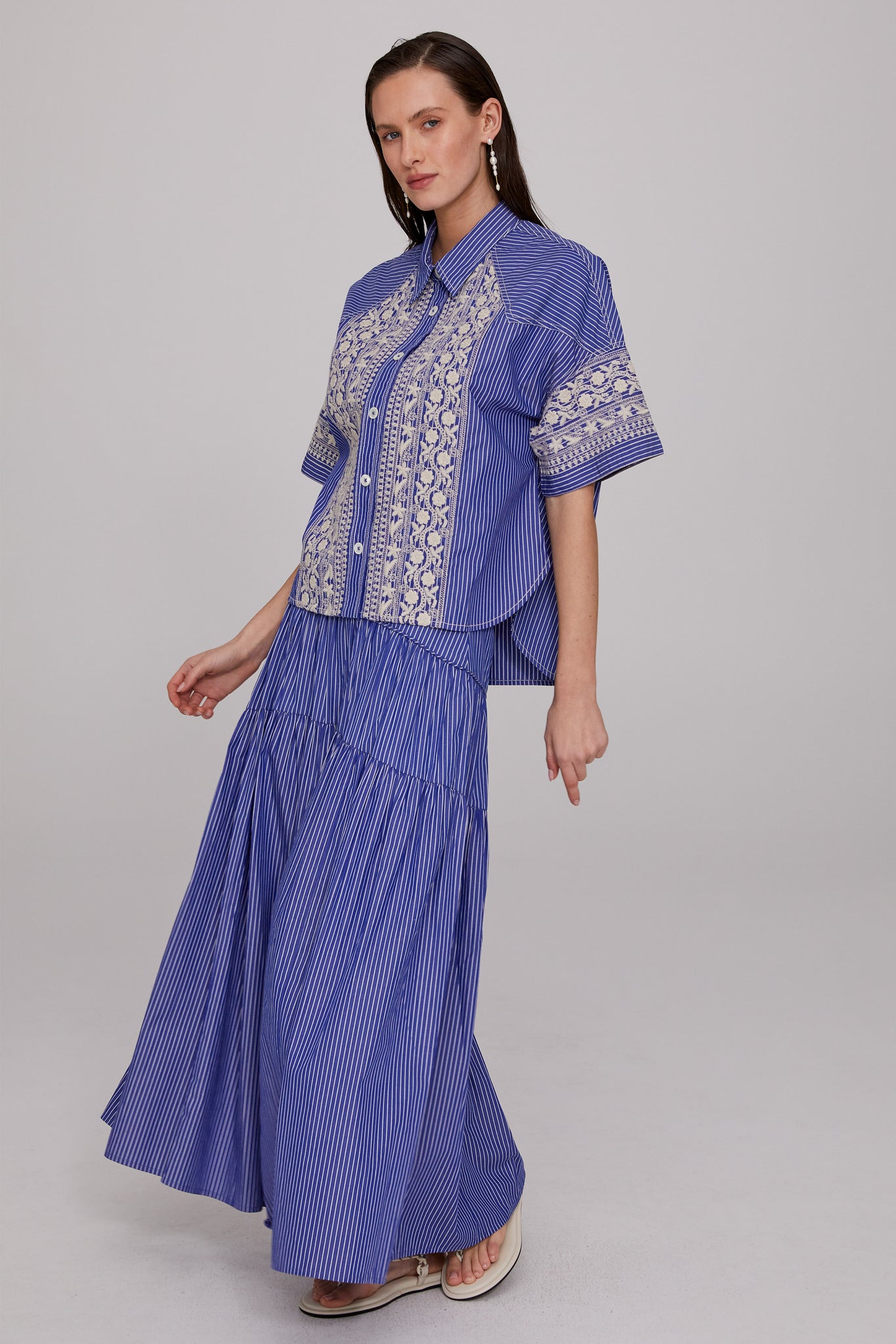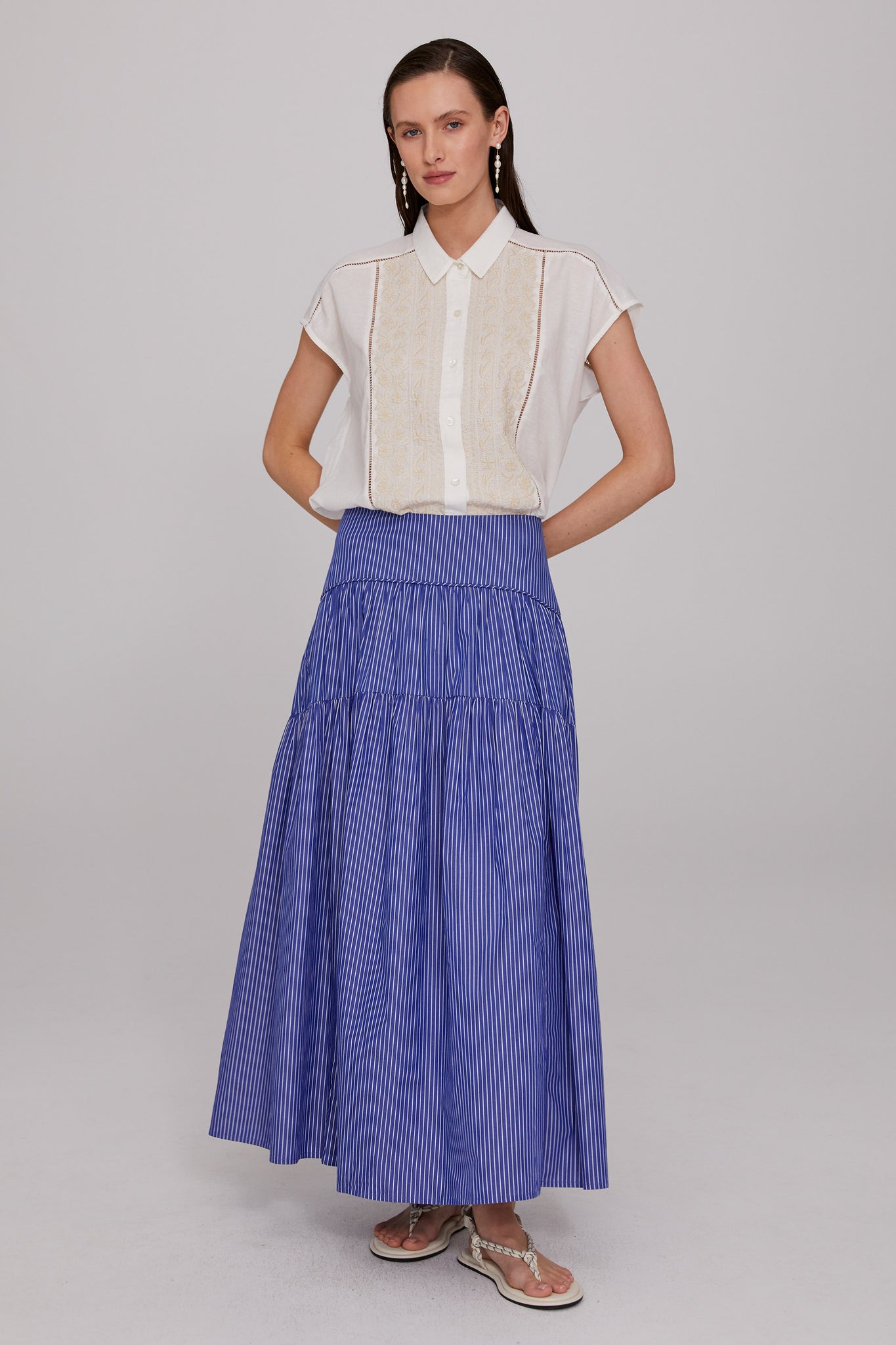 The Cobalt Stripe Poplin Tiered Skirt is crafted with a fitted basque that flatters the waist, its tiered silhouette falls into voluminous gathers that create a graceful sway with every step. In classic blue and white stripes, it feels fresh and light — the perfect palette for summer. Versatile and easy to style, it pairs effortlessly with so many MEGAN PARK tops this summer and worn here with the Riley Cotton Linen Top.