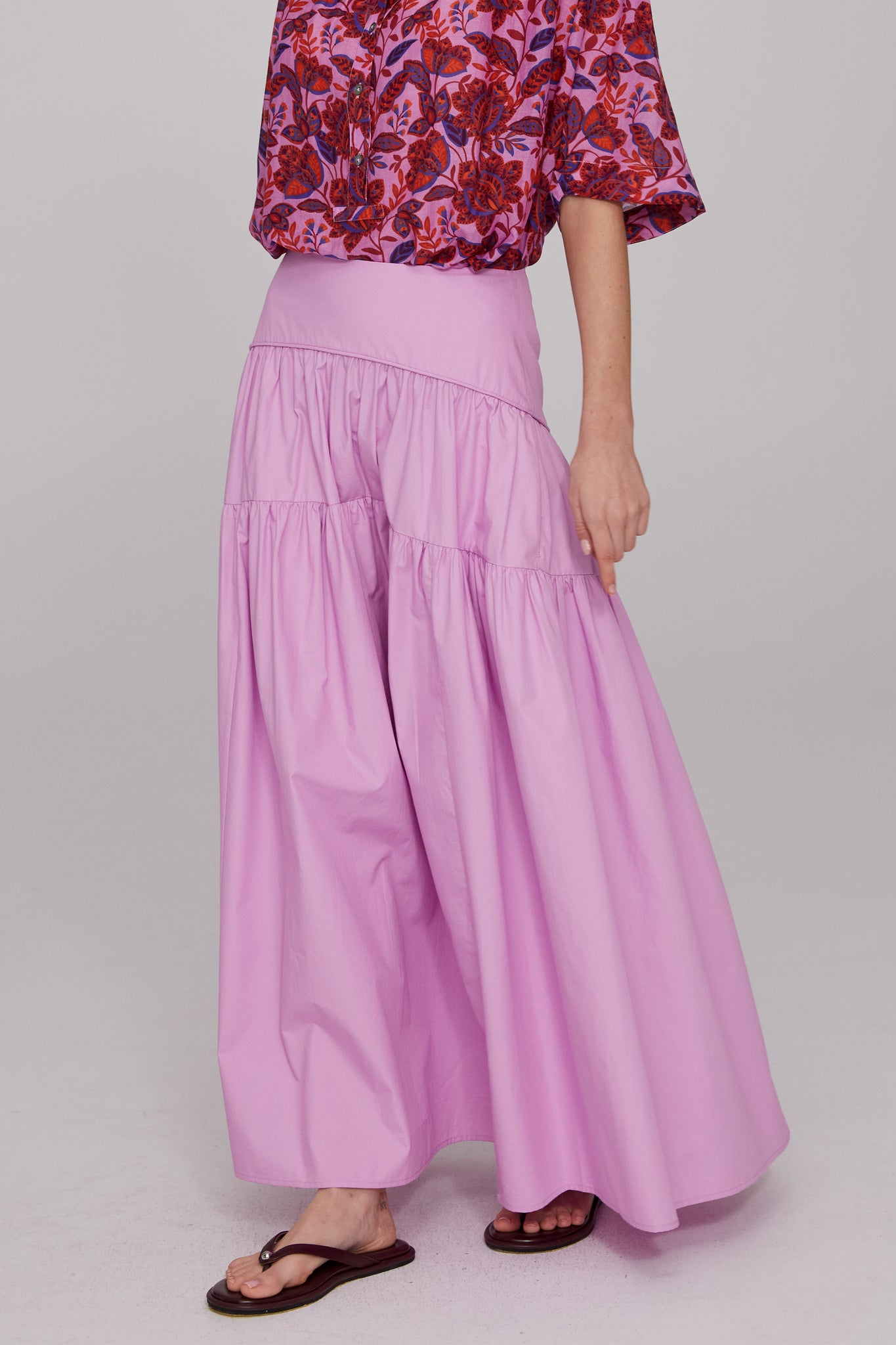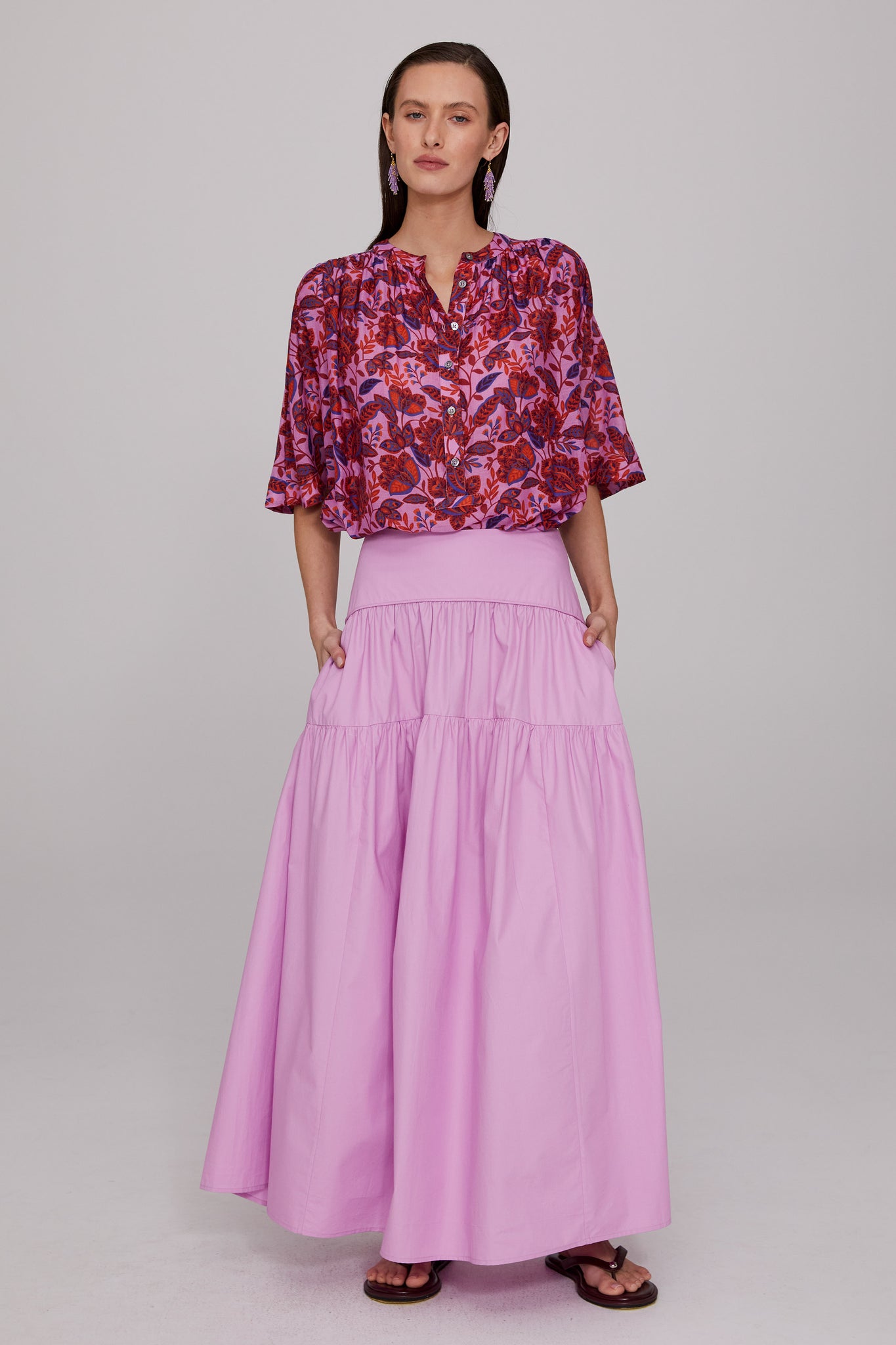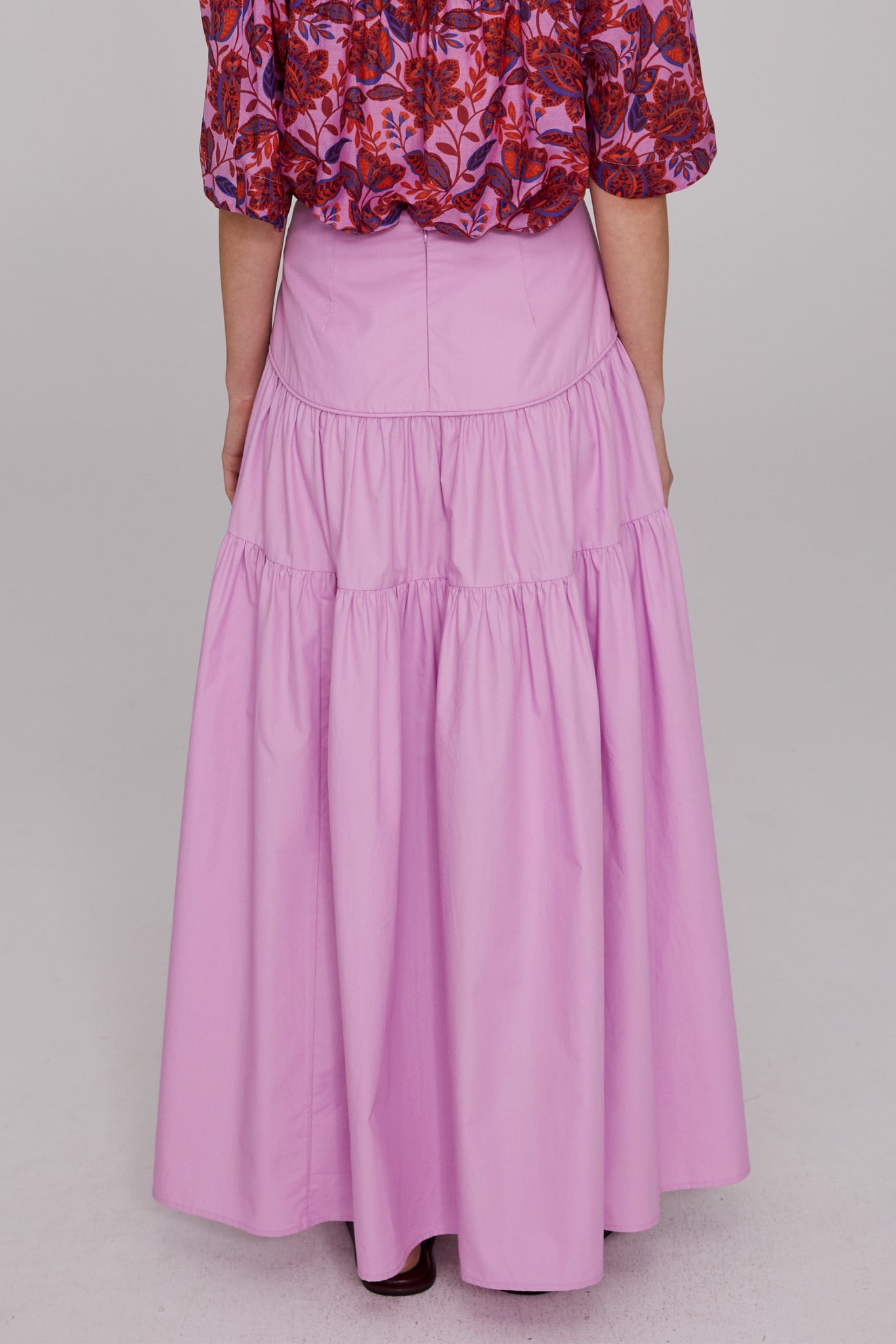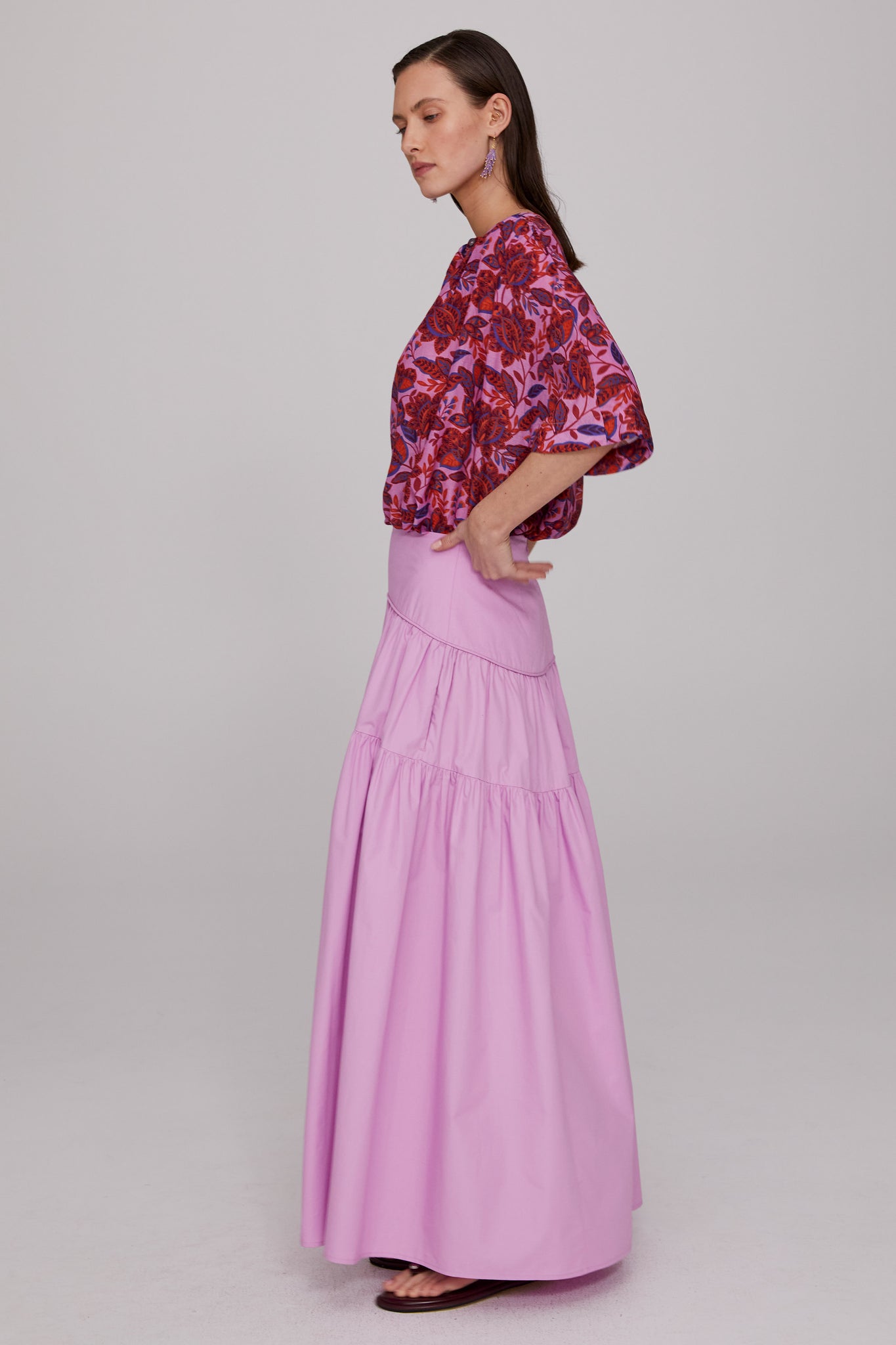 In the prettiest shade of pink, the Pink Poplin Tiered Skirt is the perfect piece for the summer season ahead. Crafted from crisp cotton poplin, it features a fitted basque that defines the waist before falling into voluminous tiered gathers that move with graceful ease. Versatile and feminine, it pairs beautifully with many MEGAN PARK tops, including the Ariana Pink Silk Cotton Top and the Zuri Cotton Linen Shirt.