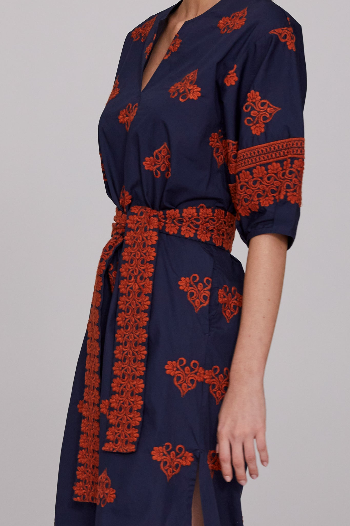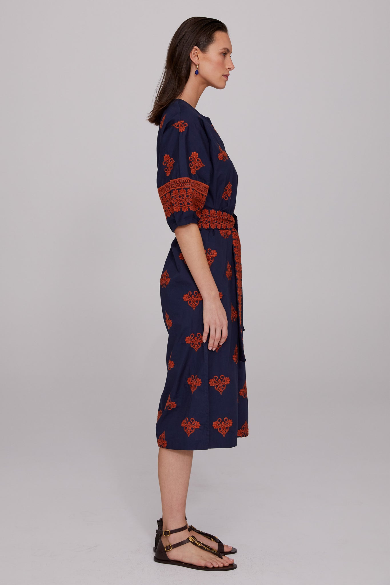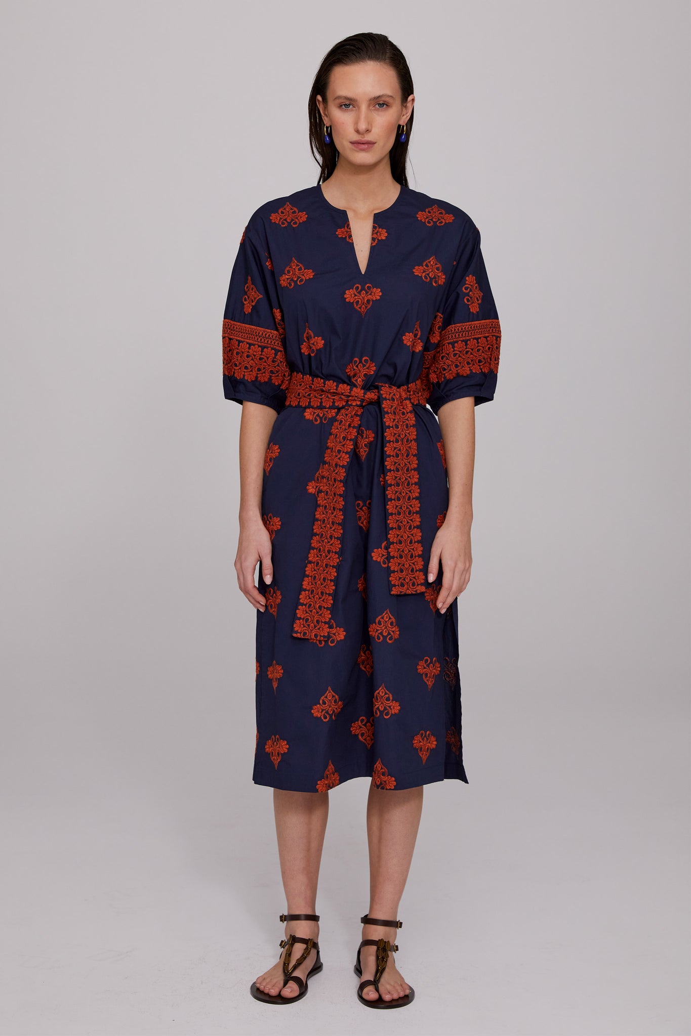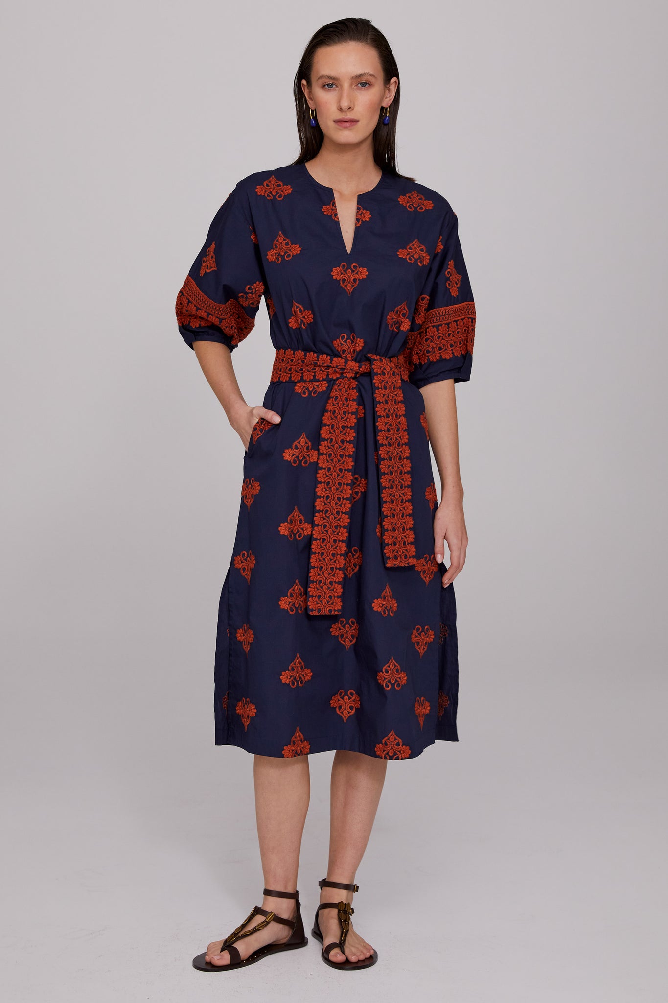 The Aria Embroidered Poplin Dress is an artisanal design and a timeless piece, distinguished by intricate rust-hued embroidery. Crafted in a relaxed straight silhouette, it features lantern-shaped sleeves and a decorative embroidered belt to softly define the waist. Practical side seam pockets lend ease to its elegance, while the richly textural embroidery celebrates the signature detailing so inherently MEGAN PARK. Wear with flat summer sandals and complete the look with our Lapis Teardrop Earrings.
