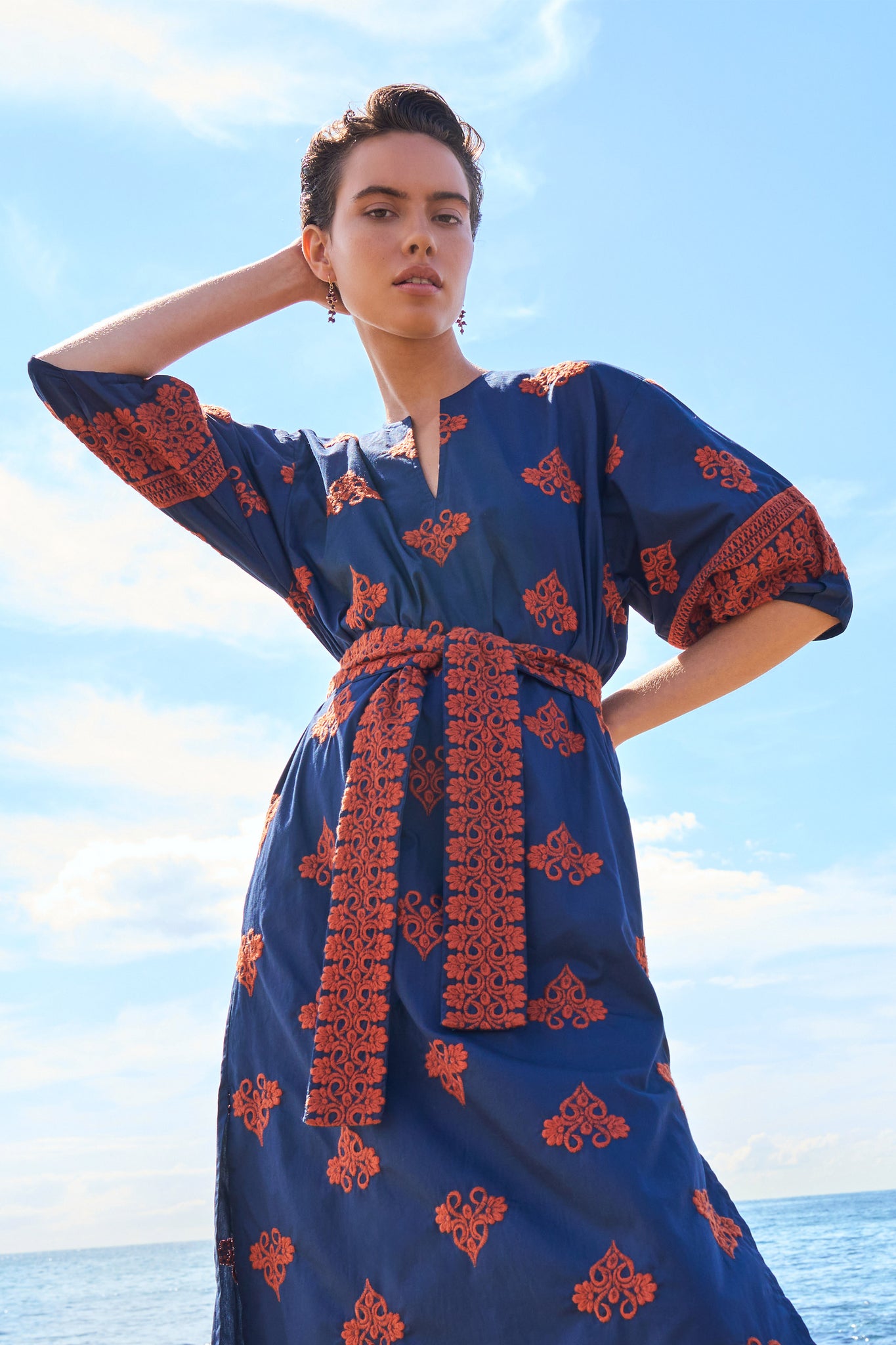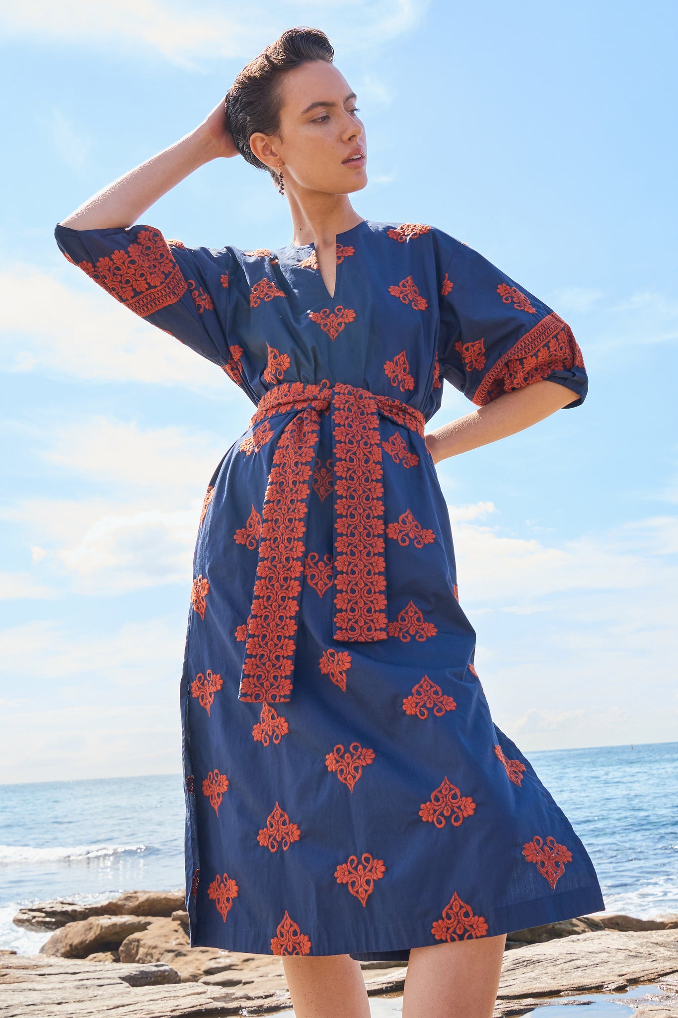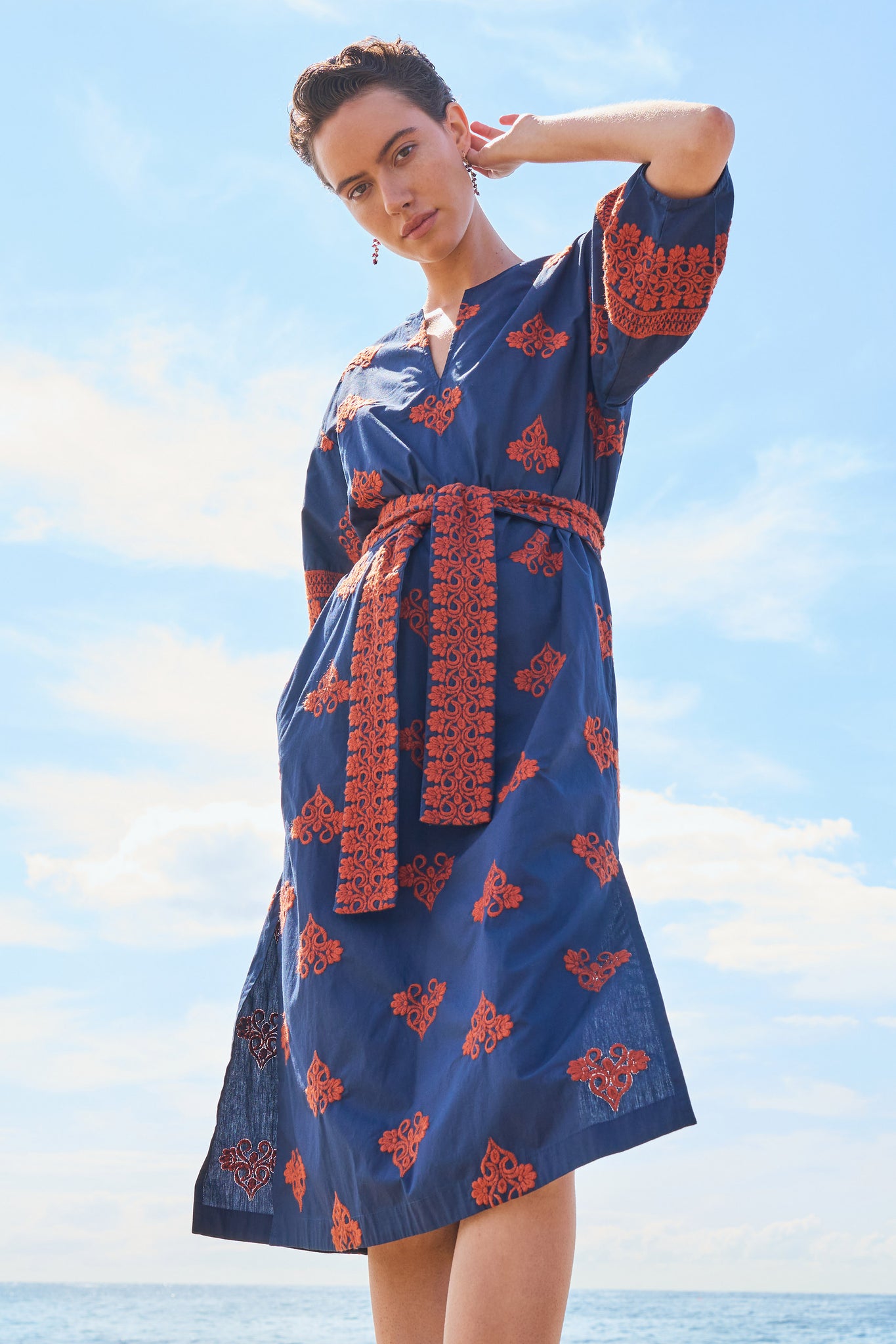 The Aria Embroidered Poplin Dress is an artisanal design and a timeless piece, distinguished by intricate rust-hued embroidery. Crafted in a relaxed straight silhouette, it features lantern-shaped sleeves and a decorative embroidered belt to softly define the waist. Practical side seam pockets lend ease to its elegance, while the richly textural embroidery celebrates the signature detailing so inherently MEGAN PARK. Wear with flat summer sandals and complete the look with our Lapis Teardrop Earrings.
