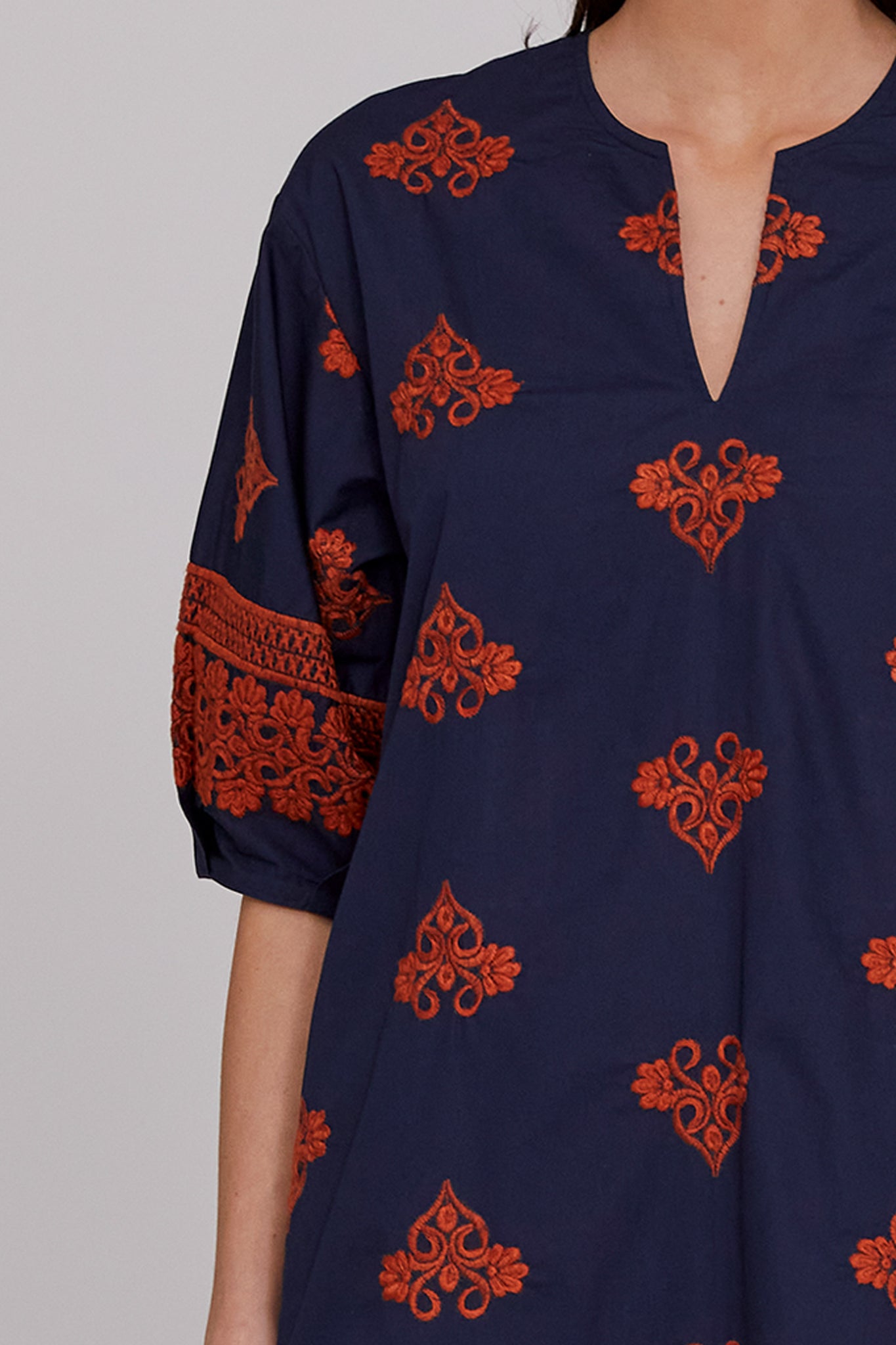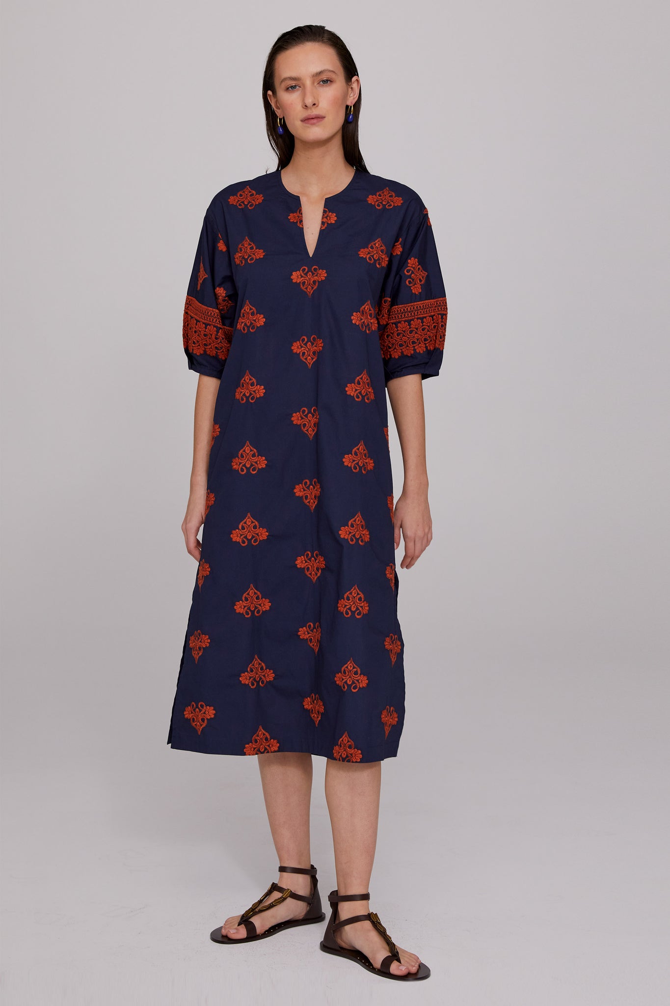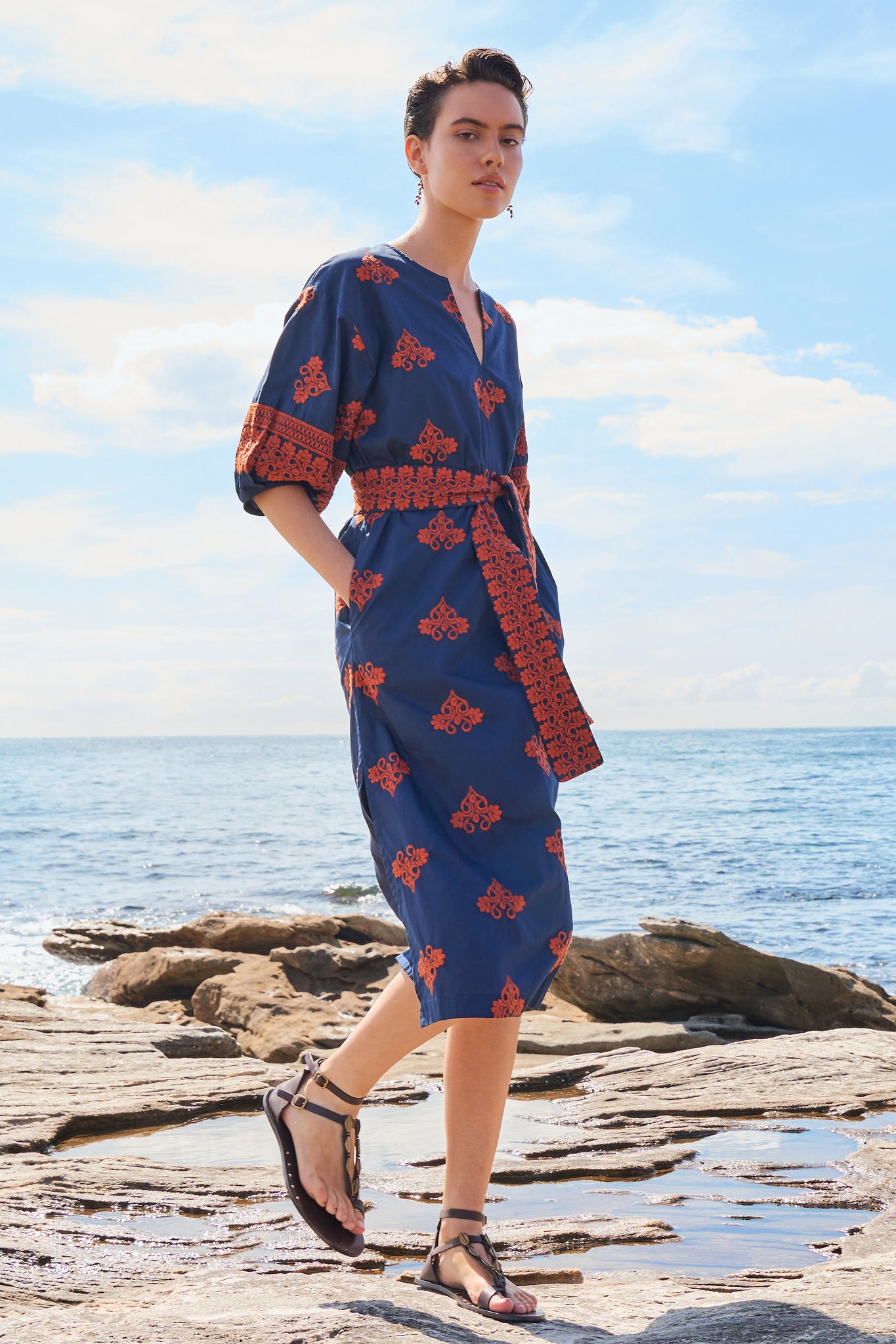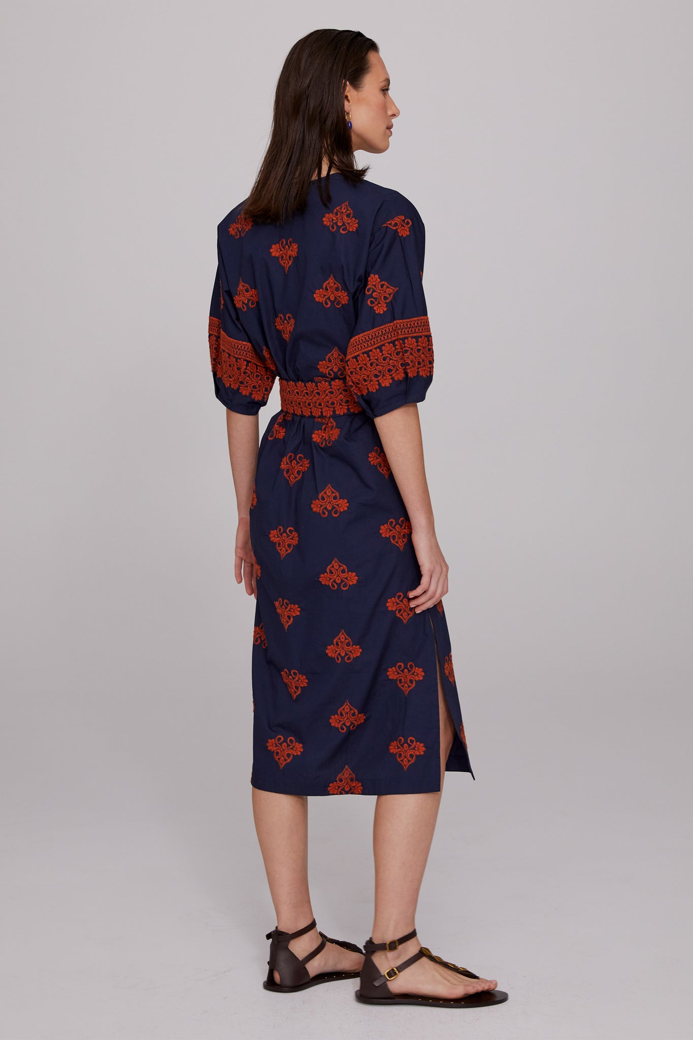 The Aria Embroidered Poplin Dress is an artisanal design and a timeless piece, distinguished by intricate rust-hued embroidery. Crafted in a relaxed straight silhouette, it features lantern-shaped sleeves and a decorative embroidered belt to softly define the waist. Practical side seam pockets lend ease to its elegance, while the richly textural embroidery celebrates the signature detailing so inherently MEGAN PARK. Wear with flat summer sandals and complete the look with our Lapis Teardrop Earrings.