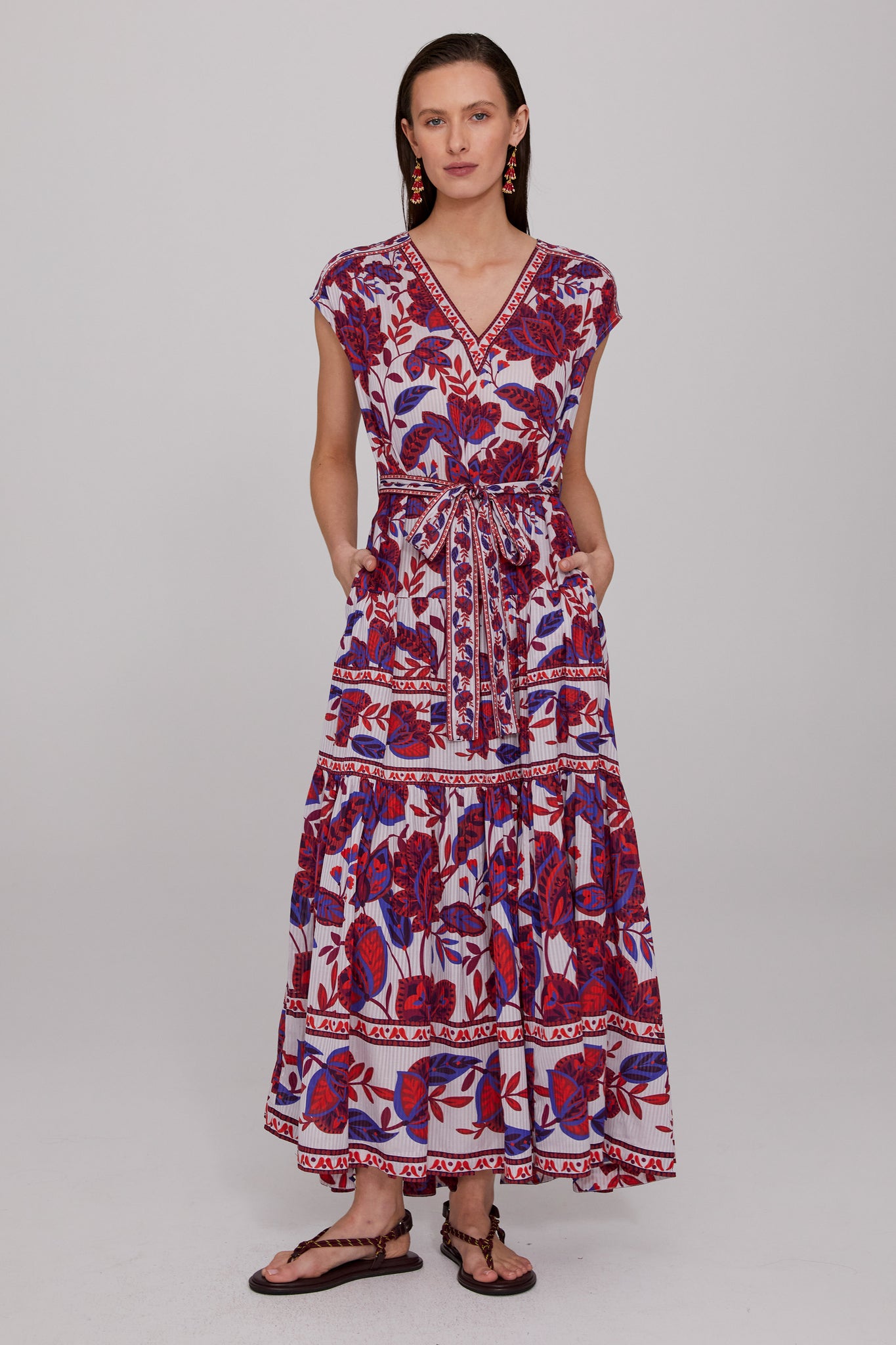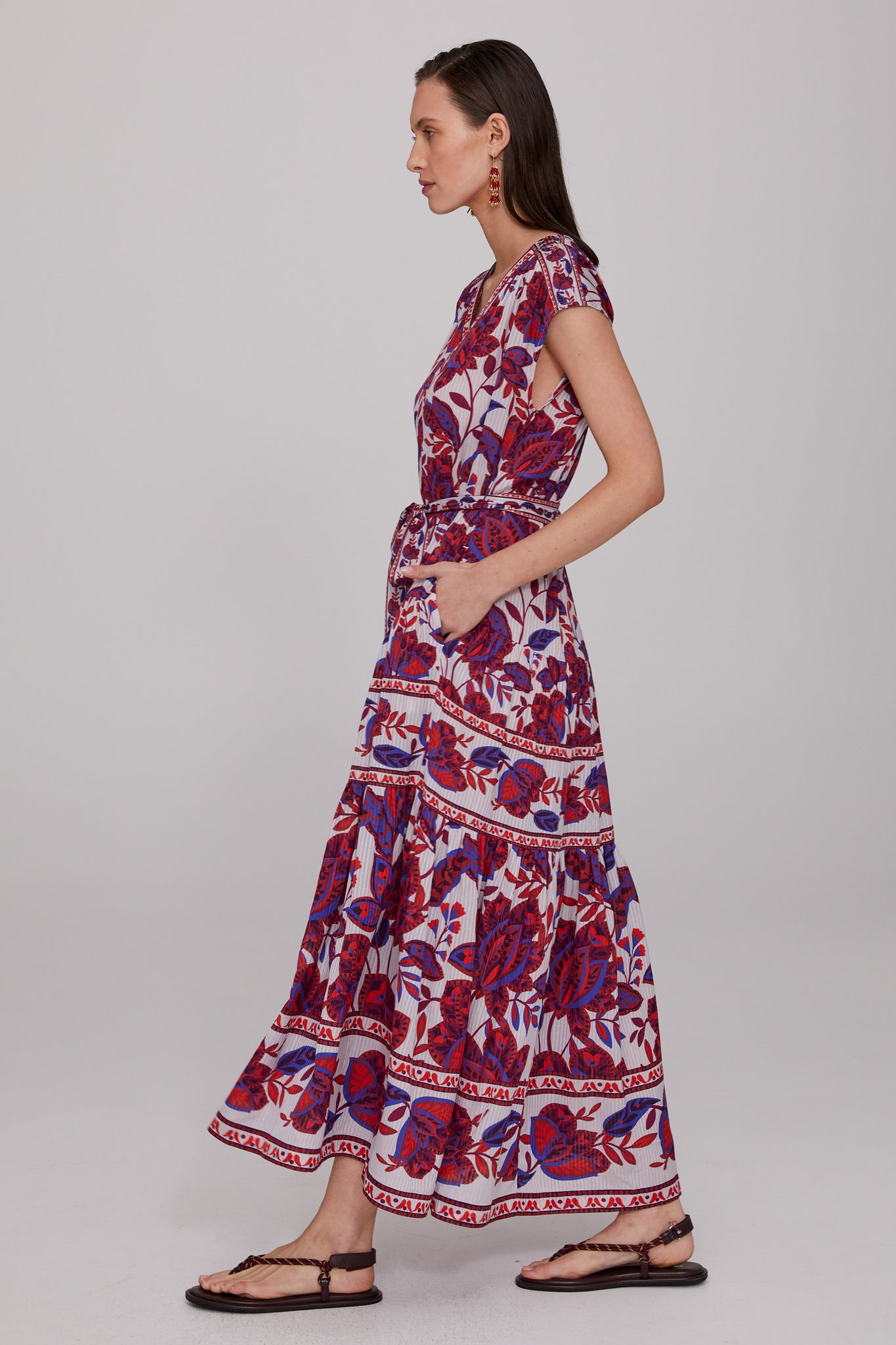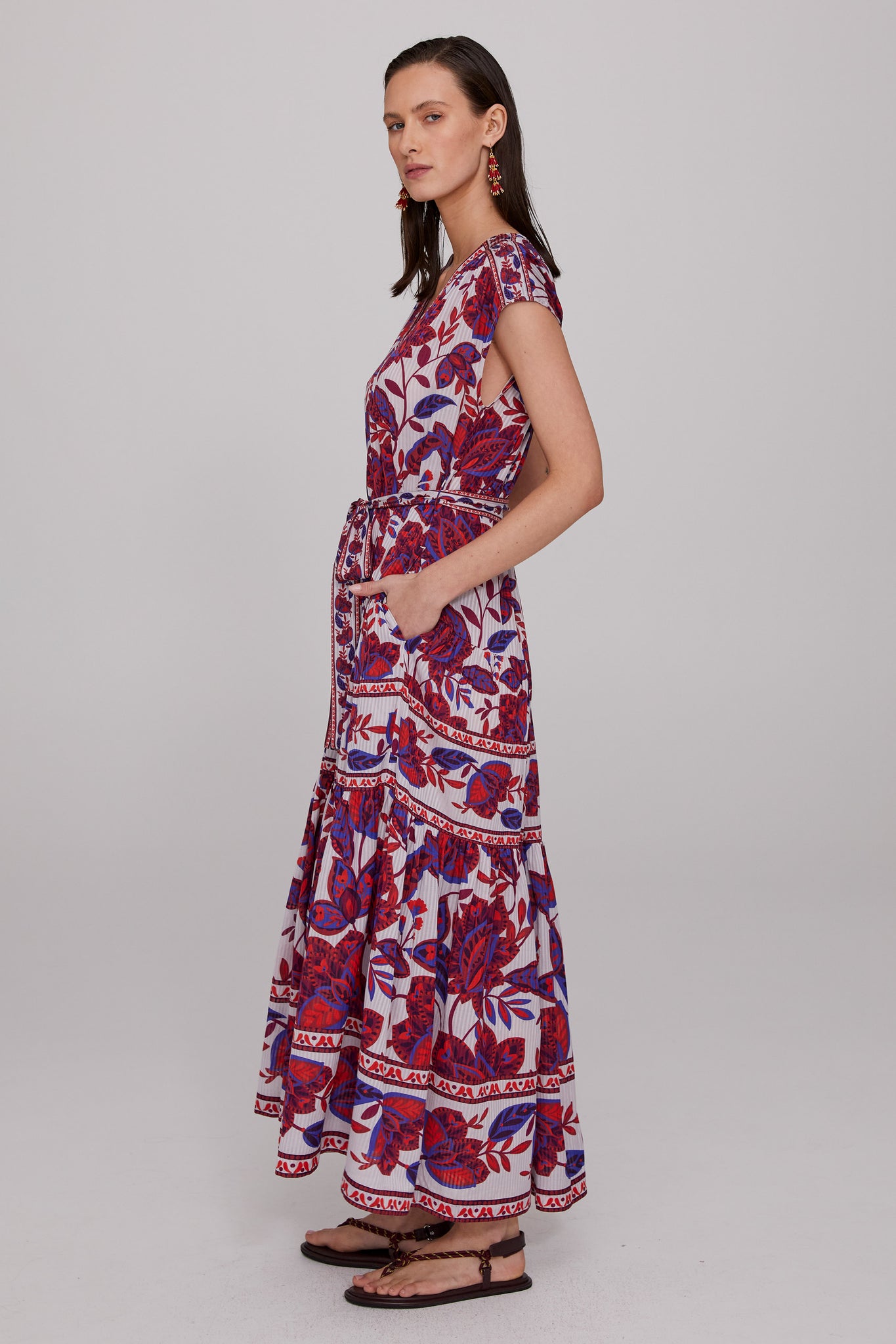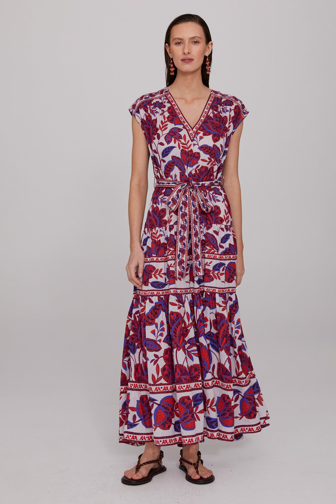 Celebrate effortless bohemian style with the Ariana Sateen Stripe Dress, designed in a folkloric print of rich blues and reds on a base of palest lilac. Crafted from a natural self-stripe fabric with a soft lustre and graceful drape, this dress offers both comfort and refinement. The straight V-neck bodice extends into a tiered, gathered skirt which sweeps till just above the ankles. An optional belt can be tied to define the waist or styled at the back for a relaxed, free-flowing silhouette. Extended shoulders create an elegant line through the arms, making this piece as flattering as it is versatile. Be it Xmas day or an evening dinner date, this celebrates the joy that is summer.
