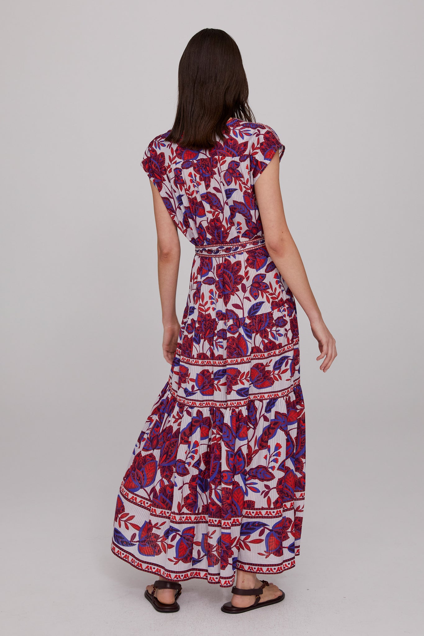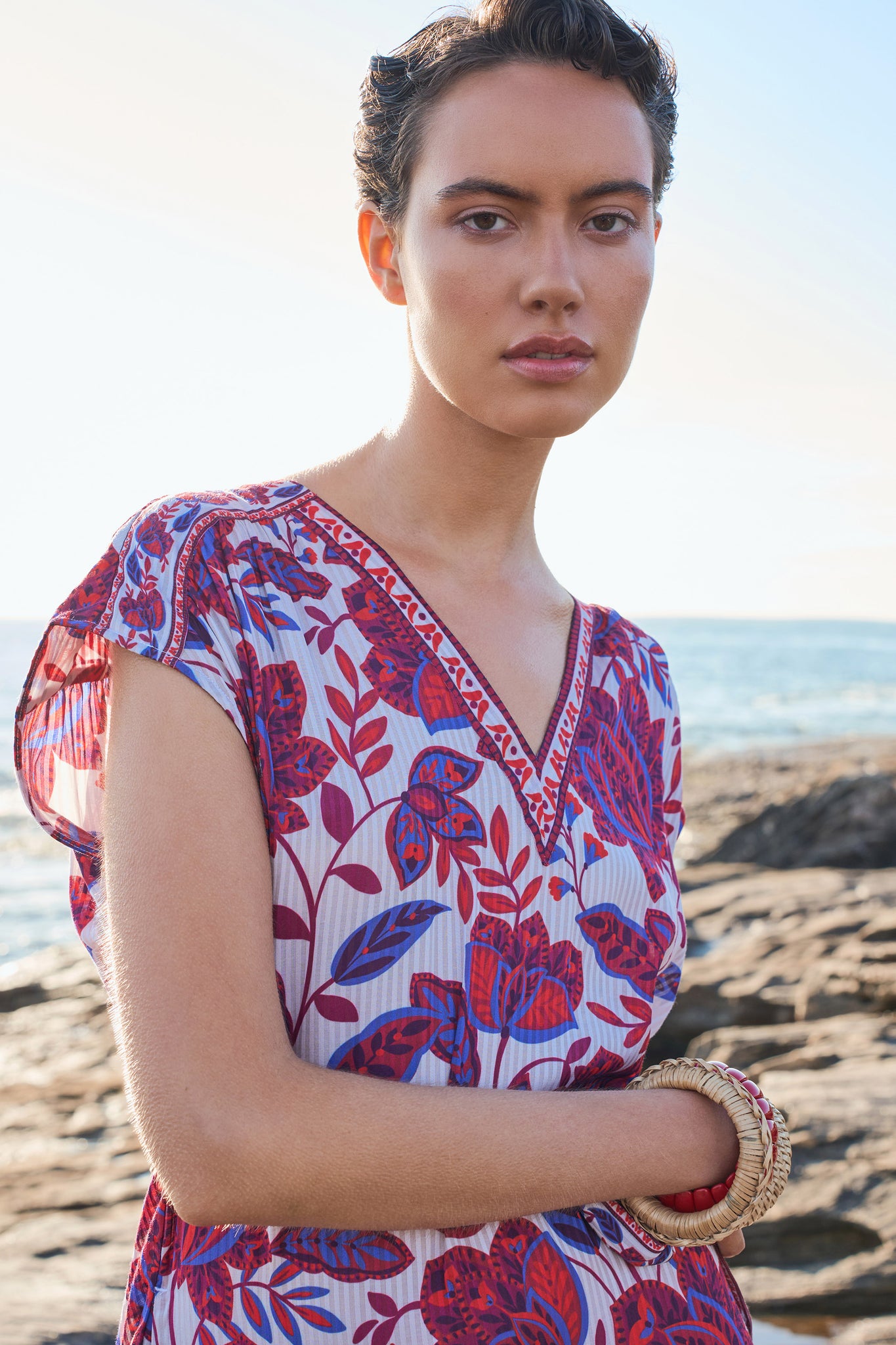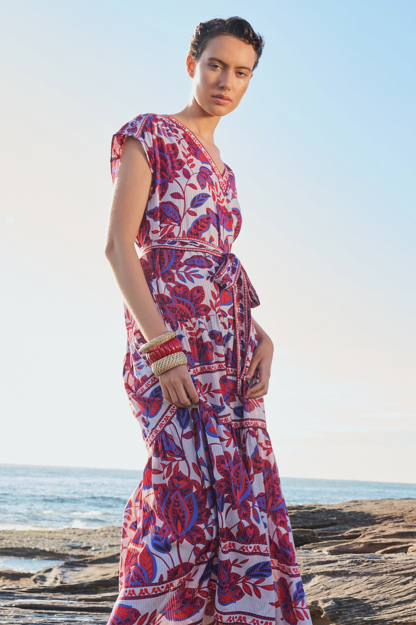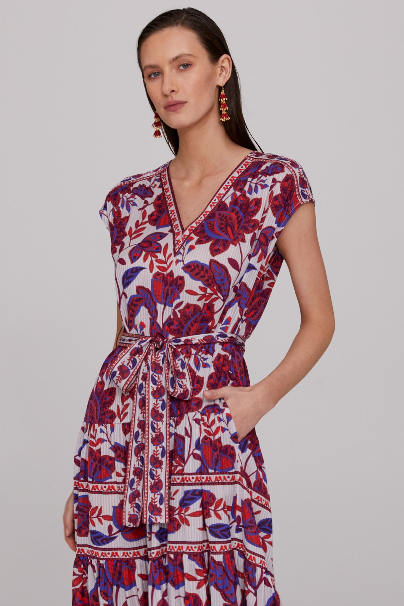 Celebrate effortless bohemian style with the Ariana Sateen Stripe Dress, designed in a folkloric print of rich blues and reds on a base of palest lilac. Crafted from a natural self-stripe fabric with a soft lustre and graceful drape, this dress offers both comfort and refinement. The straight V-neck bodice extends into a tiered, gathered skirt which sweeps till just above the ankles. An optional belt can be tied to define the waist or styled at the back for a relaxed, free-flowing silhouette. Extended shoulders create an elegant line through the arms, making this piece as flattering as it is versatile. Be it Xmas day or an evening dinner date, this celebrates the joy that is summer.