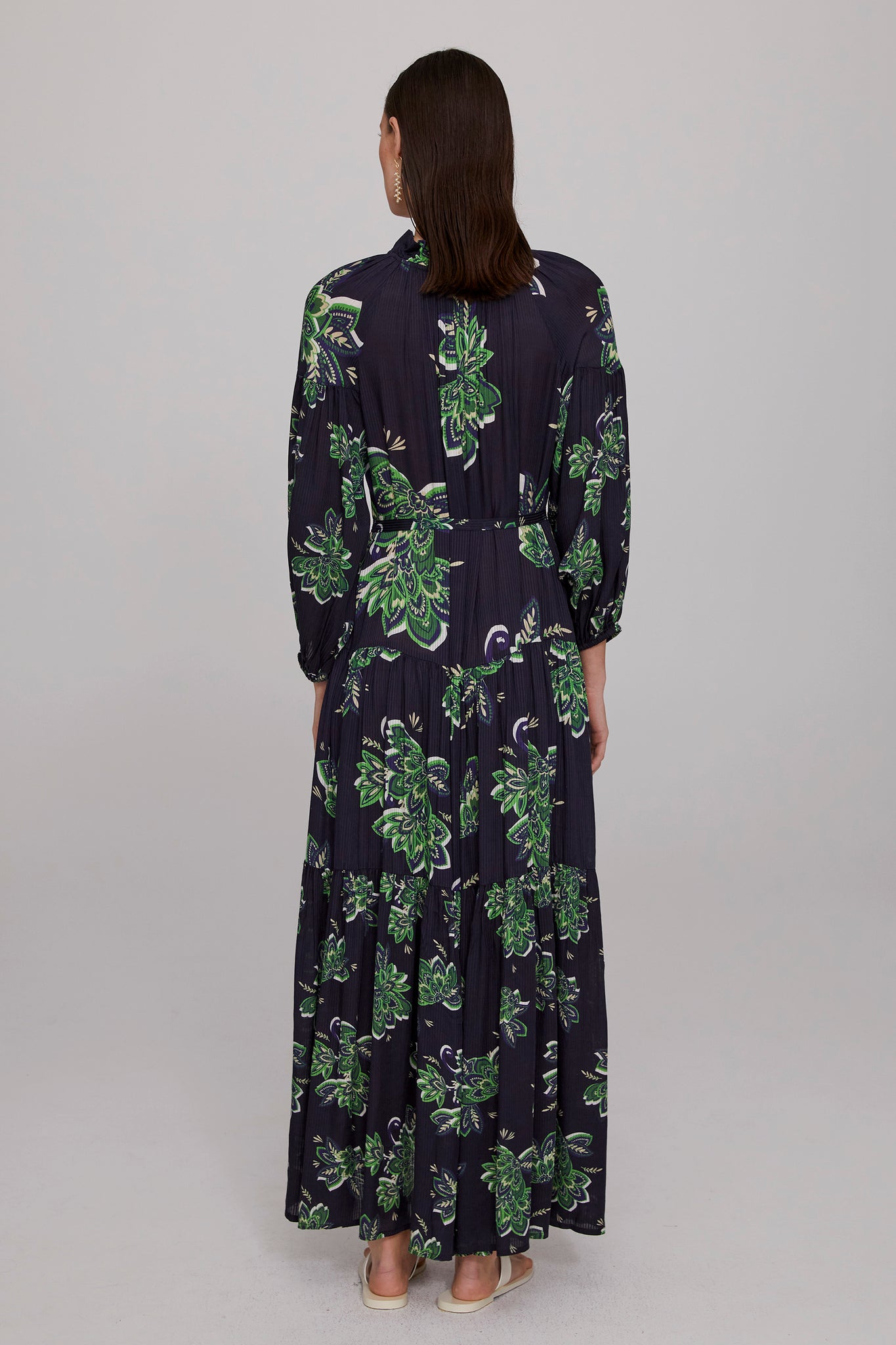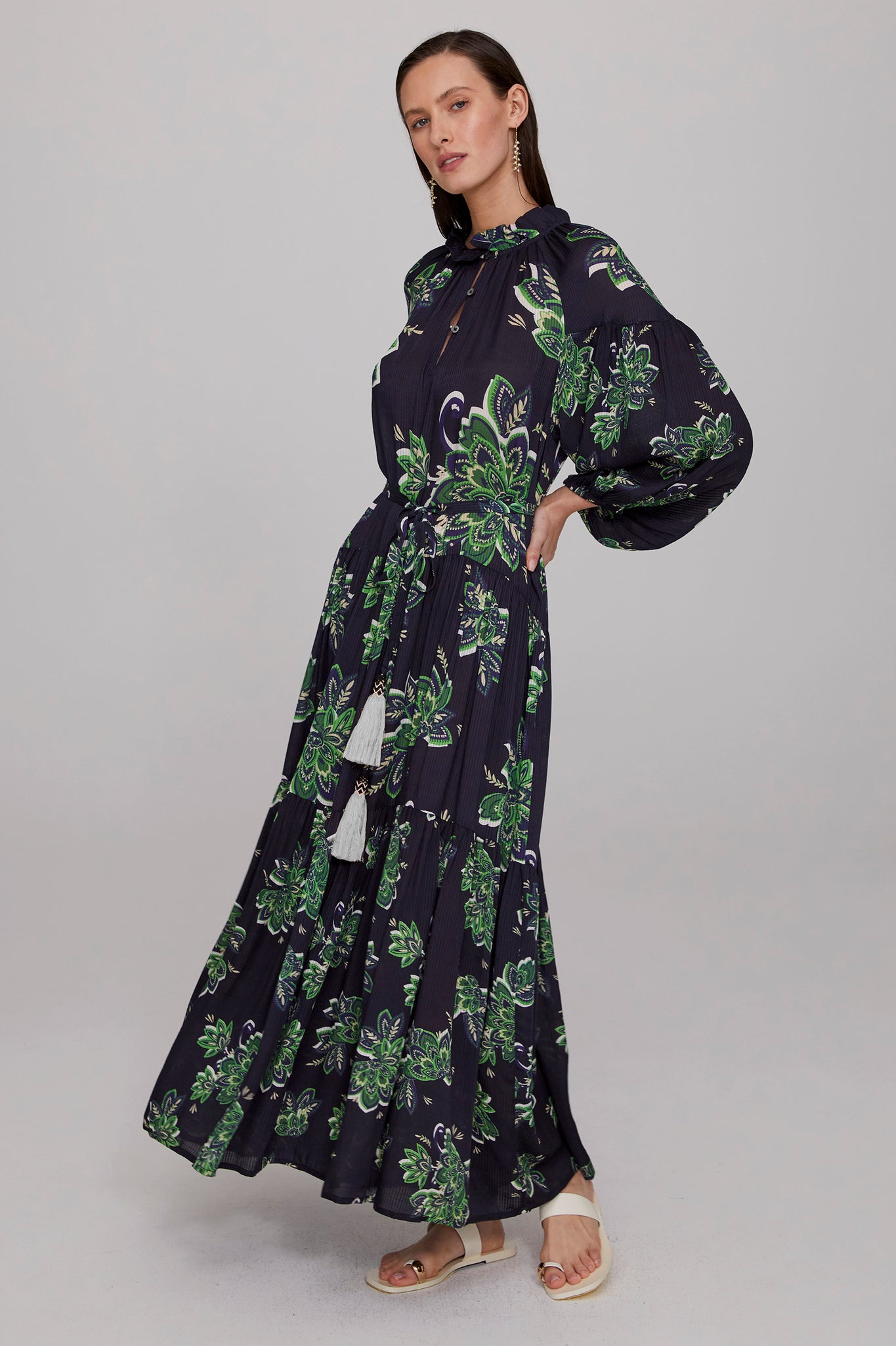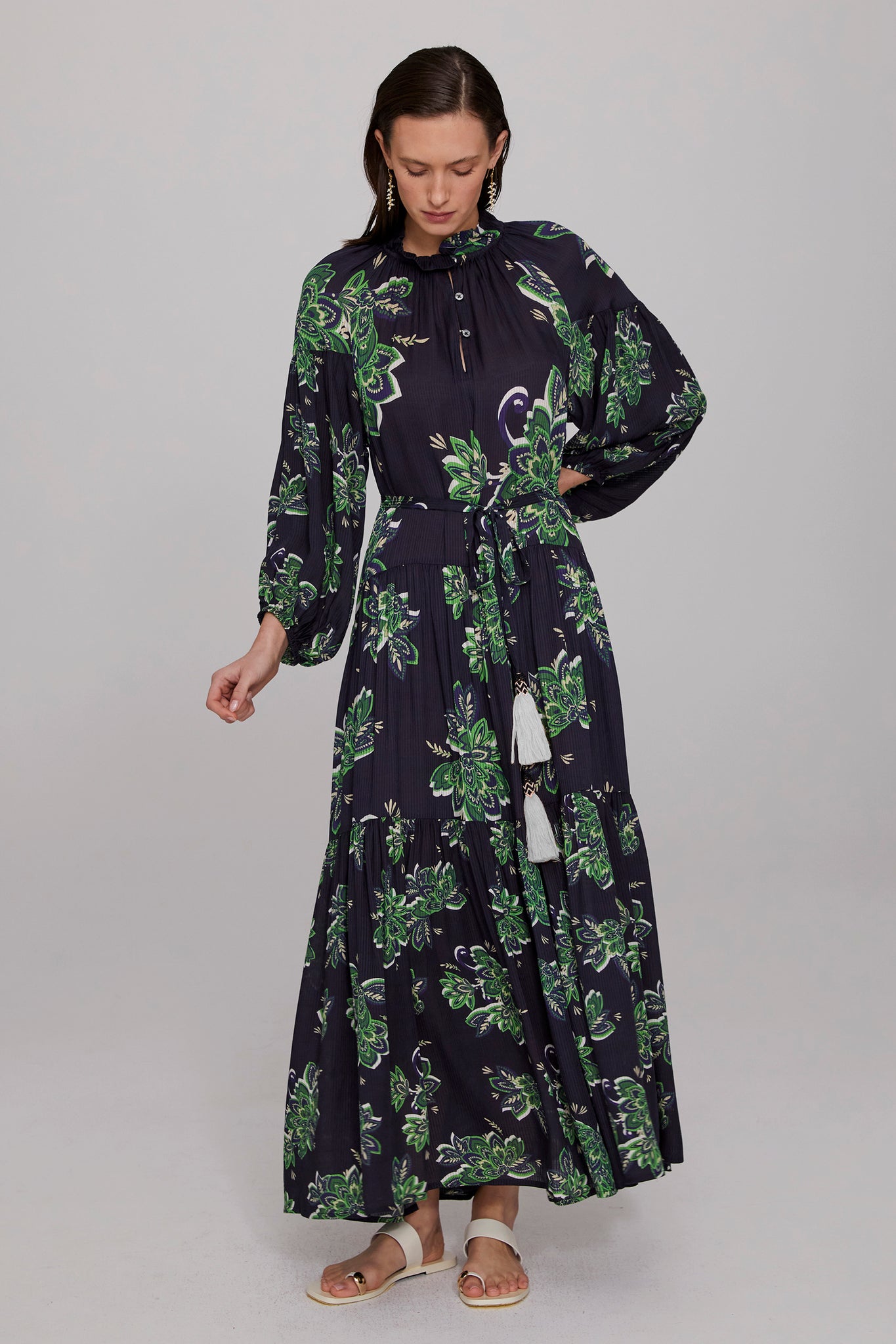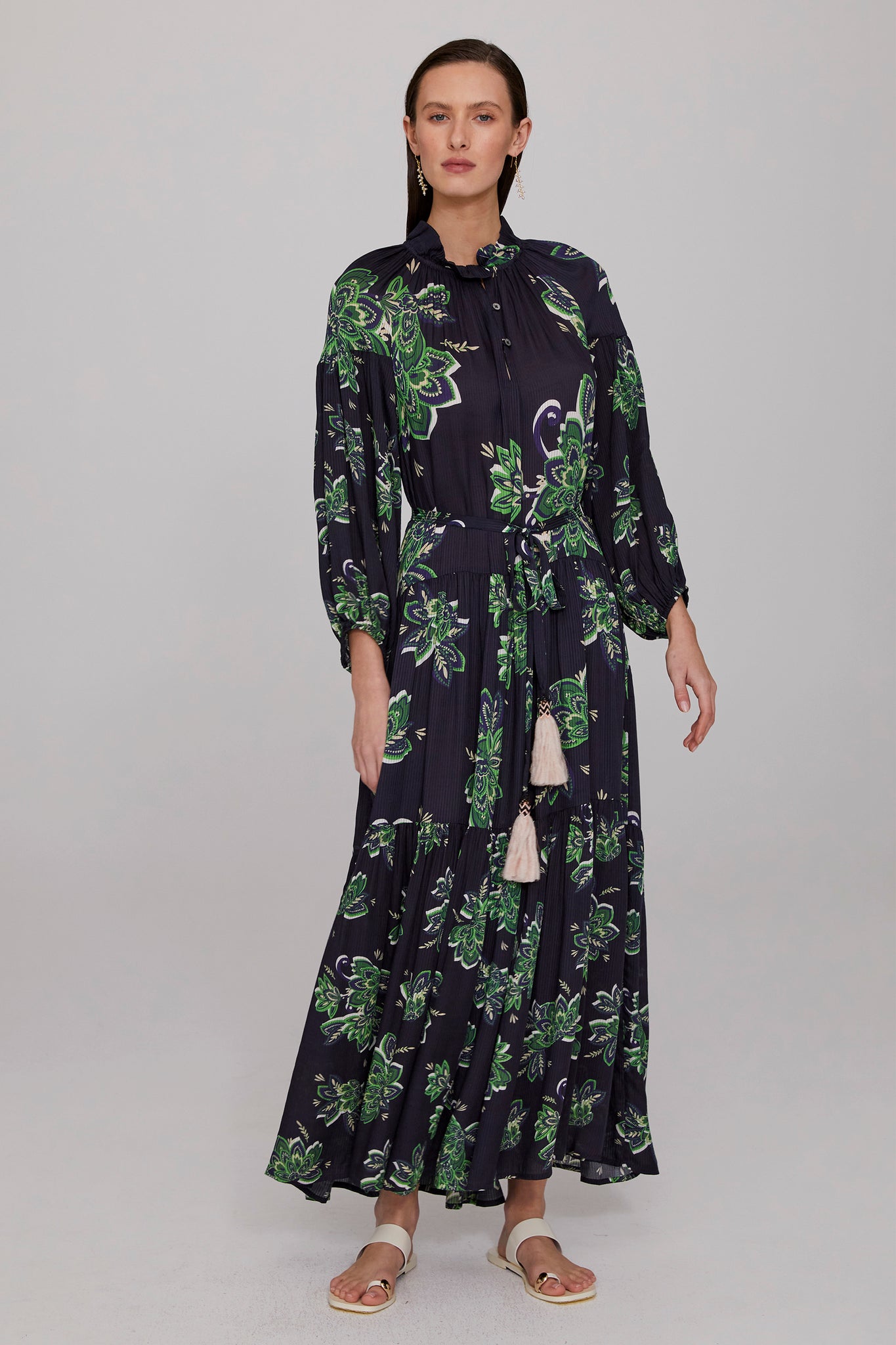 The Fiore Tiered Maxi Dress is defined by its fluid tiered silhouette and bold illustrative blooms in emerald and white against an inky base. Soft gathers from the ruffled collar and billowed sleeves lend effortless femininity, while the tasselled belt — hand-beaded by the women of RISE in New Delhi — cinches the waist with artisanal charm. Crafted in a lustrous, silky fabrication, this piece moves with ease and elegance, making it perfect for day-to-evening wear.