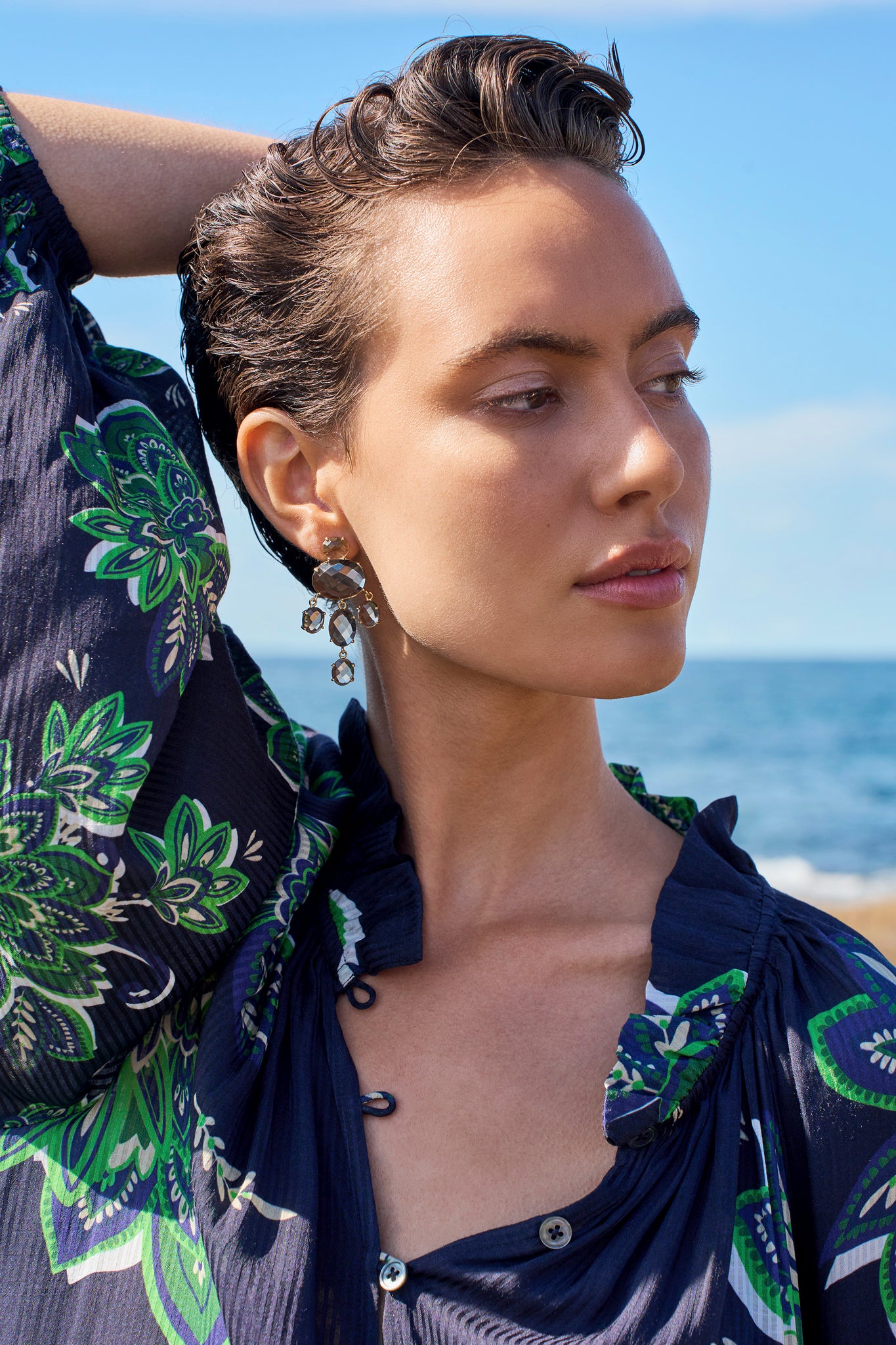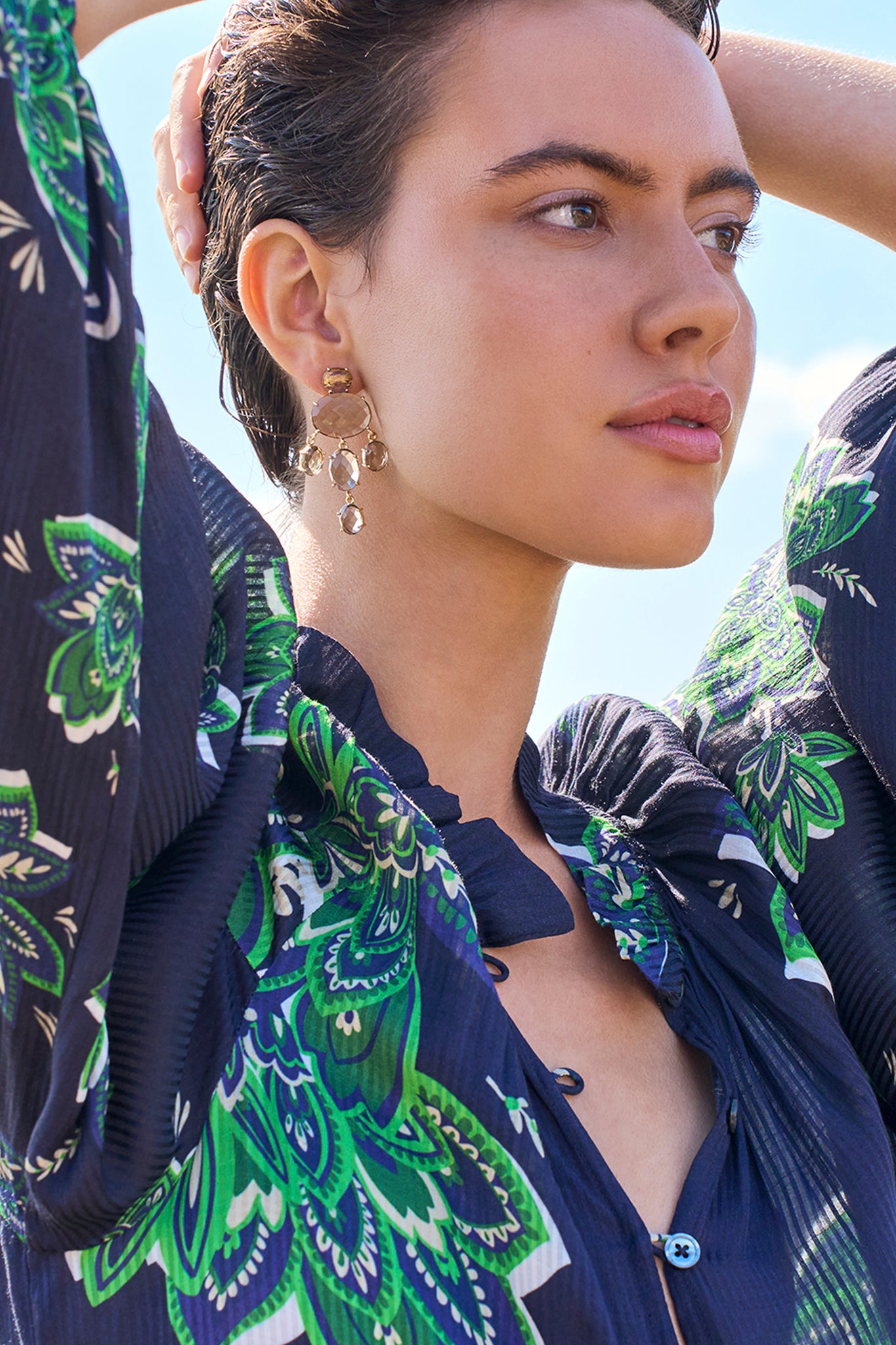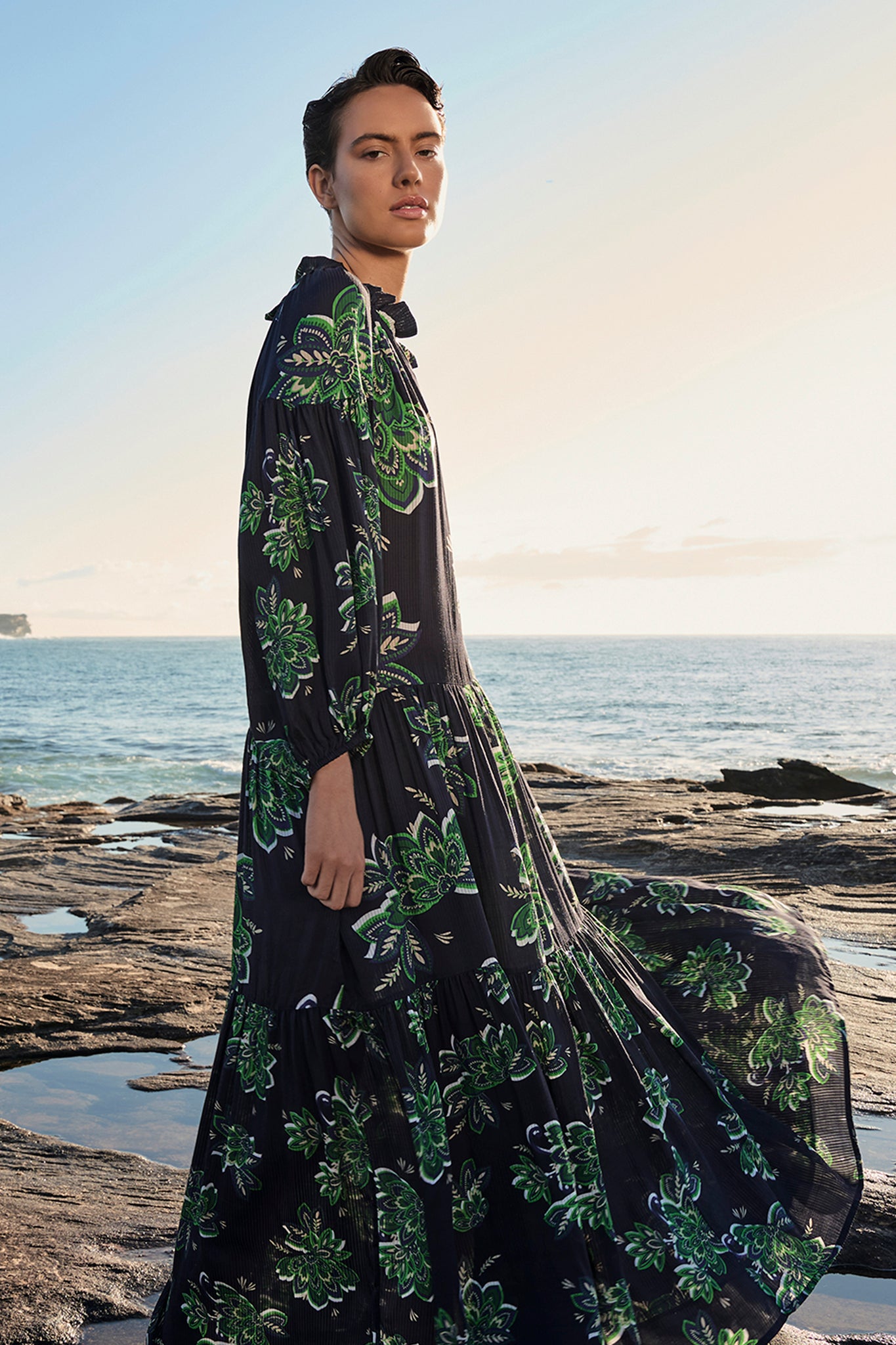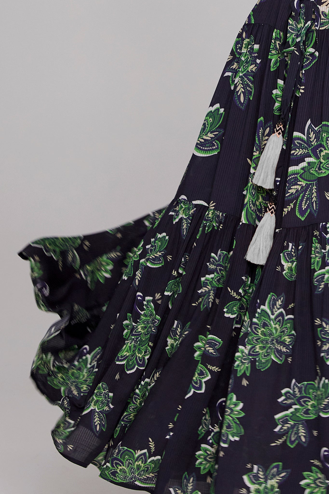 The Fiore Tiered Maxi Dress is defined by its fluid tiered silhouette and bold illustrative blooms in emerald and white against an inky base. Soft gathers from the ruffled collar and billowed sleeves lend effortless femininity, while the tasselled belt — hand-beaded by the women of RISE in New Delhi — cinches the waist with artisanal charm. Crafted in a lustrous, silky fabrication, this piece moves with ease and elegance, making it perfect for day-to-evening wear.