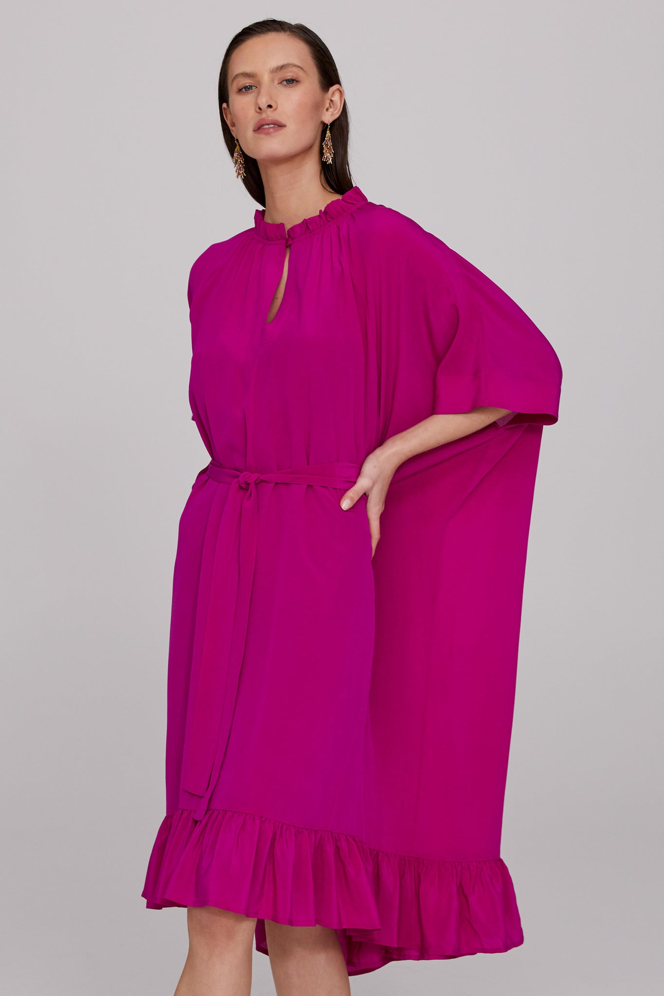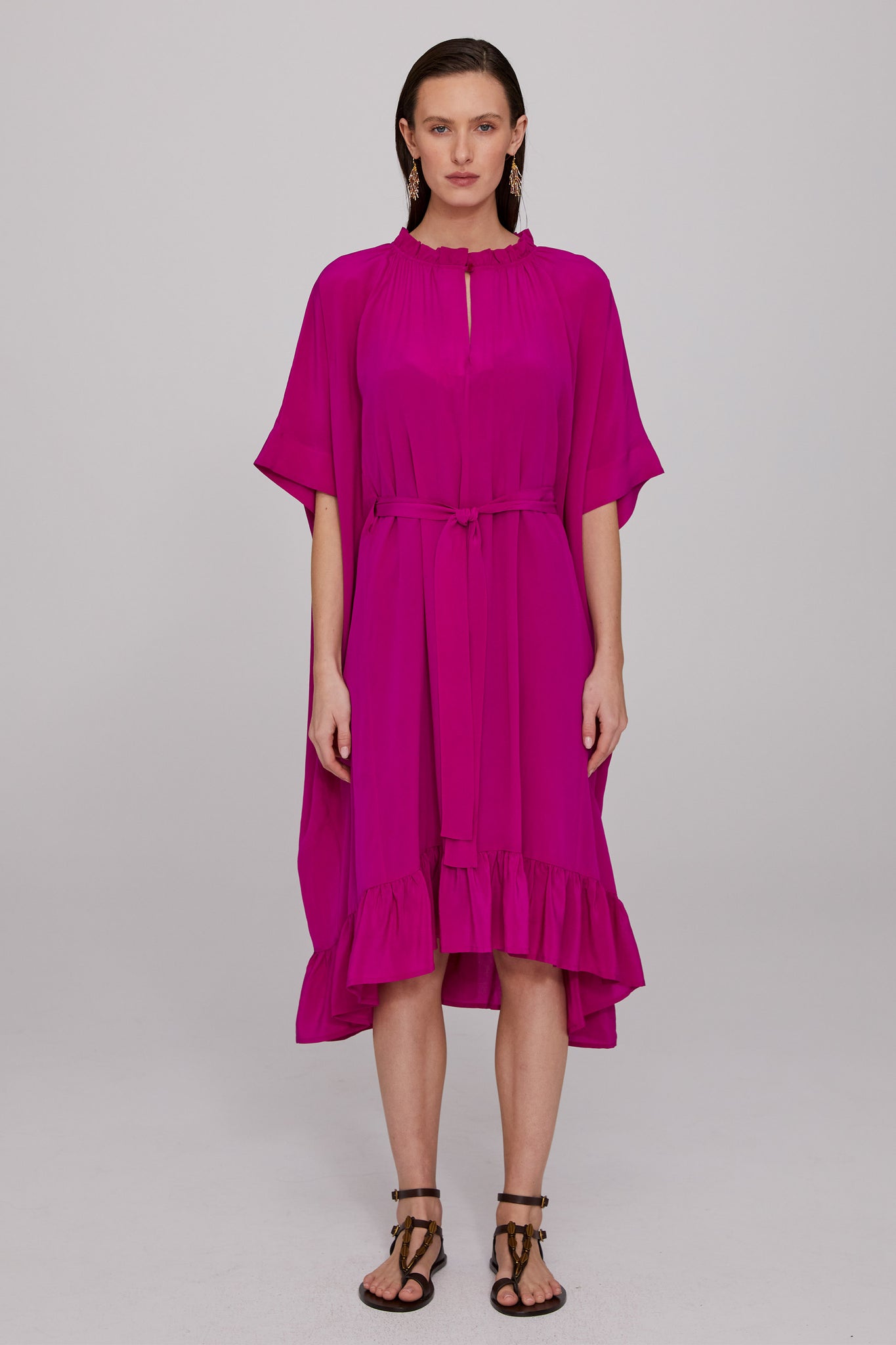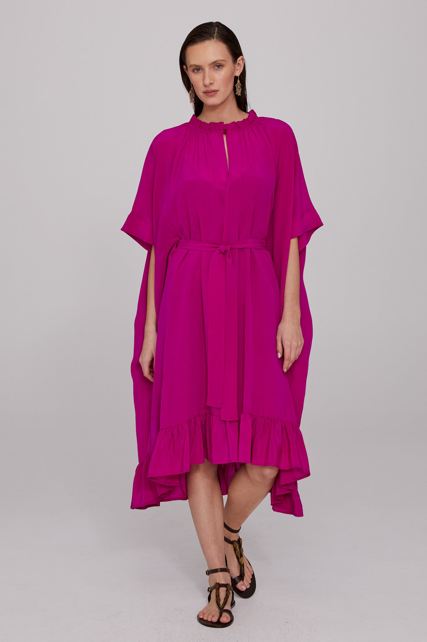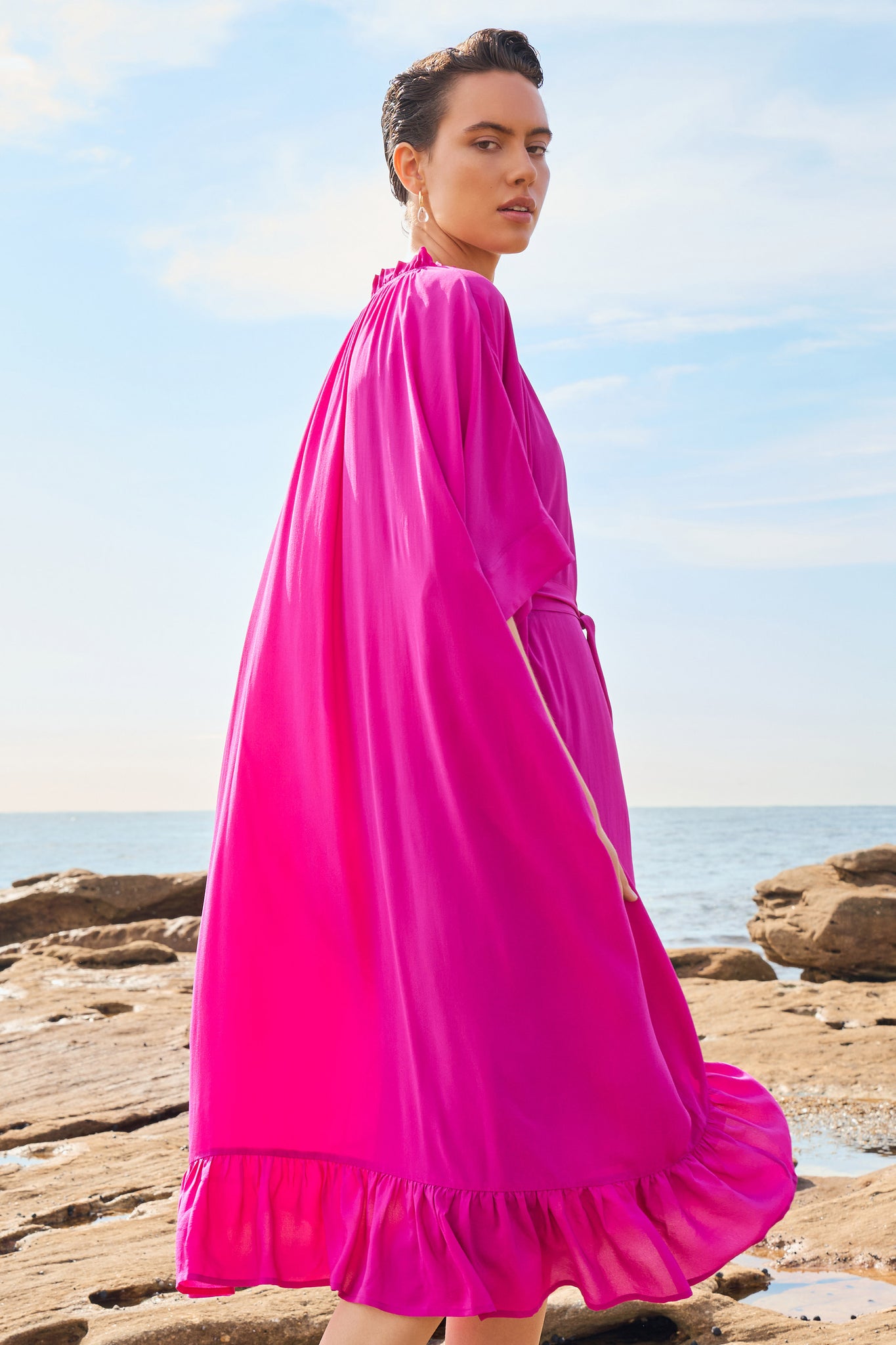 The Fuscia Silk Crepe Kaftan & Slip is destined to be one of our hero pieces of the season. Crafted from luxurious silk crepe de chine in the most brilliant pink hue, its fluid silhouette is elevated with delicate ruffles at the neckline and hem, adding a touch of romance. The coordinating bias-cut slip ensures ease and coverage, while the self-tie belt threads through discreet buttonhole openings, allowing you to cinch at the front or wrap around the waist for a defined shape. Finished with a covered silk button at the neck, this kaftan brings effortless sophistication—perfect for summer soirées or elegant holiday dressing.