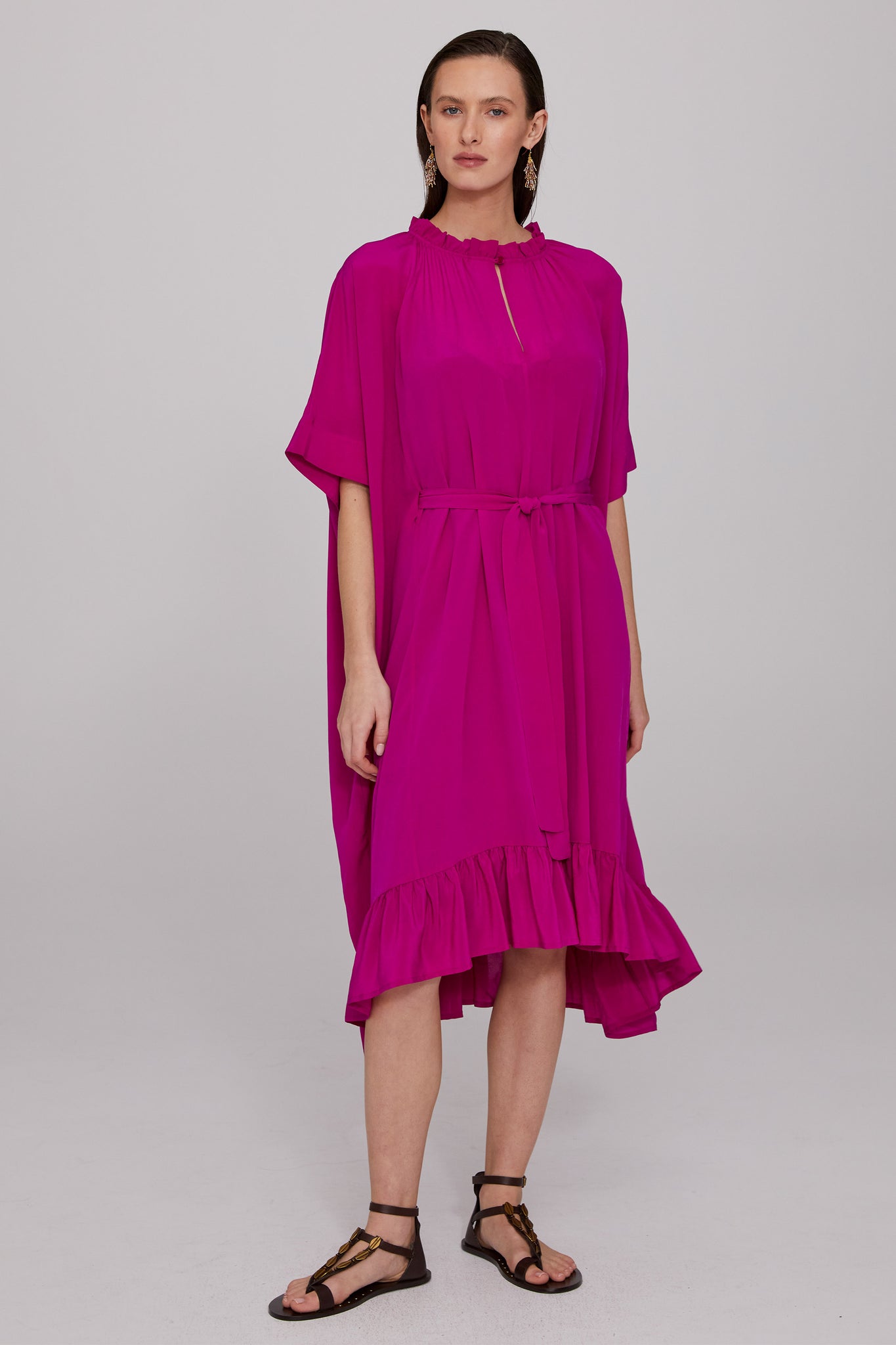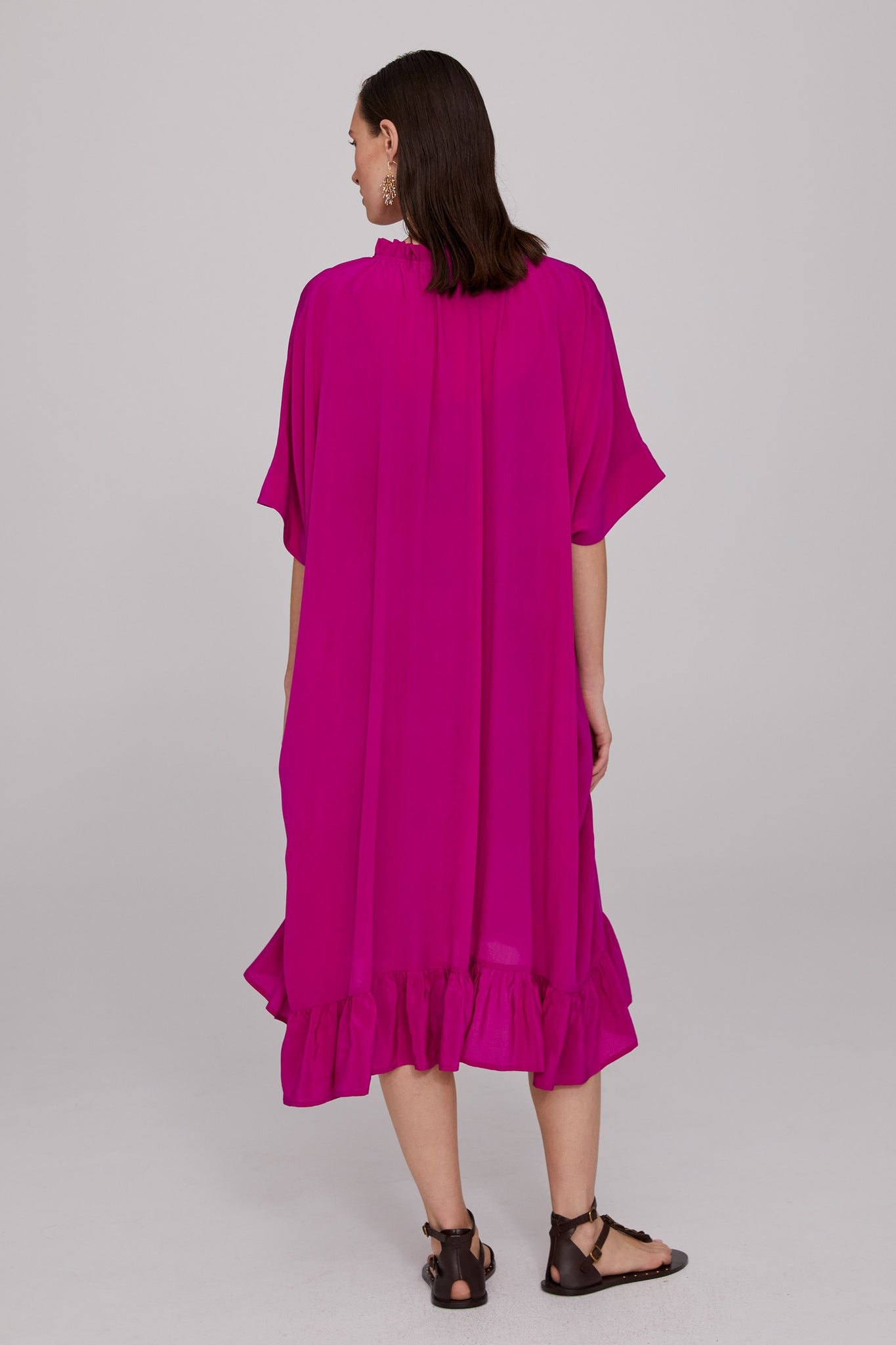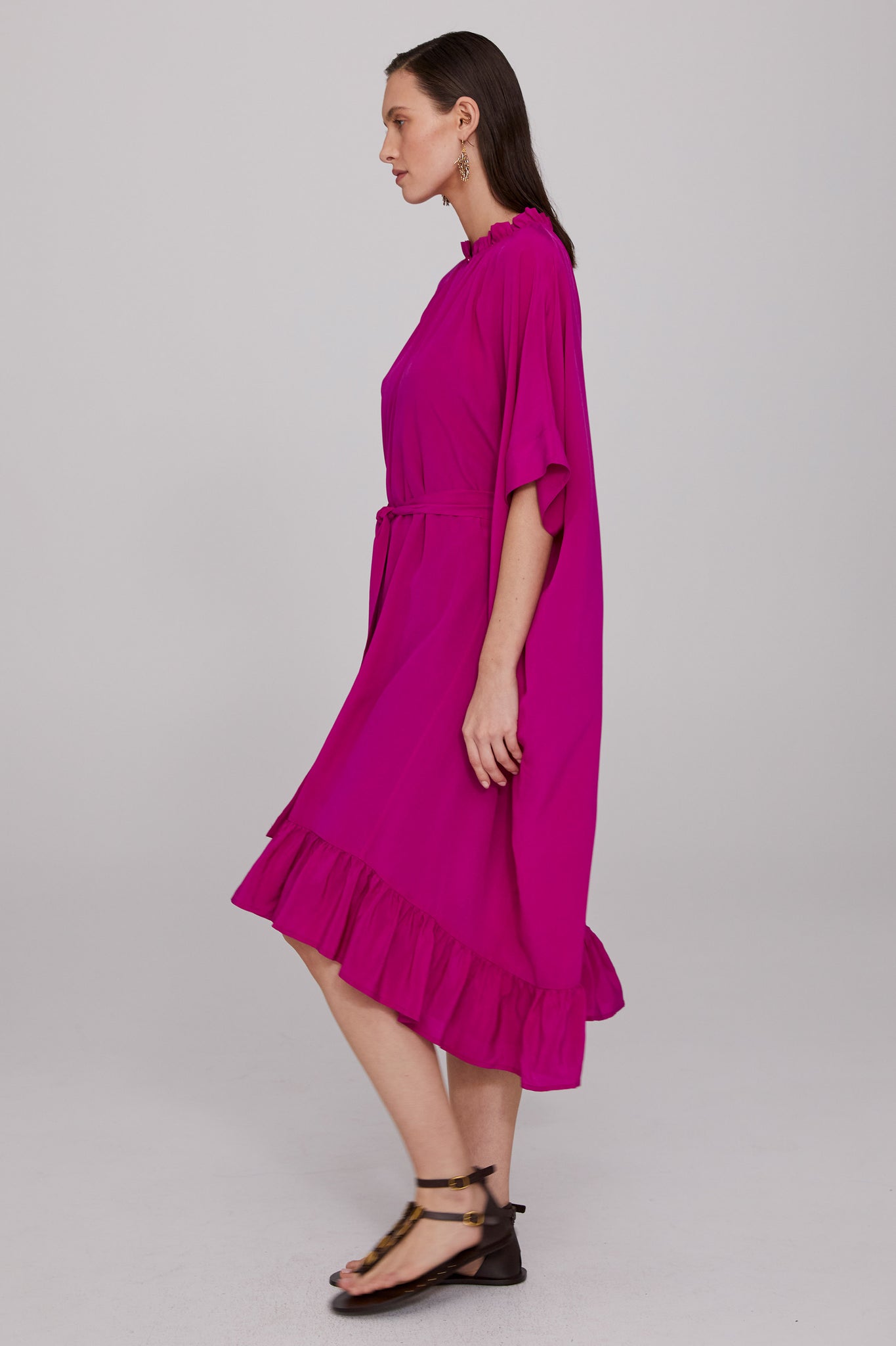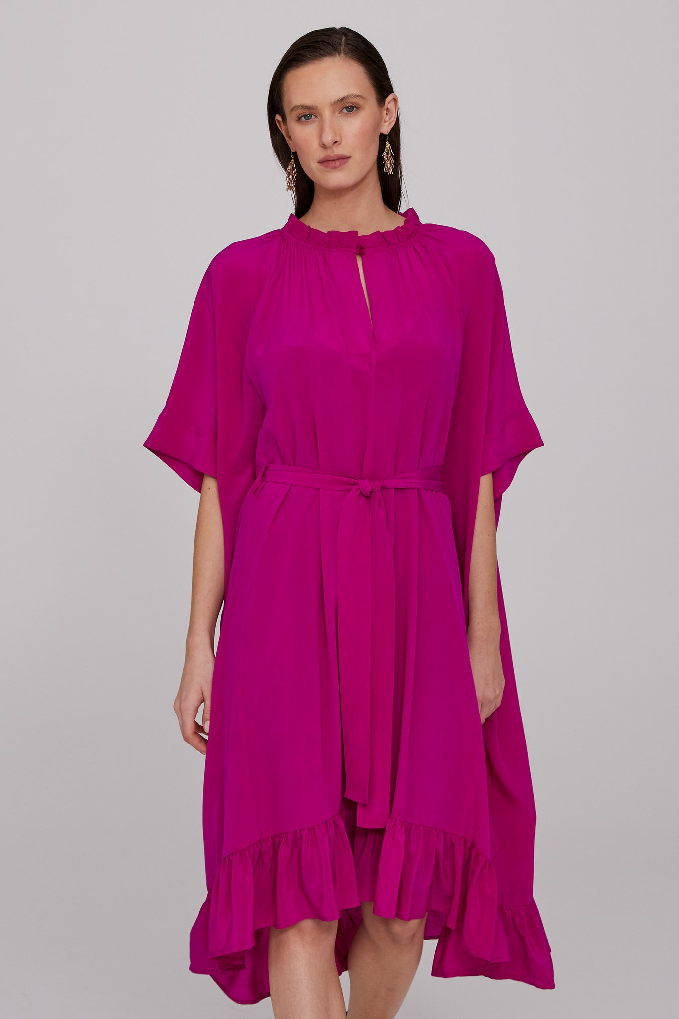 The Fuscia Silk Crepe Kaftan & Slip is destined to be one of our hero pieces of the season. Crafted from luxurious silk crepe de chine in the most brilliant pink hue, its fluid silhouette is elevated with delicate ruffles at the neckline and hem, adding a touch of romance. The coordinating bias-cut slip ensures ease and coverage, while the self-tie belt threads through discreet buttonhole openings, allowing you to cinch at the front or wrap around the waist for a defined shape. Finished with a covered silk button at the neck, this kaftan brings effortless sophistication—perfect for summer soirées or elegant holiday dressing.