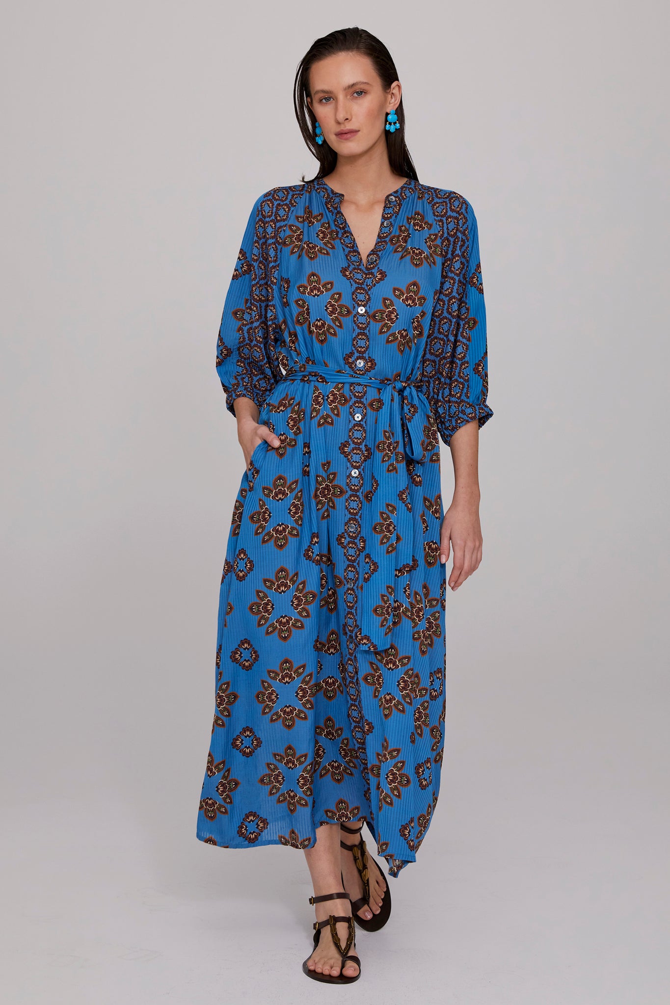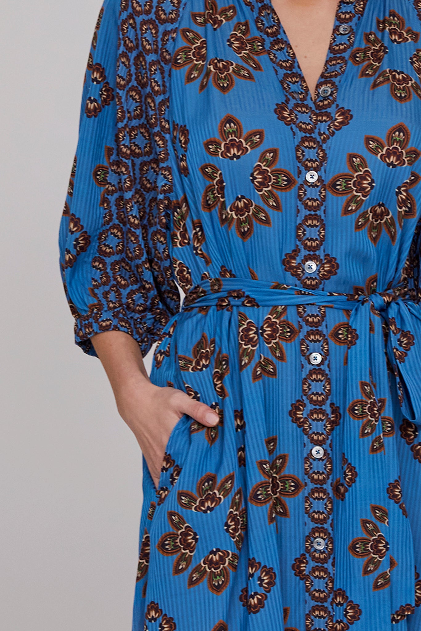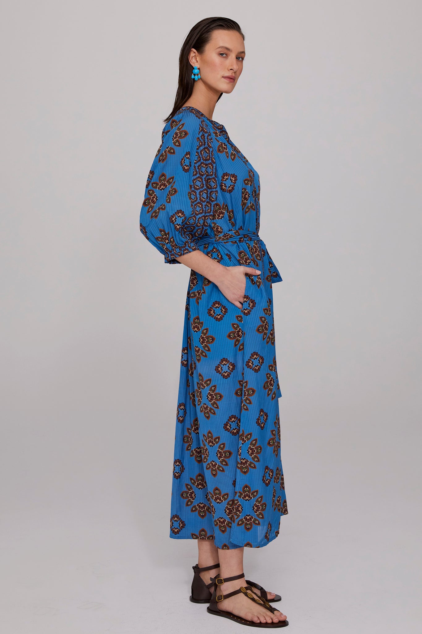 Blending Nordic and ethnic influences, the Gia Sateen Stripe Midi Dress is grounded in jewel-toned cobalt, patterned with graphic florals in earthy hues. Crafted from a soft, silky fabric with fluid drape, the silhouette feels both feminine and versatile. Gathers fall from a narrow collar stand, while statement balloon sleeves splice patch prints and finish with wide elasticated cuffs. Create a strong, elevated outfit with the addition of the Turquoise Facetted Earrings— a timeless piece to cherish for seasons ahead.