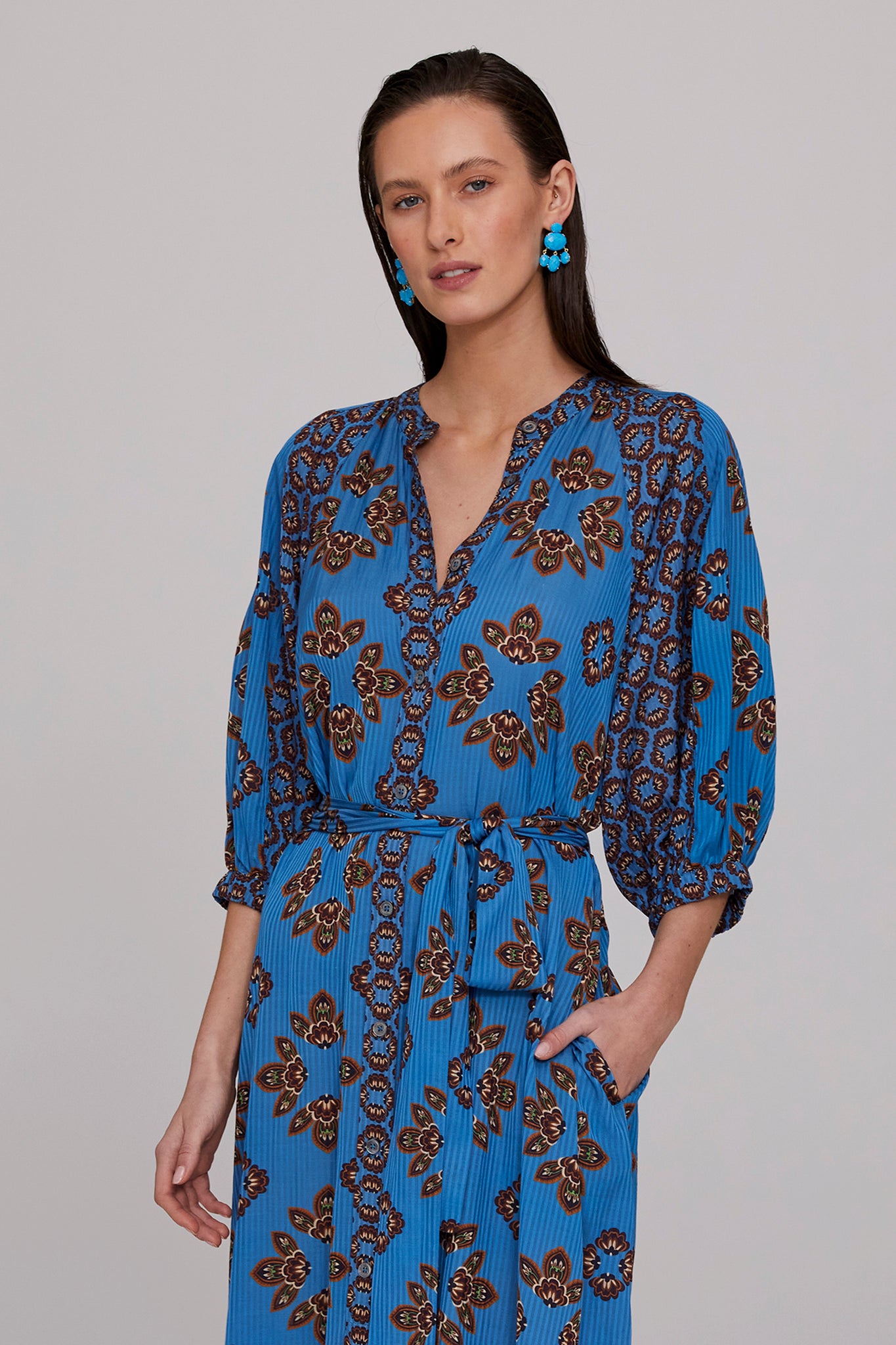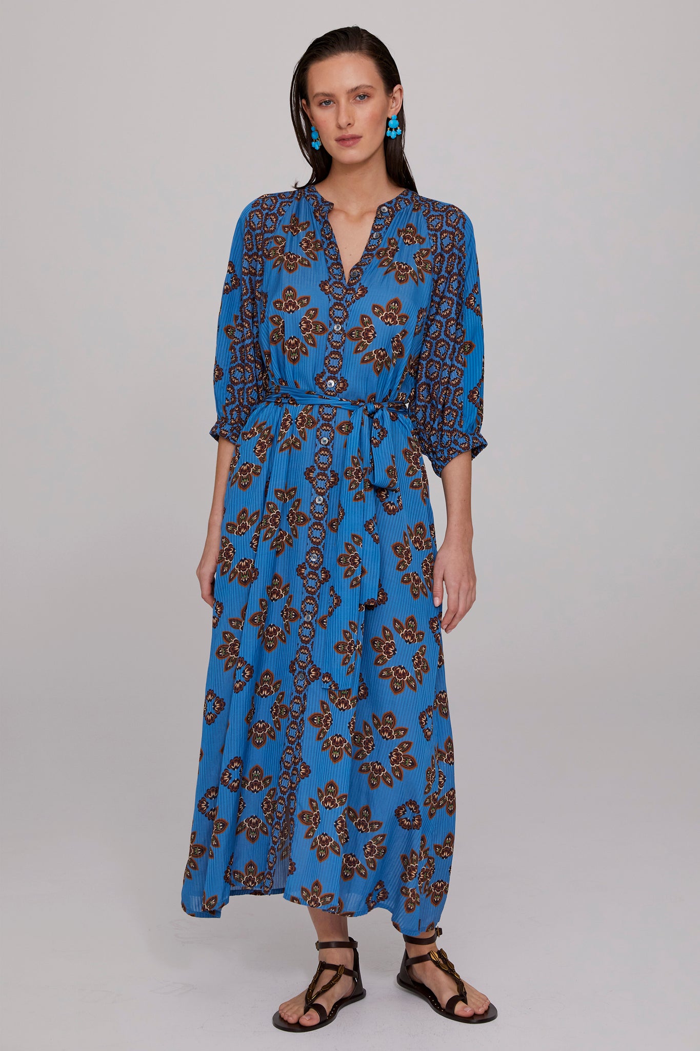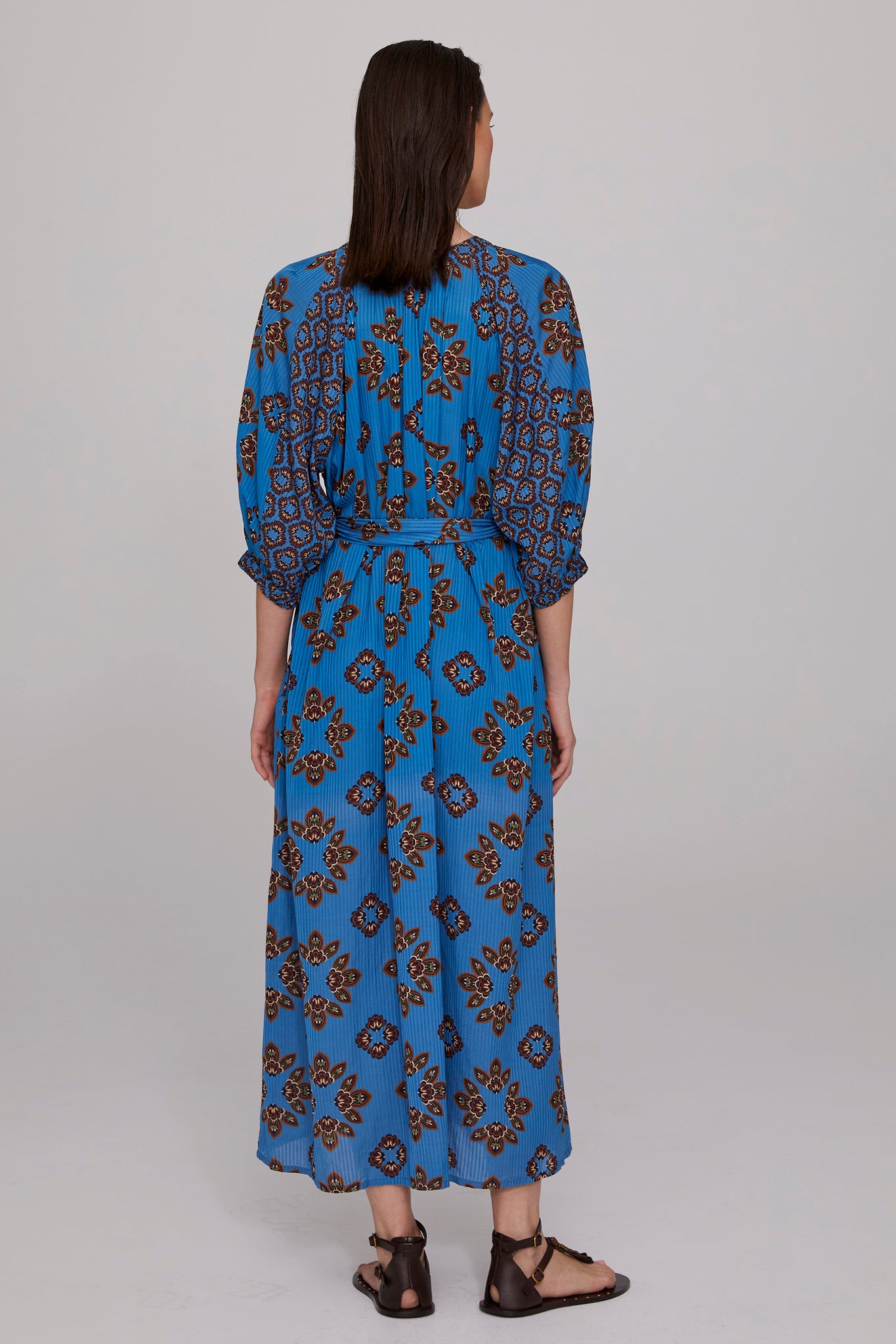 Blending Nordic and ethnic influences, the Gia Sateen Stripe Midi Dress is grounded in jewel-toned cobalt, patterned with graphic florals in earthy hues. Crafted from a soft, silky fabric with fluid drape, the silhouette feels both feminine and versatile. Gathers fall from a narrow collar stand, while statement balloon sleeves splice patch prints and finish with wide elasticated cuffs. Create a strong, elevated outfit with the addition of the Turquoise Facetted Earrings— a timeless piece to cherish for seasons ahead.