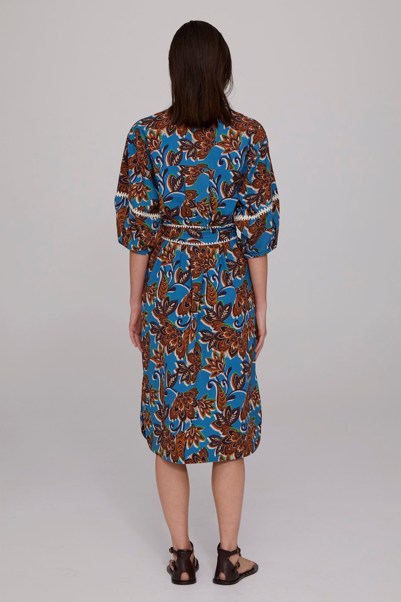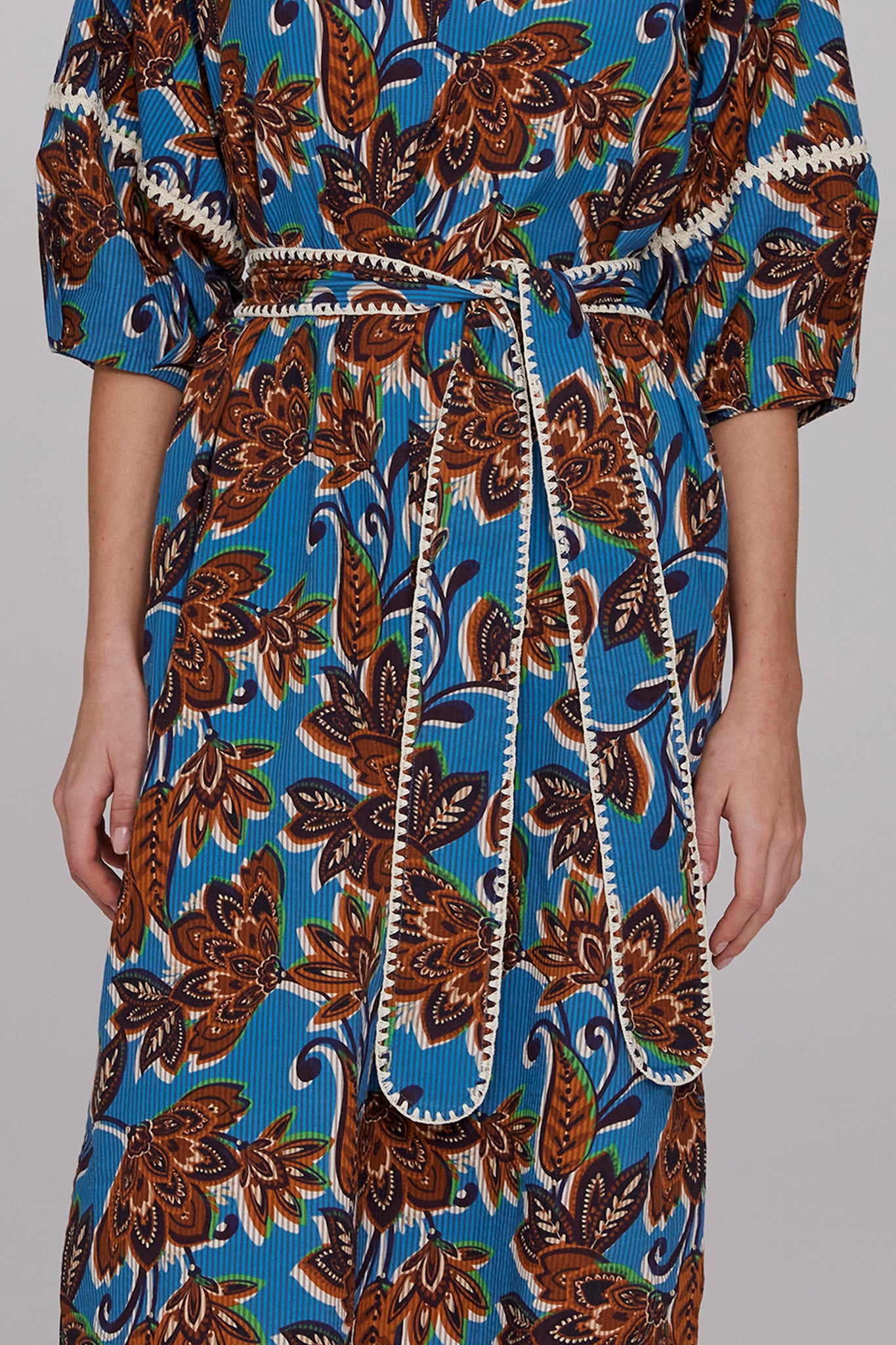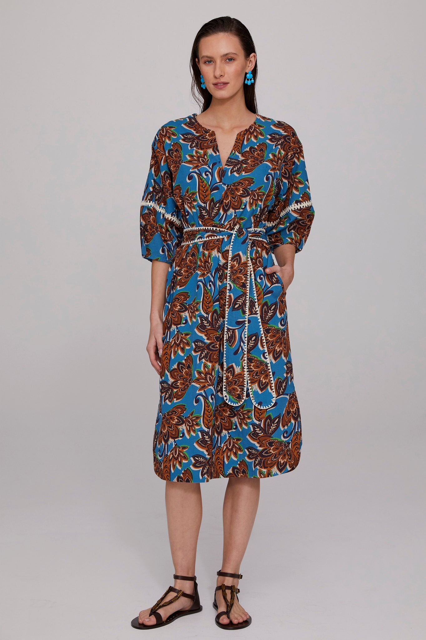The Kaia Crochet Trimmed Dress features a bold turquoise base enlivened with tones of brown, ink, and ecru in a signature MEGAN PARK print. Crafted from structured cotton seersucker, the textural fabric enhances the richness of the design. Lantern sleeves with crochet inserts and hand-finished detailing at the sleeves and belt add artisanal charm. With a shaped hemline, slip-on ease, and side seam pockets, it is both practical and refined. Wear belted or loose, and style with the Faceted Turquoise Earrings for a standout summer look.