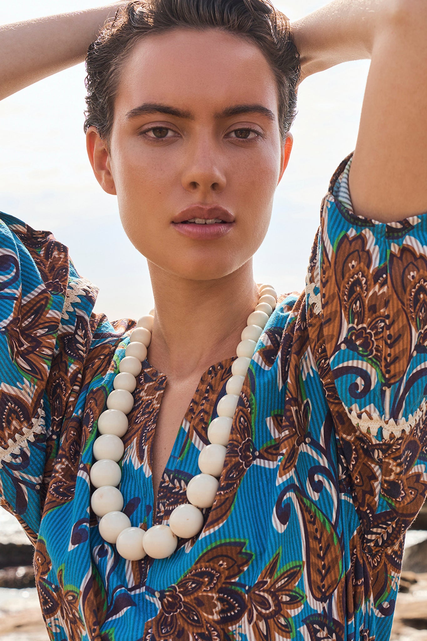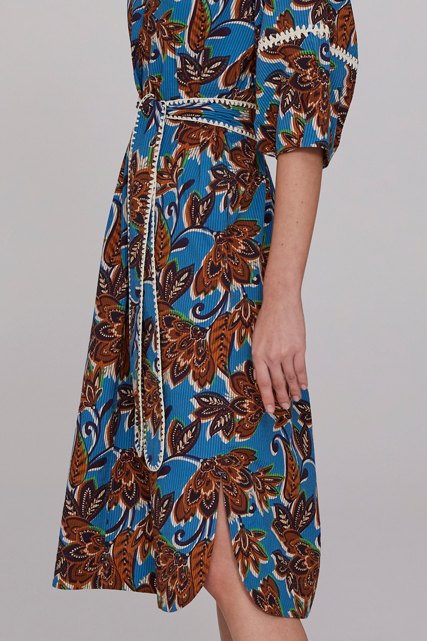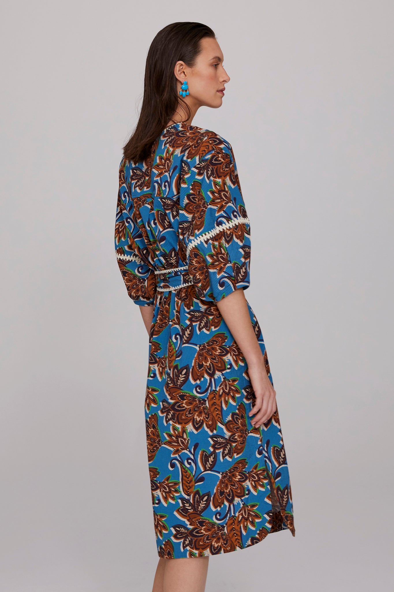 The Kaia Crochet Trimmed Dress features a bold turquoise base enlivened with tones of brown, ink, and ecru in a signature MEGAN PARK print. Crafted from structured cotton seersucker, the textural fabric enhances the richness of the design. Lantern sleeves with crochet inserts and hand-finished detailing at the sleeves and belt add artisanal charm. With a shaped hemline, slip-on ease, and side seam pockets, it is both practical and refined. Wear belted or loose, and style with the Faceted Turquoise Earrings for a standout summer look.