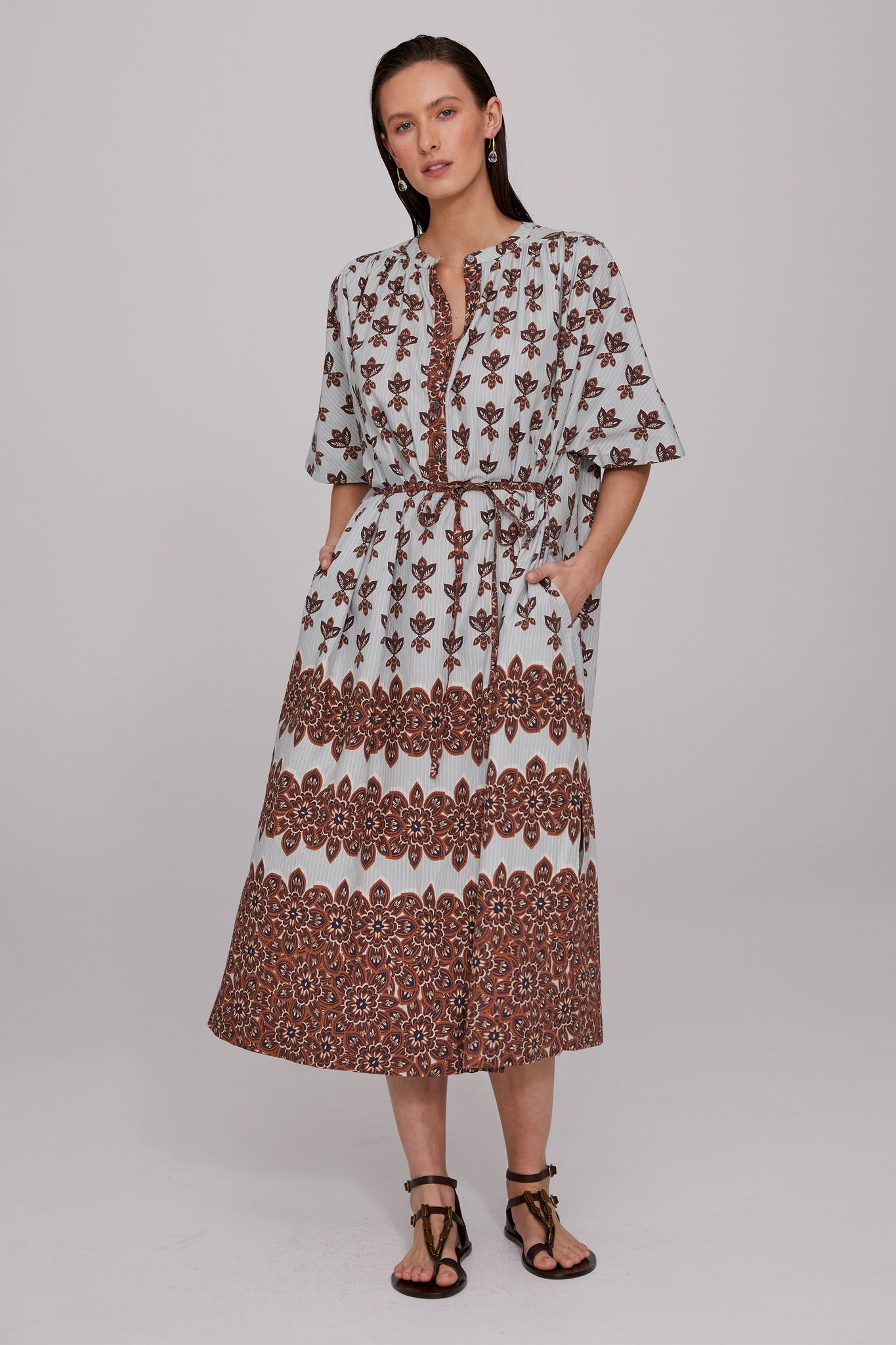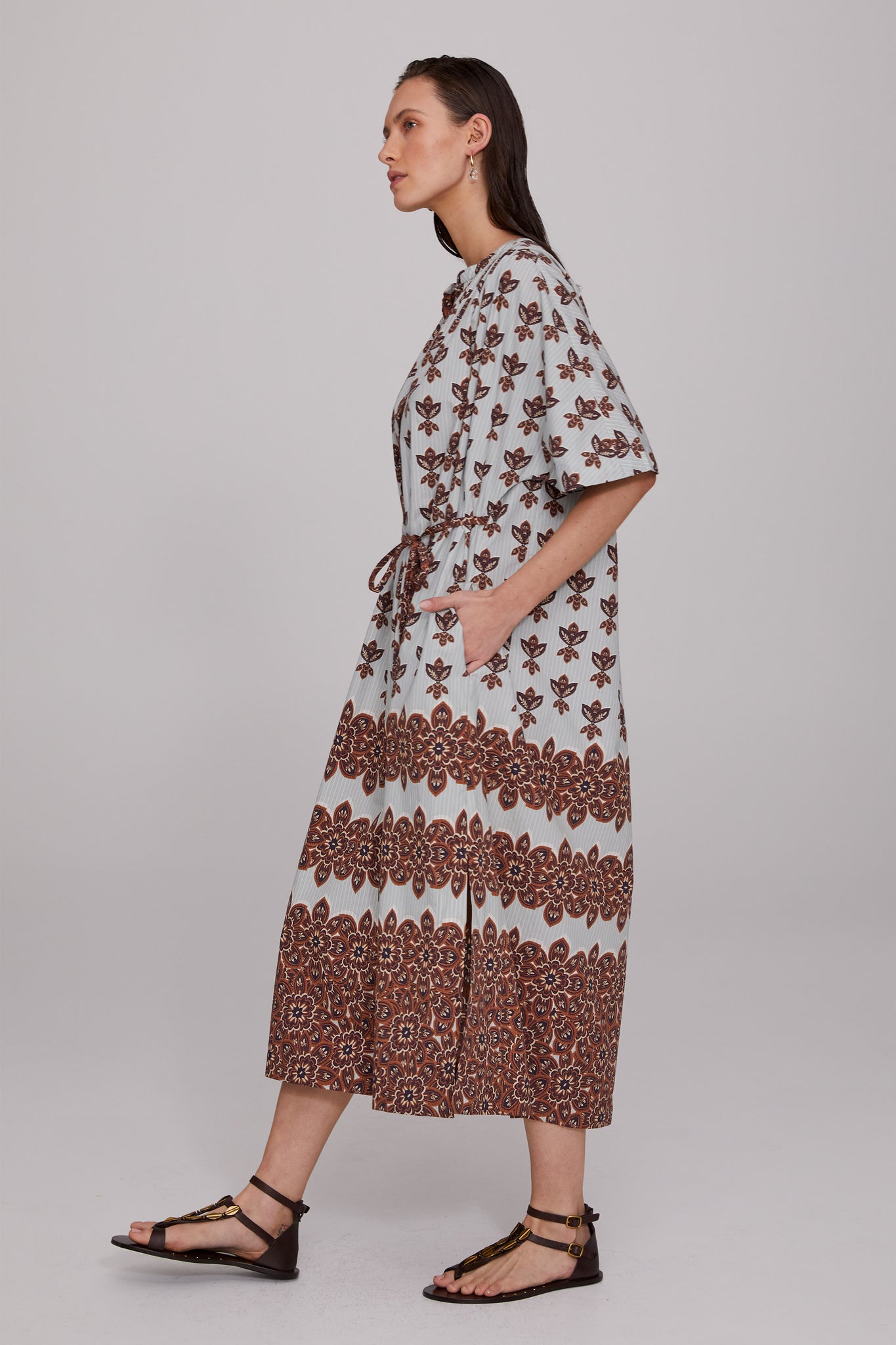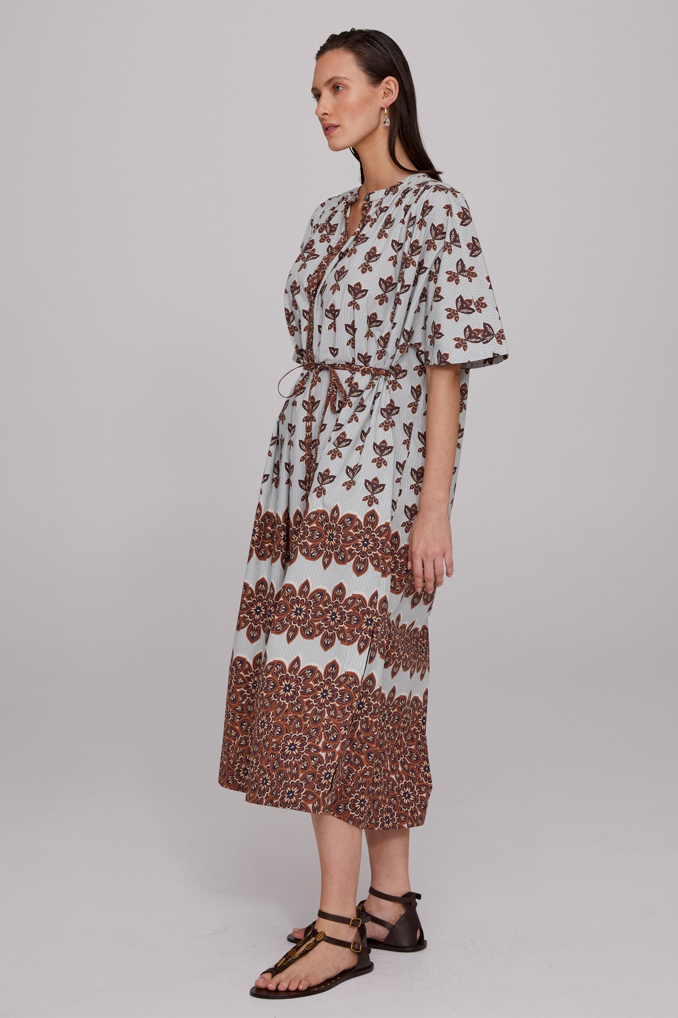 The Kaia Cotton Poplin Dress is a relaxed yet striking silhouette, brought to life in a signature MEGAN PARK print of sky-blue stripes overlaid with bold tobacco floral motifs. Cut from crisp cotton poplin, soft gathers extend from a neat collar band and yoke, creating volume and ease through the body. A narrow belt threads through discreet buttonholes at the side seams, giving you the option to cinch only at the front, to wrap around your waist entirely, or to remove and wear loose with volume. Perfect styled with flat sandals for a holiday escape or with strappy heels for a more polished daytime look.