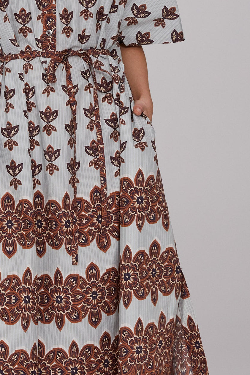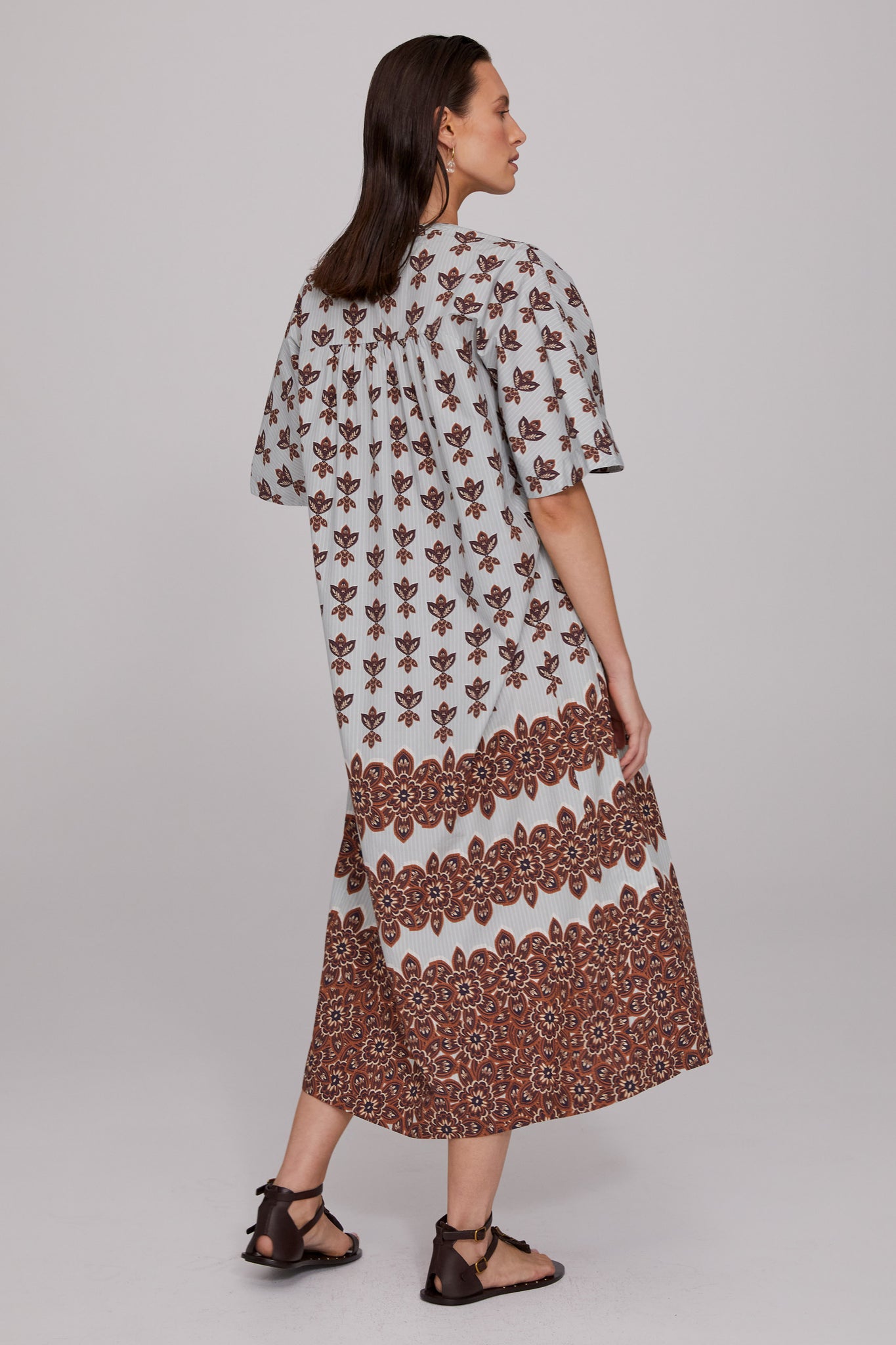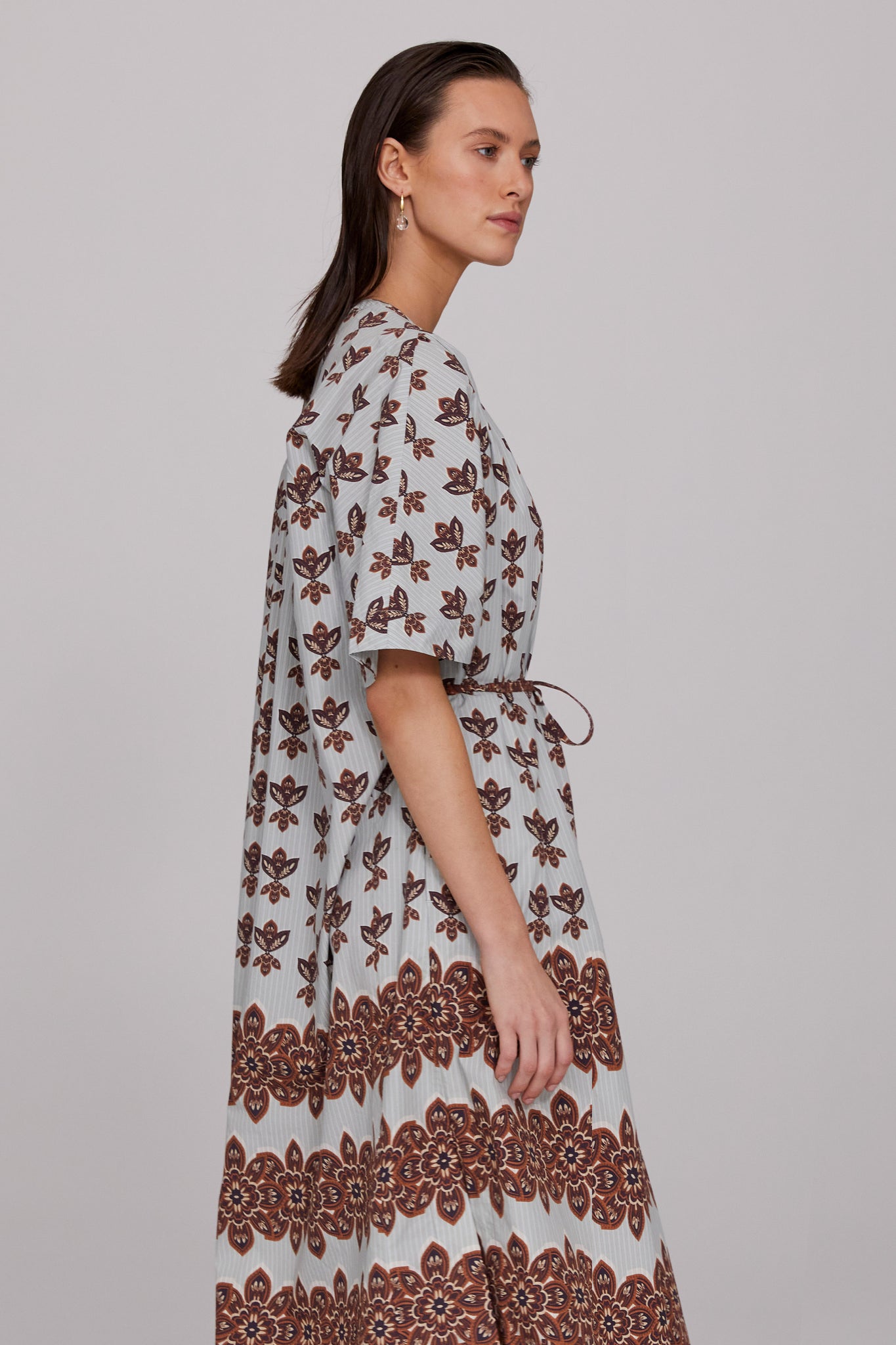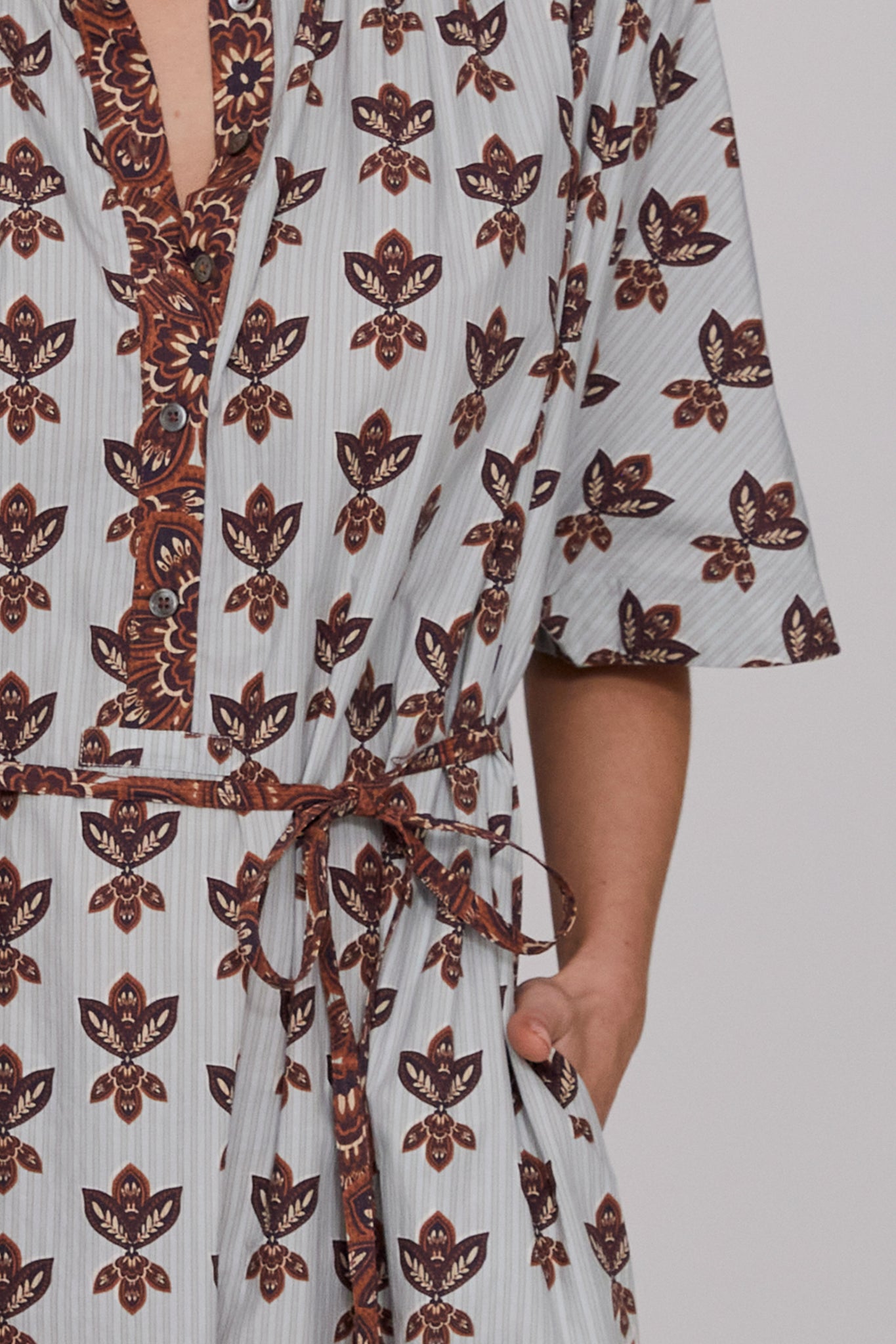 The Kaia Cotton Poplin Dress is a relaxed yet striking silhouette, brought to life in a signature MEGAN PARK print of sky-blue stripes overlaid with bold tobacco floral motifs. Cut from crisp cotton poplin, soft gathers extend from a neat collar band and yoke, creating volume and ease through the body. A narrow belt threads through discreet buttonholes at the side seams, giving you the option to cinch only at the front, to wrap around your waist entirely, or to remove and wear loose with volume. Perfect styled with flat sandals for a holiday escape or with strappy heels for a more polished daytime look.