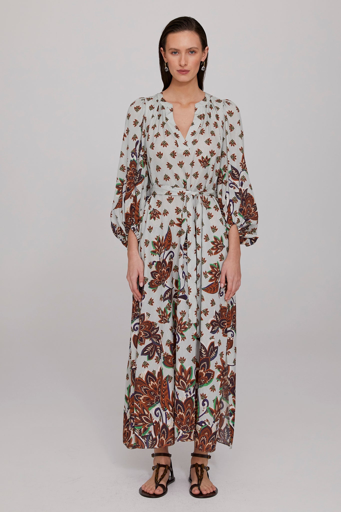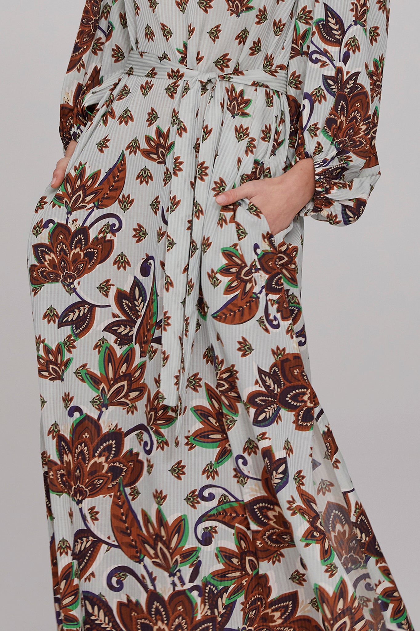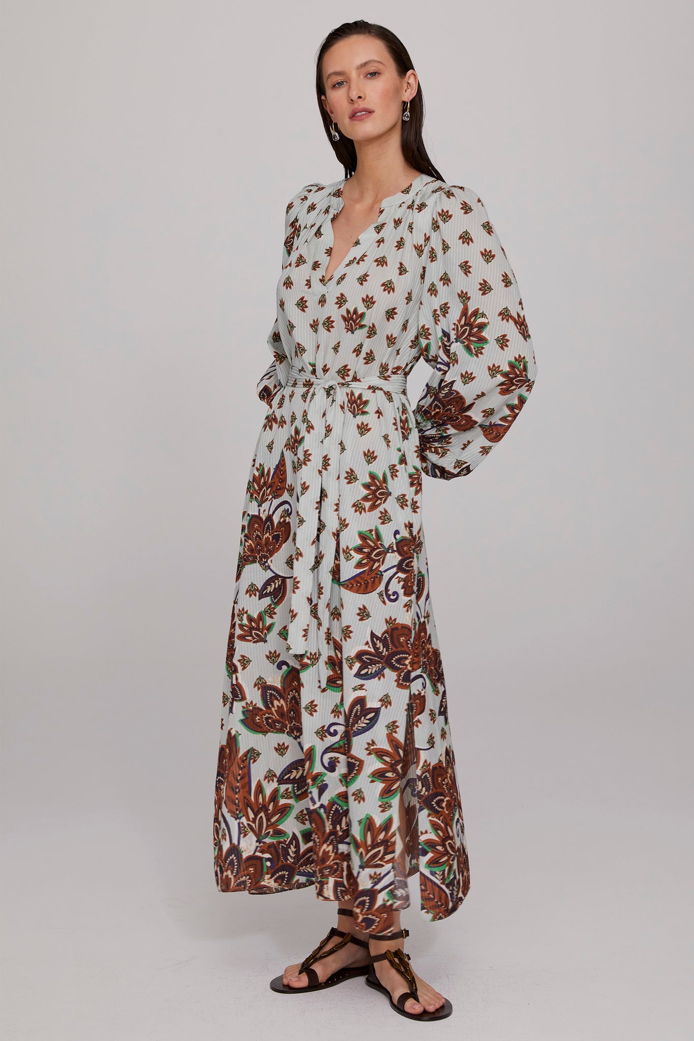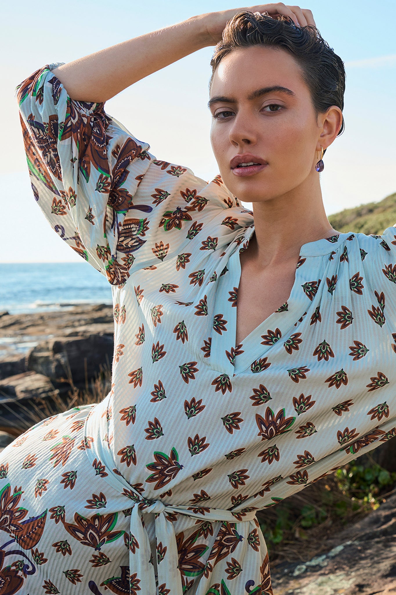 Refined and effortlessly elegant, the Kaia Sateen Stripe Midi Dress is perfect for an evening date or a dressed-up day occasion. Painterly floral blooms rise from the hem in a bespoke artwork, while a palette of pale sky blue and earthy browns lends understated glamour. Delicate gathers from the collar create soft volume through the bodice, cinched with a self-tie belt for a flattering silhouette. Side splits at the hem reveal a subtle flash of leg. Complete the look with our Quartz Teardrop Earrings for timeless sophistication.