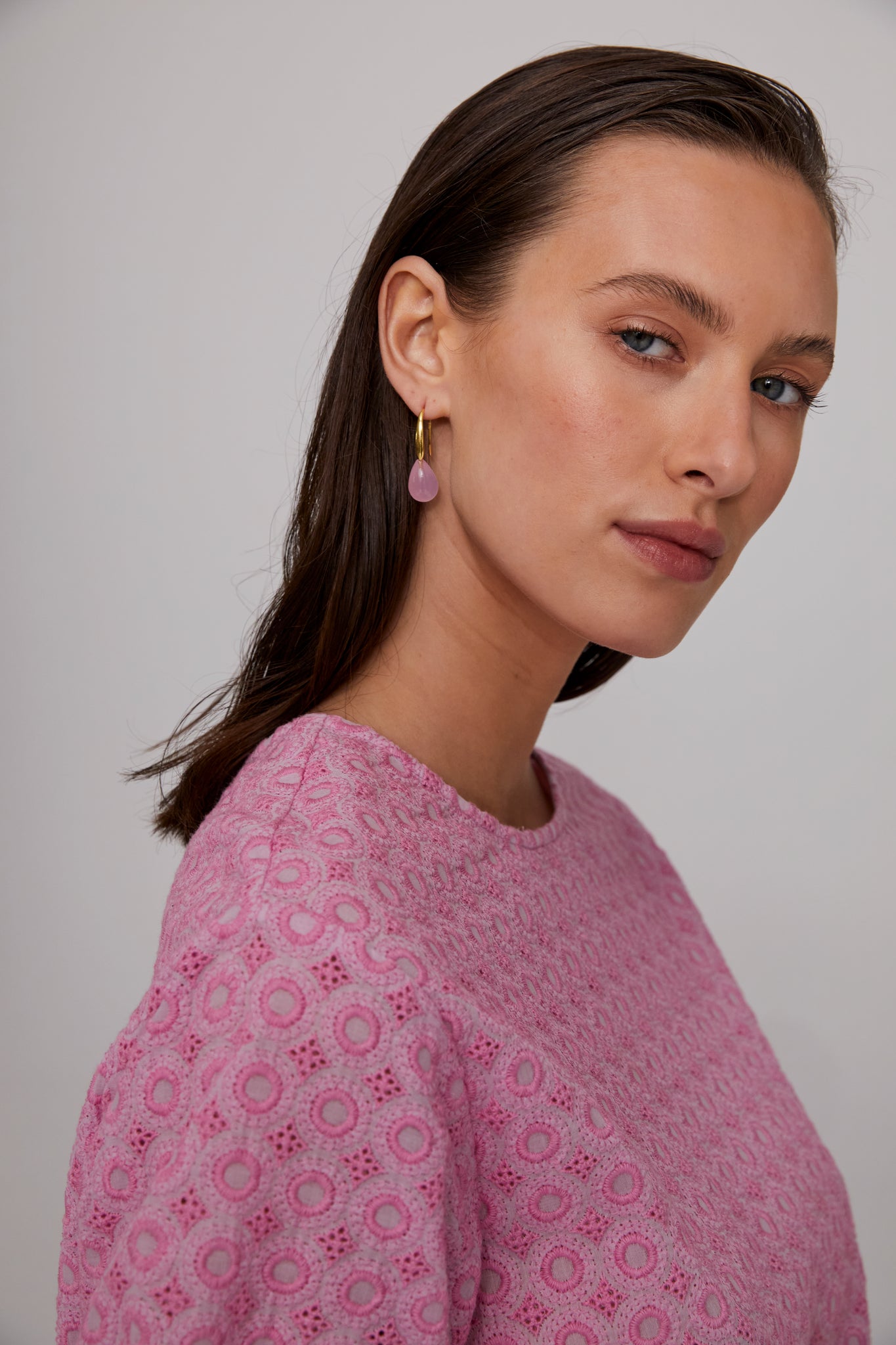 Elegant in their simplicity, the Rose Calci Teardrop Earrings feature a polished pear-cut rose calci stone in the prettiest pink, suspended from a handcrafted golden hook. Made in Jaipur, the gemstone capital of the world, they embody artisanal craftsmanship with modern refinement. Feminine and timeless, they’re a thoughtful gift—for yourself or someone special.