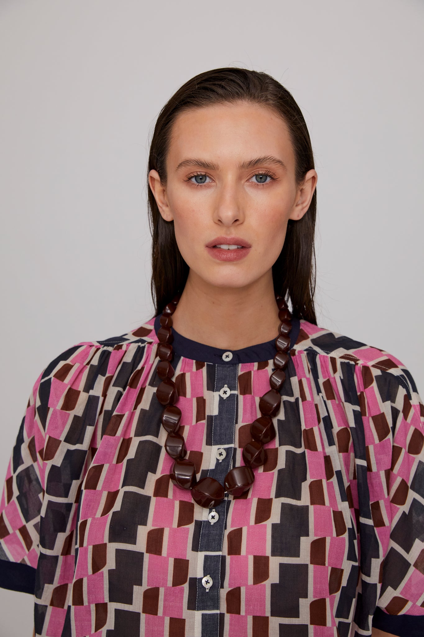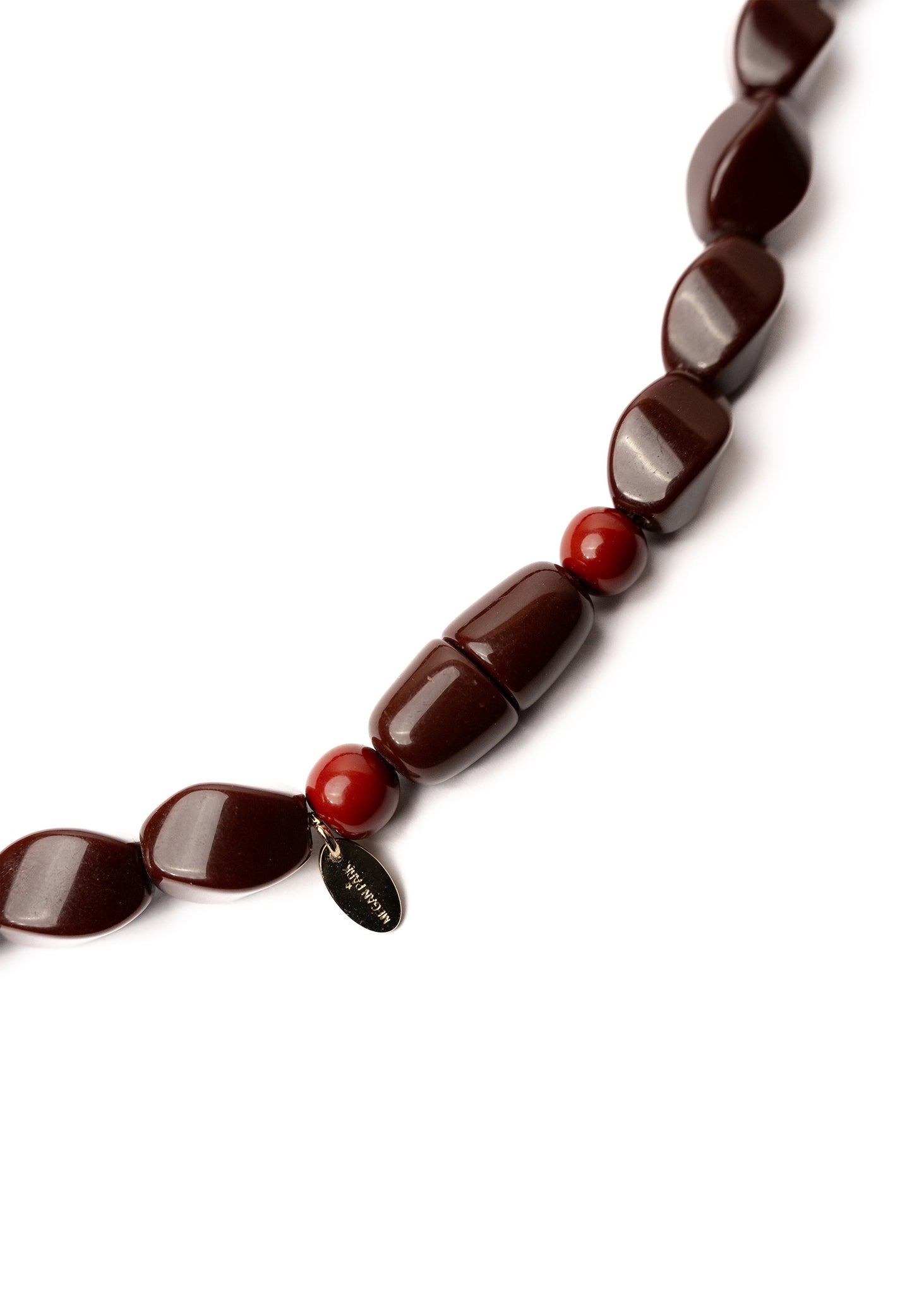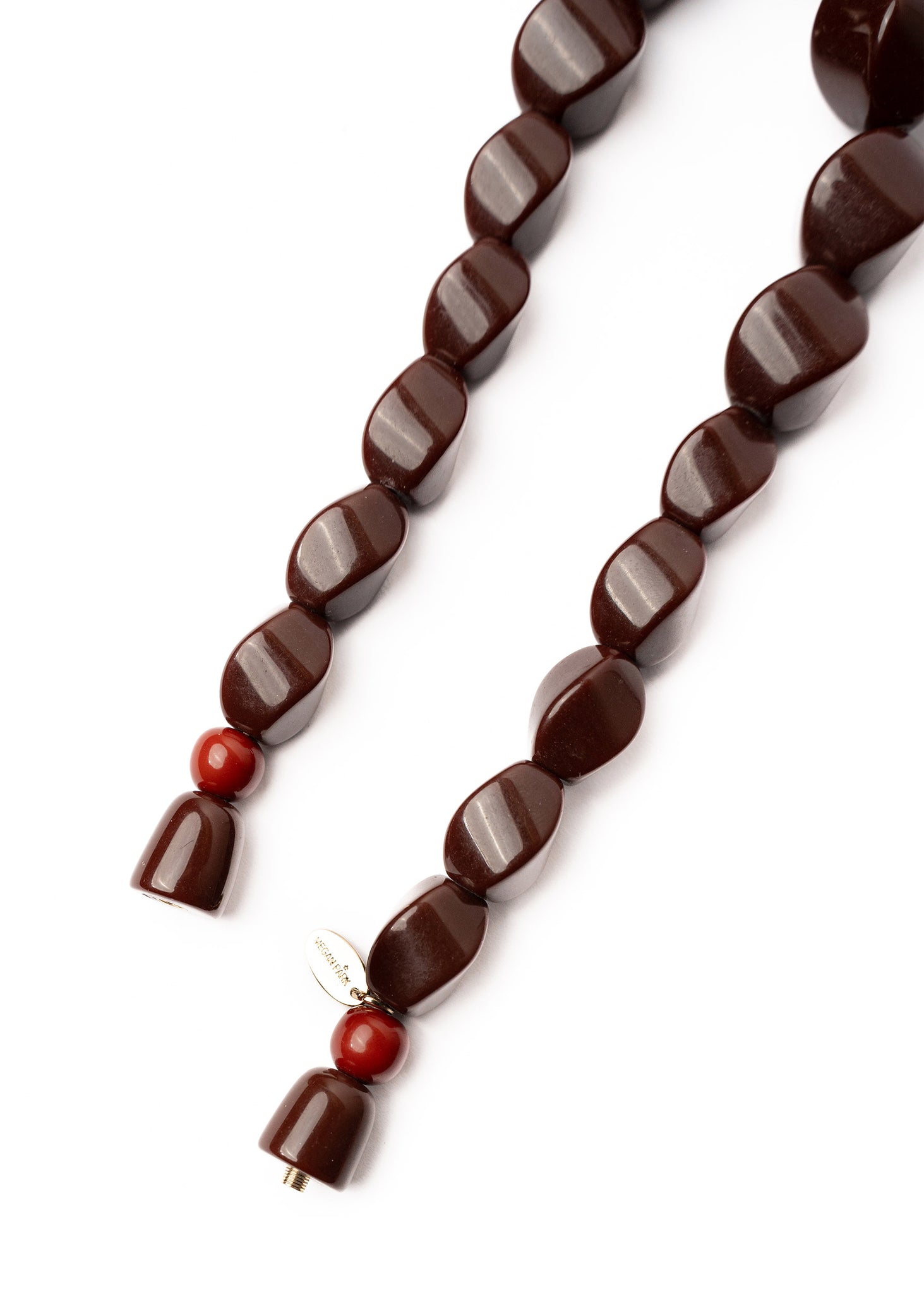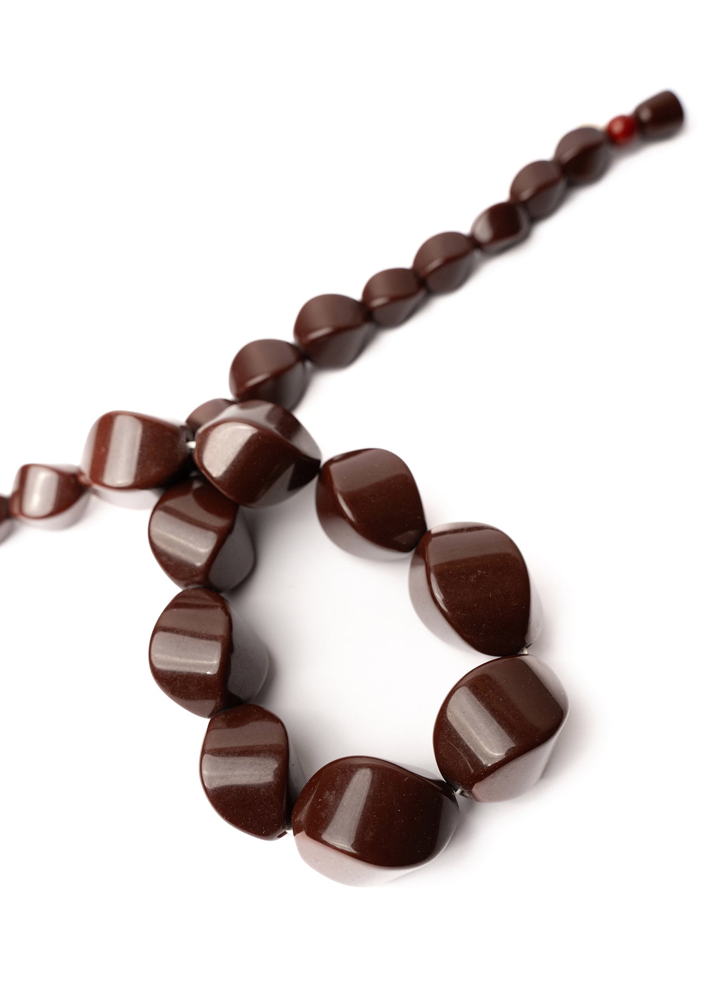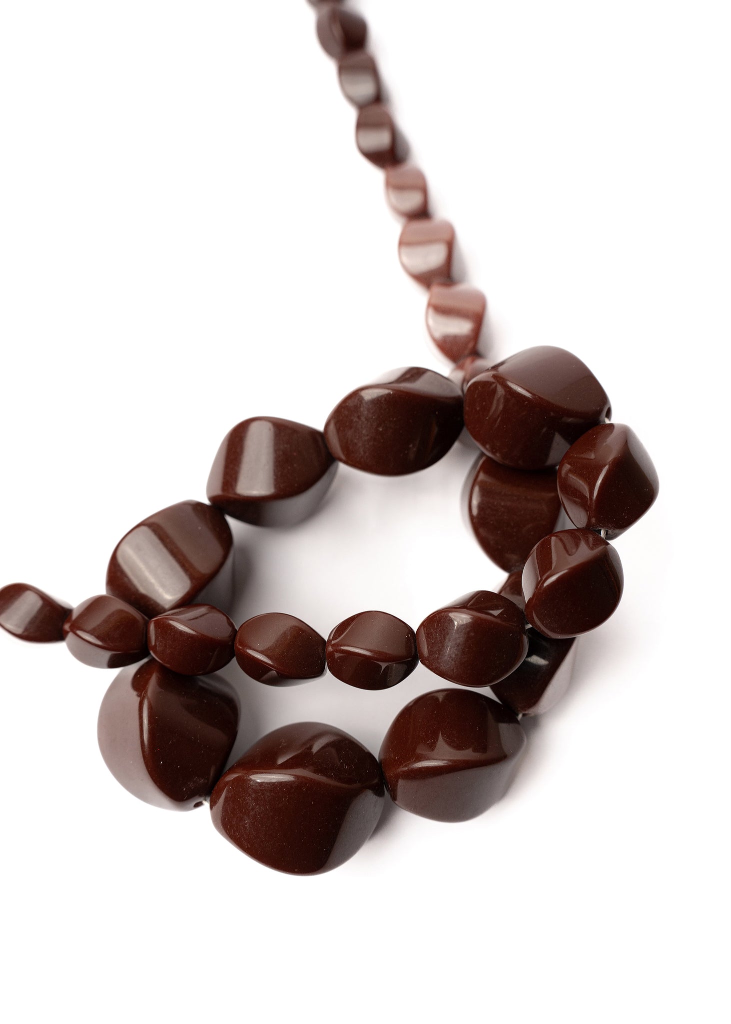 Chocolate resin pebble-shaped beads are combined to this striking summer necklace. Closing with a clever invisable screw fastner, this bold neckpiece is designed to elevate the relaxed, bohemian spirit of the season. Effortlessly eye-catching — wear with your favourite MEGAN PARK outfit this summer or style simply with a tee for an easy, everyday statement.