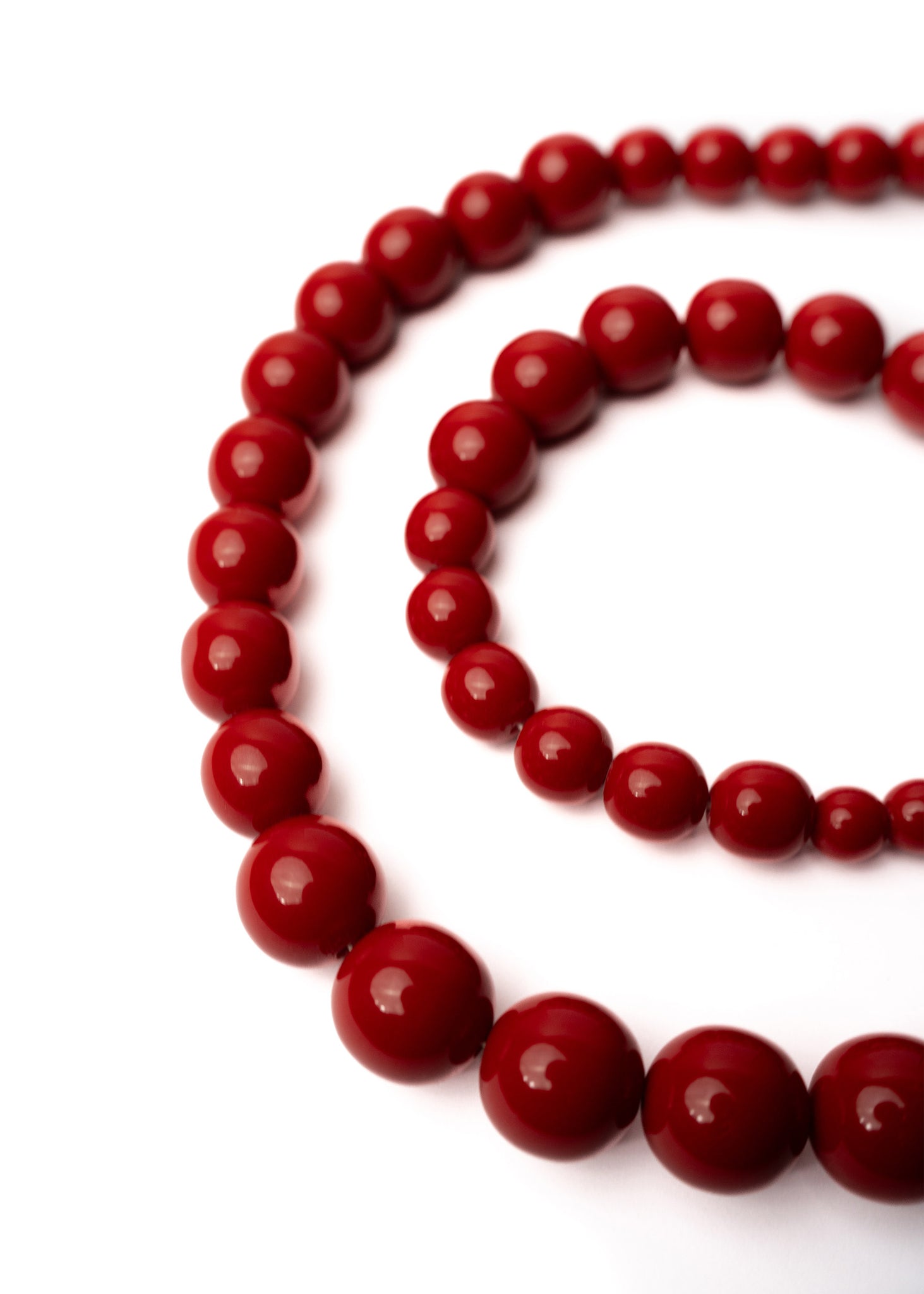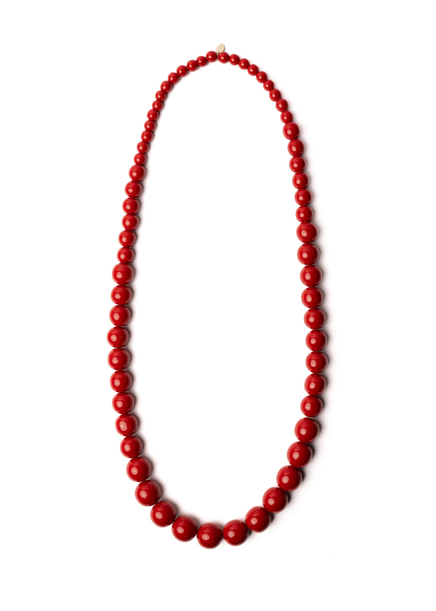 A striking strand of graded resin beads in vivid scarlet red, finished with an invisible screw clasp. Designed to sit long and fluid, this necklace adds a bold pop of colour and accentuates the relaxed, bohemian spirit of the season. Effortlessly eye-catching — wear with your favourite MEGAN PARK outfit this summer or style simply with a tee for an easy, everyday statement.
