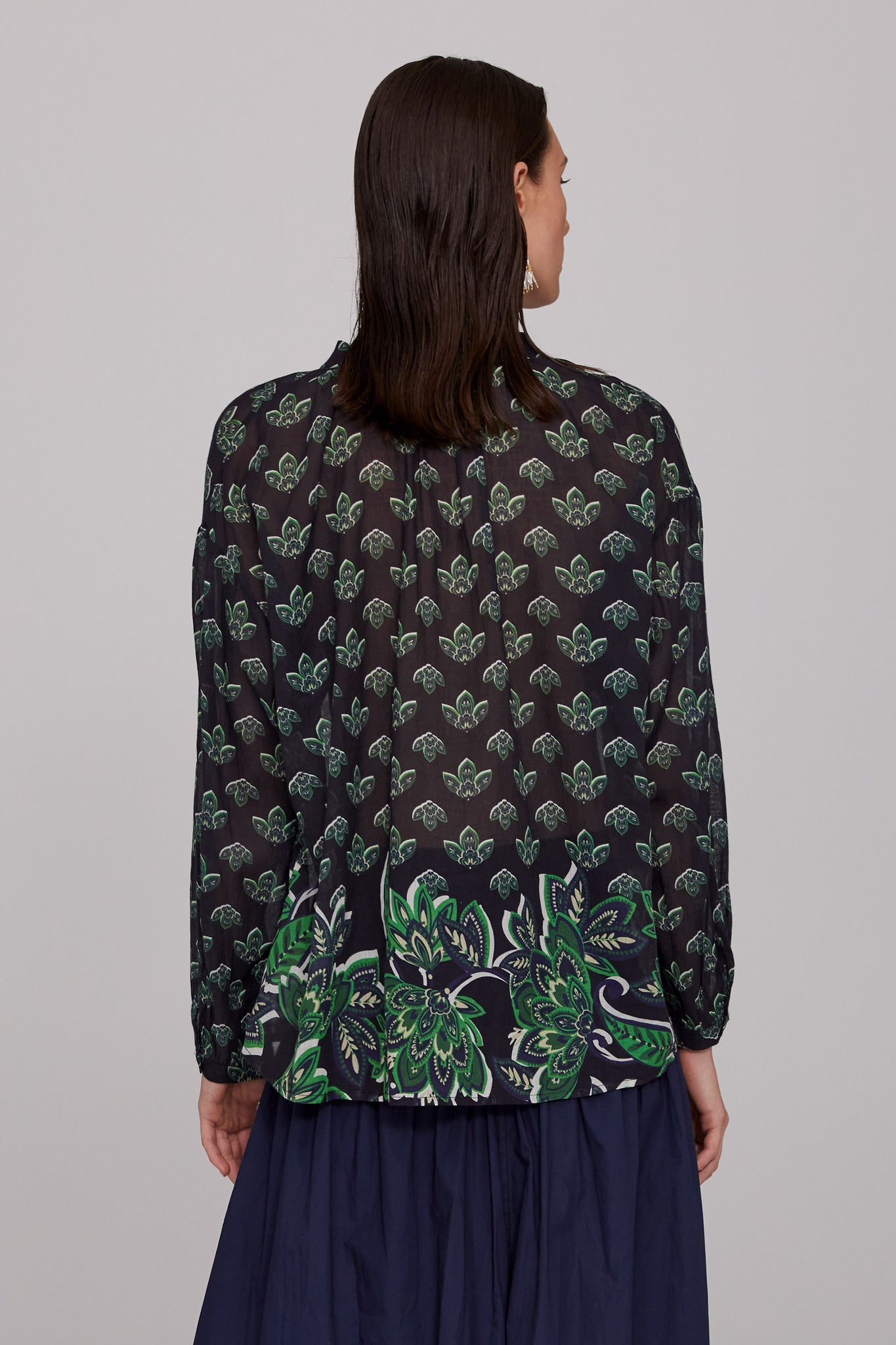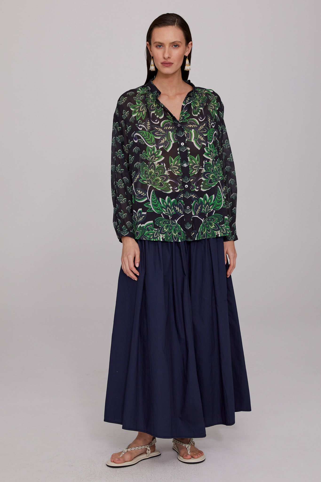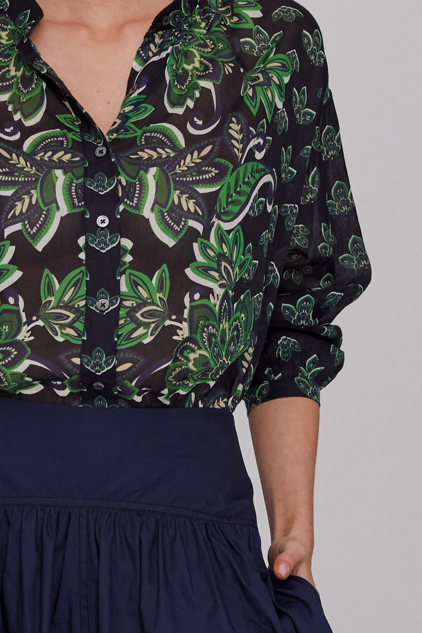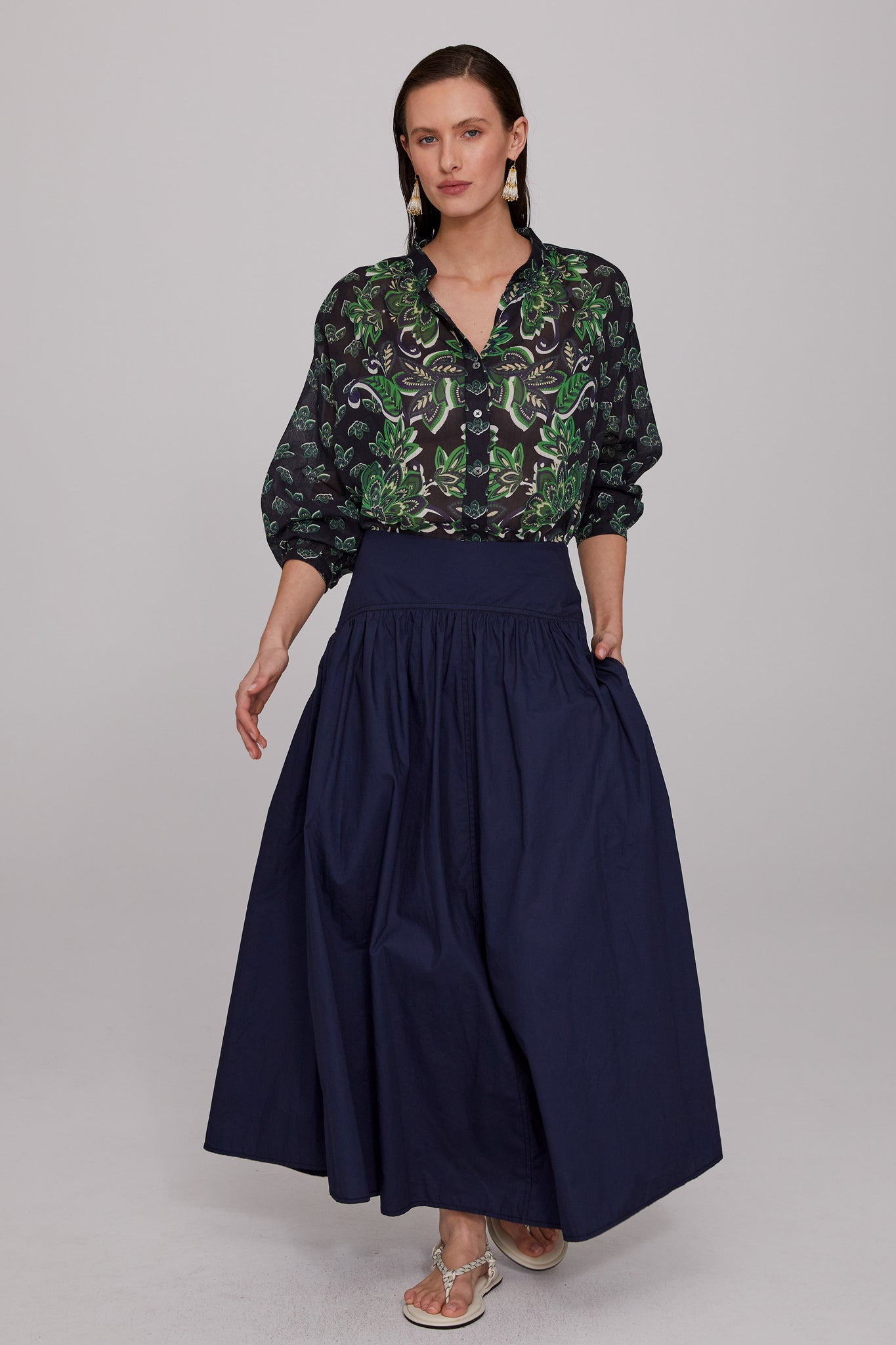 Inspired by the artisanal traditions of the brand, the Fiore Organic Voile Blouse features a wondrous floral print of emerald and ecru set against the deepest midnight ink base. Crafted from organic cotton voile, its light and airy silhouette makes it perfect for the summer heat. Delicate gathers fall from the neckline, while dropped shoulders enhance its relaxed femininity. Pair with the Ink Poplin Basque Skirt to create a timelessly chic yet relaxed outfit that can be worn with ease.