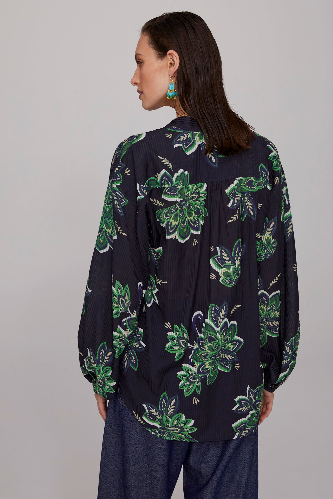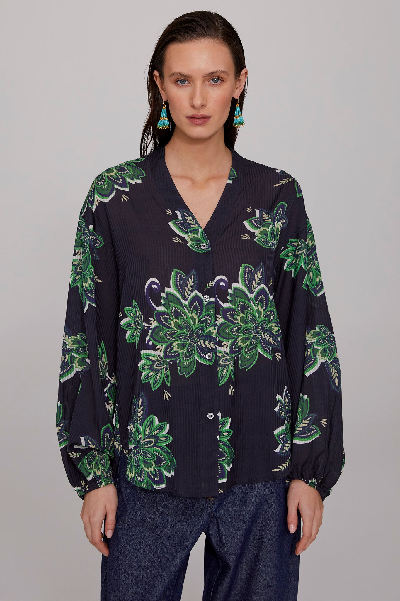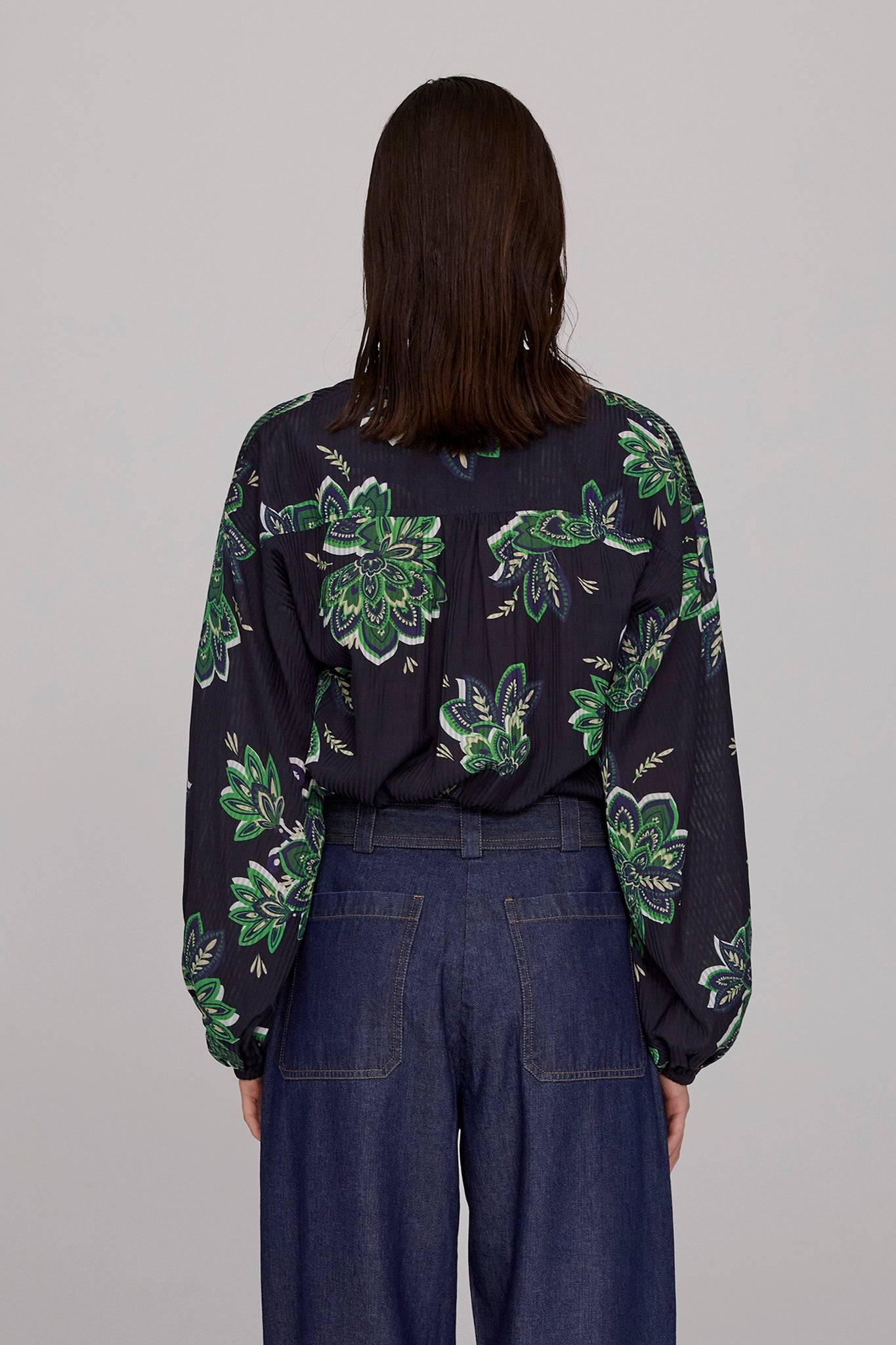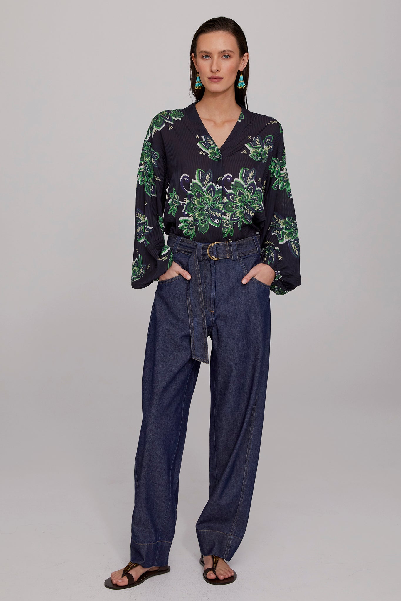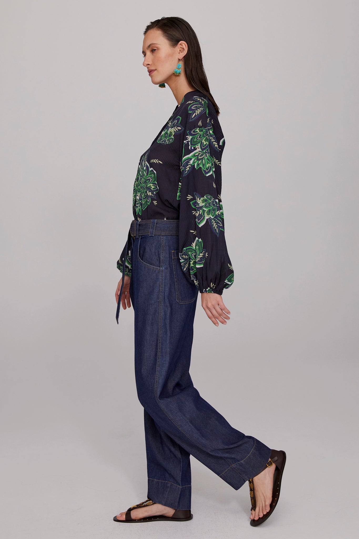 The Fiore Sateen Striped Blouse will be cherished for its effortless elegance this season. Emerald and white blooms float across a fine satin-striped, ink voile, bringing refined femininity to its relaxed fit. A flattering V-neckline, dropped shoulders, and billowed sleeves with elasticated cuffs complete the silhouette, allowing them to be worn at the wrist or pushed up for volume. Pair with the Washed Denim Barrel Leg Jean for a contemporary weekend look or style with the Ink Poplin Basque Skirt for softer femininity.
