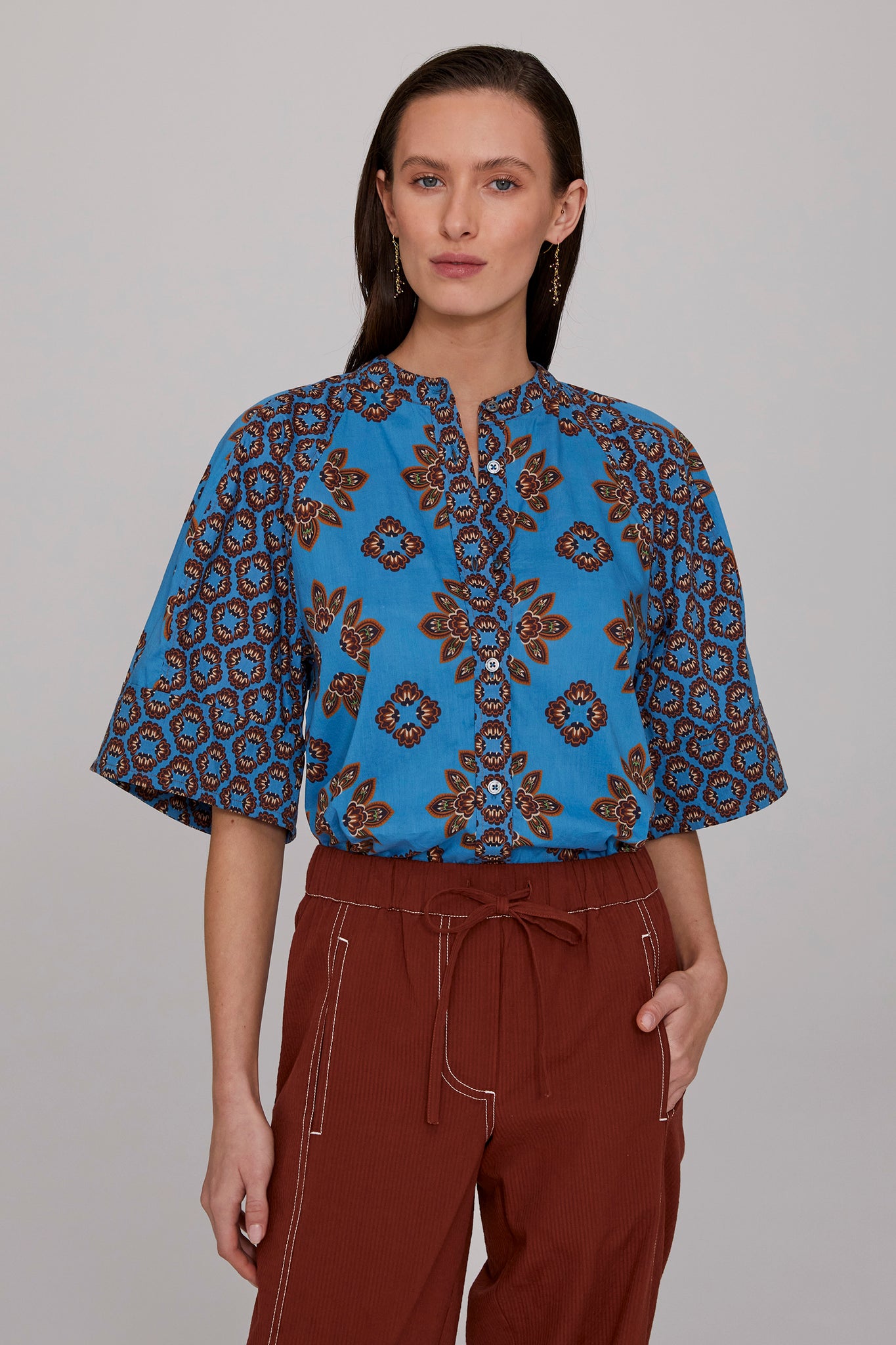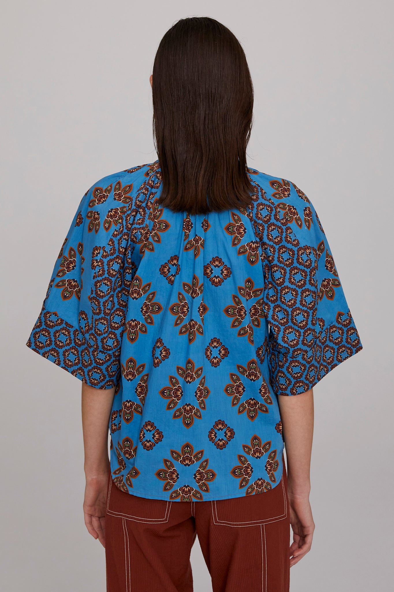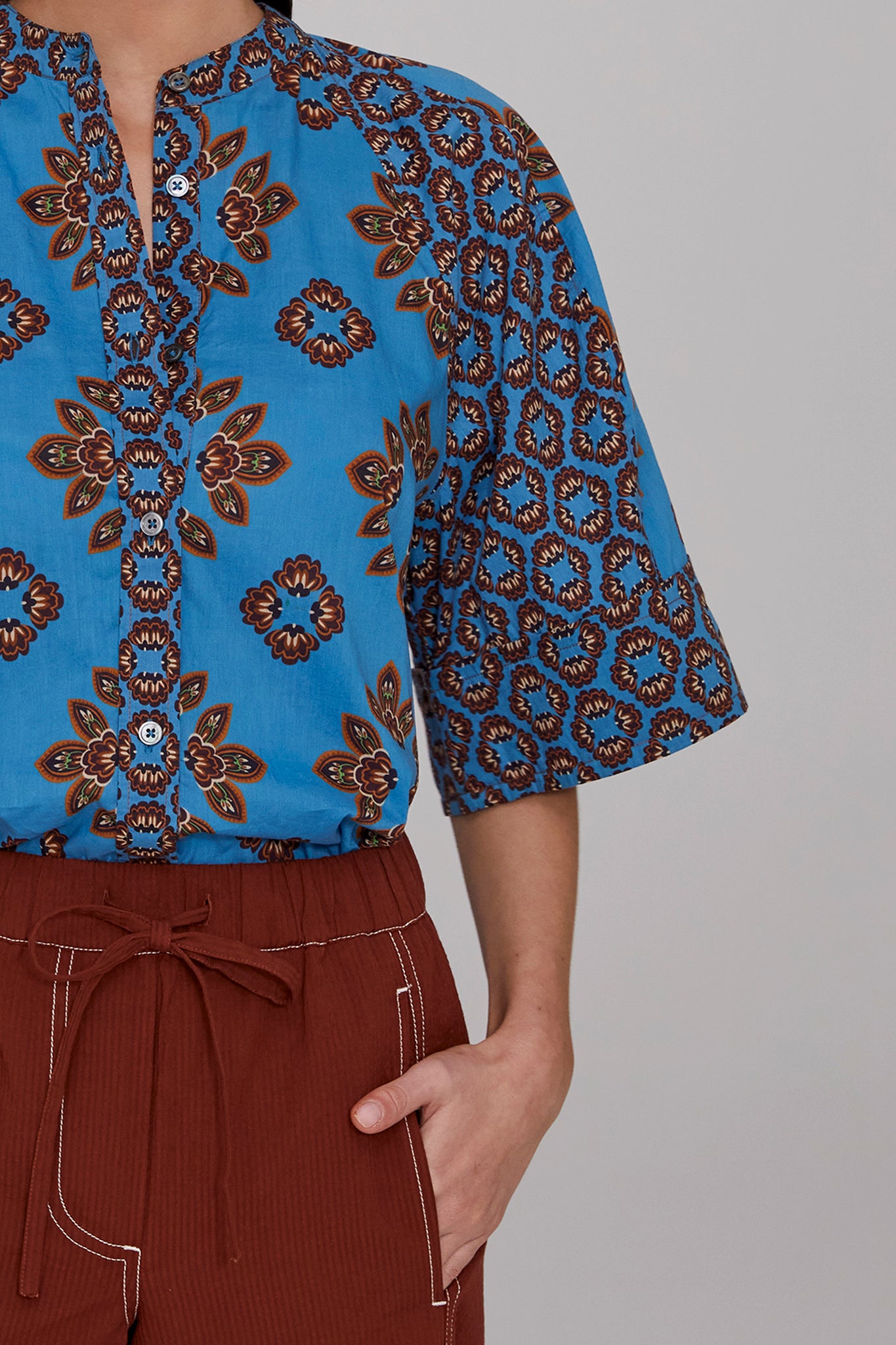 Blending Nordic and ethnic influences, the Gia Cotton Panelled Blouse splices together complementary prints of soft, crisp cotton to bring a vibrant pop of colour to summer dressing. Softly gathered raglan sleeves fall into a bell shape, adding graceful volume and ease. Style it tucked in or loose, buttoned to the neck or worn open for relaxed versatility. Pair with our Tobacco Seersucker Pant for effortless weekend chic, or one of the season’s skirts for a more feminine look.