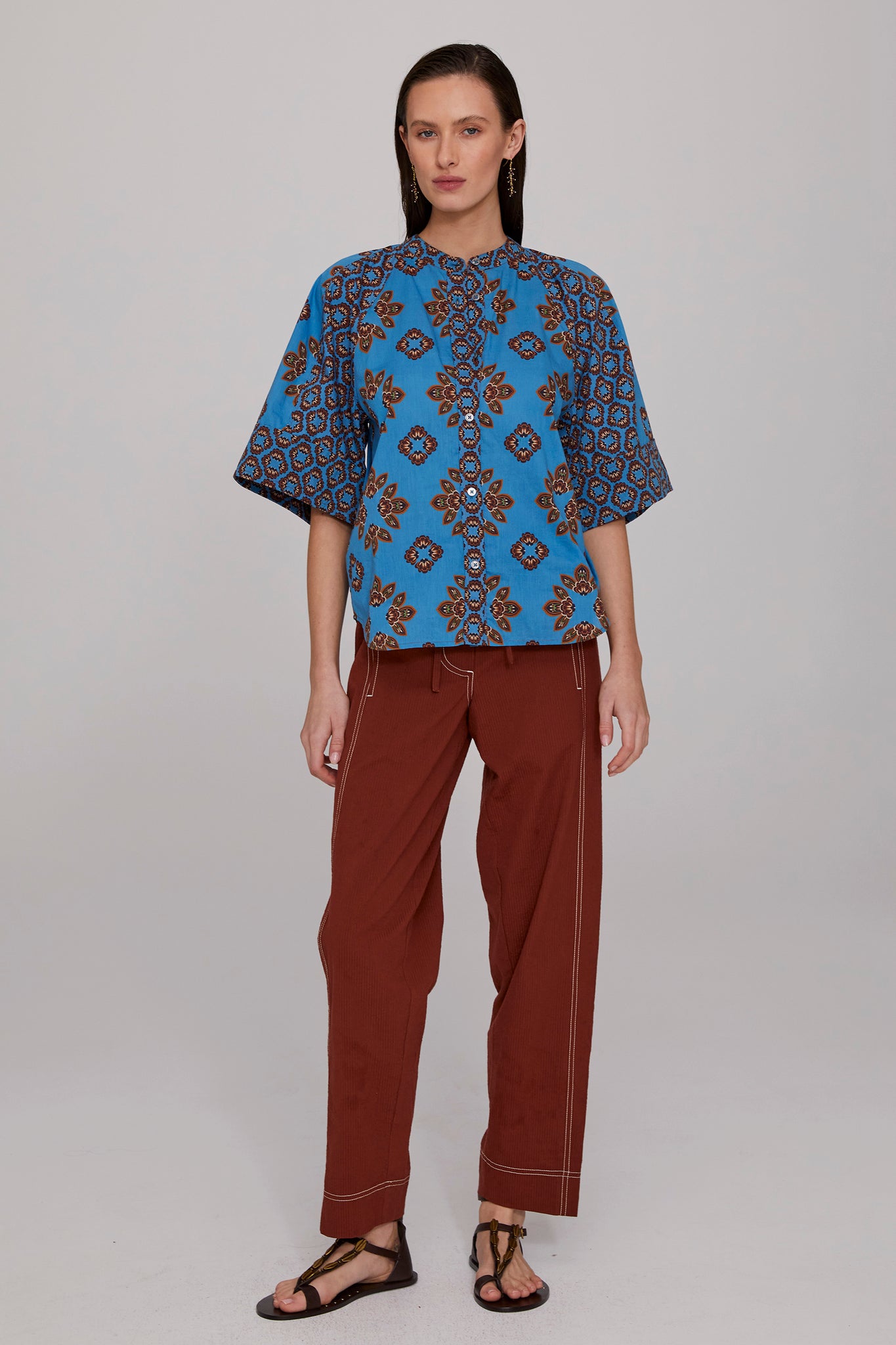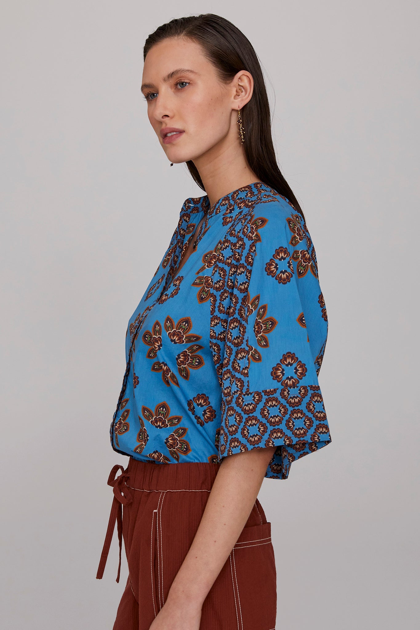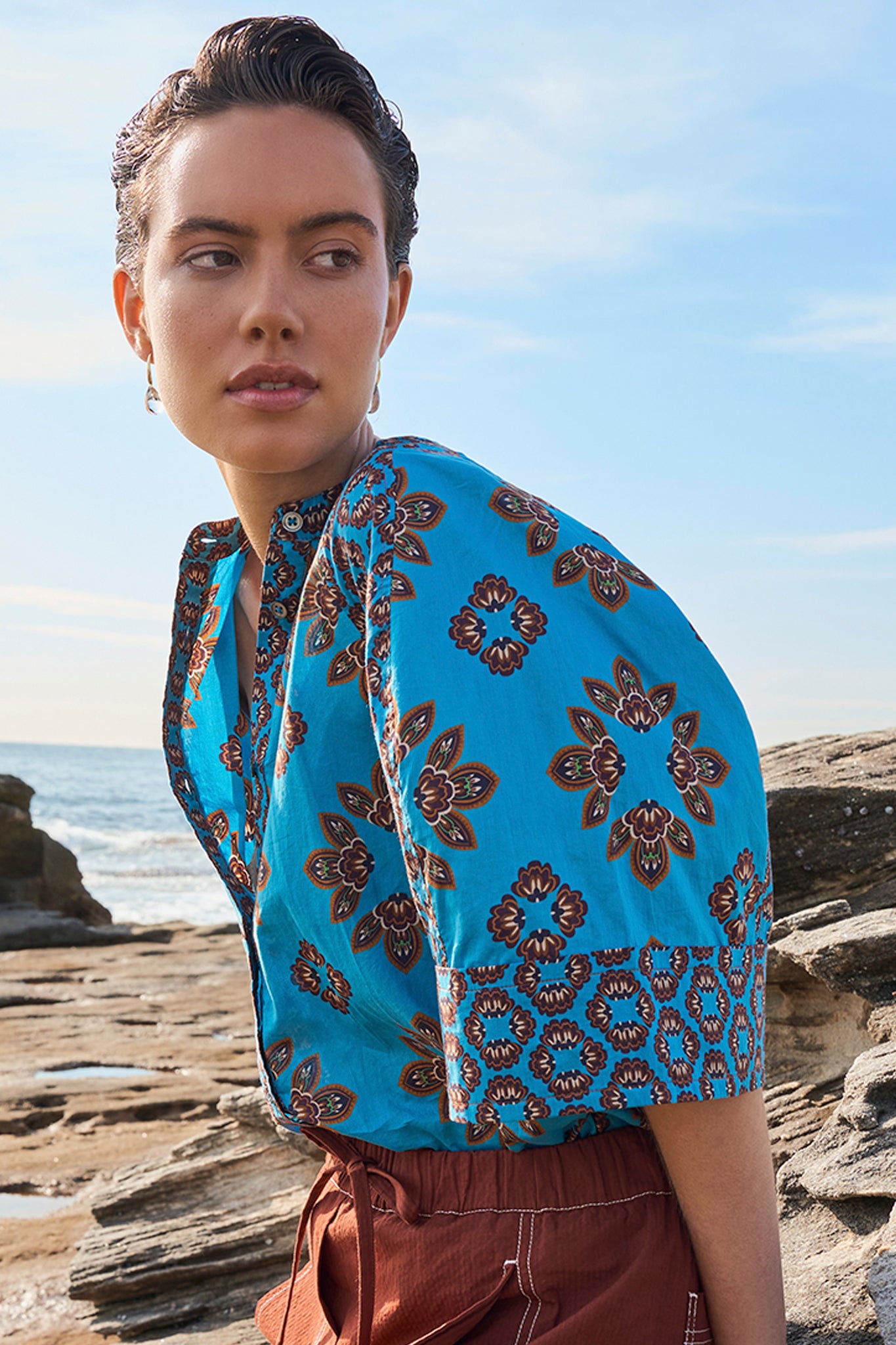 Blending Nordic and ethnic influences, the Gia Cotton Panelled Blouse splices together complementary prints of soft, crisp cotton to bring a vibrant pop of colour to summer dressing. Softly gathered raglan sleeves fall into a bell shape, adding graceful volume and ease. Style it tucked in or loose, buttoned to the neck or worn open for relaxed versatility. Pair with our Tobacco Seersucker Pant for effortless weekend chic, or one of the season’s skirts for a more feminine look.