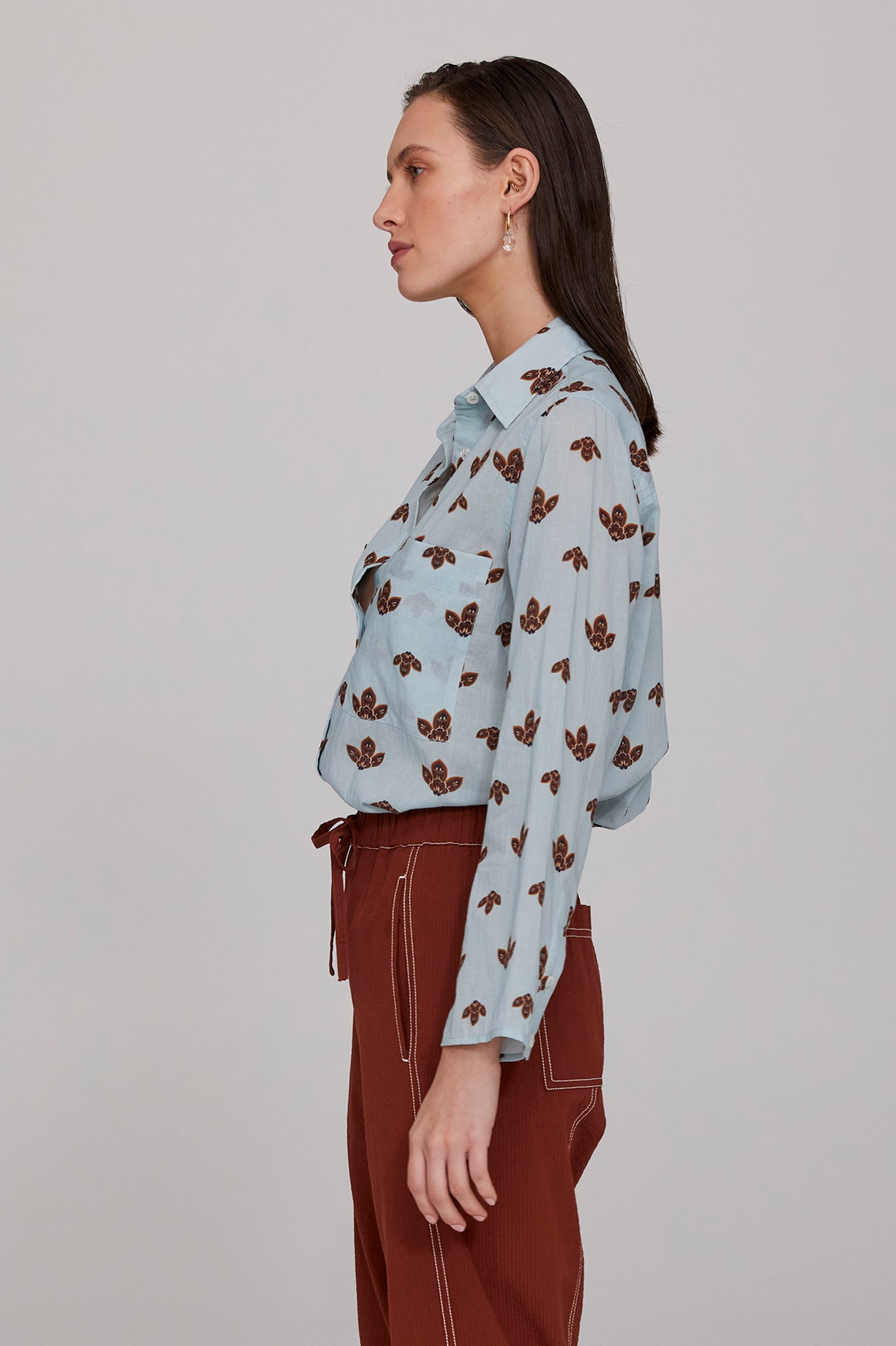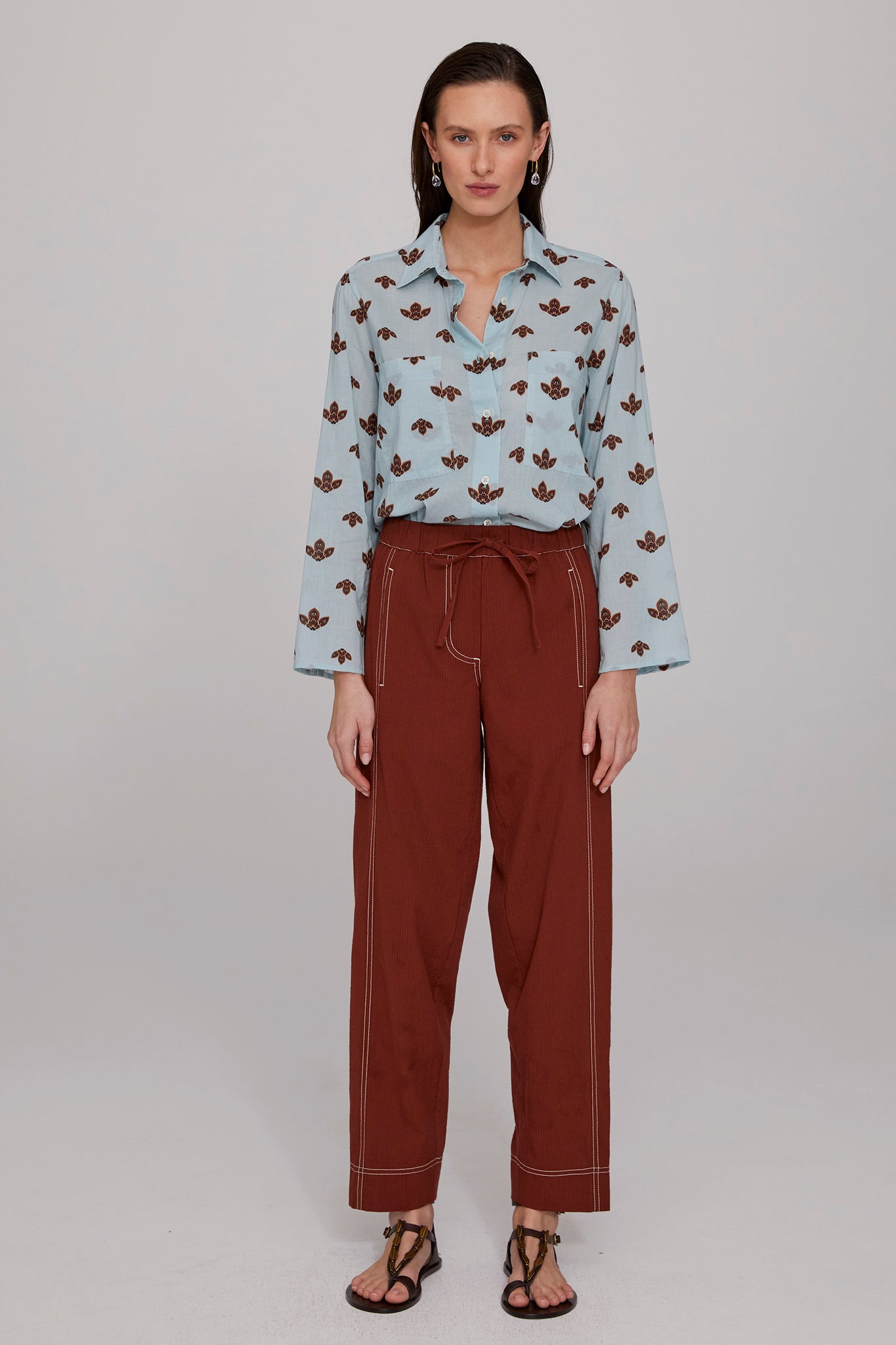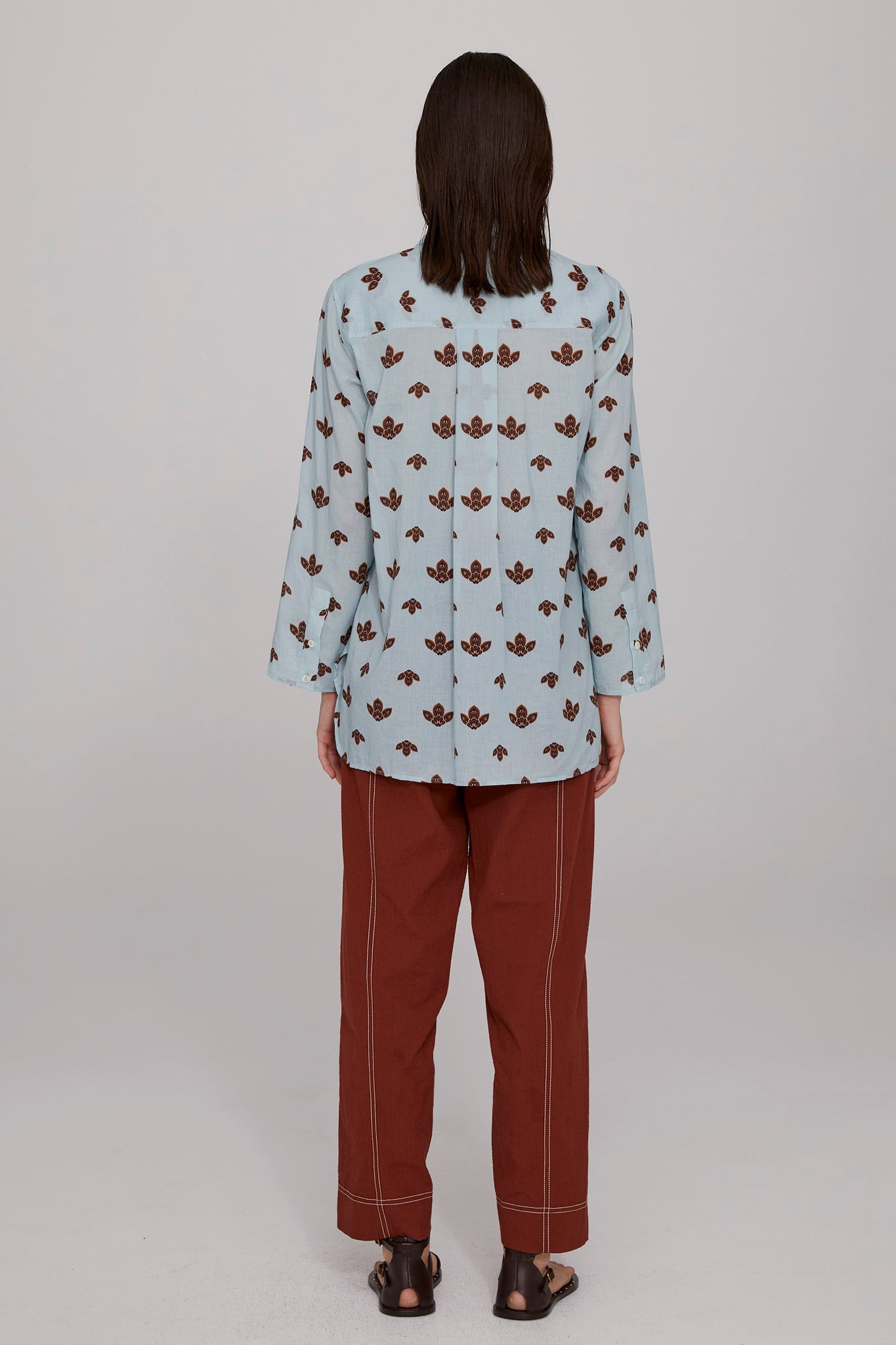 The Kaia Organic Cotton Shirt is a summer essential with a laid-back vibe. Made from soft sky-blue cotton voile printed with geometric leaf motifs, it features mother-of-pearl buttons and a regular fit with a scooped hemline. The sleeves are non-cuffed to create a point of difference- wear them long to the wrist or casually roll them up for a more relaxed look. Pair it with Tobacco Seersucker Pant or tuck it in to the Washed Denim Barrel Leg Jean for a cool contemporary vibe. Easy to wear and to care for, this shirt will be a much-loved summer staple.
