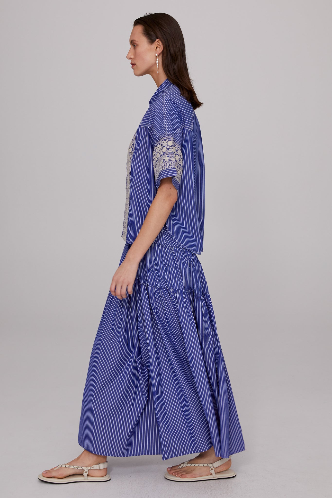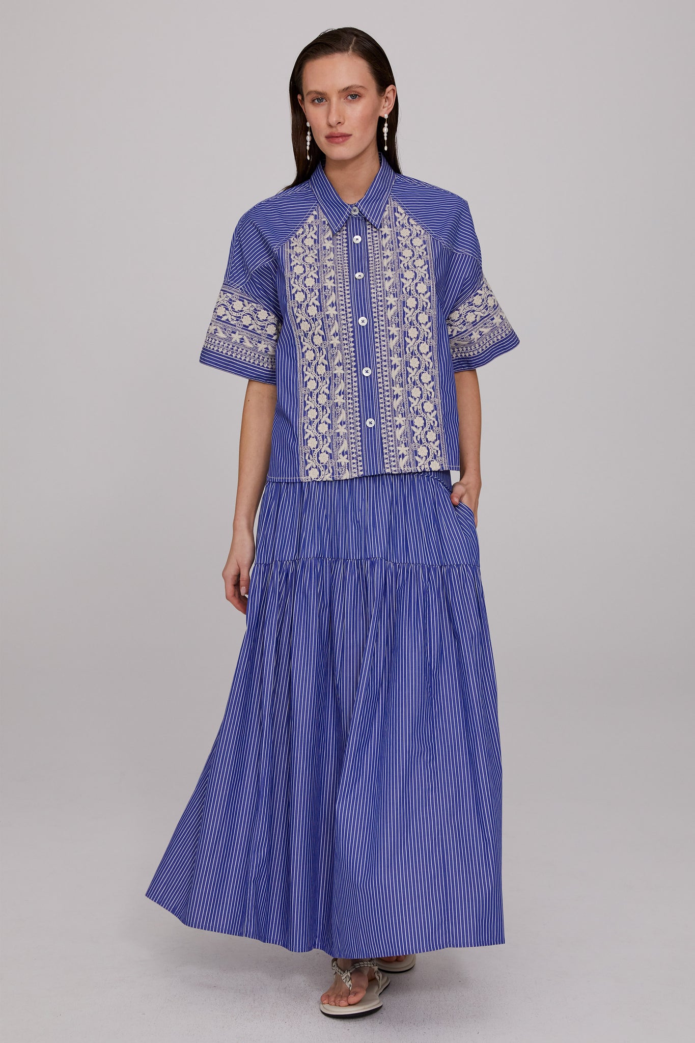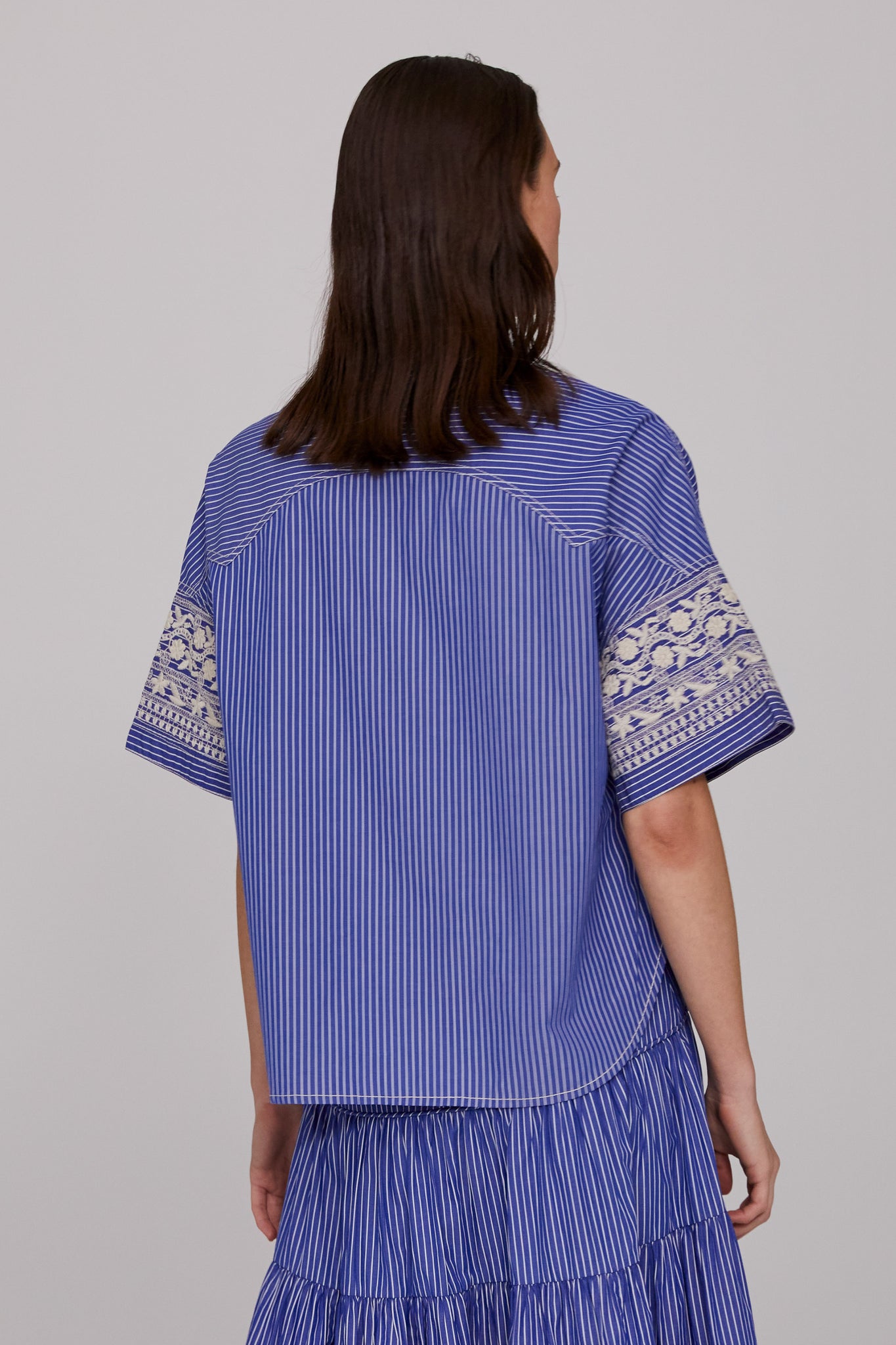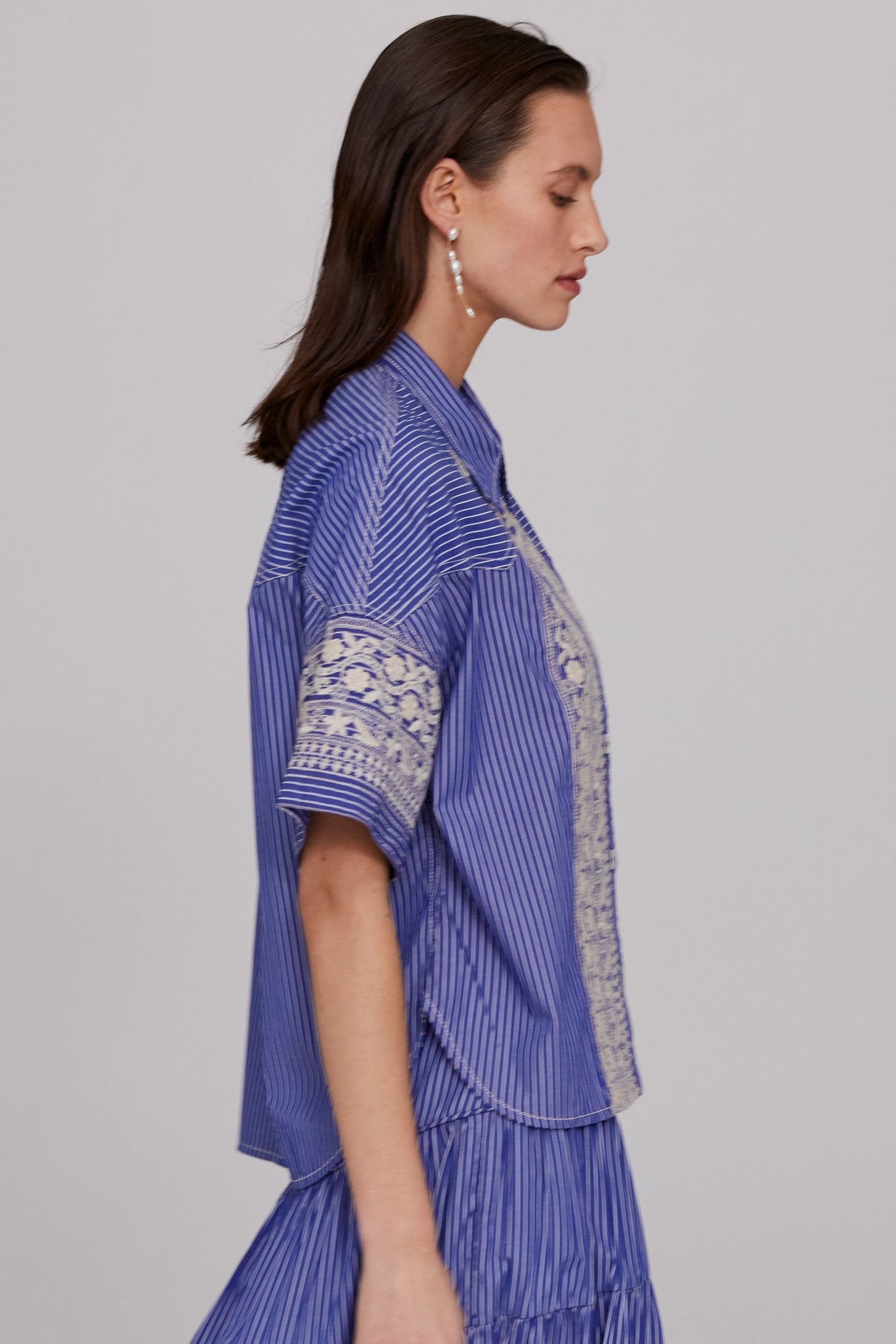 The Riley Embroidered Poplin Shirt is a modern staple reimagined with artisanal detail. Crafted from blue and white striped cotton poplin, it features textural ecru embroidery and ladder lace inserts that bring depth to its relaxed, contemporary silhouette. Short, dropped shoulder sleeves and a curved hemline — longer at the back — ensure a flattering fit, while jeans-style topstitching and mother-of-pearl buttons lend a refined finish. Style it with the Cobalt Stripe Poplin Tiered Skirt for a striking summer ensemble, or pair back with denim for everyday ease.