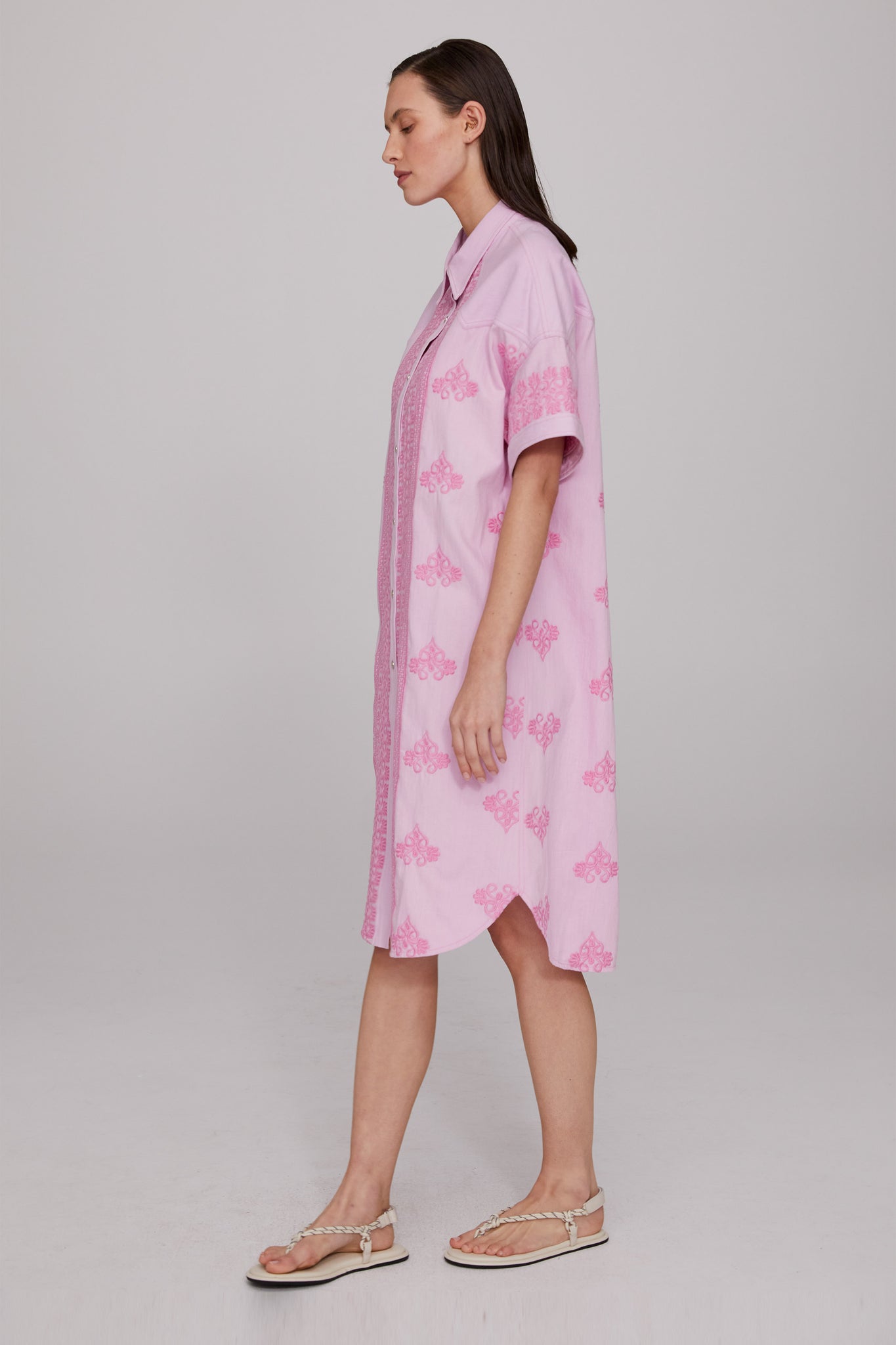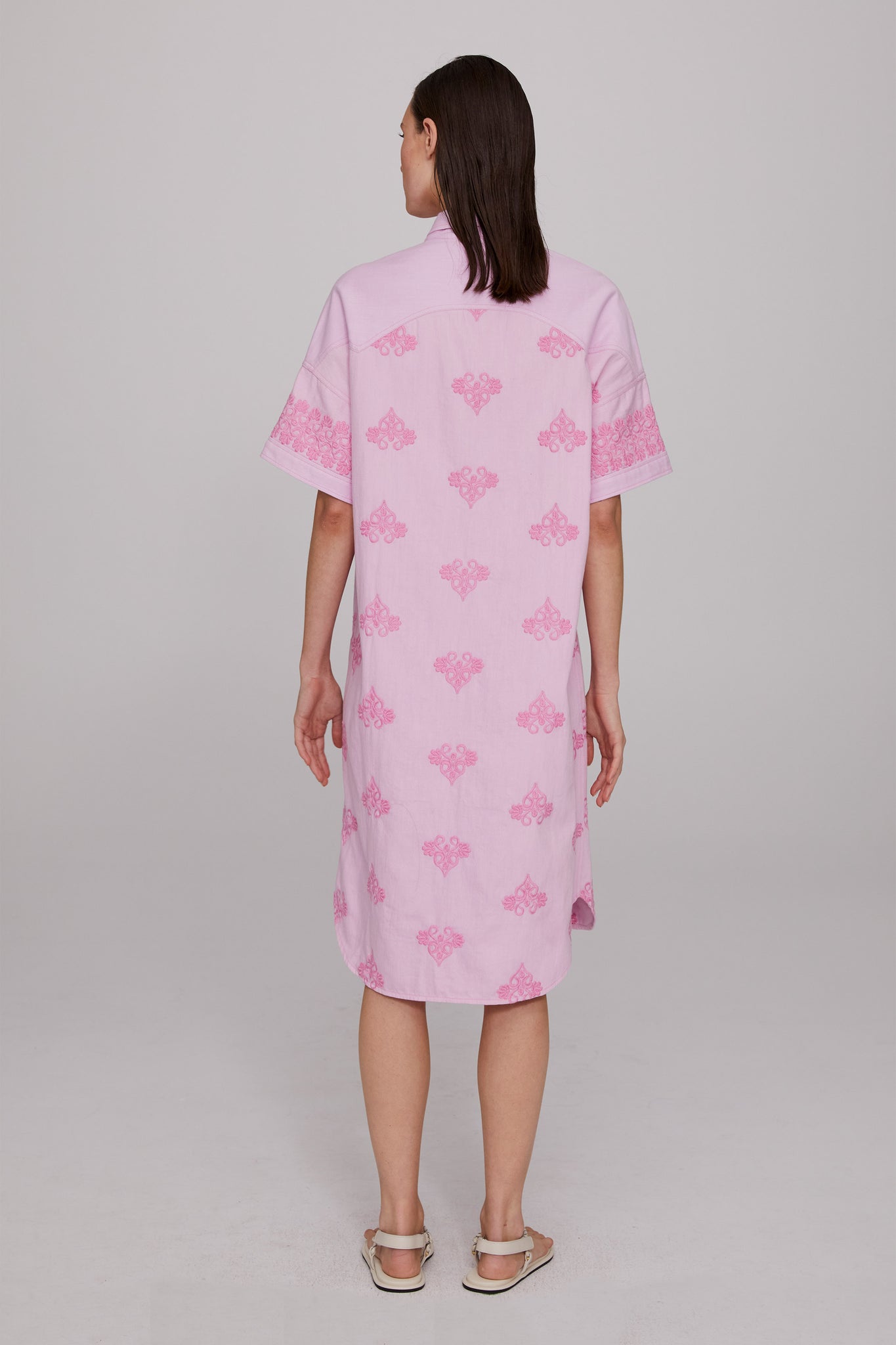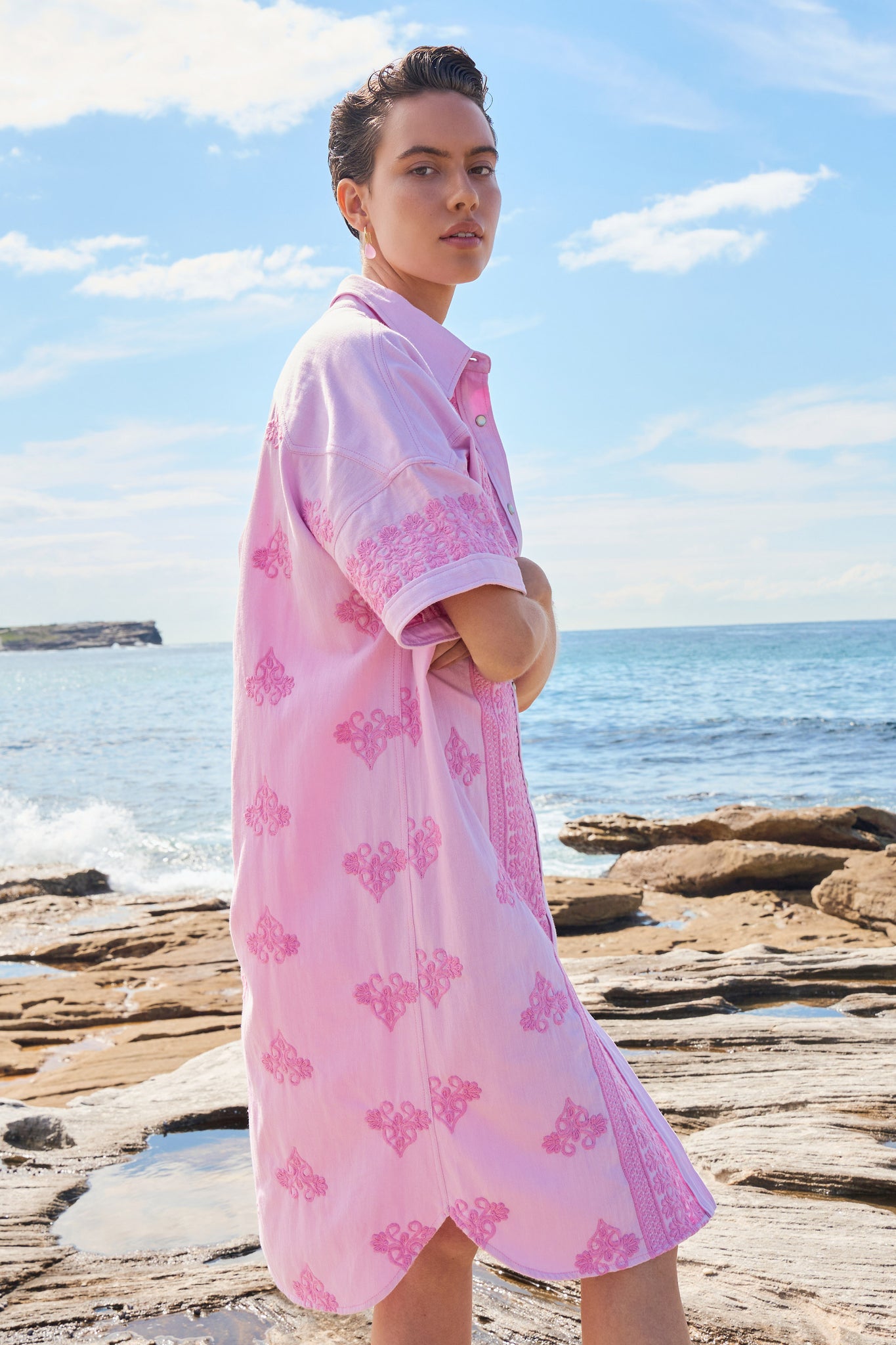 Cool and contemporary, the Aria Embroidered Denim Dress brings a fresh twist to classic jeans-style dressing. Crafted in the softest sorbet-pink overdyed denim, it is elevated with textural tonal embroidery that adds depth and artisanal charm. The relaxed, boxy silhouette with dropped shoulders creates an effortless ease, while the curved hemline — longer at the back — flatters the figure. Finished with pearlized press studs through the front and defined with jeans-style topstitching, this dress is as versatile as it is stylish. Pair with trainers for everyday wear or summer slides for relaxed elegance.