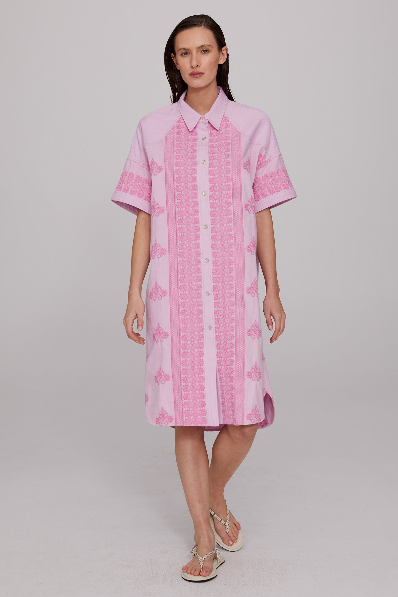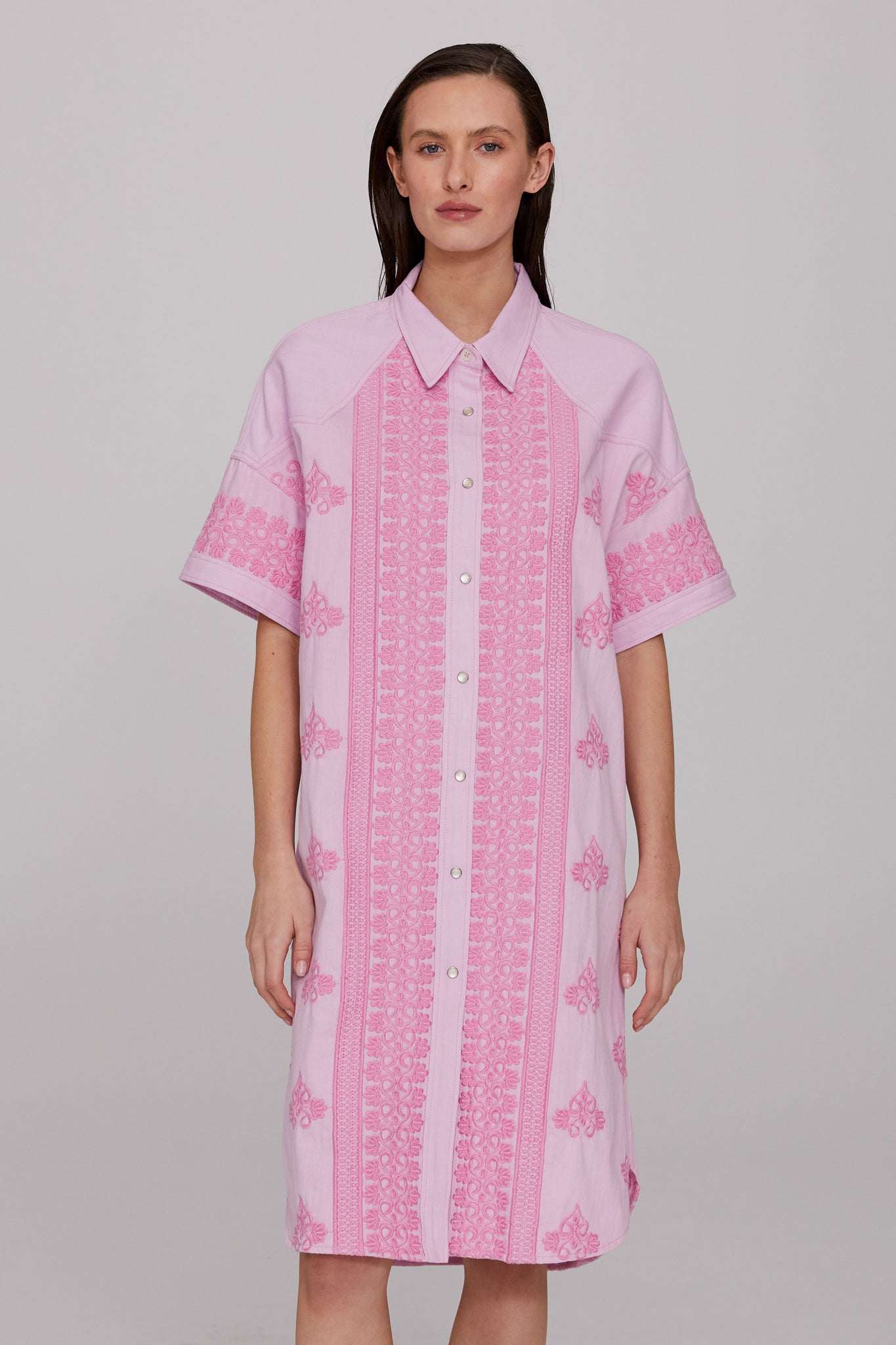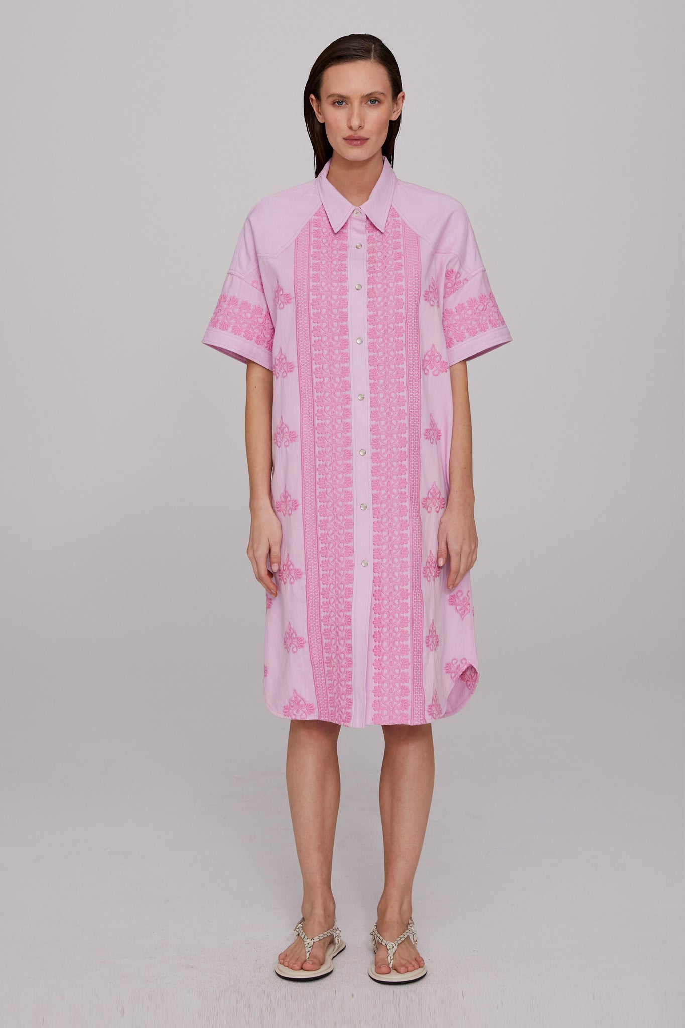 Cool and contemporary, the Aria Embroidered Denim Dress brings a fresh twist to classic jeans-style dressing. Crafted in the softest sorbet-pink overdyed denim, it is elevated with textural tonal embroidery that adds depth and artisanal charm. The relaxed, boxy silhouette with dropped shoulders creates an effortless ease, while the curved hemline — longer at the back — flatters the figure. Finished with pearlized press studs through the front and defined with jeans-style topstitching, this dress is as versatile as it is stylish. Pair with trainers for everyday wear or summer slides for relaxed elegance.