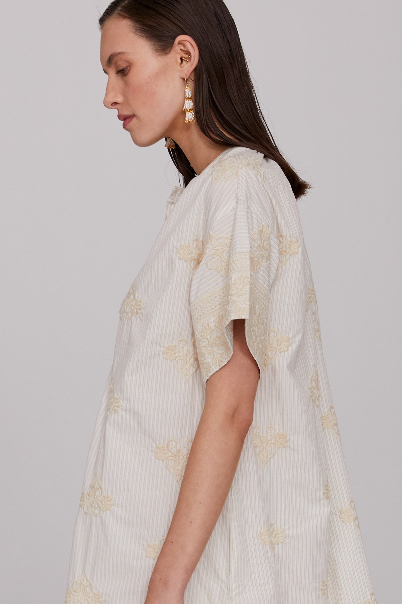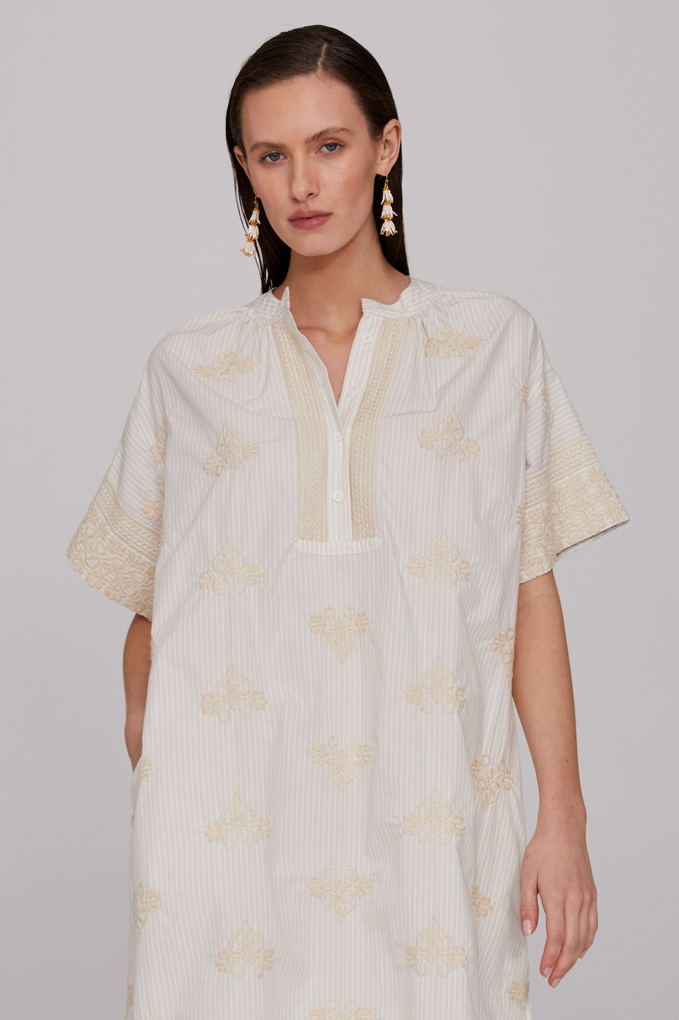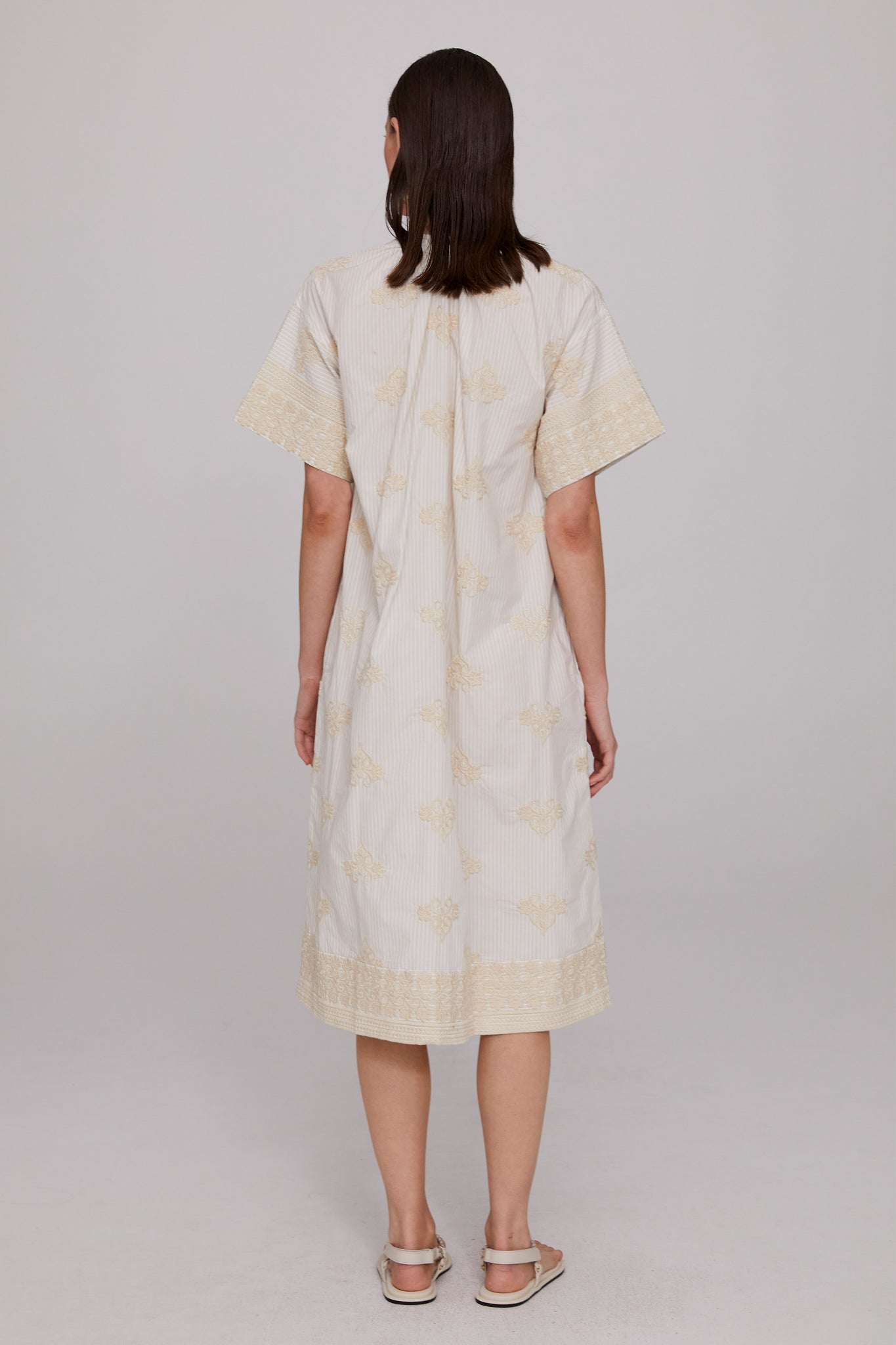 The Aria Striped Poplin Dress is elevated by intricate embroidery, bringing a touch of craftsmanship to an otherwise effortless silhouette. Cut from crisp cotton poplin in soft ecru and cream stripes, it is lavishly embroidered with tonal motifs that bring texture and refinement. Designed in a relaxed smock silhouette, gathers fall softly from a neat collar band, while a front button tab with mother-of-pearl buttons can be worn closed for polish or open for ease. Practical side seam pockets and subtle hem splits enhance its effortless wearability. Wear with a flat sandal for your next holiday getaway or pair with a strappy heel for a lunch date.