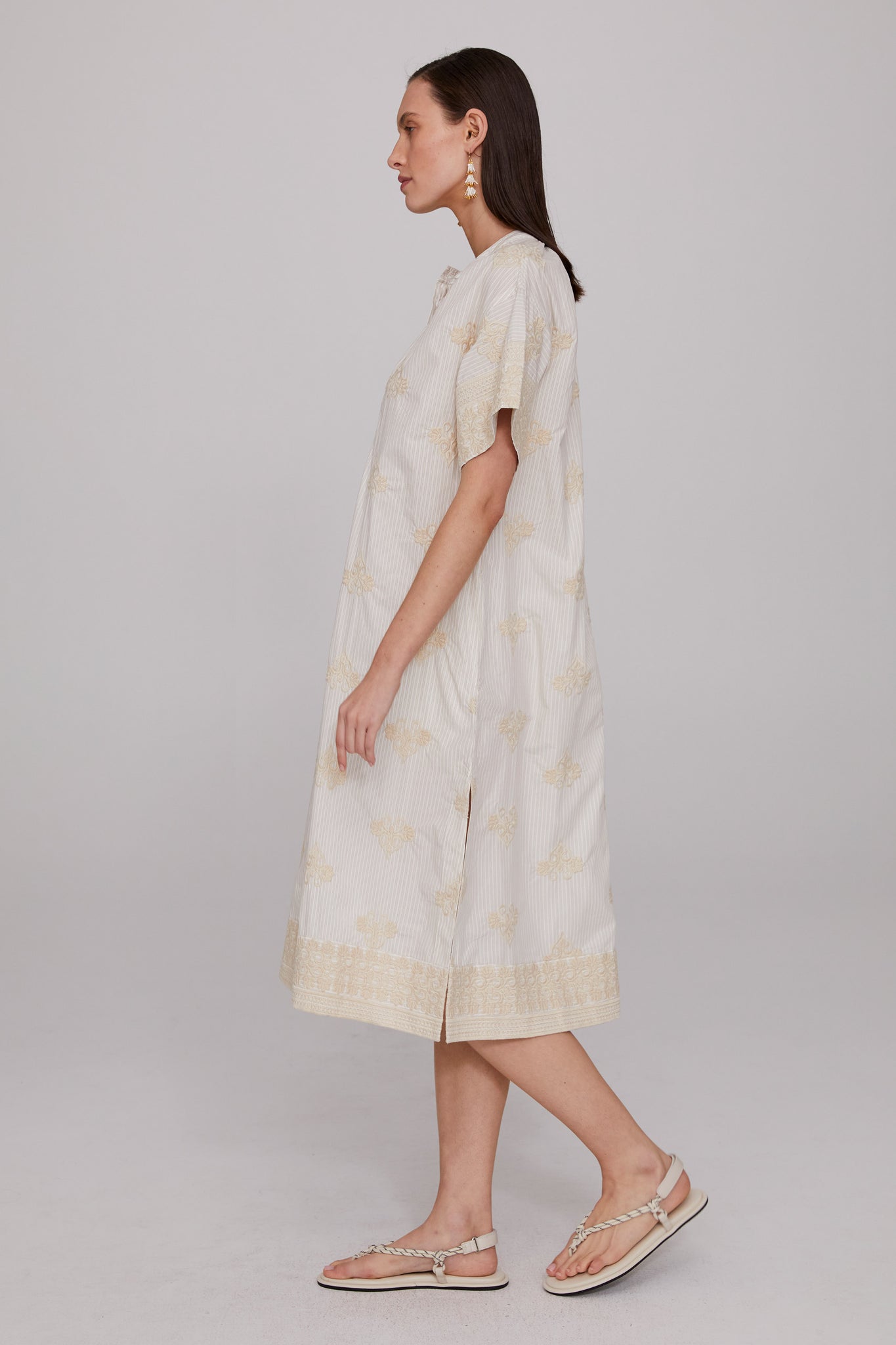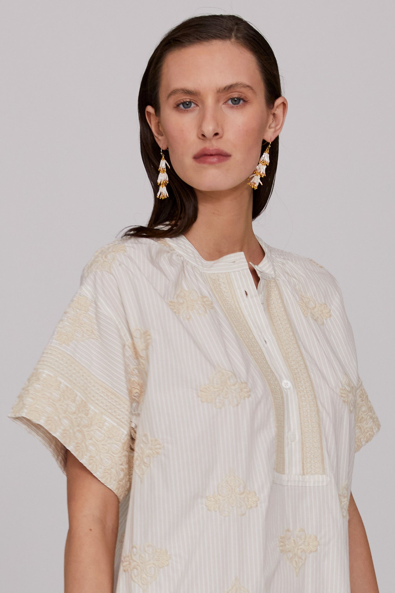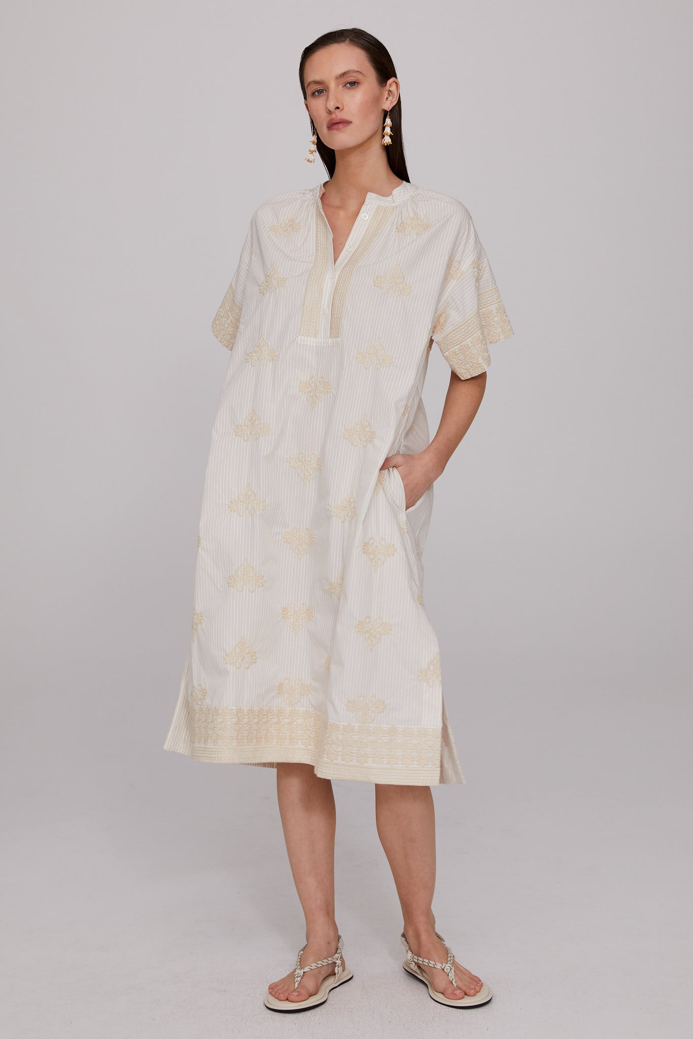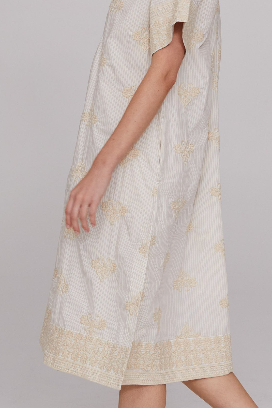 The Aria Striped Poplin Dress is elevated by intricate embroidery, bringing a touch of craftsmanship to an otherwise effortless silhouette. Cut from crisp cotton poplin in soft ecru and cream stripes, it is lavishly embroidered with tonal motifs that bring texture and refinement. Designed in a relaxed smock silhouette, gathers fall softly from a neat collar band, while a front button tab with mother-of-pearl buttons can be worn closed for polish or open for ease. Practical side seam pockets and subtle hem splits enhance its effortless wearability. Wear with a flat sandal for your next holiday getaway or pair with a strappy heel for a lunch date.