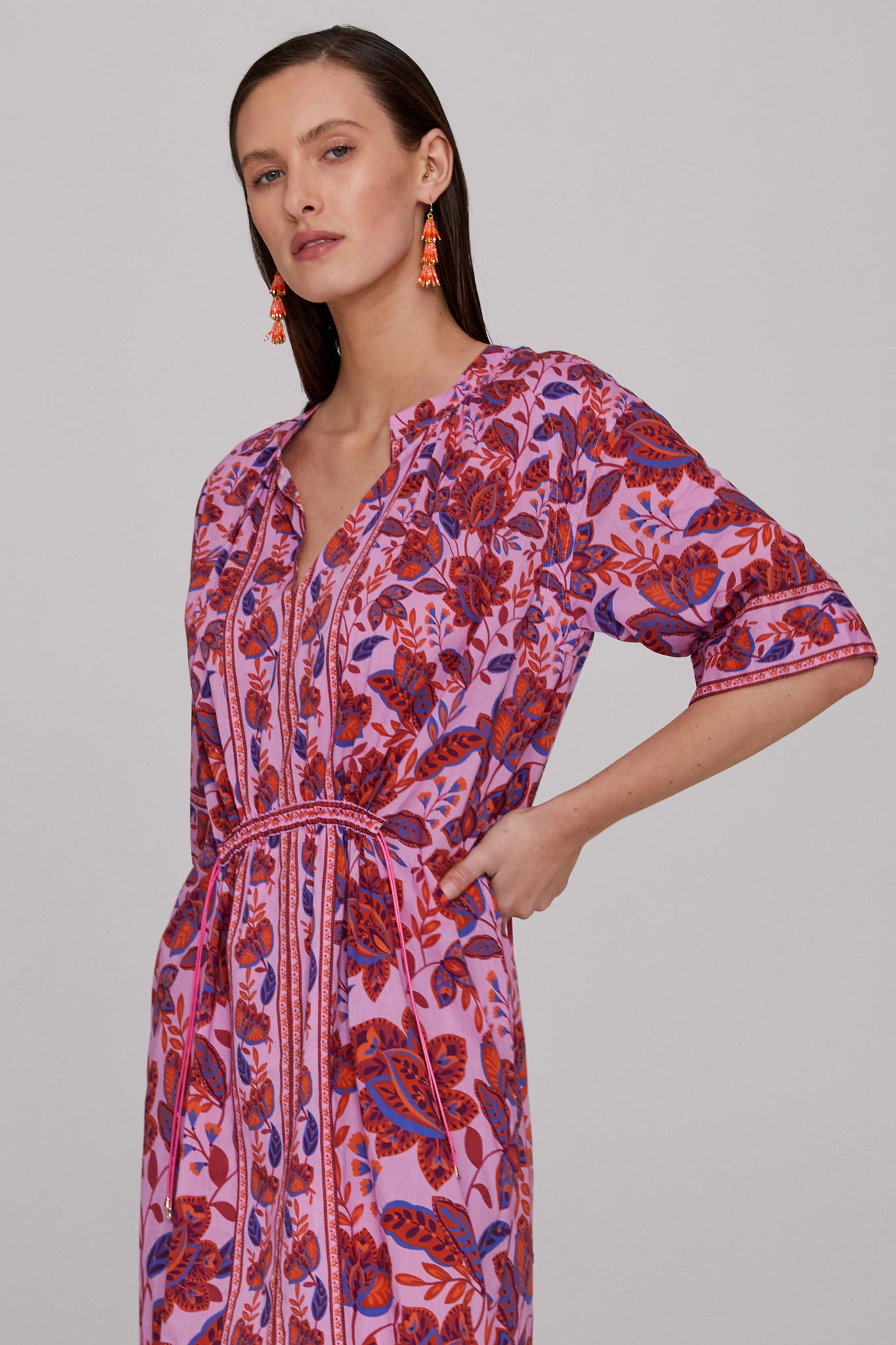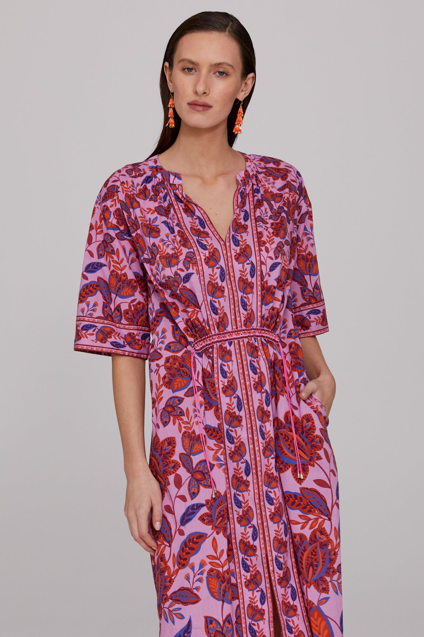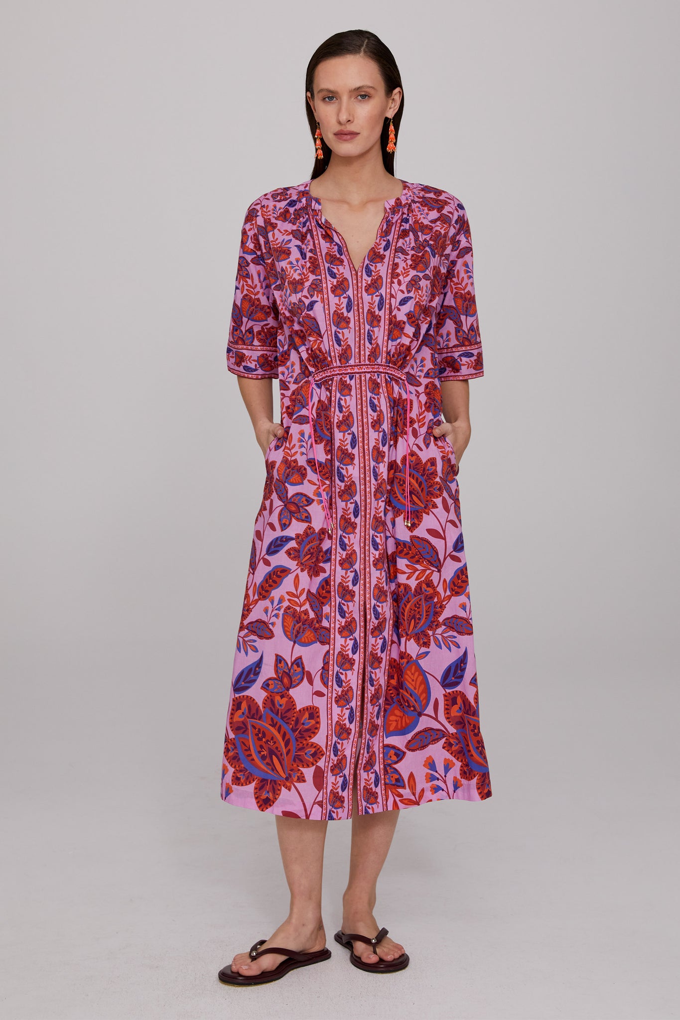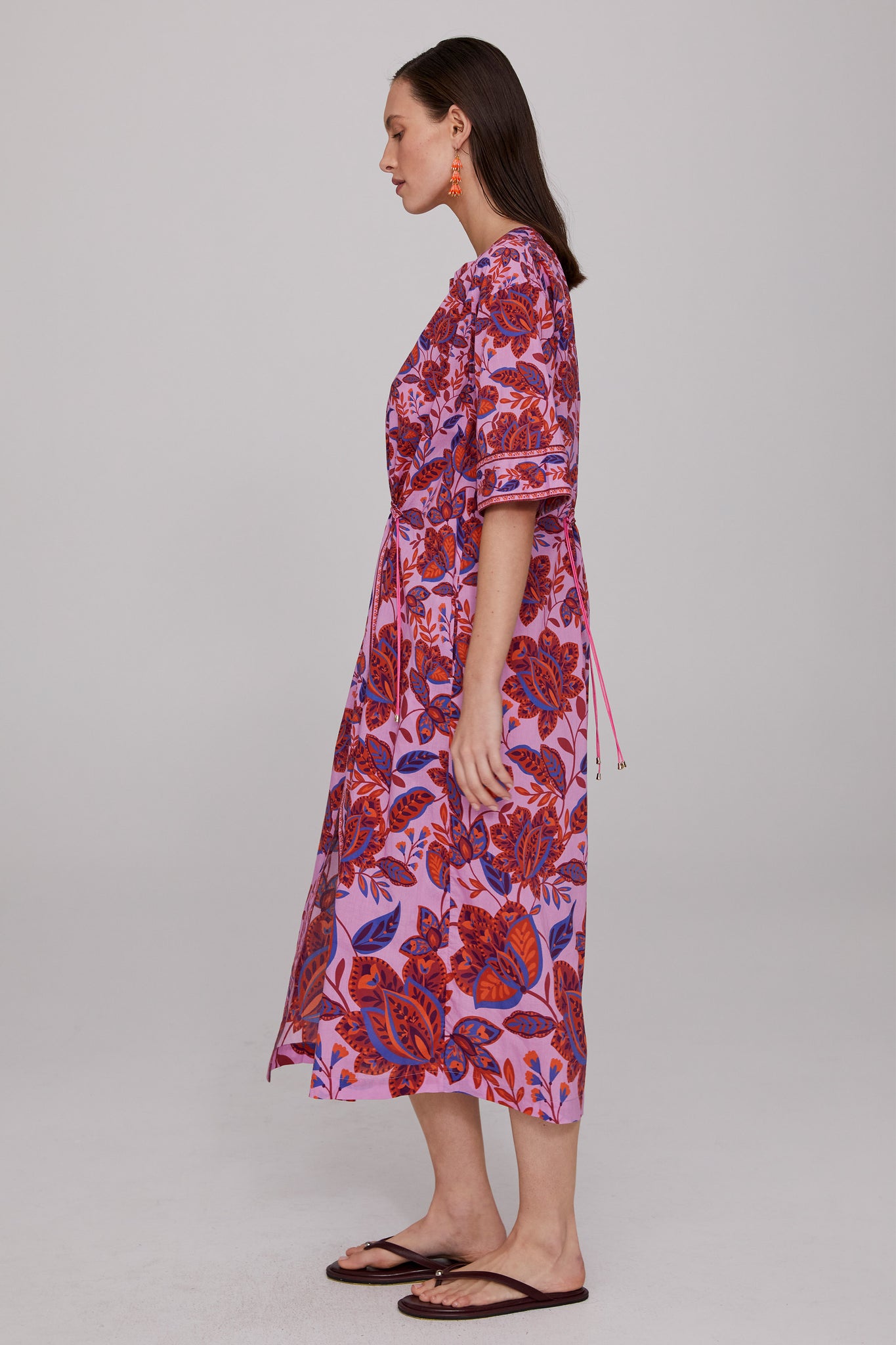 The Ariana Cotton Drawstring Dress is the ultimate summer day piece, combining relaxed ease with understated chic. Cut from lightweight cotton lawn, it showcases this season’s signature floral folkloric print in tones of blue, red ad orange upon the prettiest carnation pink base. Adjustable drawstrings at the waist allow the silhouette to be cinched or worn loose, making it as flattering as it is comfortable — perfect for warm days that flow from casual to refined.