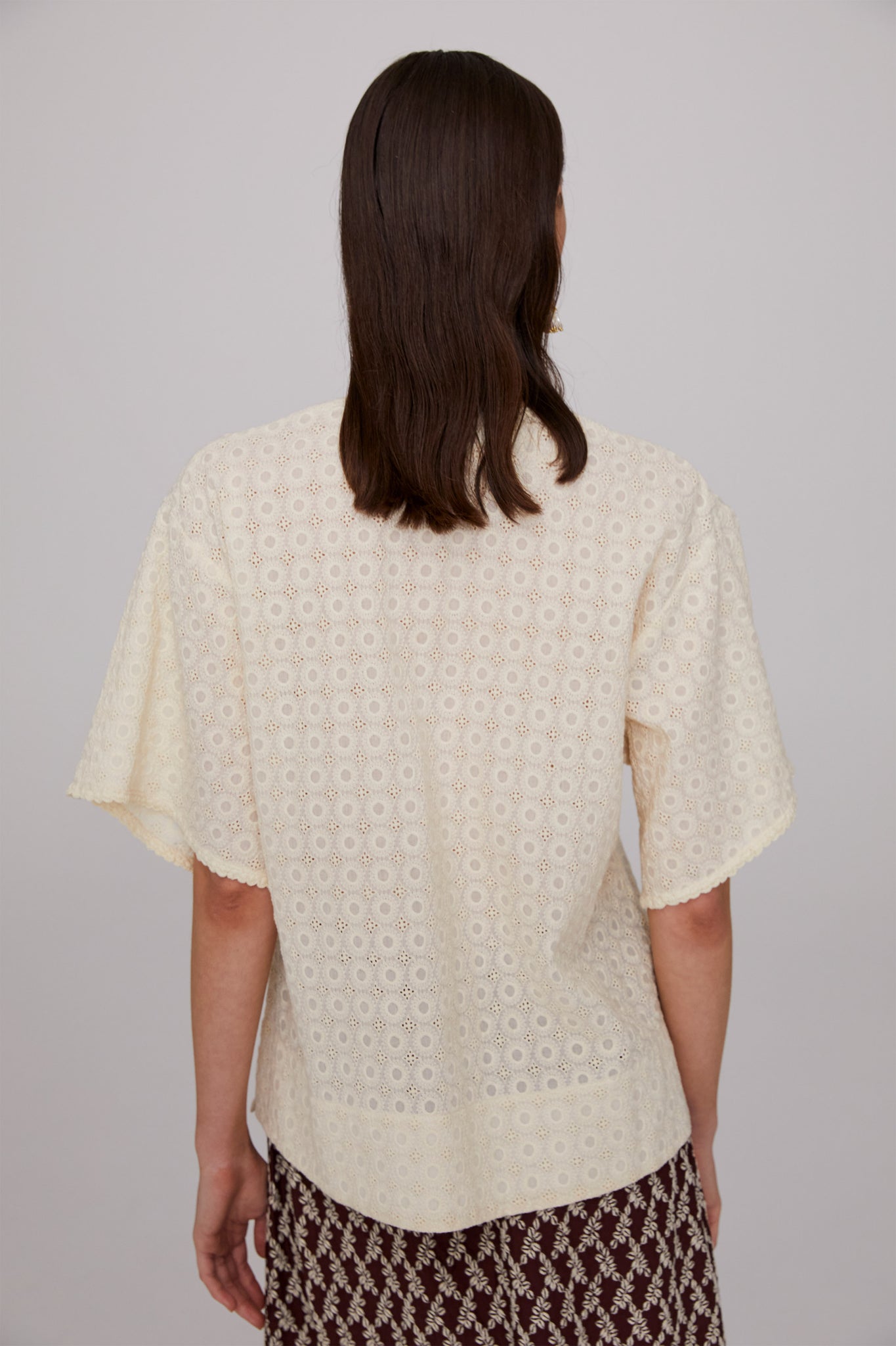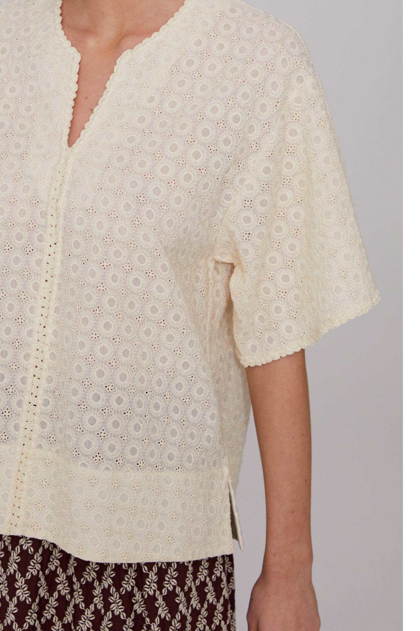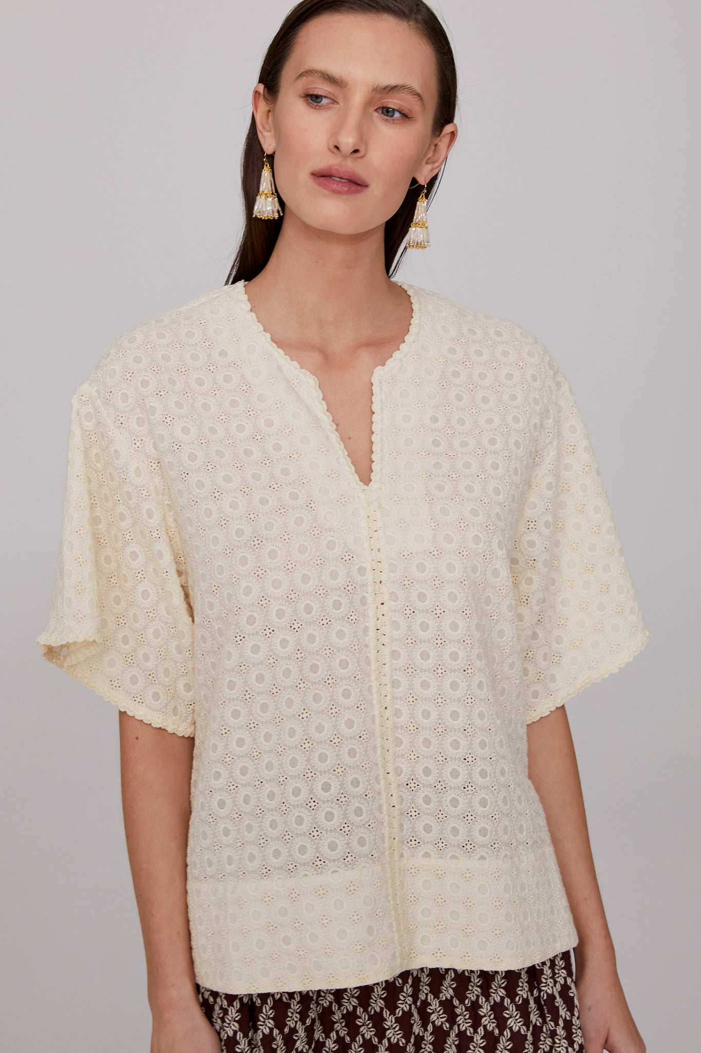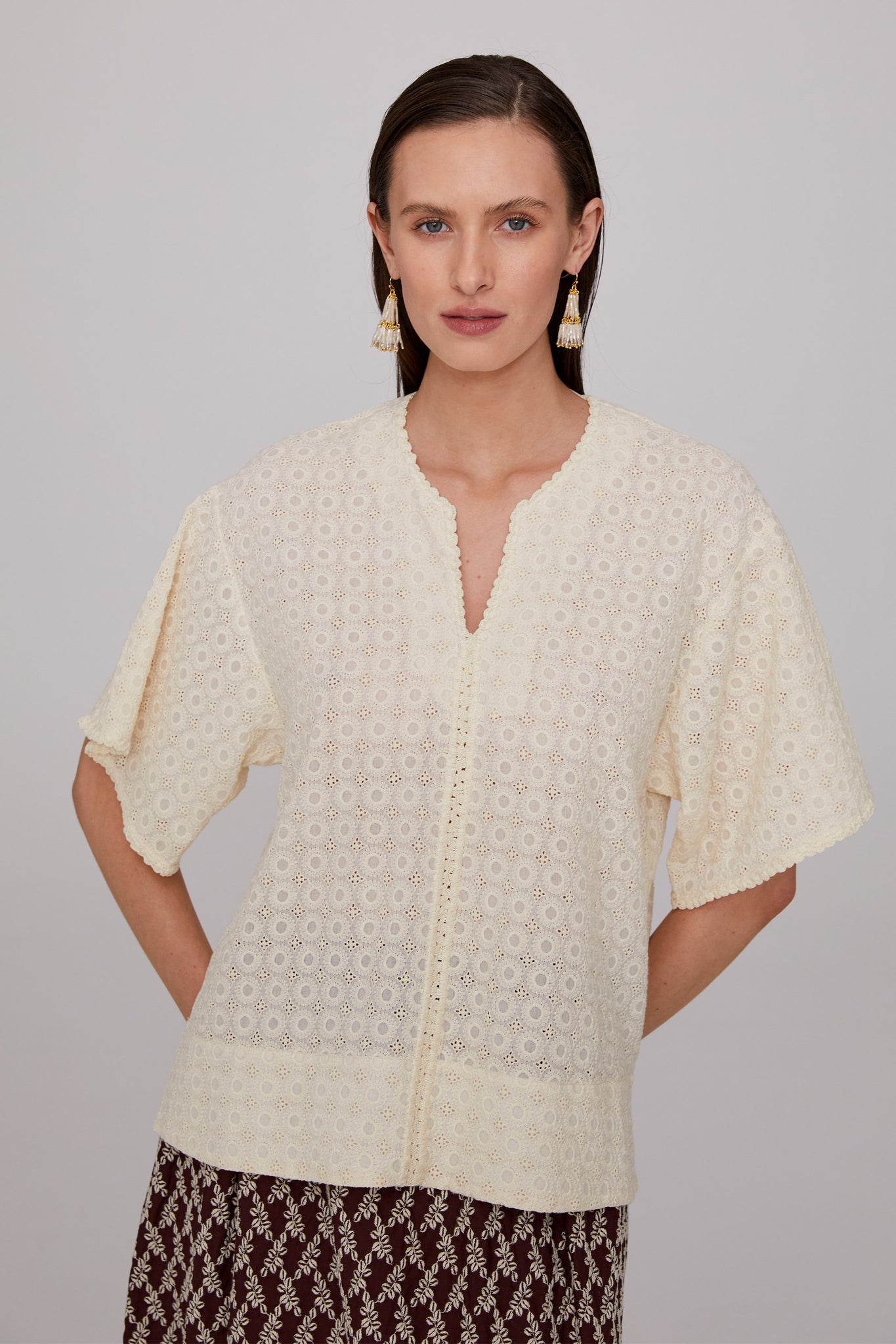 A versatile summer – co-ordinate, the Broidery Crochet Trim Top is the perfect piece to co-ordinate with almost any summer pant or skirt this season. Crafted from an embroidered cotton, hand crochet detailing trims the neckline and hems, adding a considered artisanal touch. The relaxed silhouette has the ease of a summer tee, yet this fabrication and detailing elevates and stamps this piece with the true MEGAN PARK signature. A piece you will throw on with ease this summer and beyond.