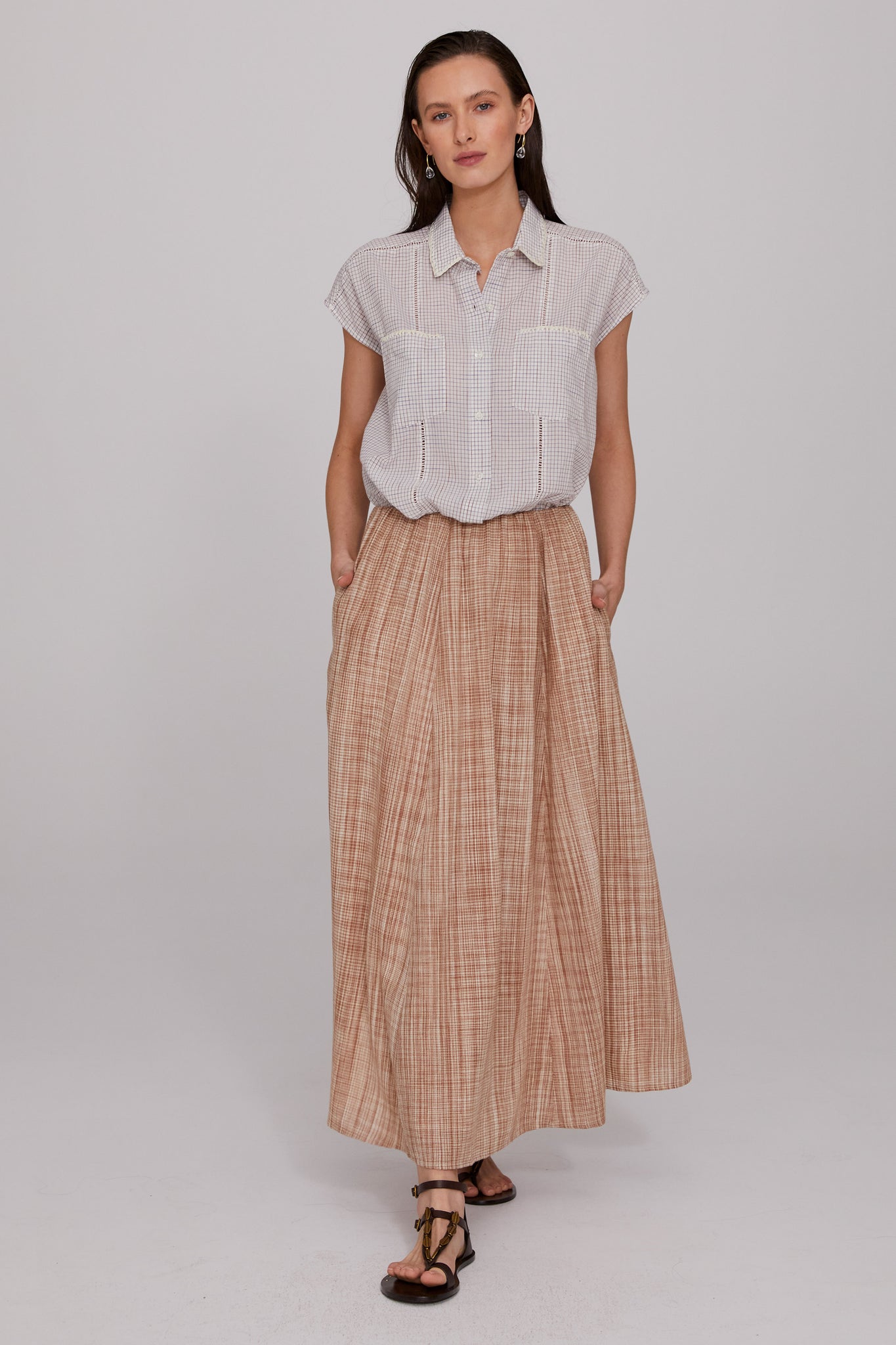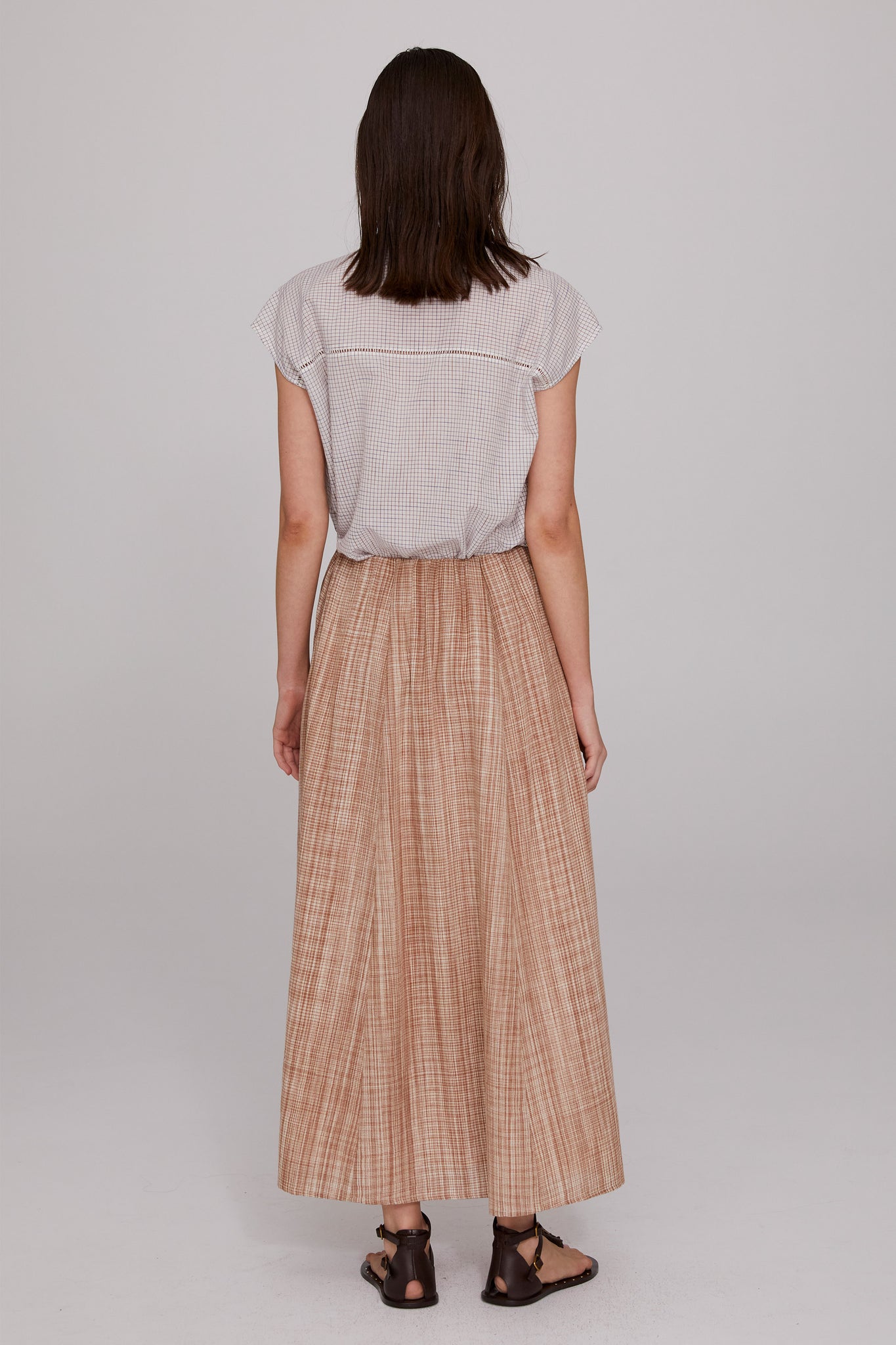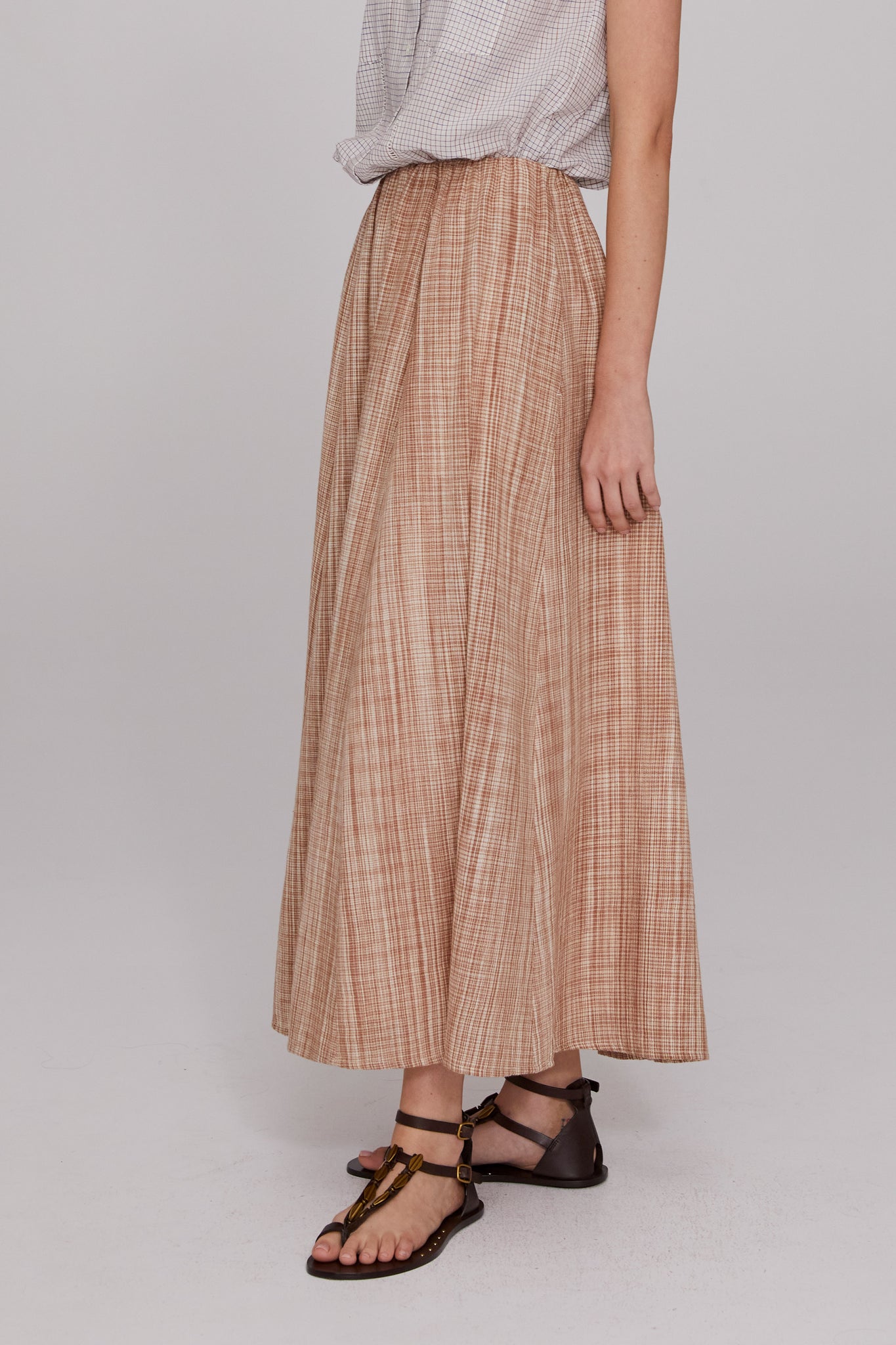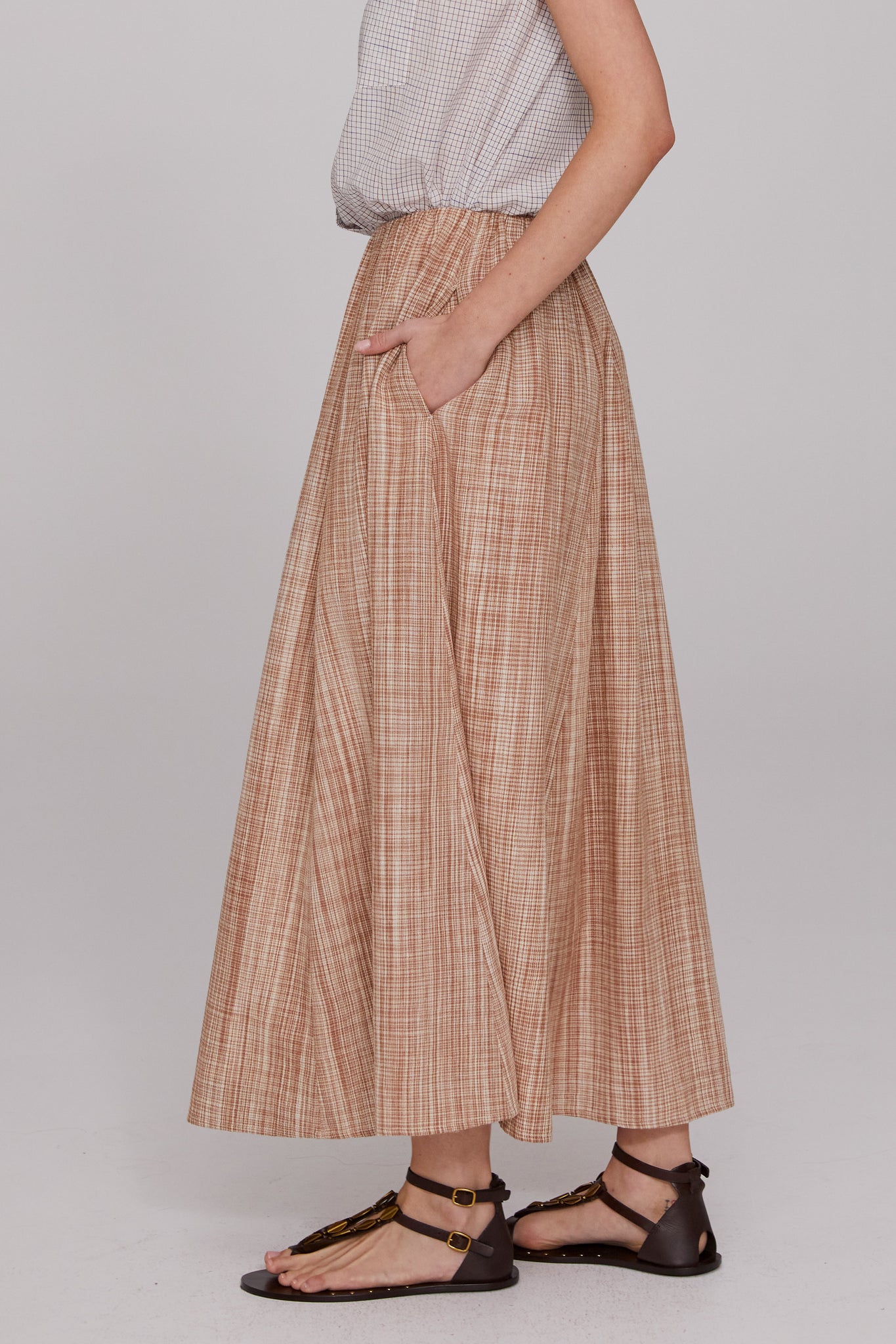 The Khadi Cotton Handloom Skirt embodies artisanal craft and timeless femininity. Handwoven from lightweight cotton khadi, its softly voluminous silhouette moves with graceful ease, while the natural weave lends subtle texture and depth. A concealed elasticated waistband and practical side pockets ensure comfort without compromising elegance. Pair with the Khadi Check Crochet Trim Top for a coordinated look that will be treasured all summer long. Style simply with flat sandals, a summer wedge, or a delicate heel.