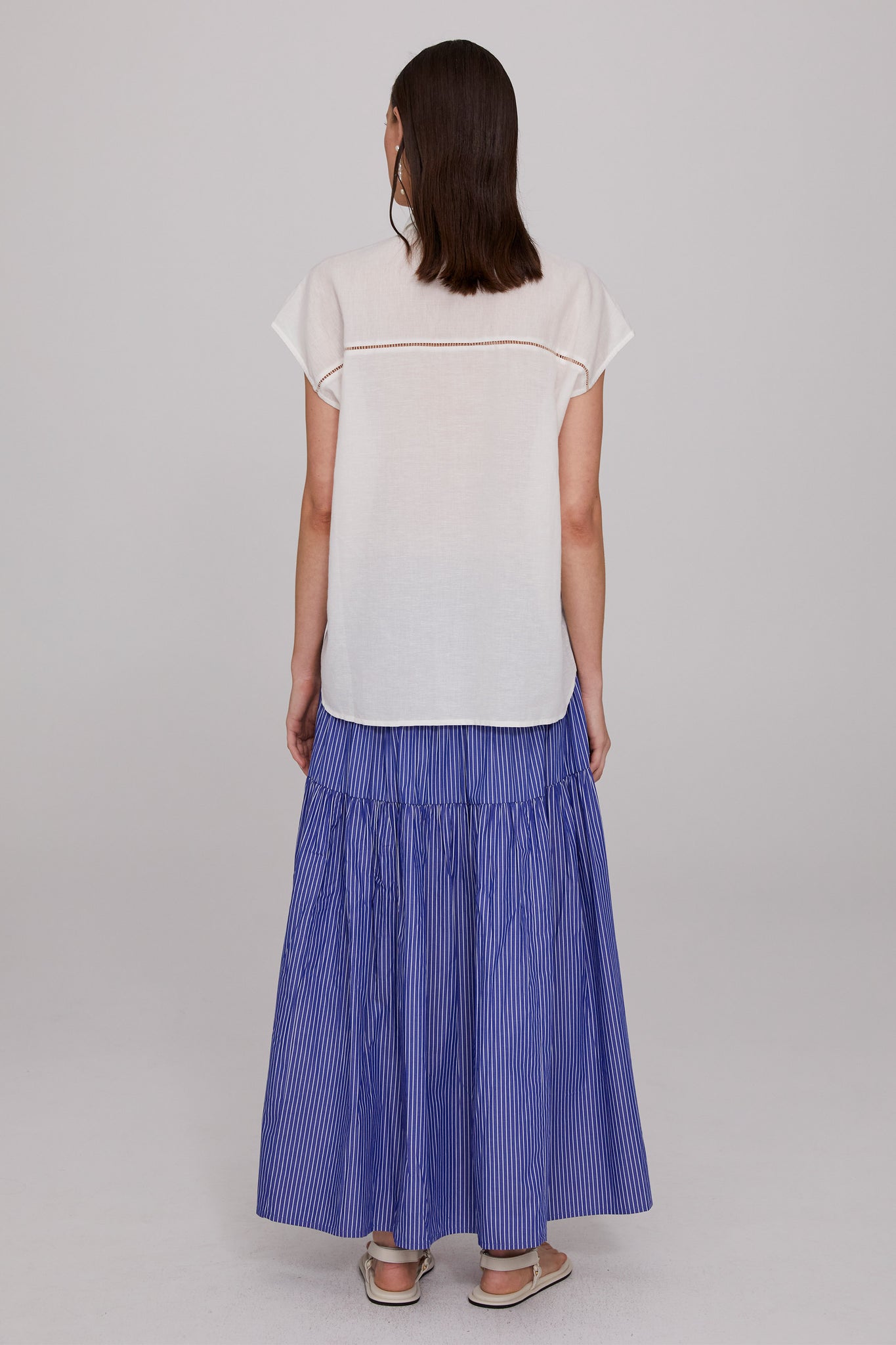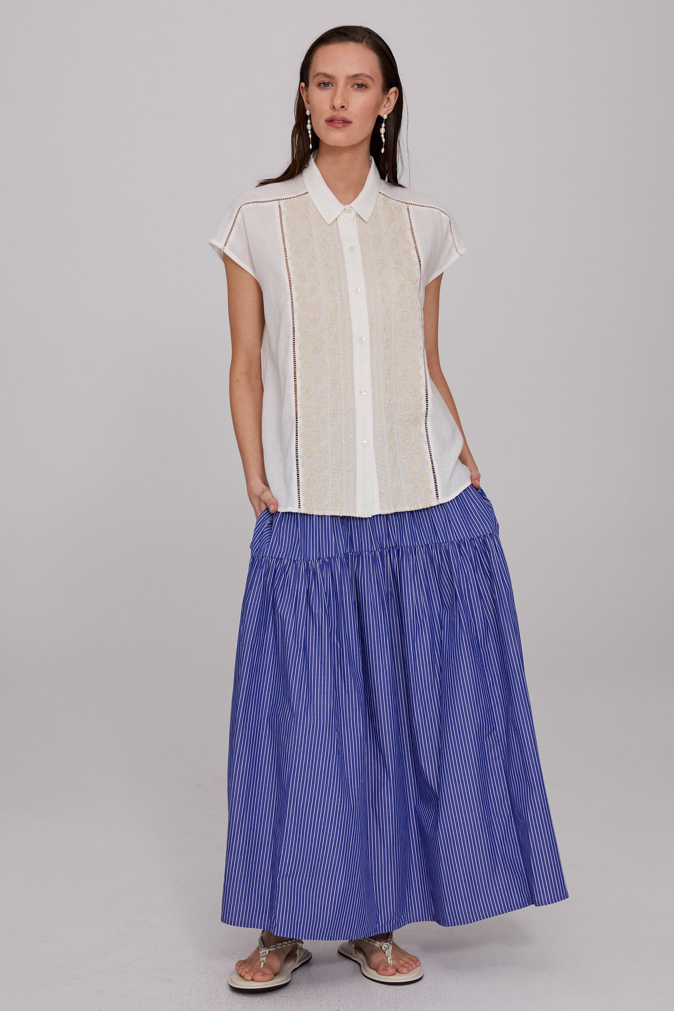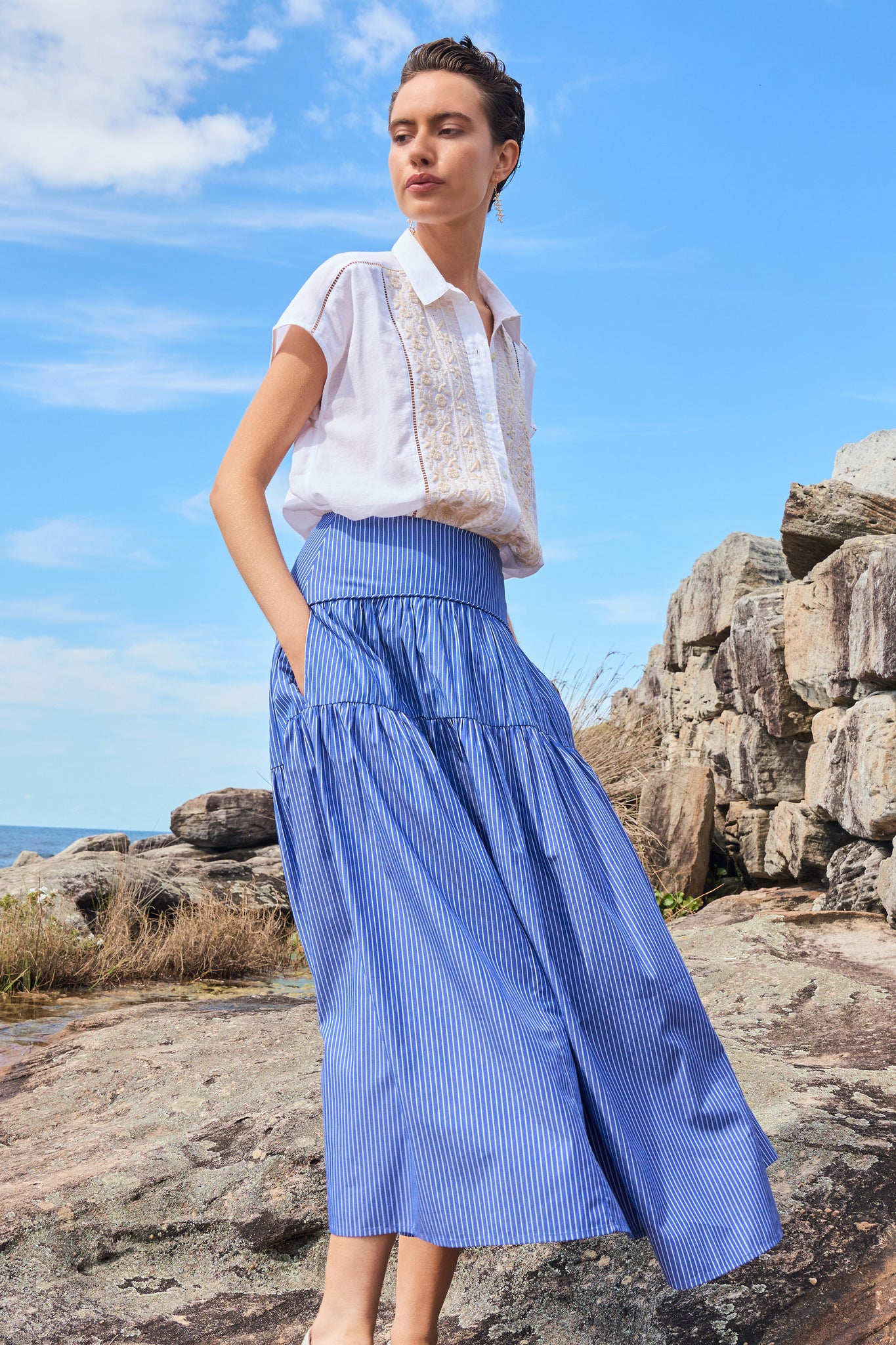 The Riley Cotton Linen Top is a versatile warm-weather staple, elevated with artisanal touches. Crafted from a soft cotton-linen blend in natural white, it features ecru embroidery and delicate ladder lace inserts, adding subtle texture and refinement. Designed in a relaxed silhouette, it is finished with a neat shirt collar, mother-of-pearl buttons, and a shaped hemline that flatters whether worn loose or tucked in. Easy to coordinate with almost anything, it pairs effortlessly with the Cobalt Stripe Poplin Tiered Skirt for a fresh summer look.
