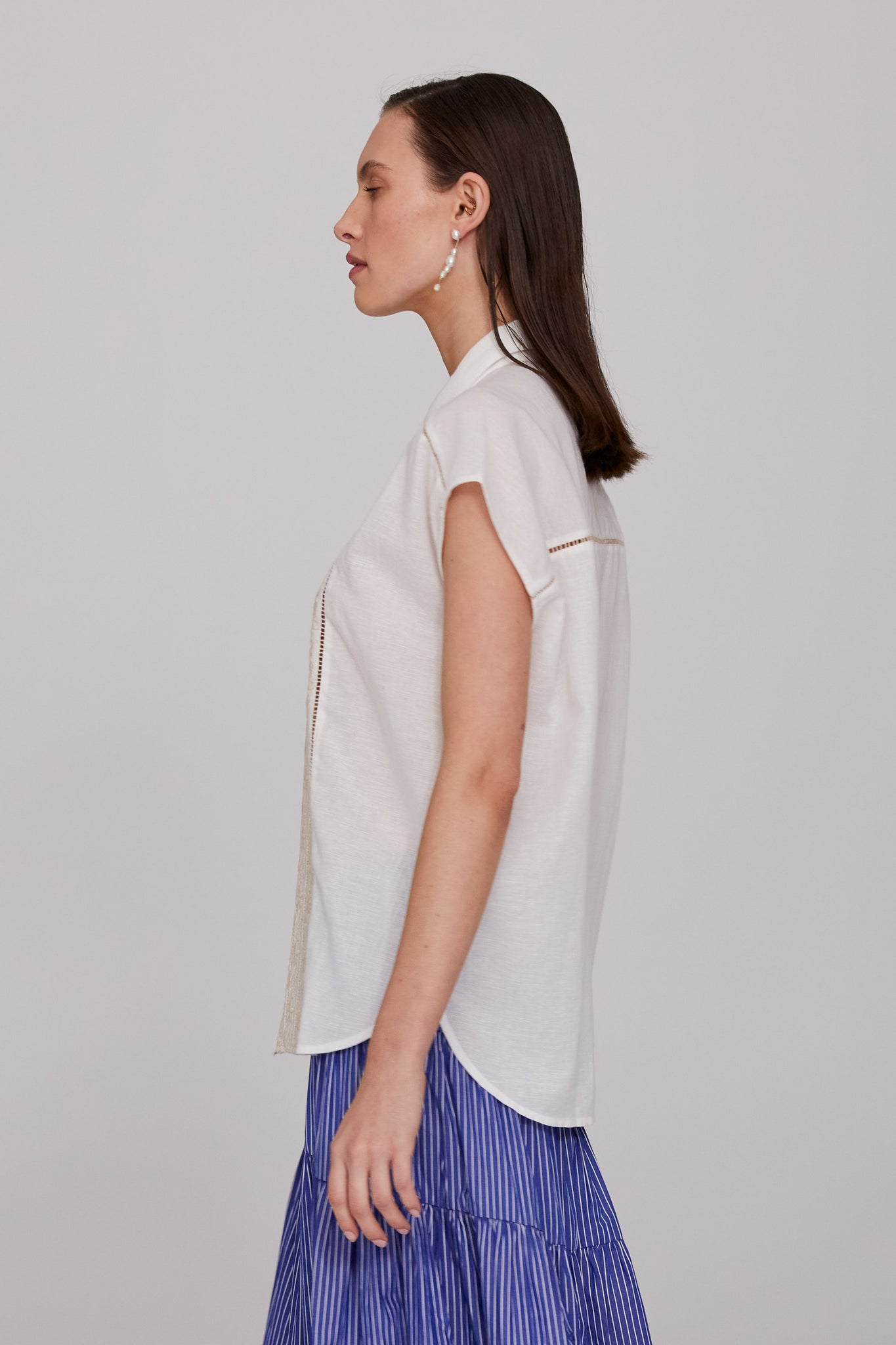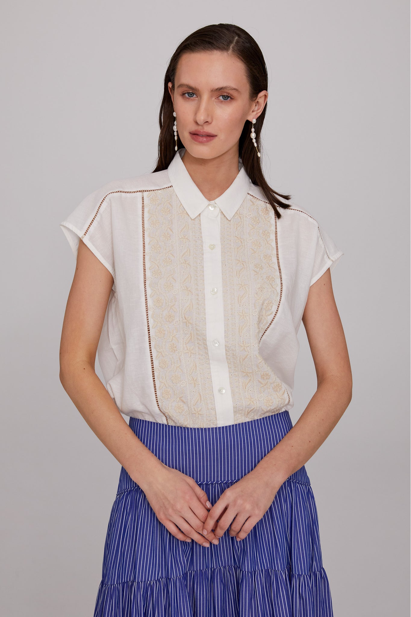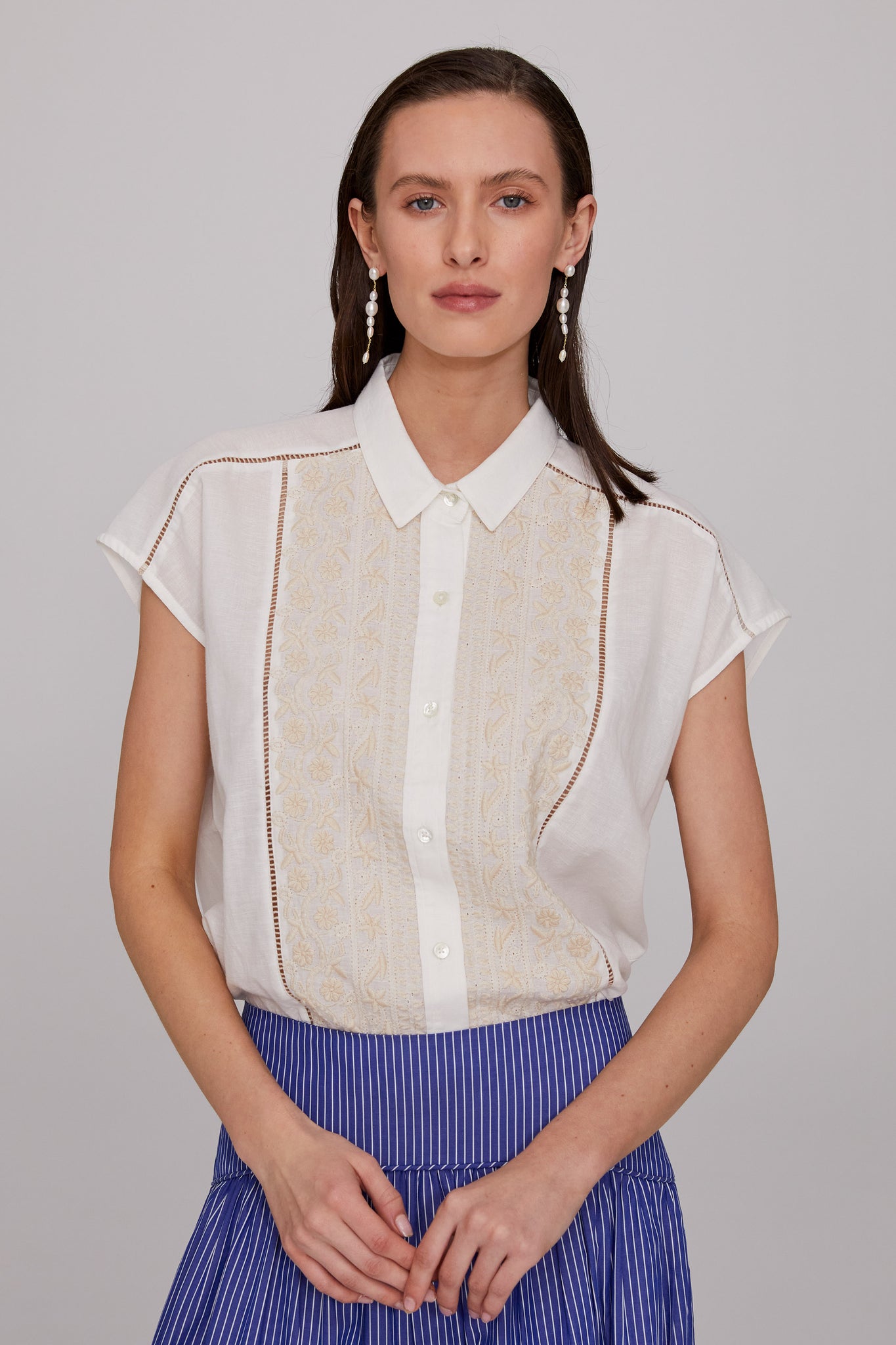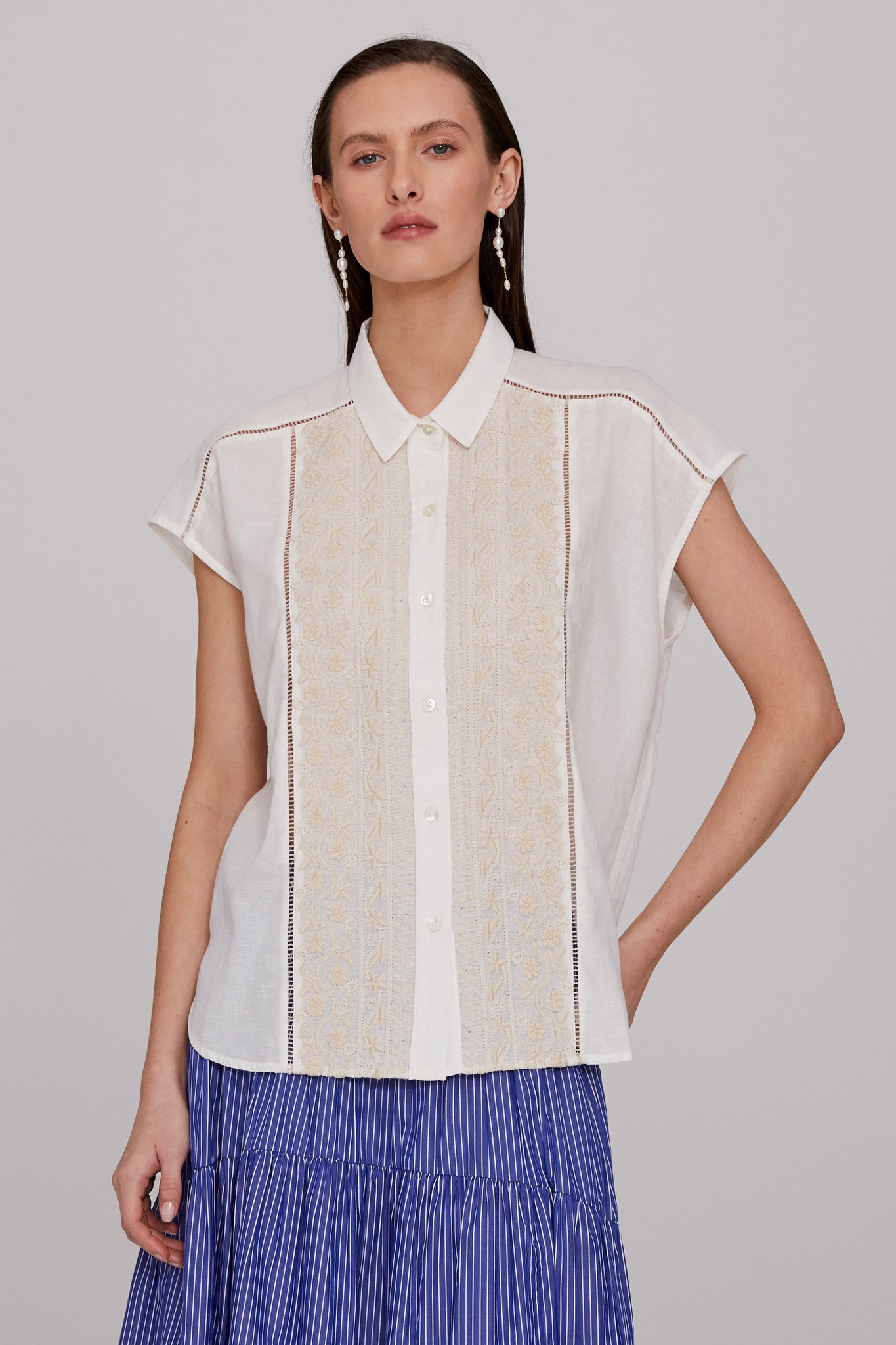 The Riley Cotton Linen Top is a versatile warm-weather staple, elevated with artisanal touches. Crafted from a soft cotton-linen blend in natural white, it features ecru embroidery and delicate ladder lace inserts, adding subtle texture and refinement. Designed in a relaxed silhouette, it is finished with a neat shirt collar, mother-of-pearl buttons, and a shaped hemline that flatters whether worn loose or tucked in. Easy to coordinate with almost anything, it pairs effortlessly with the Cobalt Stripe Poplin Tiered Skirt for a fresh summer look.