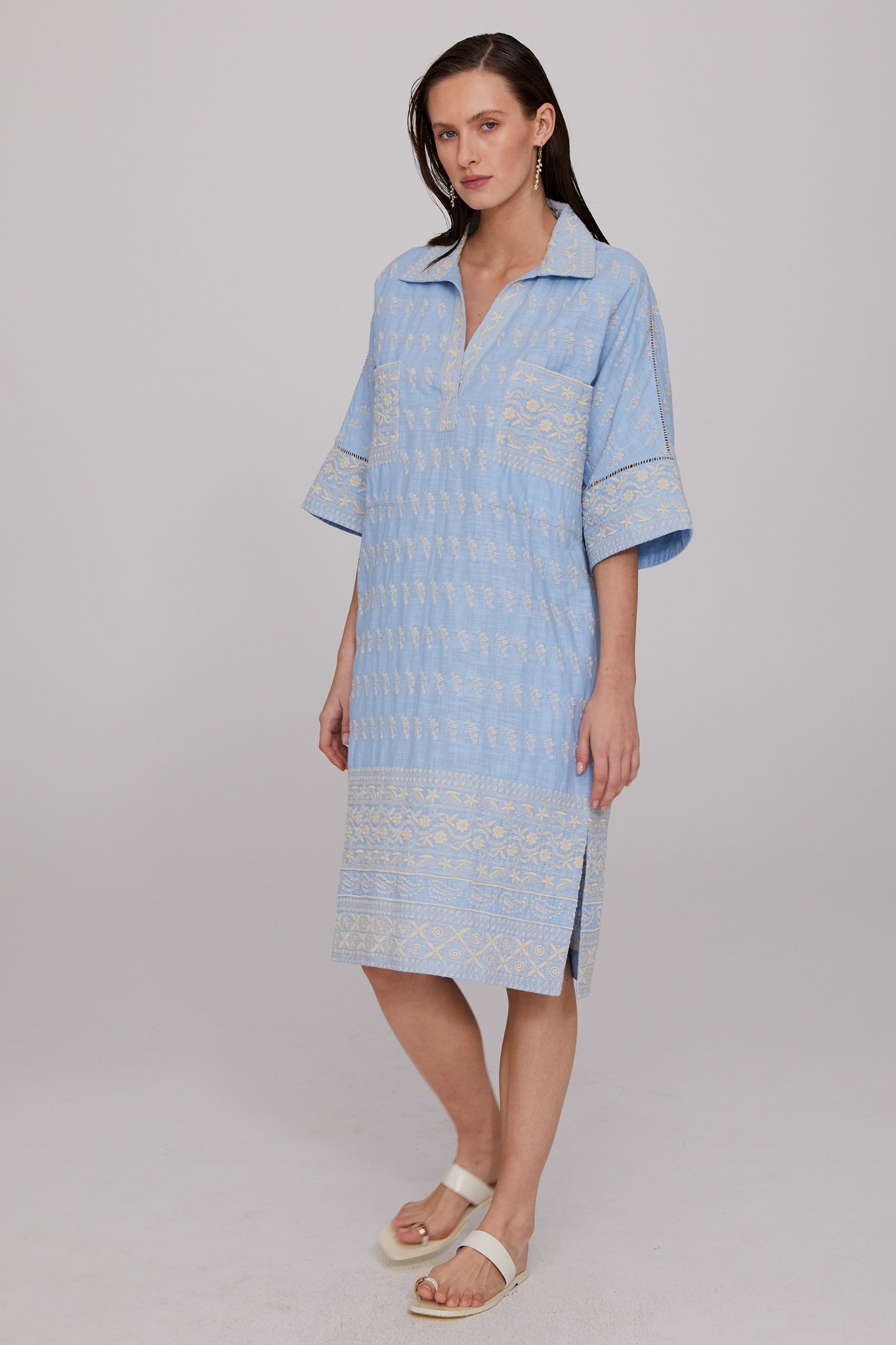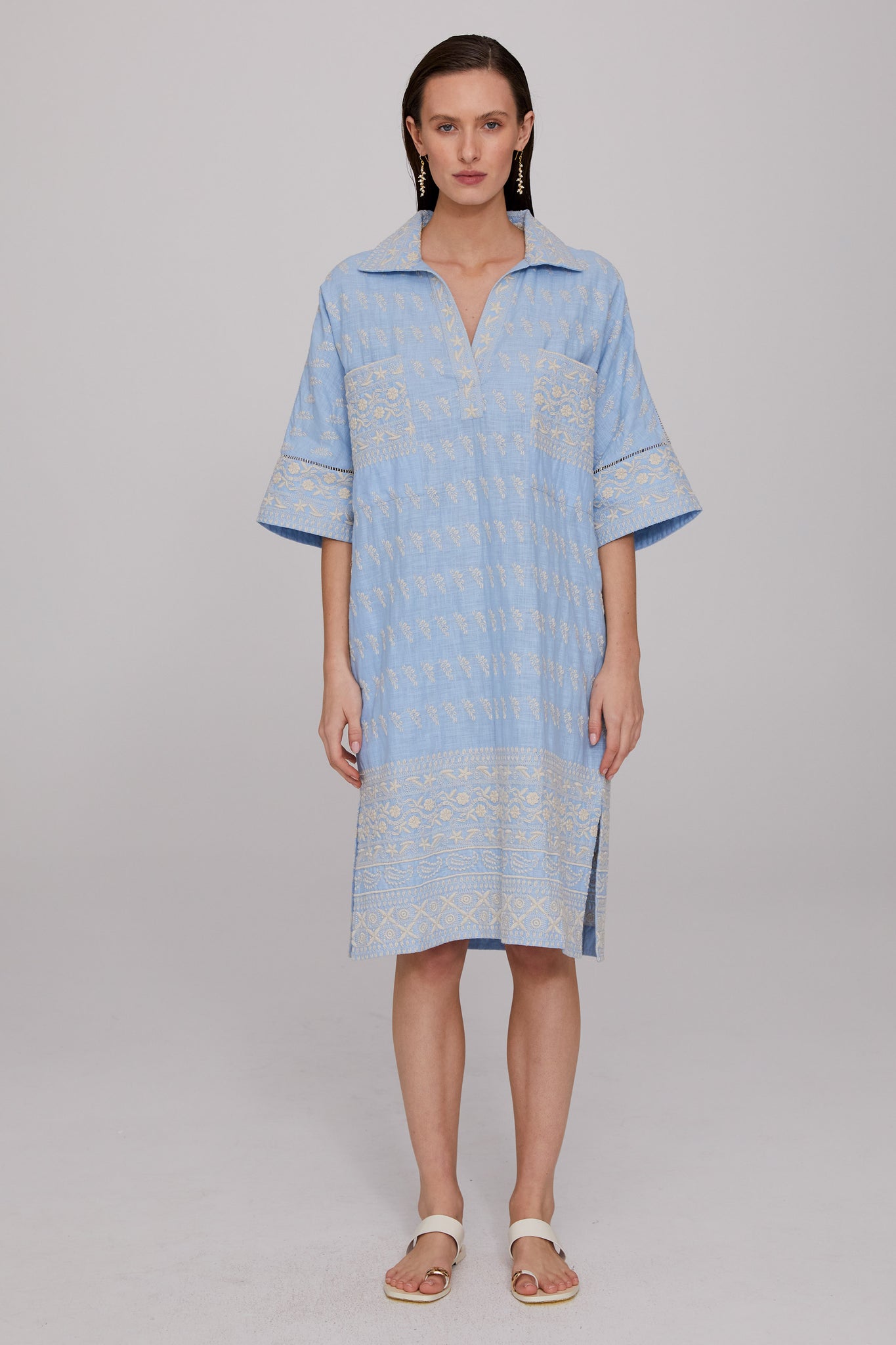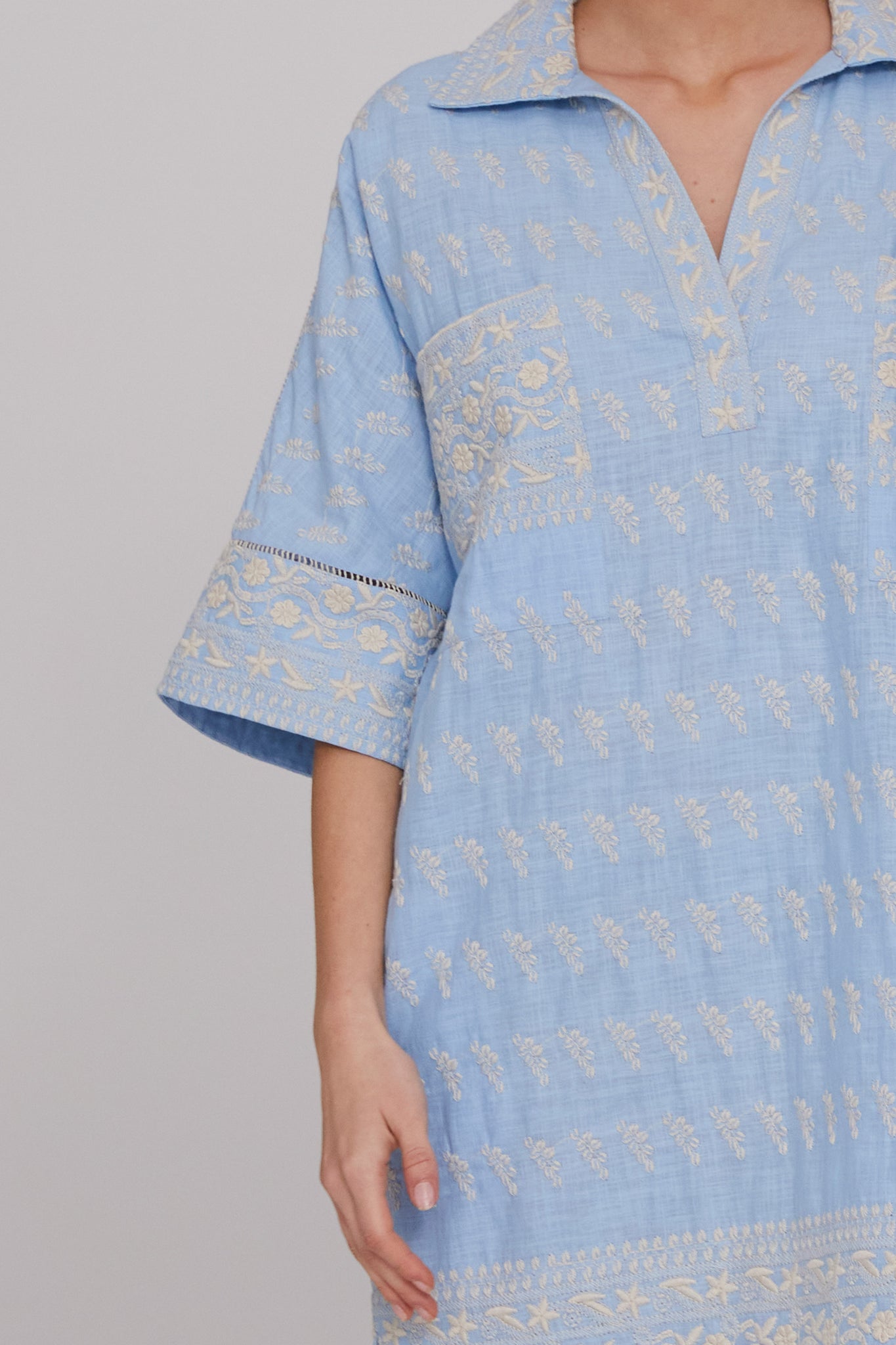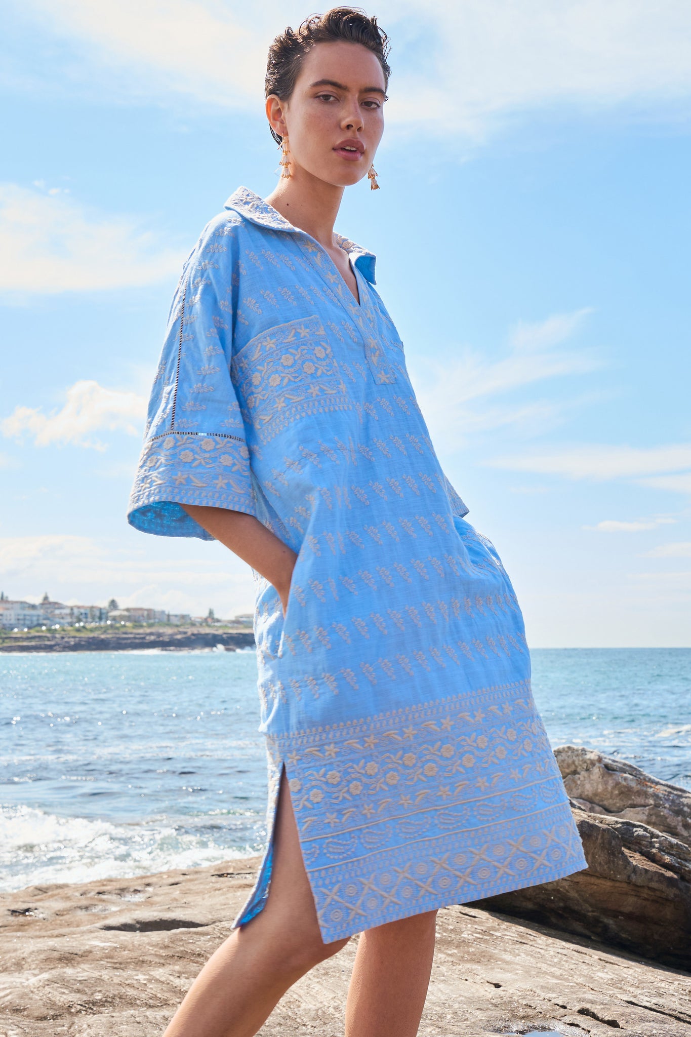 The Zena Embroidered Tunic Dress is the signature summer piece you’ll want to live in. Crafted from the softest powder blue cotton, it’s elevated with ivory embroidery and delicate eyelet lace detailing that adds subtle texture and a hint of skin. The relaxed silhouette features a flattering open collared neckline, side hem splits, and discreet pockets for everyday ease. Structured yet airy, this versatile dress works beautifully with flat sandals for daytime or styled with a heel for an effortless evening look.