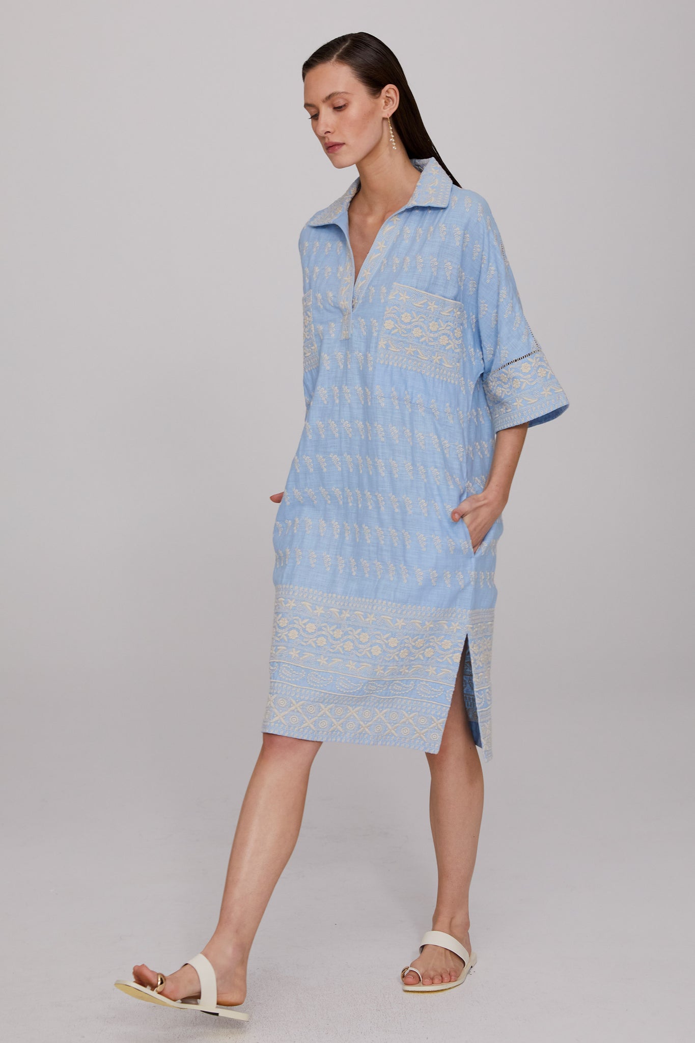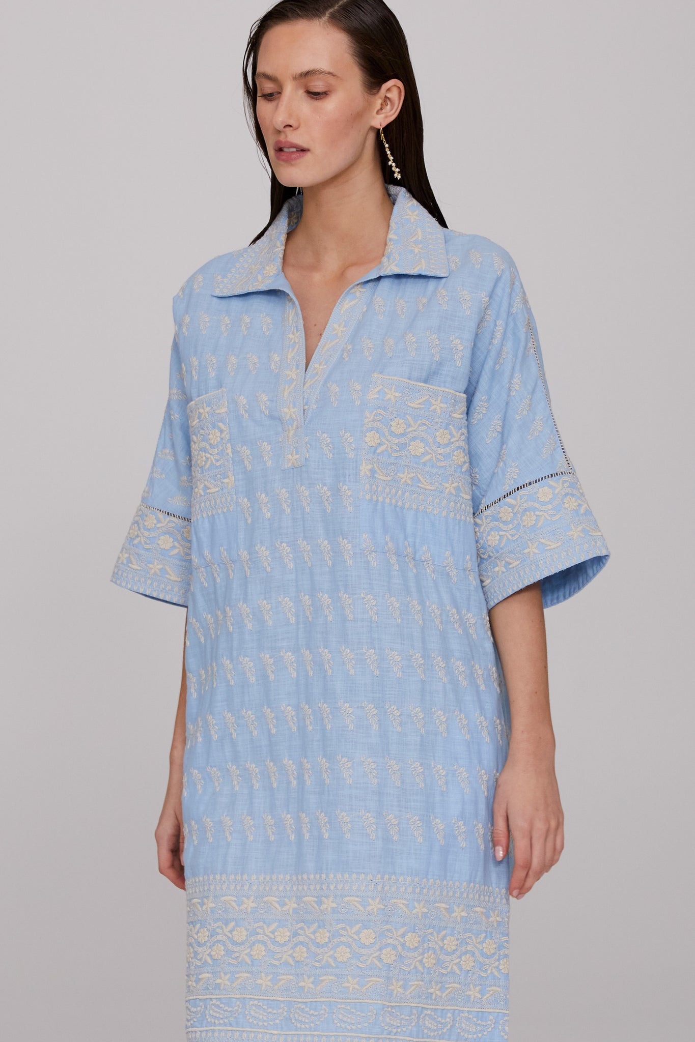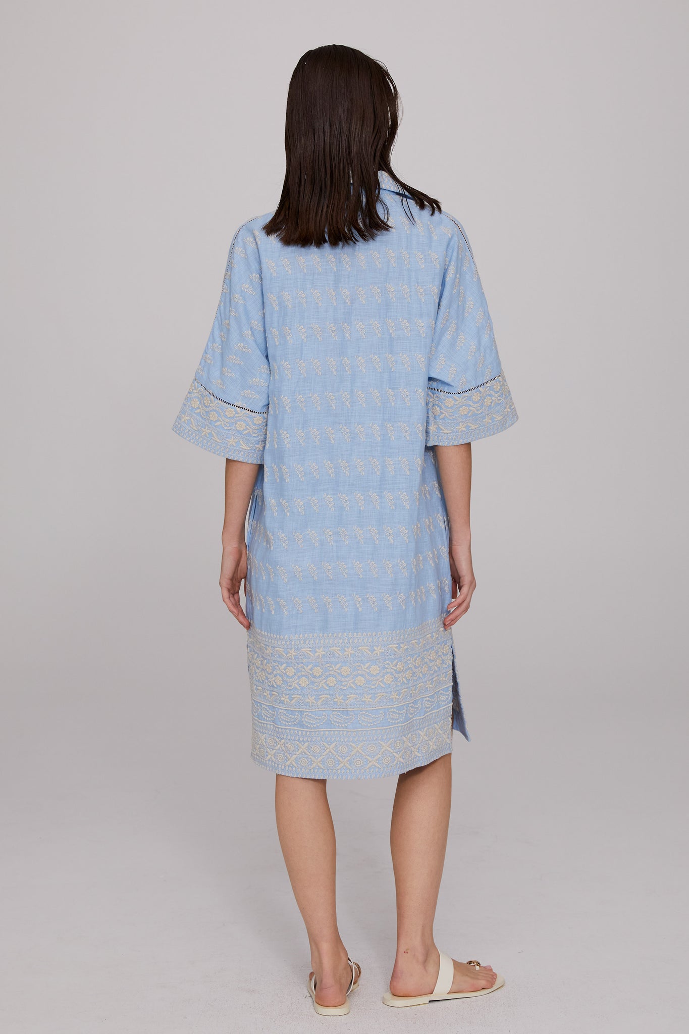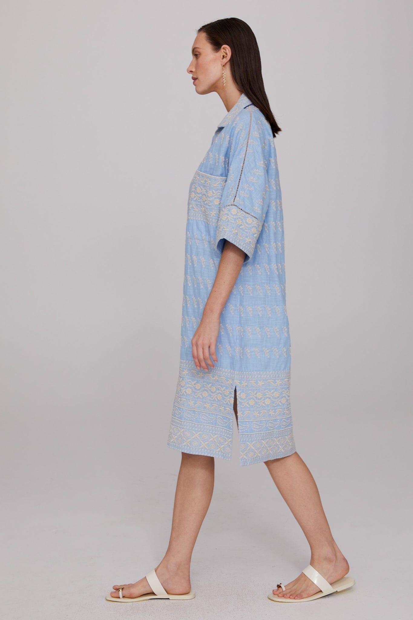 The Zena Embroidered Tunic Dress is the signature summer piece you’ll want to live in. Crafted from the softest powder blue cotton, it’s elevated with ivory embroidery and delicate eyelet lace detailing that adds subtle texture and a hint of skin. The relaxed silhouette features a flattering open collared neckline, side hem splits, and discreet pockets for everyday ease. Structured yet airy, this versatile dress works beautifully with flat sandals for daytime or styled with a heel for an effortless evening look.