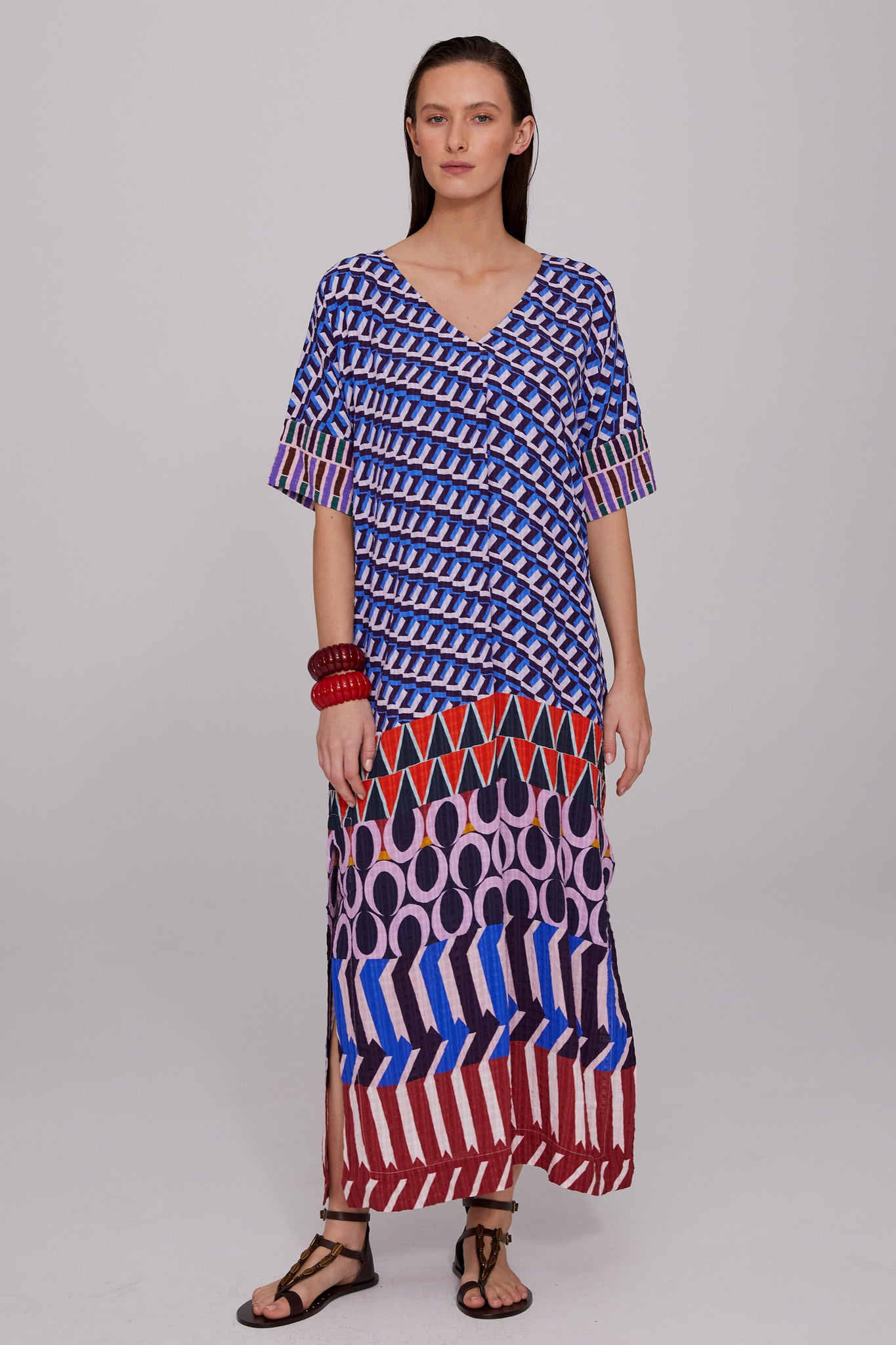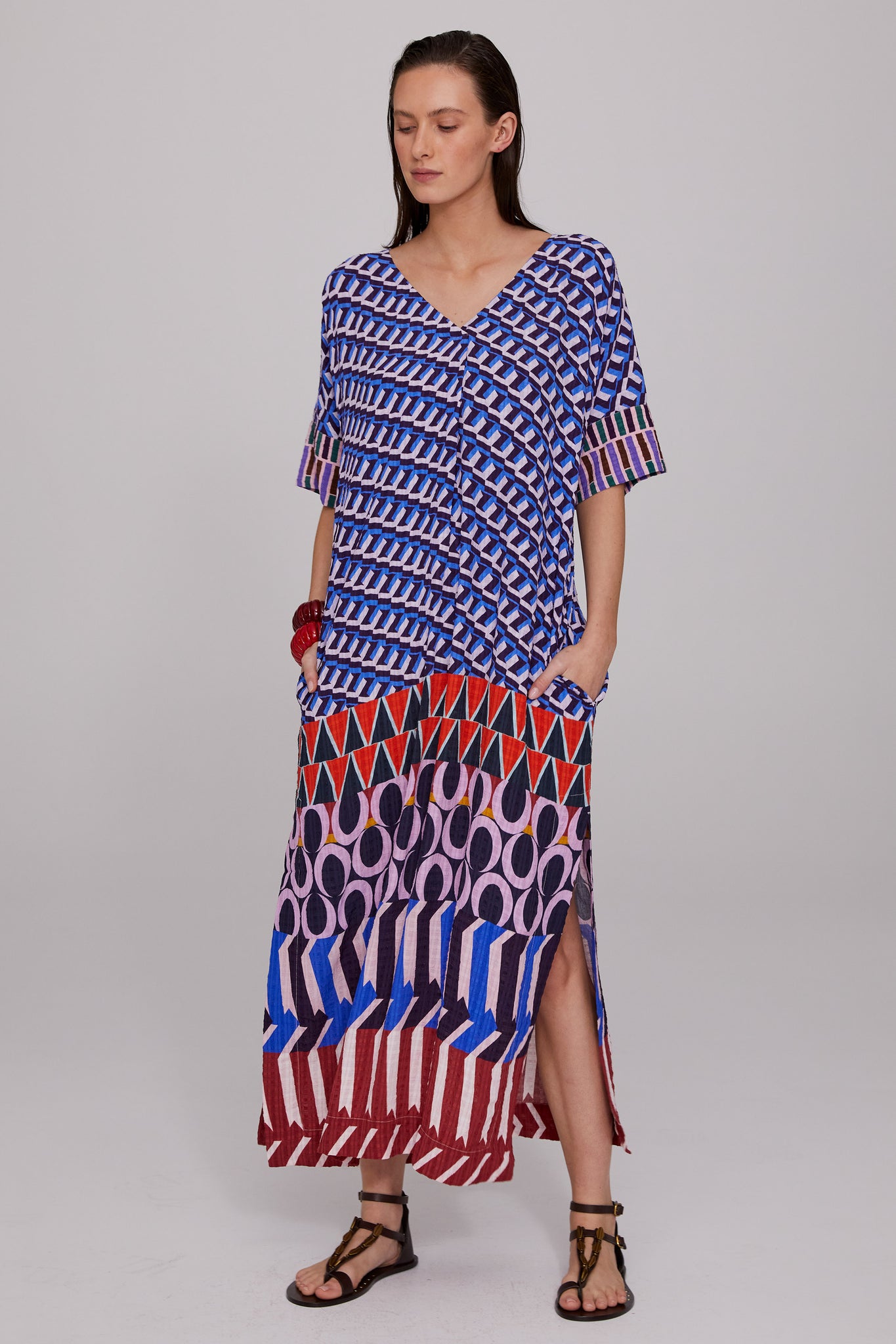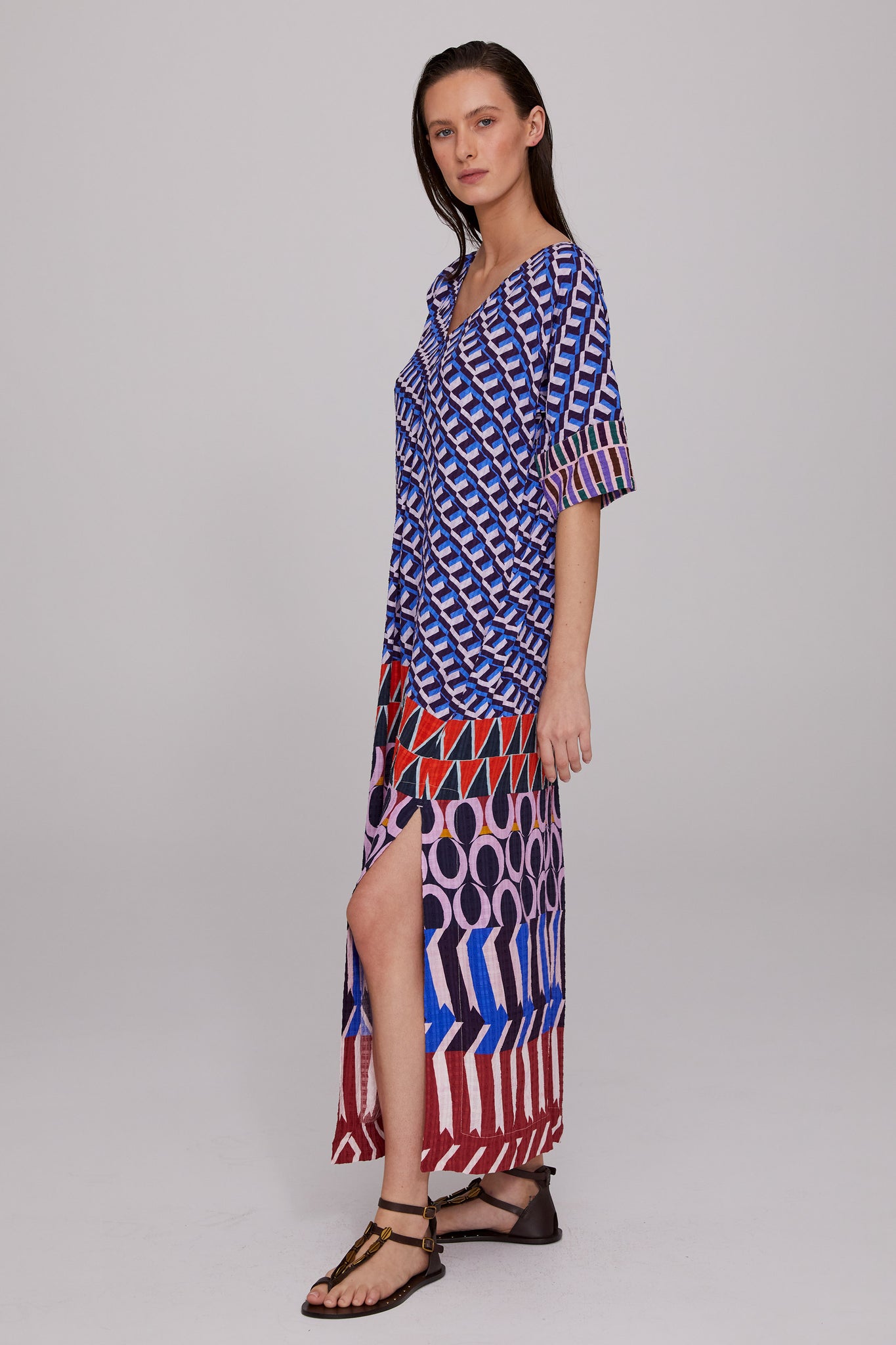 Perfect for poolside cocktails or an evening resort date, the Zuri Midi Kaftan is a striking addition to your summer wardrobe. Designed in-house at MEGAN PARK, its dynamic multi-coloured geometric print brings bold energy to the relaxed silhouette. Crafted from soft textural crepe, the kaftan drapes with ease while high side splits create fluid movement and a glimpse of leg as you walk. Effortless yet elevated, it’s a piece you’ll treasure for summers to come. Layer with beads and bangles to amplify this high resort look.