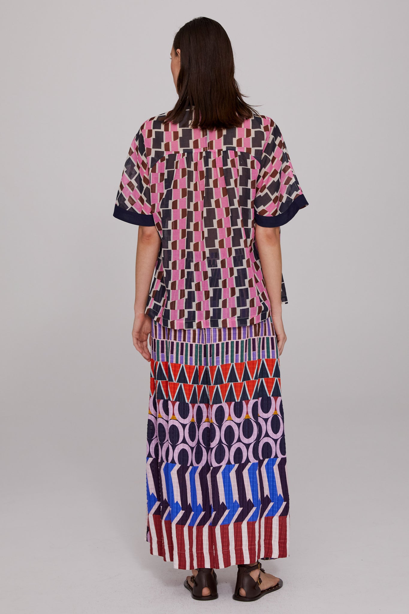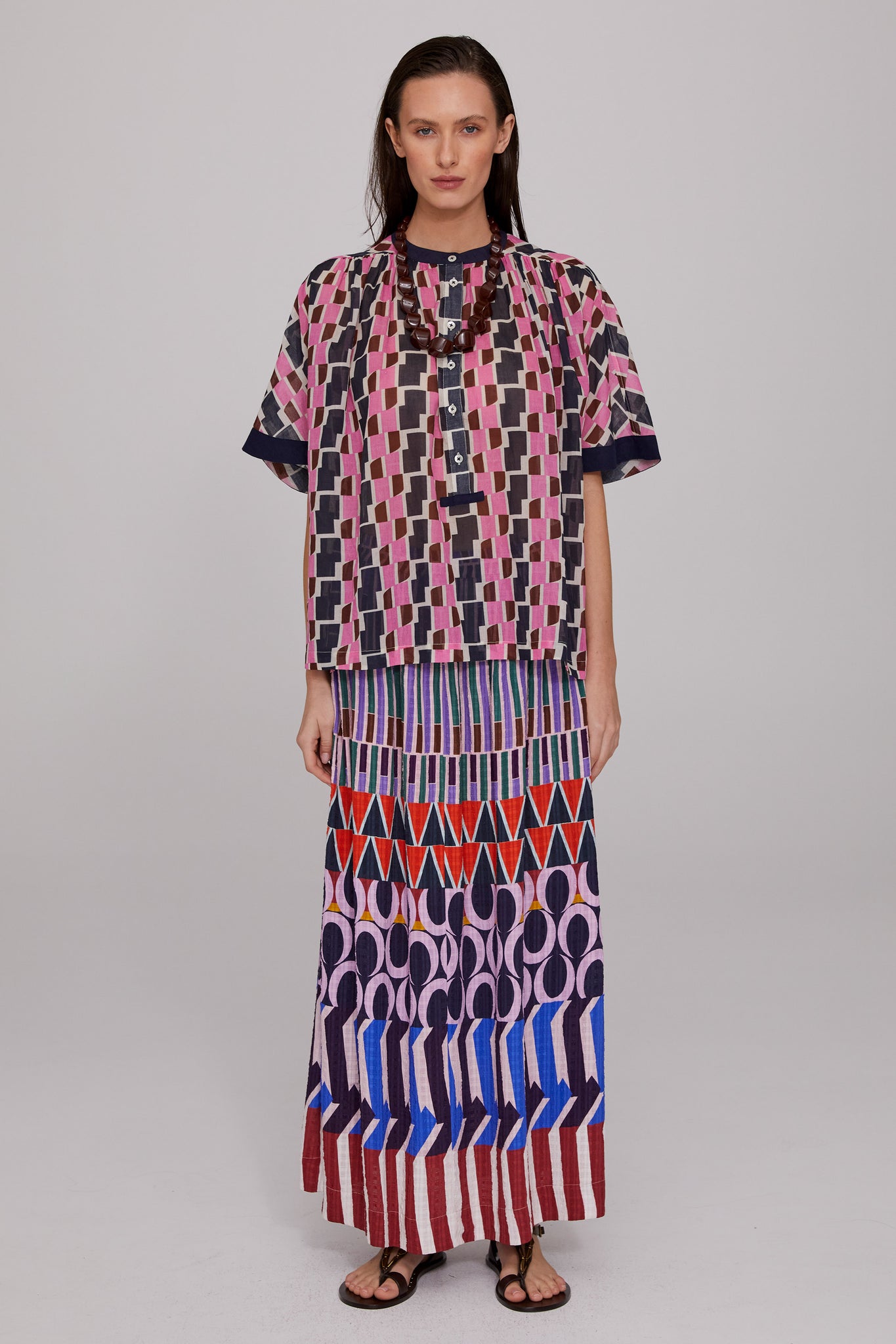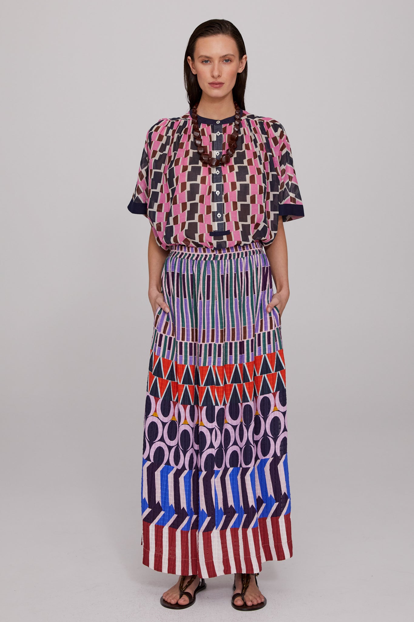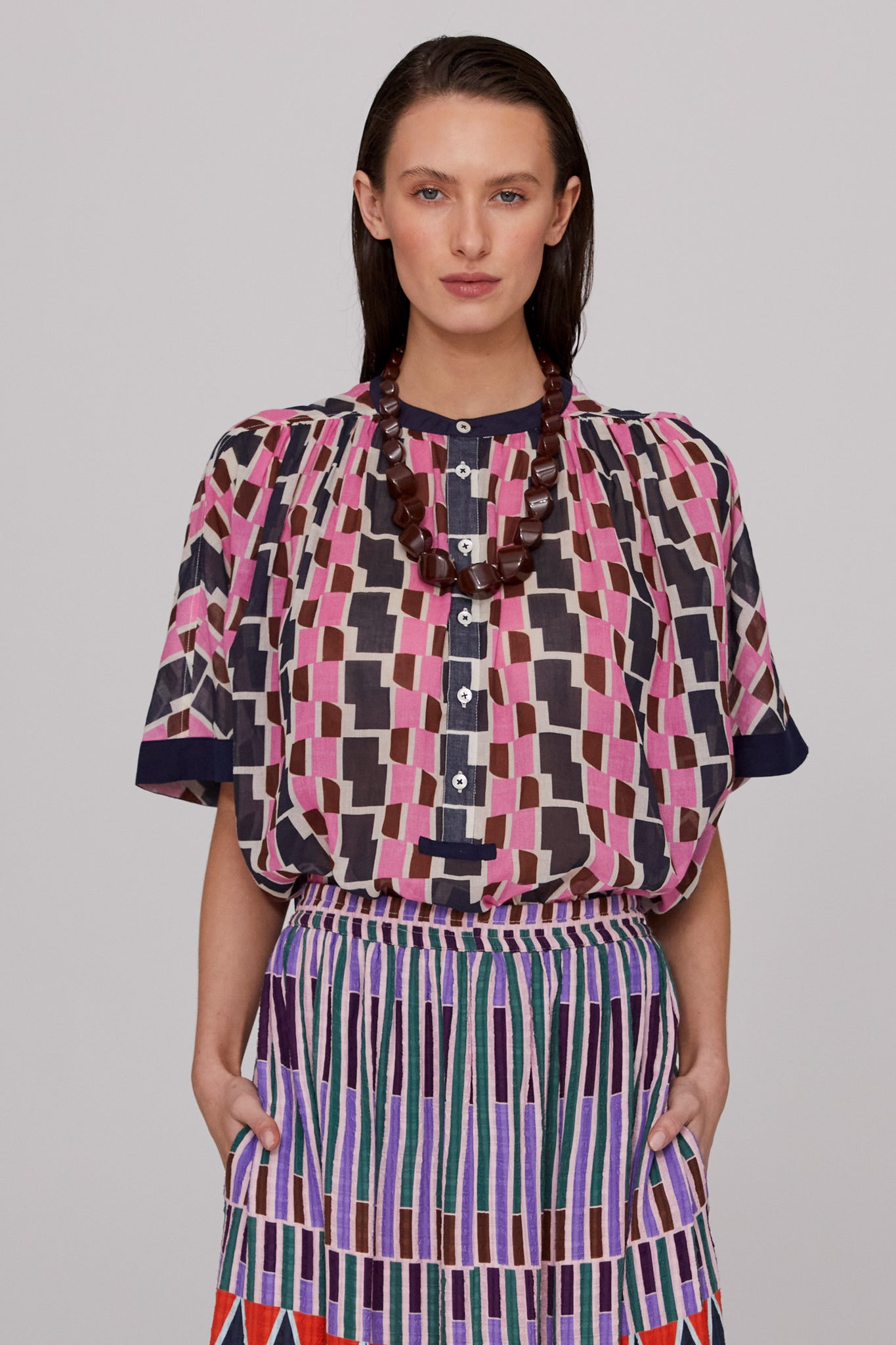 The Zuri Organic Voile Blouse captures relaxed summer ease with an artisanal edge. An interlocking vertical geo print of ink, pink, and ecru creates a contemporary yet flattering effect. Crafted from soft organic cotton voile, it’s featherlight and breathable – perfect for the summer heat. A relaxed silhouette with subtle volume makes it effortless to style — wear it tucked into denim for everyday ease or paired with the Zuri Crepe Resort Skirt for a bolder statement.