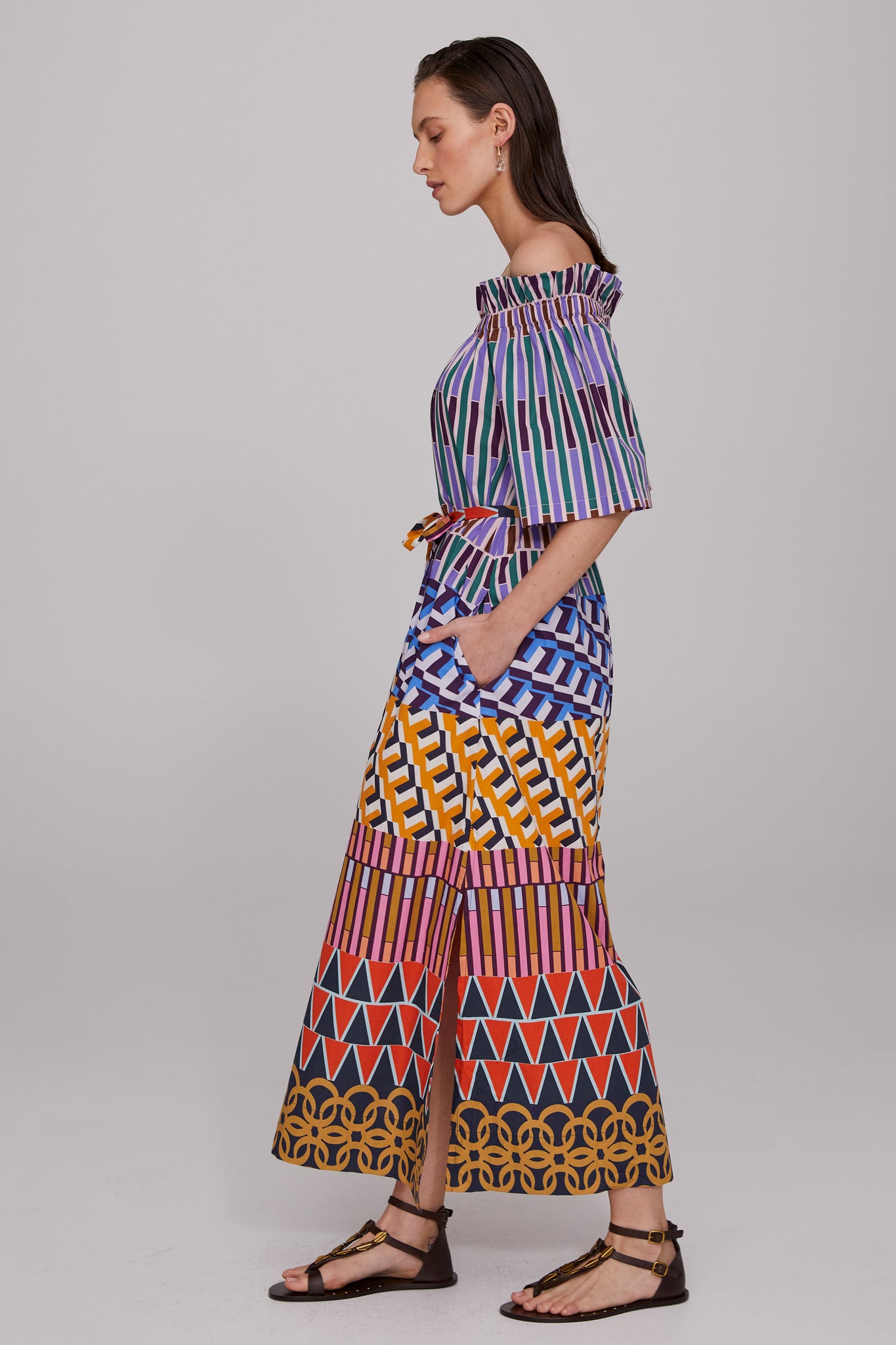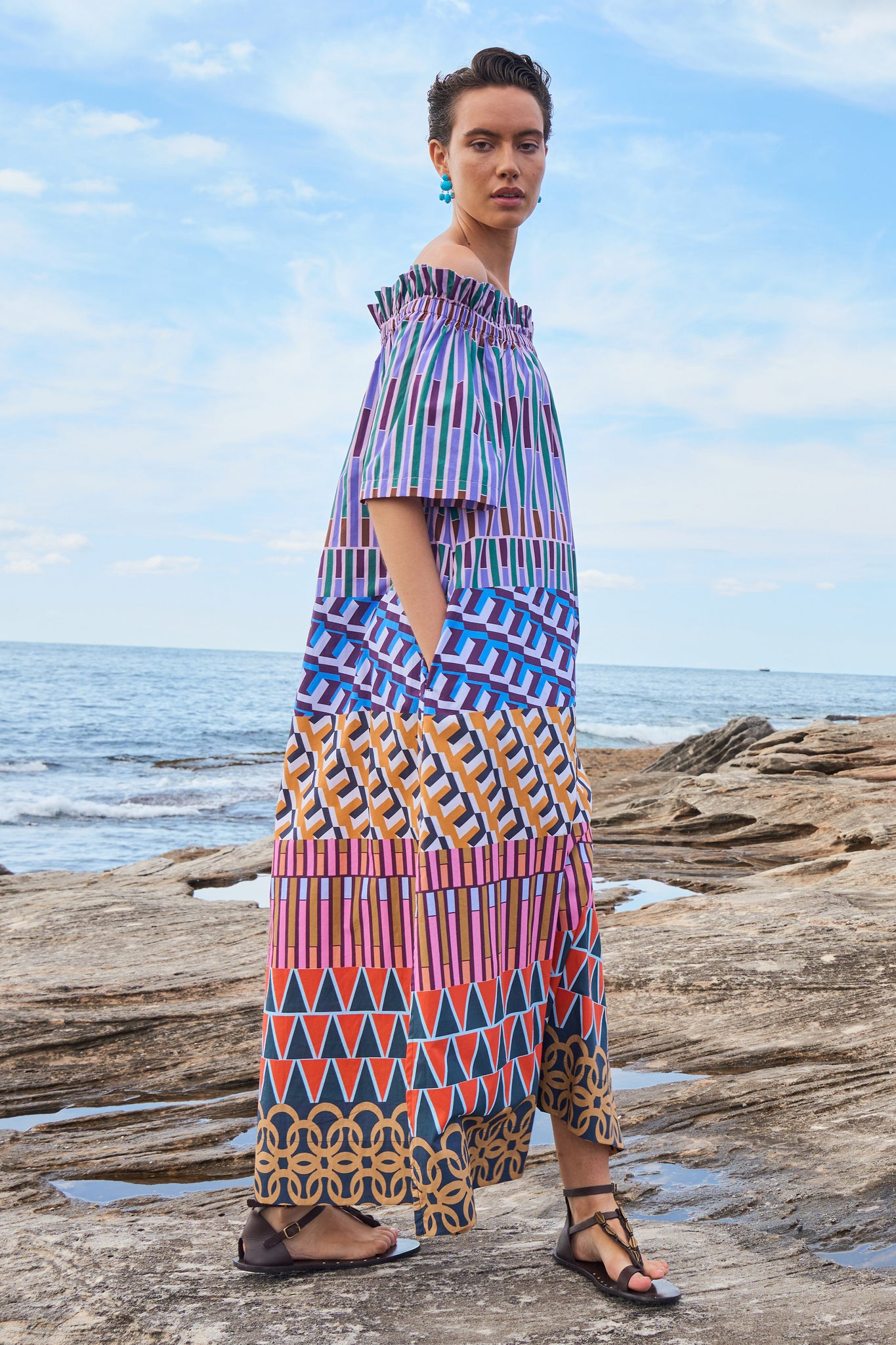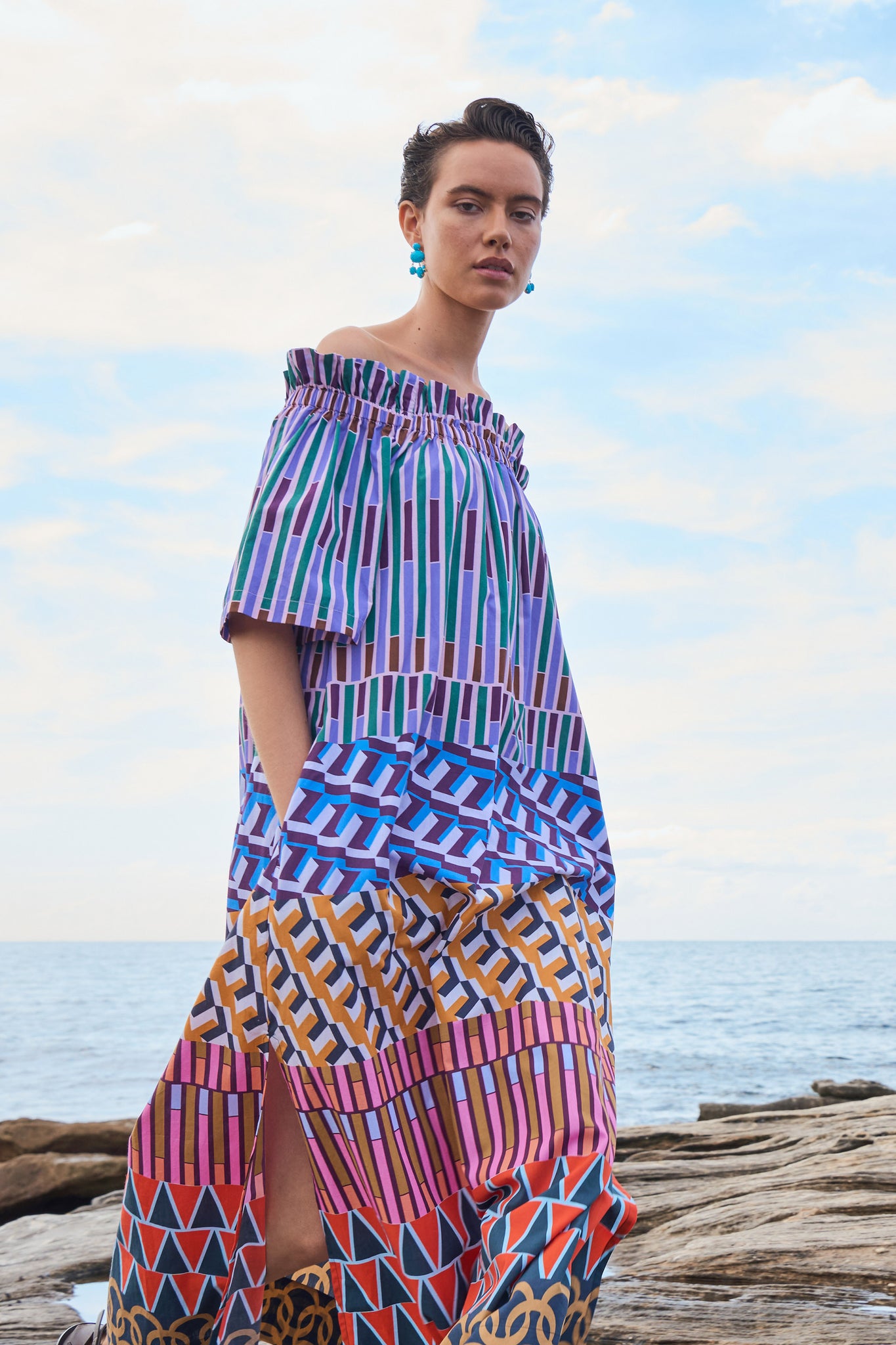 The Zuri Poplin Mu Mu Dress makes a bold statement with MEGAN PARK’s signature geometric print in vibrant multi-colours. Cut from crisp cotton poplin, its elasticated neckline can be styled off the shoulder or worn relaxed for ease. Perfect for the festive season or a resort getaway, it transitions effortlessly — dress up with heels and earrings or pare back with flat slides. The relaxed silhouette with side seam splits creates movement, while the optional narrow belt offers a cinched finish.