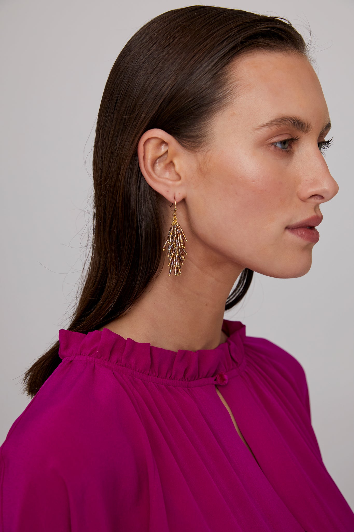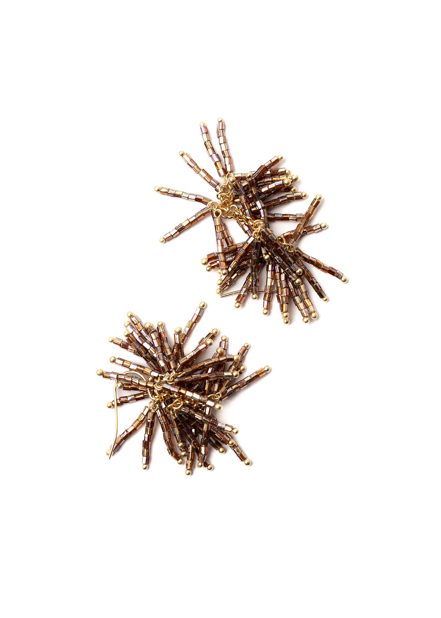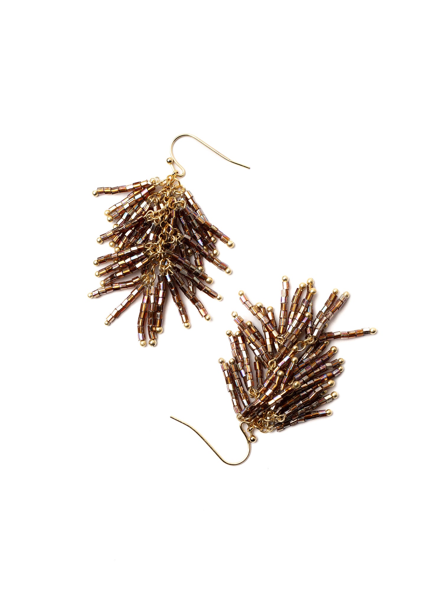 The Bronze Seed Bead Tassel Earrings are handcrafted in Jaipur and feature cascading strands of golden bronze Japanese glass beads tipped with gold, delicately threaded and suspended from a golden chain. Designed to shimmer with movement, they bring a refined yet playful touch of colour to your look. Lightweight and comfortable, they are an effortless way to elevate both day and evening styling.