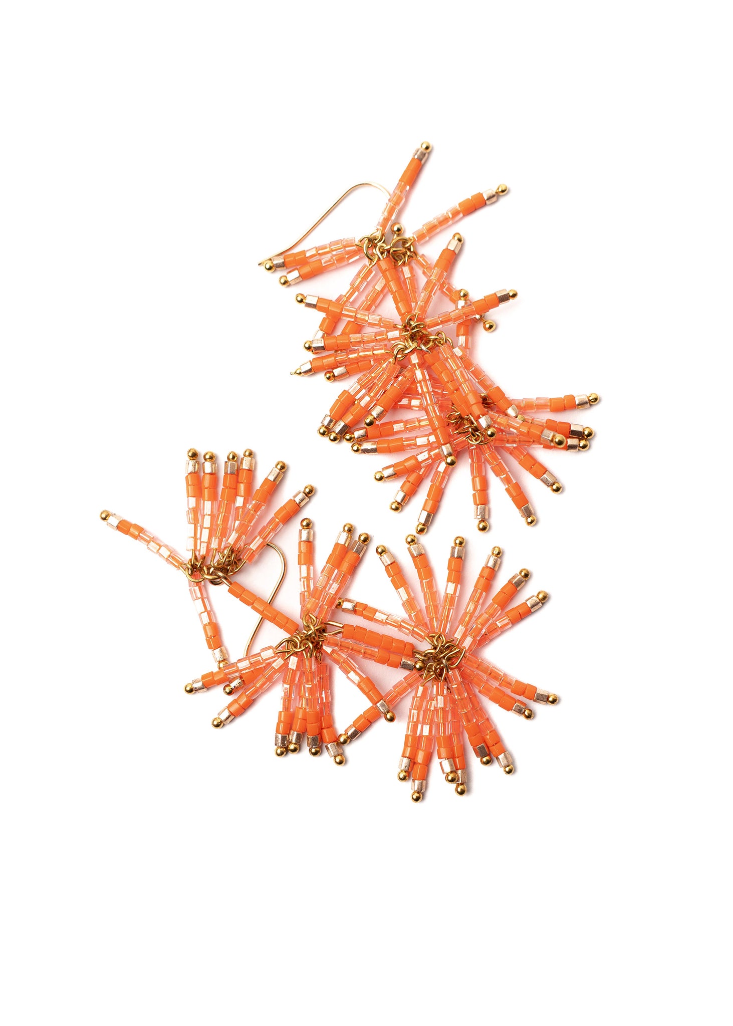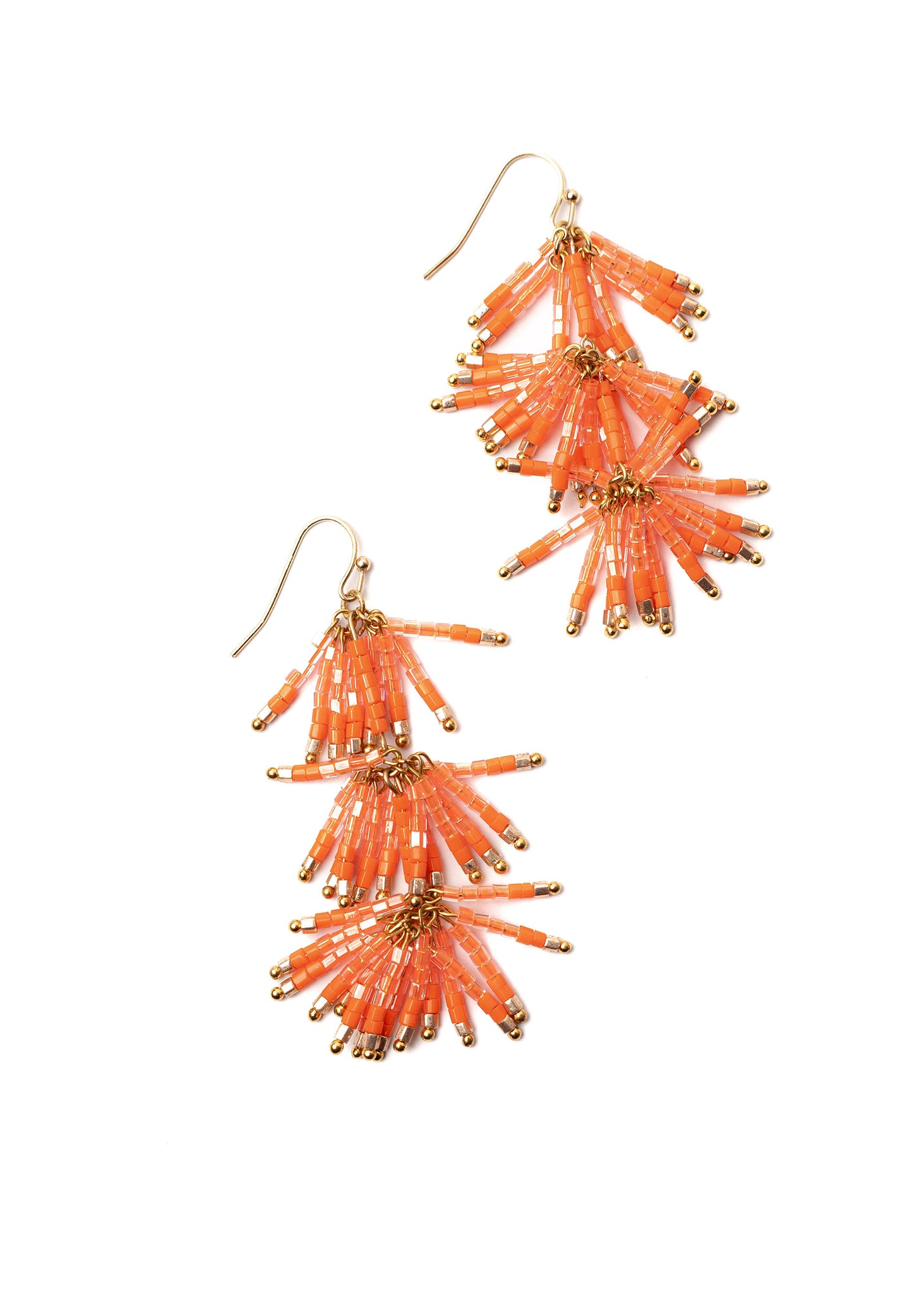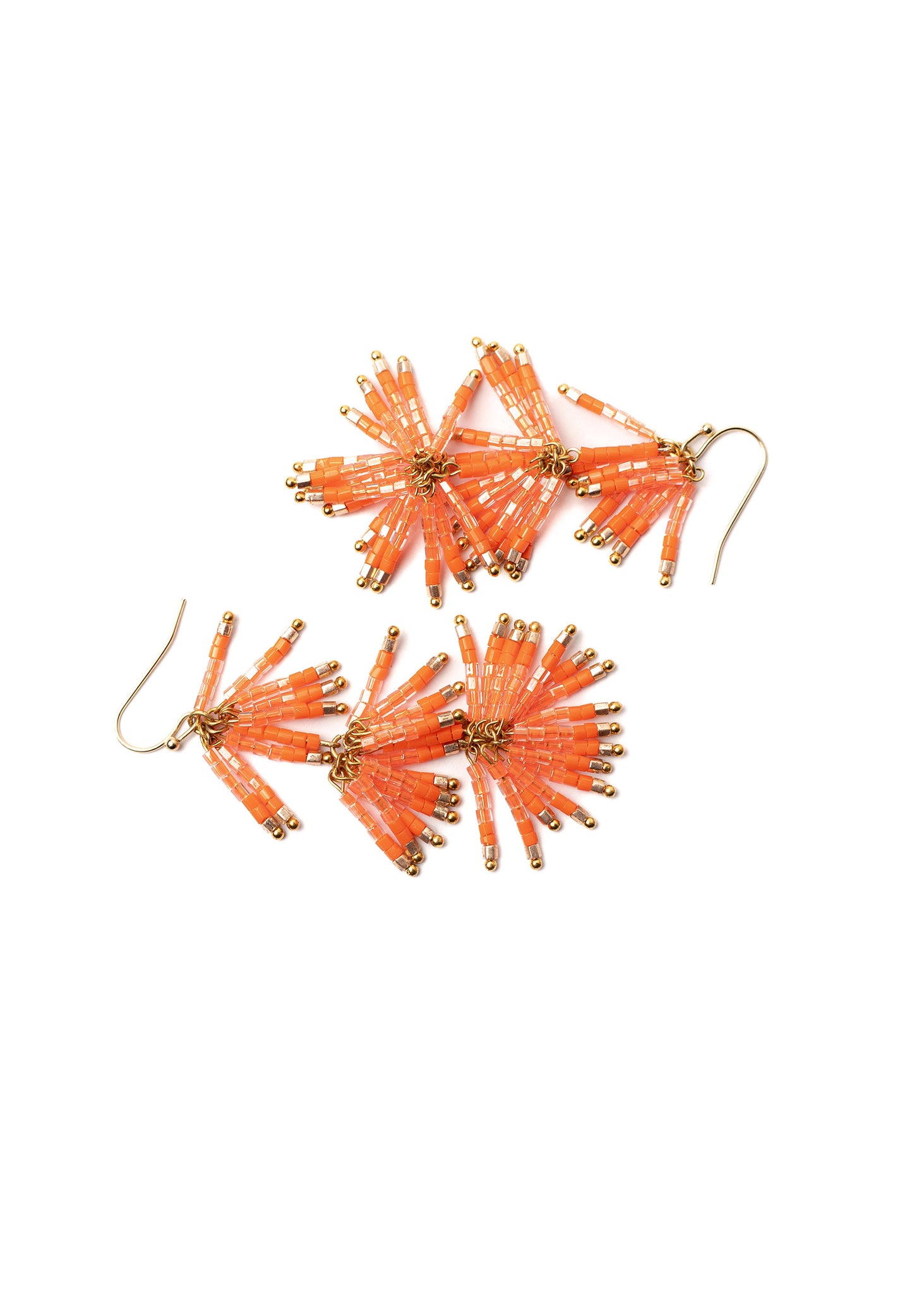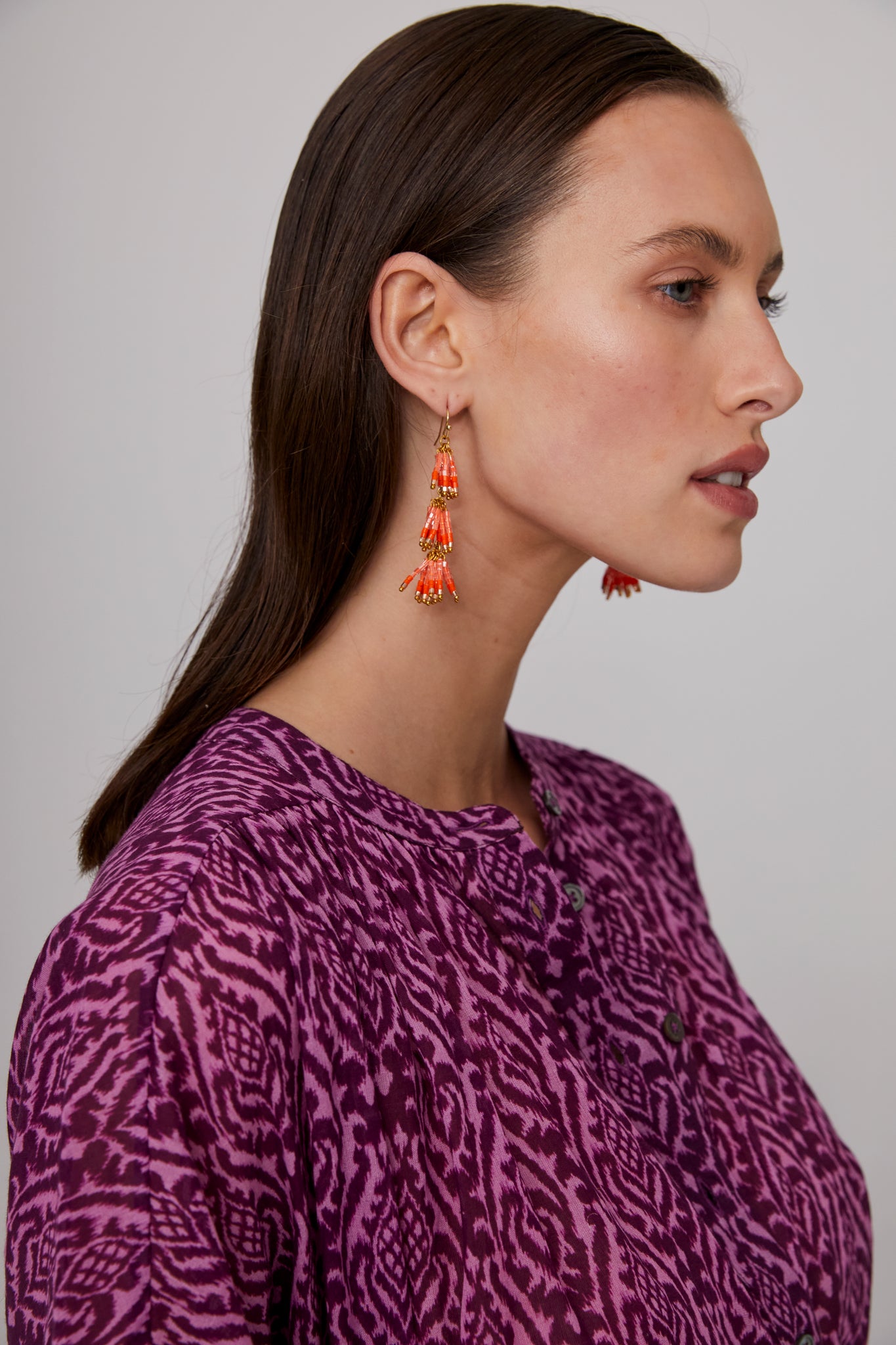 A trio of glass bead tassels cascade from a fine golden chain, creating a design that is both striking and playful. Lightweight and full of movement, the Flame Seed Bead Earrings shimmer with every turn, adding a refined yet joyful touch of colour to your summer look. The perfect jewel to treasure—or to gift.