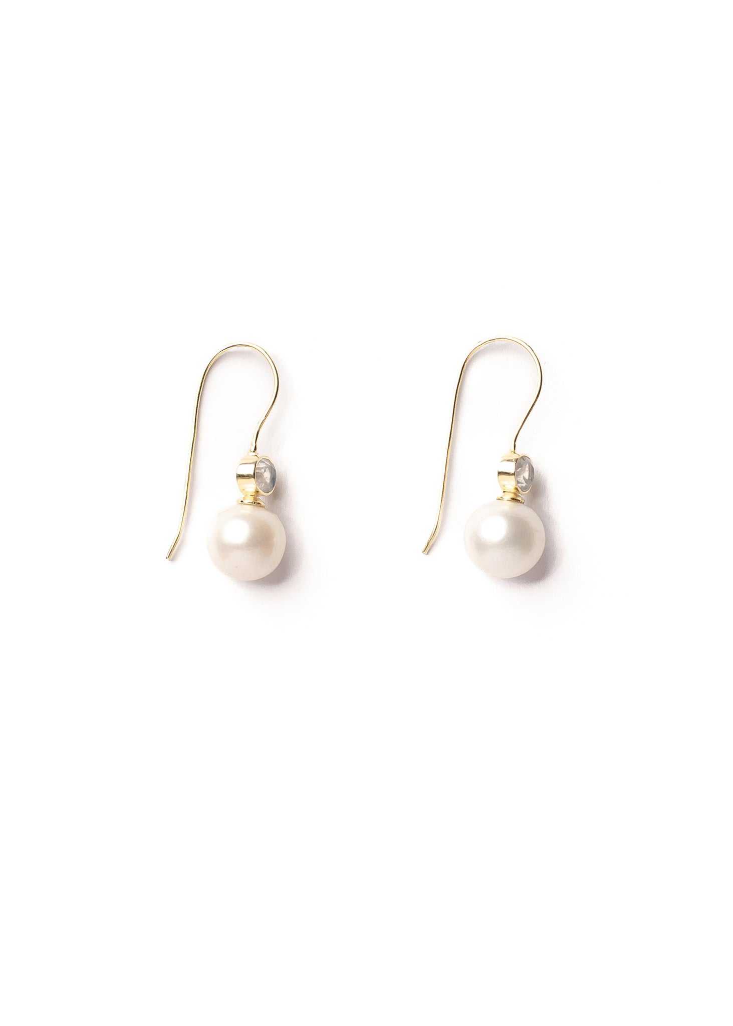 Timeless and refined, the Freshwater Pearl & Rainbow Moonstone Earrings pair the luminous glow of a freshwater pearl with the ethereal shimmer of a faceted rainbow moonstone. Handcrafted in Jaipur, they bring together classic femininity and artisanal craftsmanship. The natural iridescence of the stones makes them versatile for both everyday elegance and special occasions.
