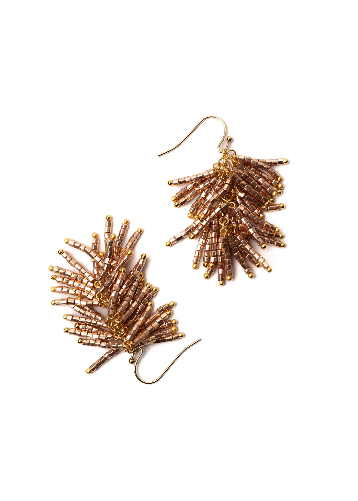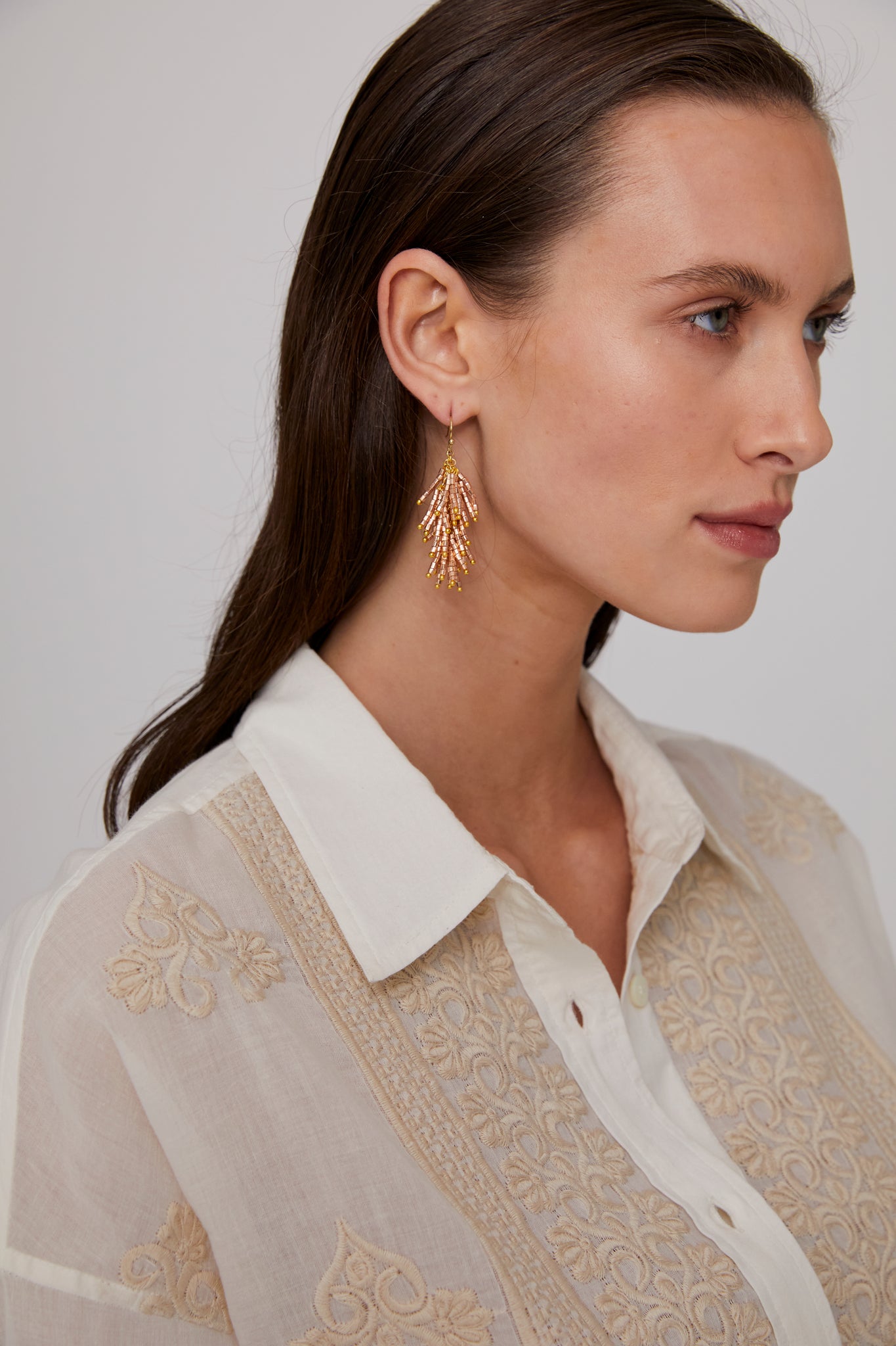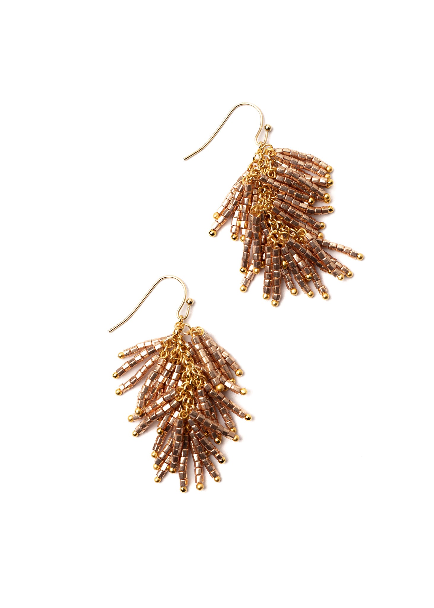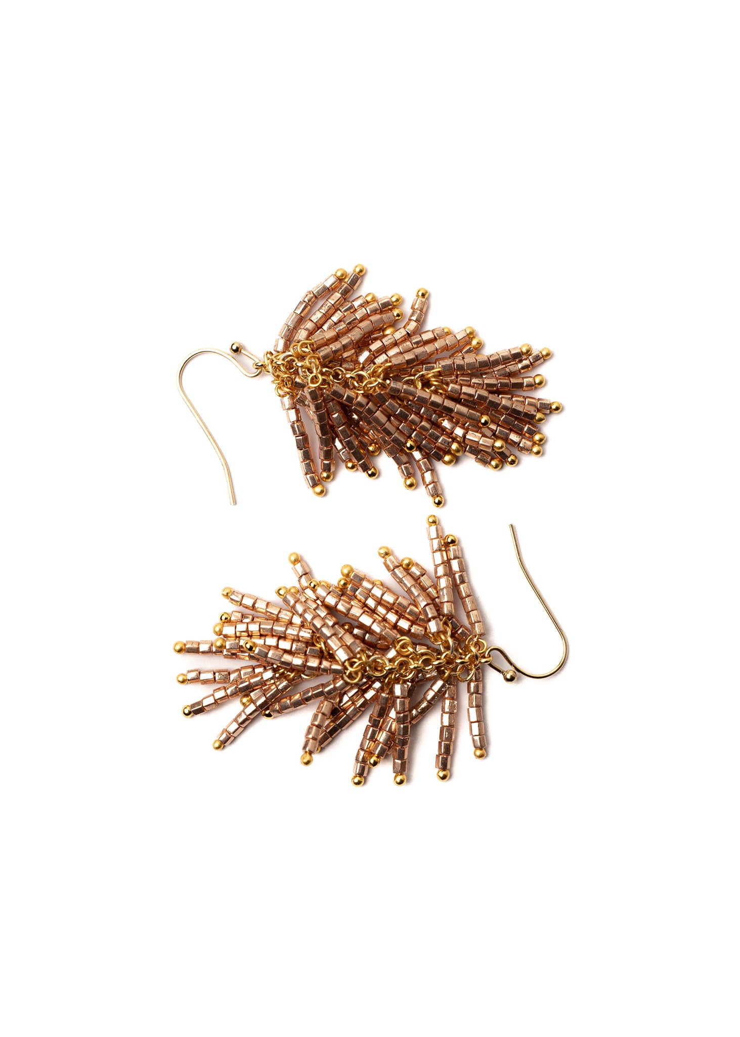 Delicate strands of golden beads cascade in tassel-like form, each one intricately threaded with miniature Japanese glass beads and suspended from a central golden chain. Lightweight and full of movement, these earrings shimmer as they catch the light, adding effortless glamour to your evening look.