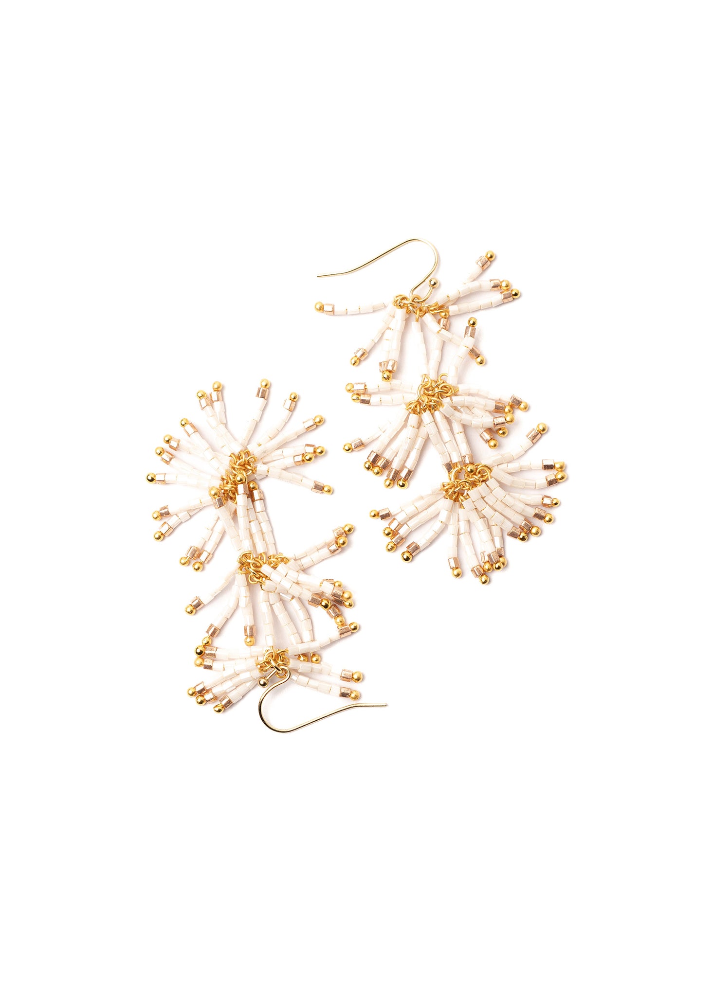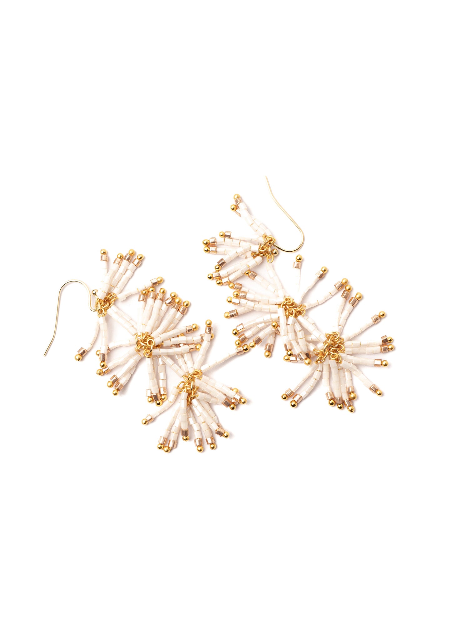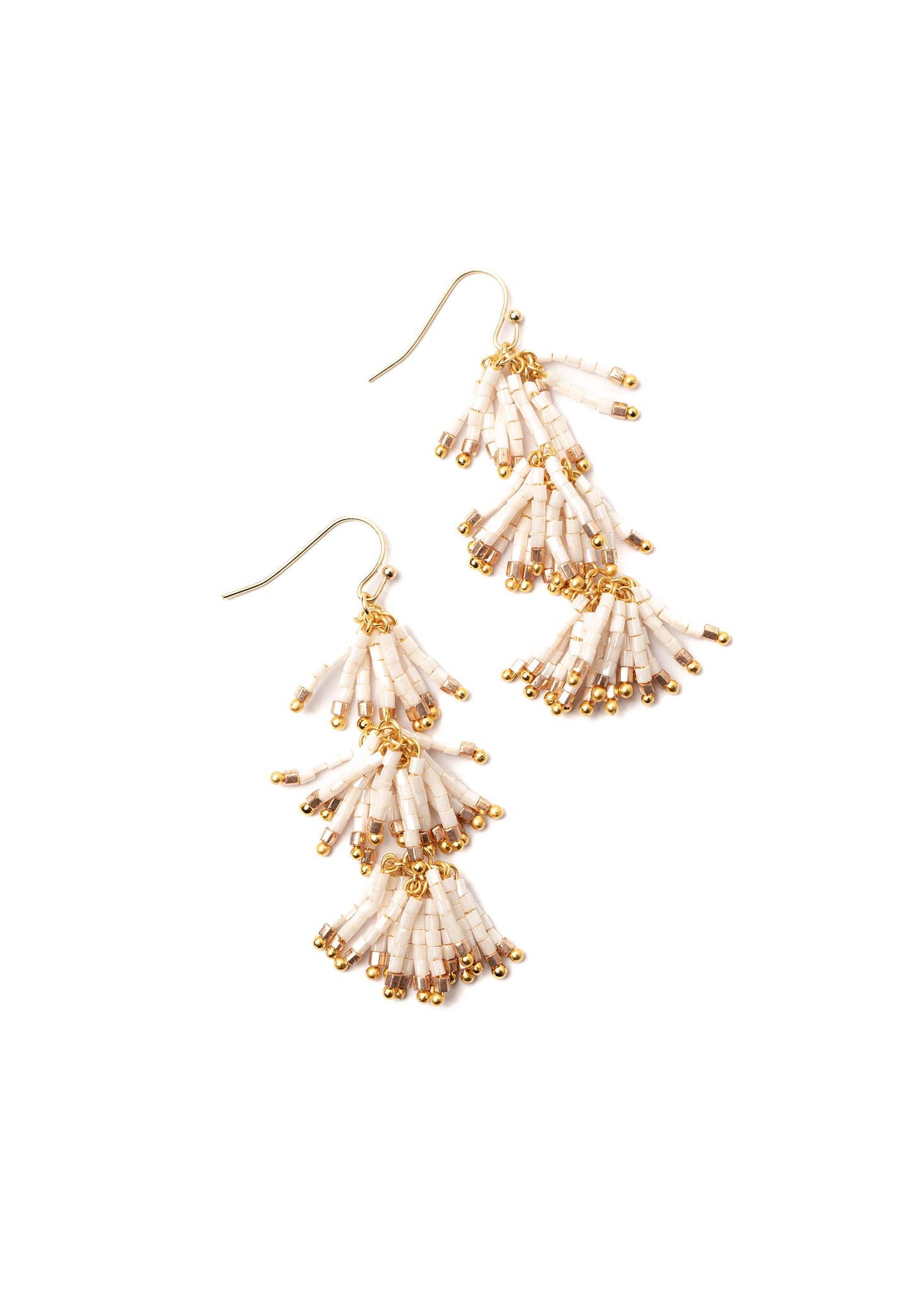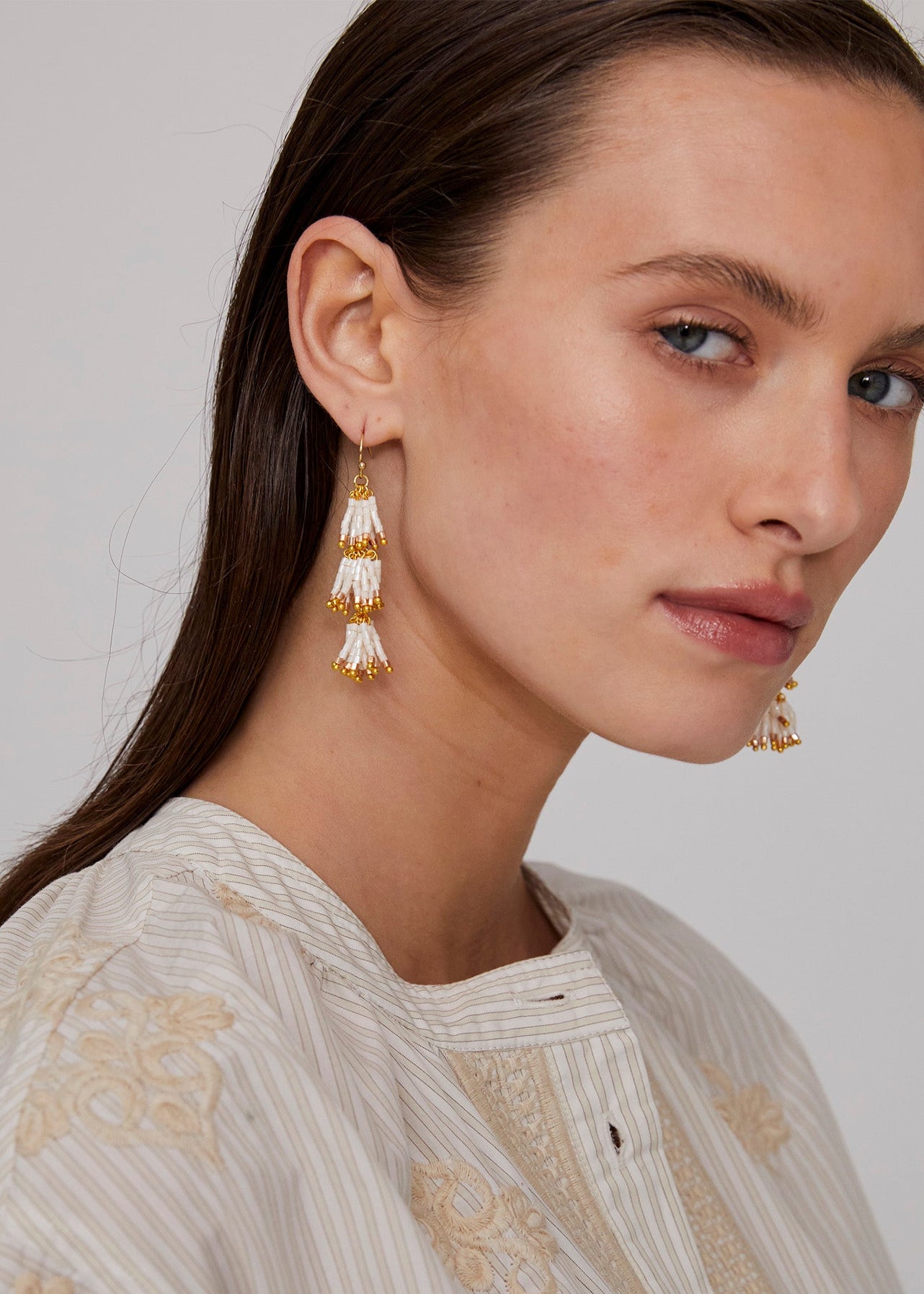 A trio of ivory-hued Japanese glass beaded tassels fall gracefully from a fine golden chain, creating a design that is both elegant and understated. Lightweight and full of movement, the Ivory Seed Bead Earrings are designed to be worn from day to evening — their soft neutral tone the perfect complement to most summer dressing. A timeless jewel to own or to gift.